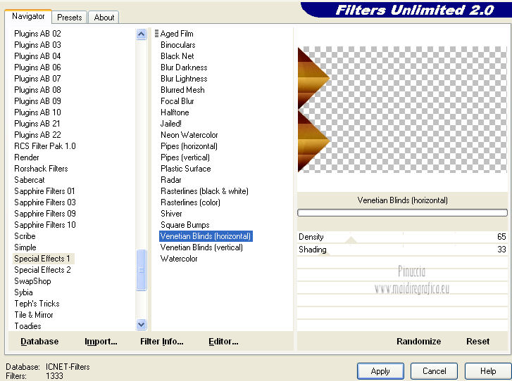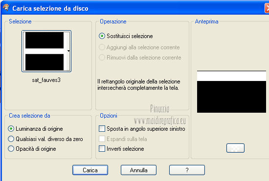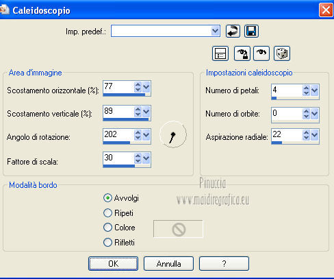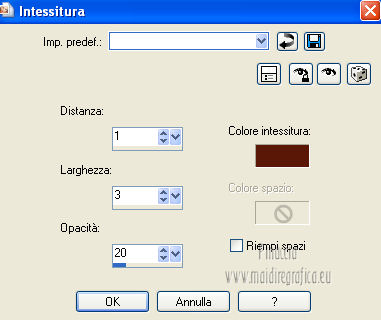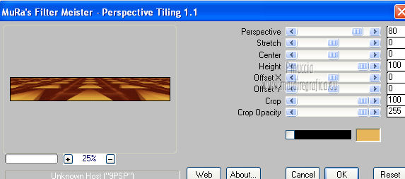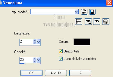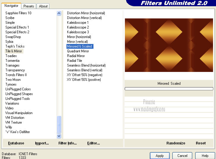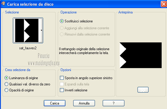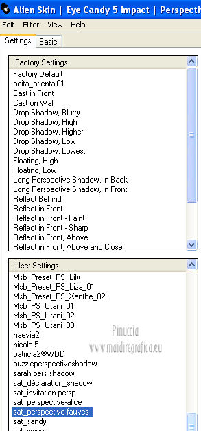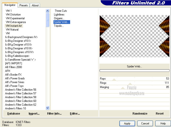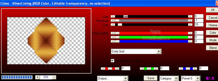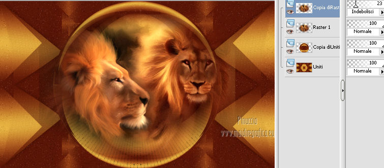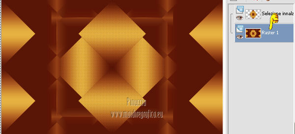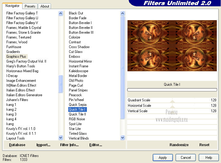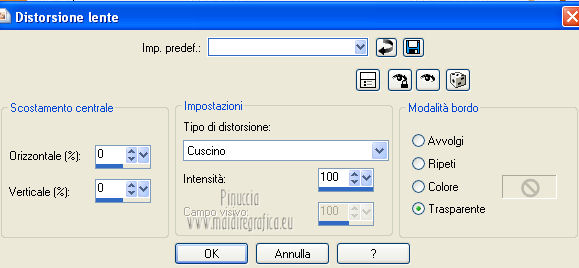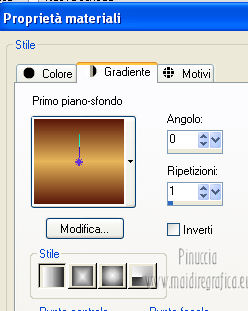 qui puoi trovare qualche risposta ai tuoi dubbi. Se l'argomento che ti interessa non è presente, ti prego di segnalarmelo. Questo tutorial è una creazione di Saturnella e non può essere copiato su altri siti nè essere offerto per il download. Lo stesso vale per la mia traduzione. E' anche proibito togliere il watermark dal materiale; rispettiamo il lavoro dei creatori di tubes, senza i quali non potremmo creare tutorials. Questo tutorial è stato creato con PSP 12, ma può essere eseguito anche con le altre versioni di PSP. Per tradurlo ho usato PSP X. Occorrente: Materiale qui Il tube del leone è di Suzi Sgai. Il tube del personaggio è di Guismo. Grazie a tutti per il vostro magnifico lavoro. (in questa pagina trovi i links ai loro siti). Filtri in caso di dubbi, ricorda di consultare la mia sezione filtri qui Simple - Pizza Slice Mirror qui AP 01 [Innovations] - Lines SilverLining qui Filters Unlimited 2.0 qui Mura's Meister - Pole Transform qui Mura's Meister - Perspective Tiling qui VM Instant Art - Spider Web qui Alien Skin Eye Candy 5 Impact - Glass qui Graphics Plus - Quick Tile I qui I filtri Simple, Graphics Plus e VM Instant Art si possono usare da soli o importati in Filters Unlimited ![]() non esitare a cambiare modalità di miscelatura e opacità secondo i colori utilizzati. Metti il preset nella cartella del filtro Alien Skin Eye Candy 5 Impact>Settings>Shadow. Cliccando sul file una o due volte (a seconda delle tue impostazioni), automaticamente il preset si installerà nella cartella corretta. perchè uno o due clic vedi qui Metti le selezioni nella cartella Selezioni. 1. Imposta il colore di primo piano con #5a1808, e il colore di sfondo con #e7b55a. ![]() Passa il colore di primo piano a Gradiente, stile Lineare. ![]() Apri una nuova immagine trasparente 900 x 550 pixels, e riempila con il gradiente.3. Regola>Sfocatura>Sfocatura gaussiana - raggio 40. ![]() 4. Effetti>Plugins>Simple - Pizza Slice Mirror. Modifica>Ripeti Pizza Slice Mirror. 5. Livelli>Duplica. Immagine>Rifletti. Cambia la modalità di miscelatura di questo livello in Sovrapponi (o secondo i tuoi colori), e abbassa l'opacità al 50%. Livelli>Unisci>Unisci giù. 6. Effetti>Plugins>Filters Unlimited 2.0 - Tile & Mirror - Mirrored & Scaled. ![]() 7. Livelli>Duplica. Immagine>Ridimensiona, al 90%, tutti i livelli non selezionato. 8. Immagine>Ruota per gradi - 90 gradi a destra. ![]() Cambia la modalità di miscelatura di questo livello in Schiarisci (o secondo i tuoi colori). Livelli>Unisci>Unisci giù. 9. Selezione>Carica/Salva selezione>Carica selezione da disco. Cerca e carica la selezione sat_fauves1. ![]() Selezione>Innalza selezione a livello. Selezione>Deseleziona. 10. Effetti>Plugins>AP 01 [Innovations] - Lines SilverLining. ![]() 11. Attiva il livello di sfondo. ![]() Selezione>Carica/Salva selezione>Carica selezione da disco. Cerca e carica la selezione sat_fauves2. ![]() Selezione>Innalza selezione a livello. Selezione>Deseleziona. 12. Effetti>Effetti di trama>Trama - colore scuro di primo piano. ![]() 13. Effetti>Effetti 3D>Sfalsa ombra. ![]() 14. Livelli>Duplica. Immagine>Rifletti. Livelli>Unisci>Unisci giù. 15. Effetti>Effetti di distorsione>Distorsione lente. ![]() Abbassa l'opacità di questo livello al 50%. 16. Attiva nuovamente il livello di sfondo. Regola>Aggiungi/Rimuovi disturbo>Aggiungi disturbo. ![]() Livelli>Unisci>Unisci visibile. 17. Livelli>Duplica. Effetti>Plugins>Mura's Meister - Pole Transform. ![]() 18. Apri il tube del leone di Suzi Sgai e vai a Modifica>Copia. Torna al tuo lavoro e vai a Modifica>Incolla come nuovo livello. E' già correttamente posizionato. Se stai usando un altro tube, deve essere un misted e riempire correttamente la sfera. Pertanto, se necessario, ridimensionalo a tale scopo. 19. Livelli>Duplica. Cambia la modalità di miscelatura di questo livello in Indebolisci, e abbassa l'opacità al 23%. ![]() Livelli>Unisci>Unisci giù - 2 volte. 20. Effetti>Effetti 3D>Sfalsa ombra, con i settaggi precedenti. 21. Attiva ancora il livello di sfondo. Selezione>Carica/Salva selezione>Carica selezione da disco. Carica nuovamente la selezione sat_fauves2. ![]() Selezione>Innalza selezione a livello. Selezione>Deseleziona. 22. Effetti>Plugins>Filters Unlimited 2.0 - Special Effect 1 - Venetian blinds (horizontal). ![]() 23. Effetti>Effetti 3D>Sfalsa ombra. ![]() 24. Livelli>Duplica. Immagine>Rifletti. Livelli>Unisci>Unisci giù. 25. Effetti>Plugins>Filters Unlimited 2.0 - VM Instant Art - Spider web. ![]() 26. Attiva ancora il livello di sfondo. Selezione>Carica/Salva selezione>Carica selezione da disco. Cerca e carica la selezione sat_fauves3. ![]() Selezione>Innalza selezione a livello. 27. Effetti>Plugins>Mura's Meister - Perspective Tiling. ![]() Selezione>Deseleziona. 28. Livelli>Duplica. Immagine>Capovolgi. Livelli>Unisci>Unisci giù. Effetti>Effetti di bordo>Aumenta. 29. Effetti>Plugins>Alien Skin Eye Candy 5 Impact - Perspective Shadow. Seleziona il preset sat_perspective-fauves e ok. ![]() 30. Livelli>Unisci>Unisci visibile. Modifica>Copia. N.B: per il bordo ho utilizzato 2 metodi. Primo metodo. 31. Immagine>Aggiungi bordatura, 2 pixels, simmetriche, con il colore scuro. Immagine>Aggiungi bordatura, simmetriche non selezionato, con il colore bianco. ![]() Seleziona il bordo bianco con la bacchetta magica ![]() Modifica>Incolla nella selezione. 32. Regola>Sfocatura>Sfocatura radiale. ![]() 33. Effetti>Effetti di riflesso>Caleidoscopio. ![]() Effetti>Effetti di bordo>Aumenta. 34. Effetti>Effetti di trama>Veneziana. ![]() 35. Effetti>Effetti 3D>Sfalsa ombra. ![]() Selezione>Deseleziona. Secondo metodo. Dopo il punto 32. Effetti>Plugins>Filters Unlimited 2.0 - Graphics Plus - Quick Tile I, con i settaggi standard. ![]() Effetti>Effetti di bordo>Aumenta. Selezione>Inverti. Effetti>Effetti 3D>Sfalsa ombra. ![]() Selezione>Deseleziona. 36. Apri il tube di Guismo e vai a Modifica>Copia. Torna al tuo lavoro e vai a Modifica>Incolla come nuovo livello. Immagine>Ridim