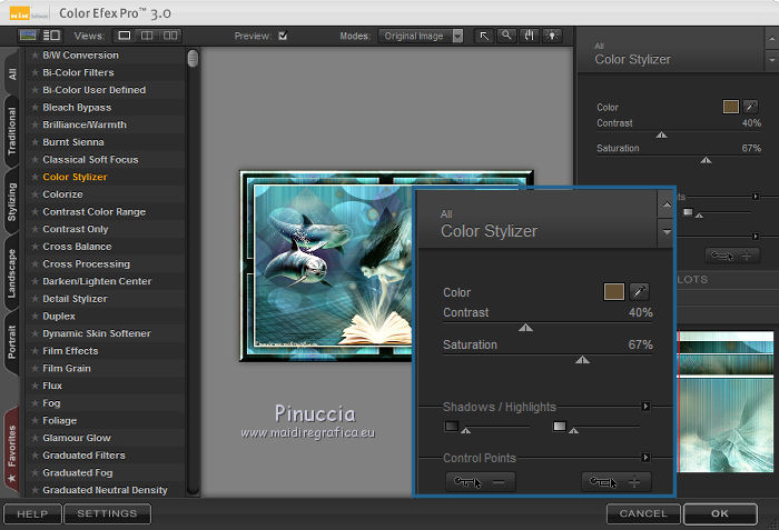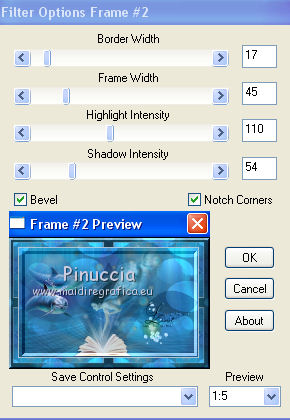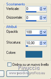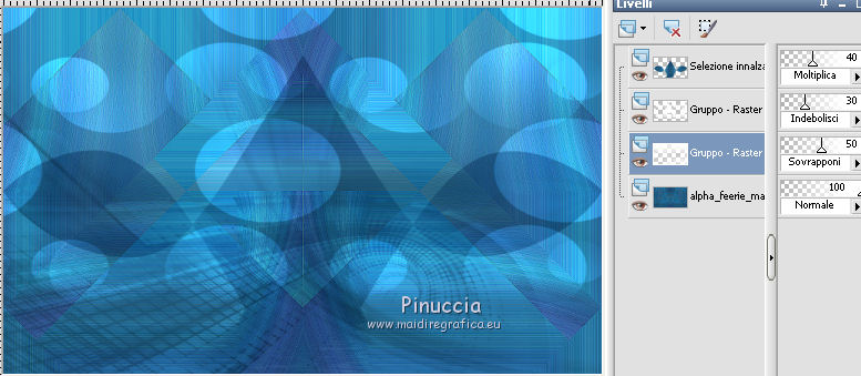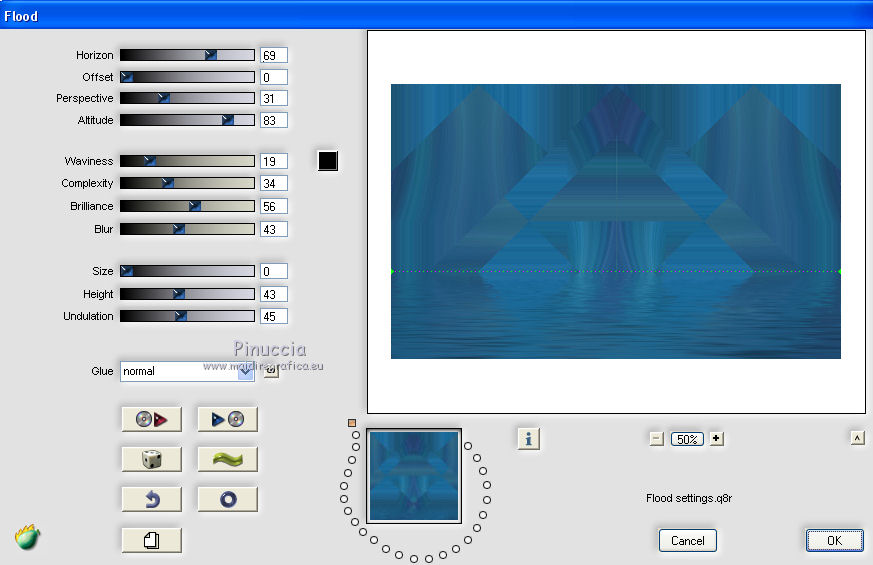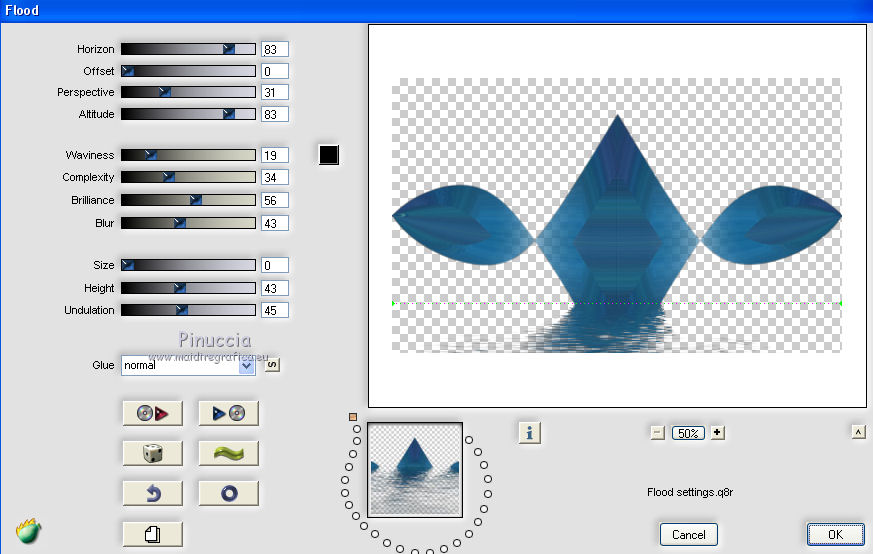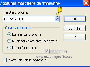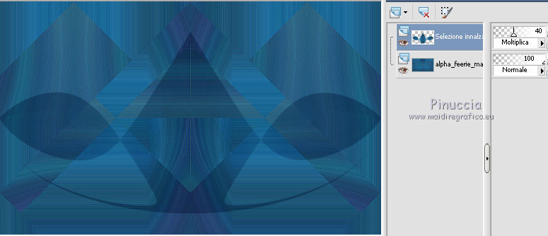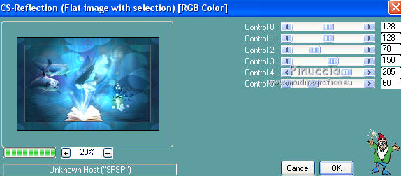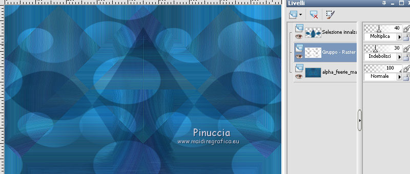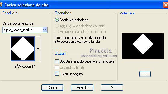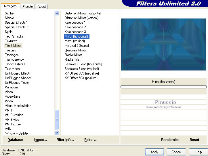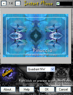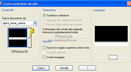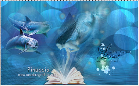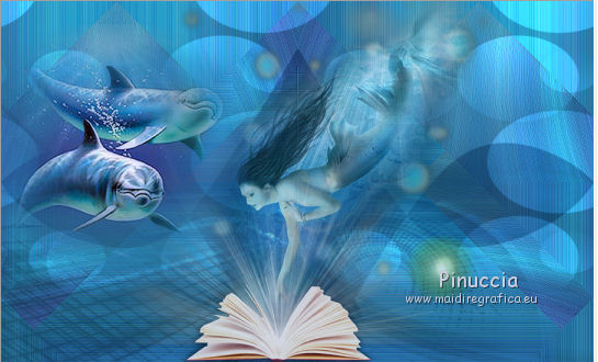 qui puoi trovare qualche risposta ai tuoi dubbi. Se l'argomento che ti interessa non è presente, ti prego di segnalarmelo. Questo tutorial è una creazione di Saturnella e non può essere copiato su altri siti nè essere offerto per il download. Lo stesso vale per la mia traduzione. E' anche proibito togliere il watermark dal materiale; rispettiamo il lavoro dei creatori di tubes, senza i quali non potremmo creare tutorials. Per tradurre questo tutorial, creato con X6, ho usato CorelX, ma può essere eseguito anche con le altre versioni di PSP. Dalla versione X4, il comando Immagine>Rifletti è stato sostituito con Immagine>Capovolgi in orizzontale, e il comando Immagine>Capovolgi con Immagine>Capovolgi in verticale. Nelle versioni X5 e X6, le funzioni sono state migliorate rendendo disponibile il menu Oggetti. Nel nuovo X7 sono tornati i comandi Immagine>Rifletti e Immagine>Capovolgi, ma con nuove funzioni. Vedi la scheda sull'argomento qui Occorrente: Materiale qui Grazie per i tubes A PSP Devil e Pacha; per le maschere Linda e Cameron. (in questa pagina trovi i links ai loro siti). Filtri in caso di dubbi, ricorda di consultare la mia sezione filtri qui Simple - Pizza slice mirror, Top left mirror, Blintz qui Filters Unlimited 2.0 qui Plugin Galaxy - Instant Mirror qui Flaming Pear - Flexify 2 qui Flaming Pear - Flood qui Carolaine and Sensibility - CS-Reflection qui Graphics Plus - Quick Tile I qui Bordermania - qui Nik Software - Color Efex Pro qui I filtri Simple e Graphics Plus si possono usare da soli o importati in Filters Unlimited (come fare vedi qui) Se un filtro fornito appare con questa icona ![]() non esitare a cambiare modalità di miscelatura e opacità secondo i colori utilizzati. Apri le maschere in PSP e minimizzale con il resto del materiale. 1. Imposta il colore di primo piano con il colore #ffffff, e il colore di sfondo con il colore #21638e. ![]() Apri alpha_feerie marine. Finestra>Duplica, o sulla tastiera maiuscola+D, per fare una copia. Chiudi l'originale. La copia, che sarà la base del tuo lavoro, non è vuota, ma contiene le selezioni salvate sul canale alfa. 2. Selezione>Seleziona tutto. Apri l'immagine 23.jpg e vai a Modifica>Copia. Torna al tuo lavoro e vai a Modifica>Incolla nella selezione. Selezione>Deseleziona. Colorizza secondo i tuoi colori. 3. Regola>Sfocatura>Sfocatura radiale. ![]() Effetti>Effetti di bordo>Aumenta di più. 4. Effetti>Plugins>Simple - Pizza Slice Mirror. 5. Effetti>Plugins>Simple - Blintz. 6. Effetti>Plugins>Filters Unlimited 2.0 - Tile and Mirror - Mirror horizontal. ![]() Effetti>Effetti di bordo>Aumenta. 7. Selezione>Carica/Salva selezione>Carica selezione da canale alfa. La selezione sélection#1 è subito disponibile. Devi soltanto cliccare Carica. ![]() Selezione>Innalza selezione a livello. 8. Effetti>Plugins>The Plugin Site - Instant Mirror nella lista dei filtri trovi i Plugin Galaxy sotto la voce The Plugin Site ![]() Selezione>Deseleziona. 9. Effetti>Effetti di immagine>Motivo unico. ![]() 10. Effetti>Pluging>Flaming Pear - Flexify 2. ![]() 11. Immagine>Capovolgi. Cambia la modalità di miscelatura di questo livello in Moltiplica, e abbassa l'opacità al 40%. ![]() 12. Selezione>Carica/Salva selezione>Carica selezione da canale alfa. Apri il menu delle selezioni e carica Sélection#2. ![]() Premi sulla tastiera il tasto CANC ![]() Selezione>Deseleziona. 13. Effetti>Plugins>Flaming Pear - Flood. ![]() 14. Livelli>Nuovo livello raster. Riempi con il colore bianco.Livelli>Nuovo livello maschera>Da immagine. Apri il menu sotto la finestra di origine e vedrai la lista dei files aperti. Seleziona la maschera mask_cameron_air3. ![]() Prima di unire il gruppo maschera: Effetti>Effetti di immagine>Motivo unico, con i settaggi precedenti. Regola>Messa a fuoco>Metti a fuoco. Livelli>Unisci>Unisci gruppo. Cambia la modalità di miscelatura di questo livello in Indebolisci, e abbassa l'opacità al 30%. Livelli>Disponi>Sposta giù. ![]() 15. Selezione>Carica/Salva selezione>Carica selezione da canale alfa. Apri il menu delle selezioni e carica Sélection#3. ![]() Premi sulla tastiera il tasto CANC. Selezione>Deseleziona. 16. Attiva il livello di sfondo. Livelli>Nuovo livello raster. Riempi con il colore bianco.Livelli>Nuovo livello maschera>Da immagine. Apri il menu sotto la finestra di origine e seleziona la maschera LF-Mask-109. ![]() Livelli>Unisci>Unisci gruppo. Cambia la modalità di miscelatura di questo livello in Sovrapponi, e abbassa l'opacità al 50%. ![]() 17. Attiva il livello superiore. Apri il tube della sirena di A PSP Devil, e vai a Modifica>Copia. Torna al tuo lavoro e vai a Modifica>Incolla come nuovo livello. Immagine>Ridimensiona, all'85%, tutti i livelli non selezionato. Posiziona correttamente il tube.Abbassa l'opacità di questo livello all'80%. 18. Effetti>Effetti 3D>Sfalsa ombra. ![]() 19. Apri il tube dei delfini di Pattif56, e vai a Modifica>Copia. Torna al tuo lavoro e vai a Modifica>Incolla come nuovo livello. Posiziona correttamente il tube.![]() 20. Effetti>Effetti 3D>Sfalsa ombra, con il colore scuro di sfondo. ![]() 21. Attiva il livello di sfondo. Effetti>Plugins>Flaming pear - Flood. ![]() 22. Attiva il livello superiore. Apri il tube wordart di WA PACHA, e vai a Modifica>Copia. Torna al tuo lavoro e vai a Modifica>Incolla come nuovo livello. Immagine>Ridimensiona, al 60%, tutti i livelli non selezionato. Cambia la modalità di miscelatura di questo livello in Luminanza (esistente). Spostalo dove preferisci o vedi il mio esempio.![]() Livelli>Unisci>Unisci visibile. Modifica>Copia. 23. Immagine>Aggiungi bordatura, 1 pixel, simmetriche, con il colore scuro. Immagine>Aggiungi bordatura, 3 pixels, simmetriche, con il colore bianco. Immagine>Aggiungi bordatura, 1 pixel, simmetriche, con il colore scuro. Immagine>Aggiungi bordatura, 50 pixels, simmetriche, con il colore bianco. 24. Attiva lo strumento Bacchetta magica ![]() e clicca nel bordo da 50 pixels per selezionarlo. Modifica>Incolla nella selezi