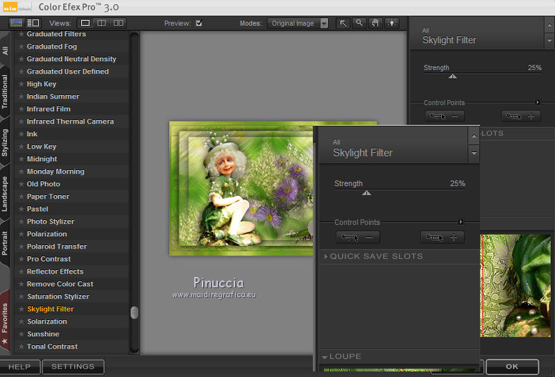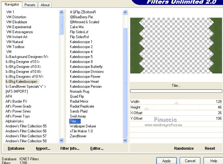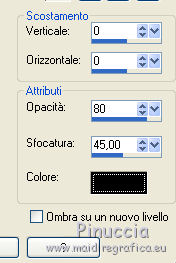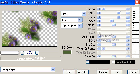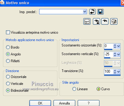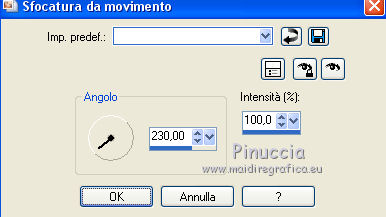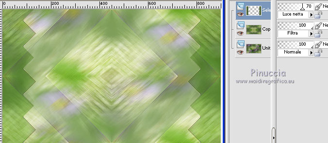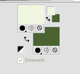 qui puoi trovare qualche risposta ai tuoi dubbi. Se l'argomento che ti interessa non è presente, ti prego di segnalarmelo. Questo tutorial è una creazione di Saturnella e non può essere copiato su altri siti nè essere offerto per il download. Lo stesso vale per la mia traduzione. E' anche proibito togliere il watermark dal materiale; rispettiamo il lavoro dei creatori di tubes, senza i quali non potremmo creare tutorials. Per tradurre questo tutorial, creato con PSP12, ho usato CorelX, ma può essere eseguito anche con le altre versioni di PSP. Dalla versione X4, il comando Immagine>Rifletti è stato sostituito con Immagine>Capovolgi in orizzontale, e il comando Immagine>Capovolgi con Immagine>Capovolgi in verticale. Nelle versioni X5 e X6, le funzioni sono state migliorate rendendo disponibile il menu Oggetti. Nel nuovo X7 sono tornati i comandi Immagine>Rifletti e Immagine>Capovolgi, ma con nuove funzioni. Vedi la scheda sull'argomento qui Occorrente: Materiale qui Grazie per i tubes Maryse, Logane e Dani. (in questa pagina trovi i links ai loro siti). Filtri in caso di dubbi, ricorda di consultare la mia sezione filtri qui Filters Unlimited 2.0 qui &<Bkg Kaleidoscope> - Tiler (da importare in Unlimited) qui Simple - Blintz, Top Left Mirror qui Mura's Meister - Copies qui Toadies - What are you qui Nik Software - Color Efex Pro qui I filtri Simple e Toadies si possono usare da soli o importati in Filters Unlimited (come fare vedi qui) Se un filtro fornito appare con questa icona ![]() non esitare a cambiare modalità di miscelatura e opacità secondo i colori utilizzati. Metti la selezione nella cartella Selezioni. 1. Imposta il colore di primo piano con il colore #f0f6e1, e il colore di sfondo con il colore #4a6331. ![]() Apri una nuova immagine trasparente 900 x 550 pixels, e riempila con il colore scuro.3. Livelli>Nuovo livello raster. Selezione>Seleziona tutto. 4. Apri il tube dei fiori di Logane, e vai a Modifica>Copia. Torna al tuo lavoro e vai a Modifica>Incolla nella selezione. Selezione>Deseleziona. 5. Effetti>Effetti di immagine>Motivo unico, con i settaggi standard. ![]() 6. Livelli>Unisci>Unisci visibile. 7. Regola>Sfocatura>Sfocatura da movimento. ![]() 8. Livelli>Duplica. Effetti>Plugins>Simple - Blintz. Effetti>Plugins>Simple - Top Left mirror. 9. Effetti>Effetti di immagine>Motivo unico. ![]() Cambia la modalità di miscelatura di questo livello in Filtra, o secondo i tuoi colori. 10. Effetti>Effetti di bordo>Aumenta di più. 11. Selezione>Carica/Salva selezione>Carica selezione da disco. Cerca e carica la selezione sat_fleur1. ![]() Selezione>Innalza selezione a livello. Selezione>Deseleziona. 12. Effetti>Plugins>Filters Unlimited 2.0 - &<Bkg Kaleidoscope> - Tiler ![]() Cambia la modalità di miscelatura di questo livello in Luce netta, e abbassa l'opacità al 70%. ![]() 13. Effetti>Effetti di distorsione>Coordinate polari. ![]() 14. Effetti>Effetti geometrici>Cerchio. ![]() 15. Effetti>Effetti di immagine>Motivo unico. ![]() 16. Livelli>Unisci>Unisci visibile. 17. Livelli>Duplica. Immagine>Ridimensiona, al 90%, tutti i livelli non selezionato. 18. Effetti>Effetti 3D>Sfalsa ombra. ![]() Cambia la modalità di miscelatura di questo livello in Luce netta, e abbassa l'opacità al 60%. 19. Livelli>Unisci>Unisci visibile. 20. Apri nuovamente il tube dei fiori di Logane, e vai a Modifica>Copia. Torna al tuo lavoro e vai a Modifica>Incolla come nuovo livello. Immagine>Ridimensiona, al 70%, tutti i livelli non selezionato. Regola>Messa a fuoco>Metti a fuoco. 21. Livelli>Duplica. Effetti>Plugins>Mura's Meister - Copies. ![]() Abbassa l'opacità di questo livello al 65%, o secondo i tuoi colori. Effetti>Effetti di bordo>Aumenta. 22. Livelli>Unisci>Unisci visibile. 23. Apri il tube di Maryse, cancella la firma, e vai a Modifica>Copia. Torna al tuo lavoro e vai a Modifica>Incolla come nuovo livello. Immagine>Rifletti. Immagine>Ridimensiona, al 70%, tutti i livelli non selezionato. Spostalo a sinistra.24. Effetti>Effetti 3D>Sfalsa ombra. ![]() 25. Apri il tube di Dani e vai a Modifica>Copia. Torna al tuo lavoro e vai a Modifica>Incolla come nuovo livello. Immagine>Rifletti. Immagine>Ridimensiona, al 70%, tutti i livelli non selezionato. Spostalo in basso a destra.26. Effetti>Effetti 3D>Sfalsa ombra, con i settaggi precedenti. Regola>Messa a fuoco>Metti a fuoco. 27. Livelli>Unisci>Unisci visibile. Modifica>Copia. 28. Immagine>Aggiungi bordatura, 2 pixels, simmetriche, colore scuro. Immagine>Aggiungi bordatura, 45 pixels, simmetriche, colore chiaro. 29. Seleziona il bordo chiaro con la bacchetta magica ![]() Modifica>Incolla nella selezione. 30. Regola>Sfocatura>Sfocatura radiale. ![]() 31. Effetti>Plugins>Toadies - What are you, con i settaggi standard. ![]() Effetti>Effetti di bordo>Aumenta. 32. Selezione>Innalza selezione a livello. Selezione>Deseleziona. 33. Livelli>Duplica. Immagine>Rifletti. Immagine>Capovolgi. Livelli>Unisci>Unisci giù. Cambia la modalità di miscelatura di questo livello in Luce netta. 34. Livelli>Unisci>Unisci visibile. 35. Selezione>Seleziona tutto. Selezione>Modifica>Contrai - 45 pixels. 36. Effetti>Effetti 3D>Sfalsa ombra, con i settaggi precedenti. Selezione>Deseleziona. 37. Apri il tube texte, o scrivi un tuo testo con un font a scelta, Modifica>Copia. Torna al tuo lavoro e vai a Modifica>Incolla come nuovo livello. 38. Firma il tuo lavoro su un nuovo livello. Livelli>Unisci>Unisci tutto. 39. Effetti>Plugins>Nik Software - Color Efex Pro - Skylight filter. ![]() 40. Immagine>Aggiungi bordatura, 2 pixels, simmetriche, colore scuro. Immagine>Ridimensiona, a 900 pixels di larghezza. tutti i livelli selezionato. Salva in formato jpg. ![]() Trovi la mia mail nella barra superiore del menu. Puoi scrivermi per qualsiasi problema, o dubbio se trovi un link che non funziona, o anche soltanto per dirmi se ti è piaciuto. Se vuoi mandarmi la tua versione, la aggiungerò alla mia traduzione. 1 Maggio 2015 |