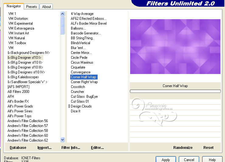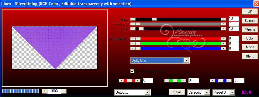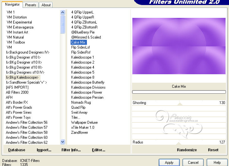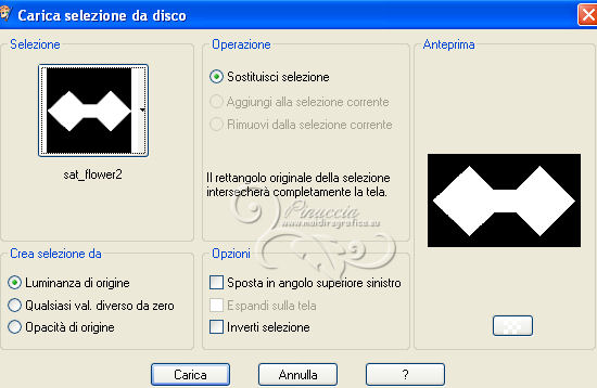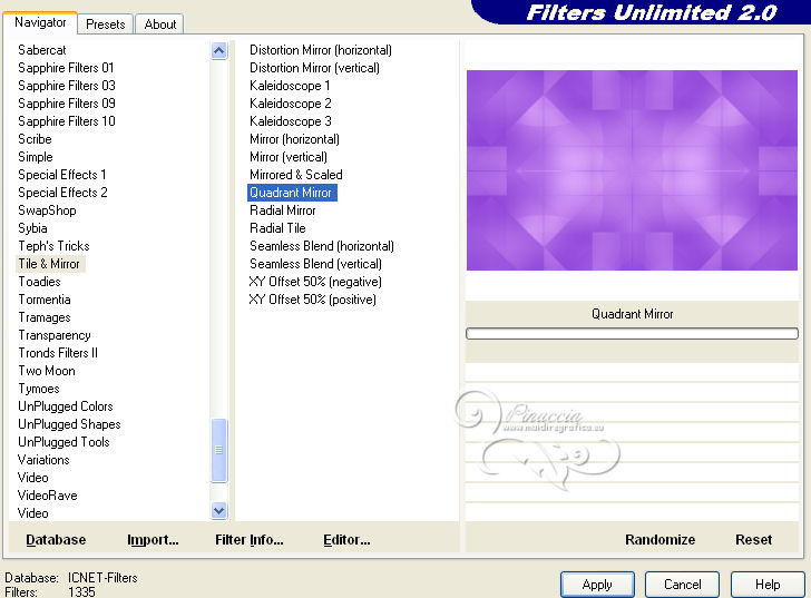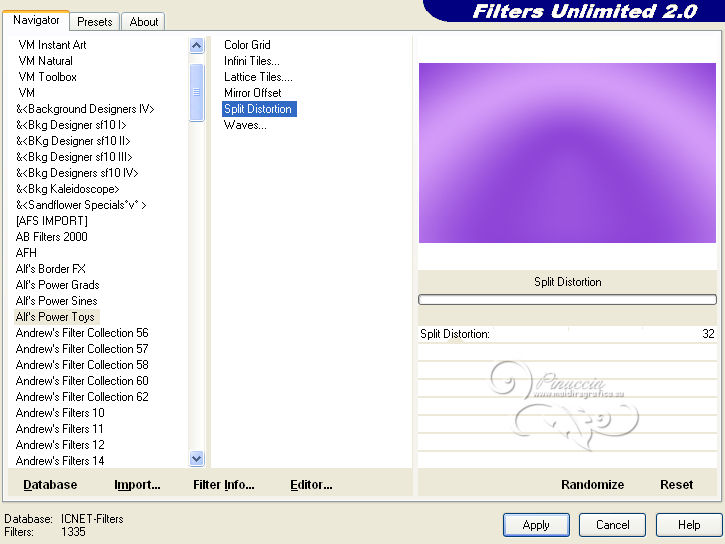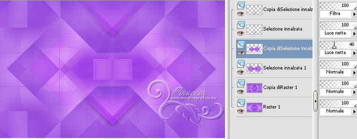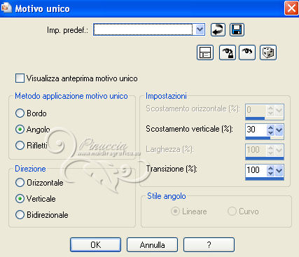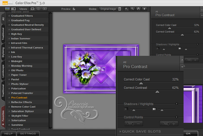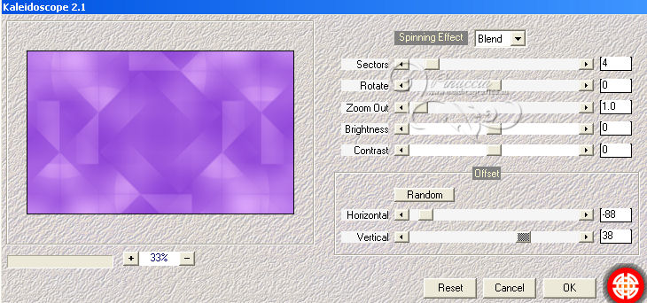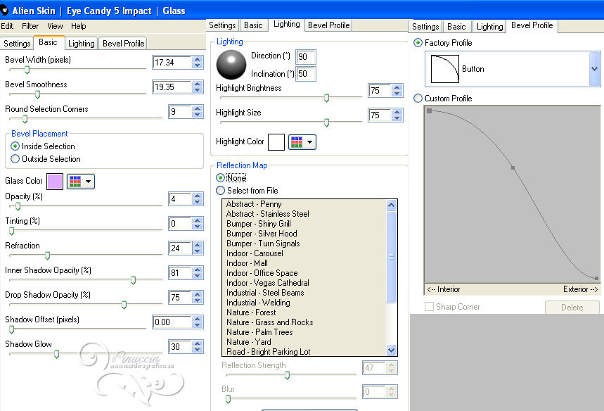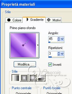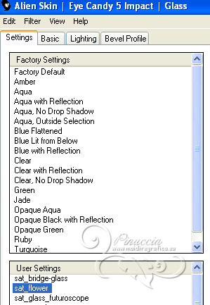 qui puoi trovare qualche risposta ai tuoi dubbi. Se l'argomento che ti interessa non è presente, ti prego di segnalarmelo. Questo tutorial è una creazione di Saturnella e non può essere copiato su altri siti nè essere offerto per il download. Lo stesso vale per la mia traduzione. E' anche proibito togliere il watermark dal materiale; rispettiamo il lavoro dei creatori di tubes, senza i quali non potremmo creare tutorials. Questo tutorial è stato creato con PSP x5, ma può essere eseguito anche con le altre versioni di PSP. Per tradurlo ho usato PSP X. Occorrente: Materiale qui Il tube della donna è di TalaNat. Il tube dei fiori è di Lamanouche. Grazie a tutti. (in questa pagina trovi i links ai loro siti). Filtri in caso di dubbi, ricorda di consultare la mia sezione filtri qui AP 01 [Innovations] - Lines SilverLining qui Filters Unlimited 2.0 qui &<Bkg Kaleidoscope> (da importare in Unlimited) qui &< Bkg Designersf10I> - Corner half wrap (da importare in Unlimited) qui Alf's Power Toys - Split Distortion qui Mehdi - Kaleidoscope 2.1 qui Teph's Tricks - Slide x50% qui VanDerLee - Unplugged-X qui Alf's border FX - Mirror Bevel qui Nik Software - Color Efex Pro qui Alien Skin Eye Candy 5 Impact qui I filtri Alf's si possono usare da soli o importati in Filters Unlimited (come fare vedi qui) Se un filtro fornito appare con questa icona ![]() non esitare a cambiare modalità di miscelatura e opacità secondo i colori utilizzati. Metti il preset Cliccando sul file una o due volte (a seconda delle tue impostazioni), automaticamente il preset si installerà nella cartella corretta. perchè uno o due clic vedi qui Metti le selezioni nella cartella Selezioni. 1. Imposta il colore di primo piano con #8136d1, e il colore di sfondo con #dfaafc. ![]() Passa il colore di primo piano a Gradiente, stile Lineare. ![]() Apri una nuova immagine trasparente 900 x 550 pixels, e riempila con il gradiente.2. Regola>Sfocatura>Sfocatura gaussiana - raggio 50. ![]() 3. Effetti>Plugins>Filters Unlimited 2.0 - Alf’s Power Toys - Split distortion. ![]() 4. Effetti>Plugins>Filters Unlimited 2.0 - &<Bkg Kaleidoscope> - Cake mix. ![]() 5. Effetti>Plugins>Filters Unlimited 2.0 - &<Bkg Kaleidoscopegt; - @BlueBerry Pie. ![]() 6. Effetti>Plugins>Mehdi - Kaleidoscope 2.1. ![]() 7. Effetti>Plugins>Filters Unlimited 2.0 - &<Bkg Designer sf10I - Corner Half Wrap. ![]() 8. Effetti>Plugins>Filters Unlimited 2.0 - Tile & Mirror - Quadrant mirror. ![]() 9. Effetti>Plugins>Teph’s Tricks - Slice X50%. Il filtro lavora da solo, senza schermata. Risultato. ![]() Effetti>Effetti di bordo>Aumenta. 10. Livelli>Duplica. Selezione>Carica/Salva selezione>Carica selezione da disco. Cerca e carica la selezione sat_flower1. ![]() Selezione>Innalza selezione a livello. 11. Effetti>Plugins>AP 01 [Innovations] - Lines SilverLining. ![]() 12. Selezione>Modifica>Contrai - 15 pixels. ![]() Selezione>Innalza selezione a livello. Effetti>Effetti 3D>Sfalsa ombra. ![]() Selezione>Deseleziona. Livelli>Unisci>Unisci giù. Effetti>Effetti 3D>Sfalsa ombra, con i settaggi precedenti. 13. Effetti>Effetti di immagine>Motivo unico. ![]() Cambia la modalità di miscelatura di questo livello in Luce netta, o secondo i tuoi colori. 14. Livelli>Duplica. Effetti>Plugins>VanDerLee - Unplugged-X - Defocus. ![]() Cambia la modalità di miscelatura di questo livello in Indebolisci. 15. Attiva il livello copia di Raster 1. ![]() Selezione>Carica/Salva selezione>Carica selezione da disco. Cerca e carica la selezione sat_flower2. ![]() 16. Effetti>Plugins>Filters Unlimited - Tile & Mirror - XY Offset 50% (negative). ![]() Selezione>Innalza selezione a livello. Selezione>Deseleziona. 17. Livelli>Duplica. Immagine>Ridimensiona, all'80%, tutti i livelli non selezionato. Cambia la modalità di miscelatura di questo livello in Luce netta, e abbassa l'opacità al 40%. ![]() 18. Attiva il livello superiore. Livelli>Nuovo livello raster. Selezione>Carica/Salva selezione>Carica selezione da disco. Cerca e carica la selezione sat_flower3. ![]() Riempi la selezione con il gradiente.19. Effetti>Plugins>Alien Skin Eye Candy 5 Impact - Glass. Seleziona il preset sat_flower e ok. ![]() Questi i settaggi che, in caso di problemi con il preset, puoi anche impostare manualmente. ![]() Selezione>Deseleziona. Livelli>Unisci>Unisci visibile. 20. Immagine>Aggiungi bordatura 2 pixels, simmetriche, con il colore scuro. 21. Livelli>Duplica. Immagine>Ridimensiona, all'85%, tutti i livelli non selezionato. 22. Effetti>Effetti 3D>Sfalsa ombra. ![]() 23. Apri il tube dei fiori di Lamanouche e vai a Modifica>Copia. Torna al tuo lavoro e vai a Modifica>Incolla come nuovo livello. Spostalo a sinistra.24. Immagine>Aggiungi bordatura, 15 pixels, simmetriche, con il colore chiaro. Immagine>Aggiungi bordatura, 30 pixels, simmetriche, con il colore bianco. 25. Seleziona il bordo bianco con la bacchetta magica ![]() e riempilo con il gradiente.26. Effetti>Effetti di trama>Intessitura. ![]() 27. Effetti>Plugins>Filters Unlimited 2.0 - Alf’s border FX - Mirror Bevel. ![]() Selezione>Inverti. Effetti>Effetti 3D>Sfalsa ombra, con i settaggi precedenti. Selezione>Deseleziona. 28. Seleziona il bordo chiaro da 15 pixels con la bacchetta magica ![]() ![]() Effetti>Effetti 3D>Smusso a incasso. ![]() Selezione>Deseleziona. 29. Effetti>Plugins>Nik Software - Color Efex Pro - Pro Contrast. ![]() 30. Apri il tube della donna di TalaNat e vai a Modifica>Copia. Torna al tuo lavoro e vai a Modifica>Incolla come nuovo livello. Immagine>Ridimensiona, al 95%, tutti i livelli non selezionato. Spostalo a destra.Regola>Messa a fuoco>Metti a fuoco. 31. Effetti>Effetti 3D>Sfalsa ombra. ![]() 32. Immagine>Aggiungi bordatura, 2 pixels, simmetriche, con il colore bianco. Aggiungi il tuo nome e/o il tuo watermark su un nuovo livello. Livelli>Unisci>Unisci tutto. Immagine>Ridimensiona, a 900 pixels di larghezza, tutti i livelli selezionato. Regola>Messa a fuoco>Maschera di contrasto. ![]() Salva in formato jpg. Per questi ese