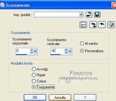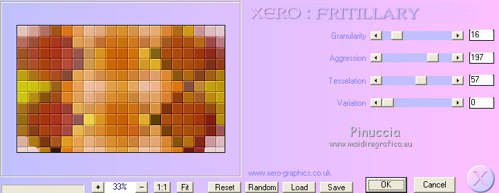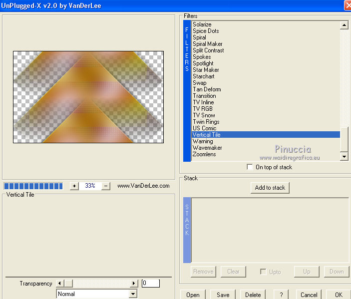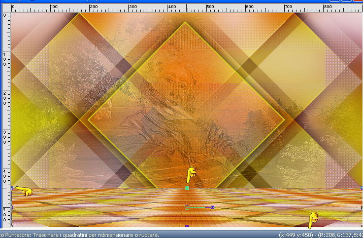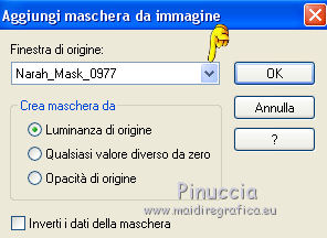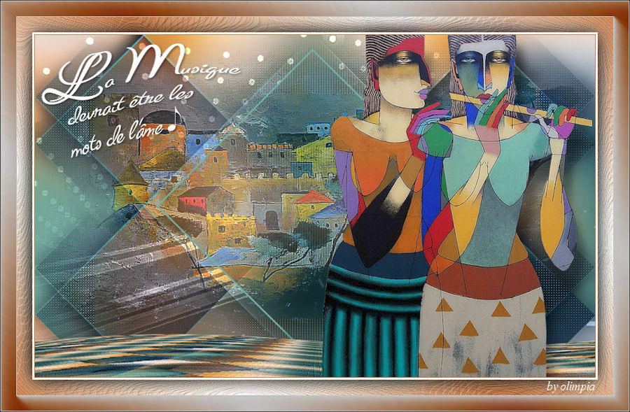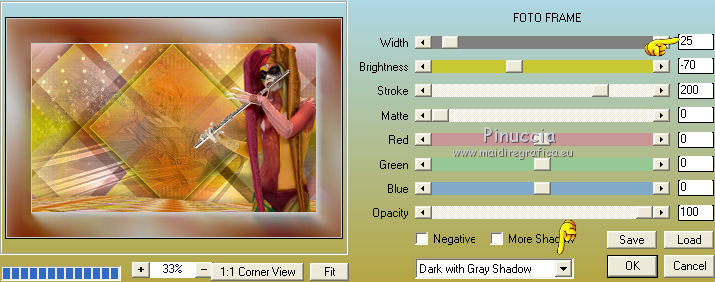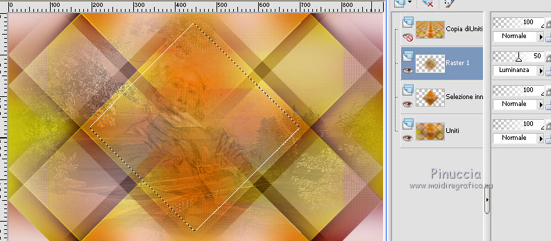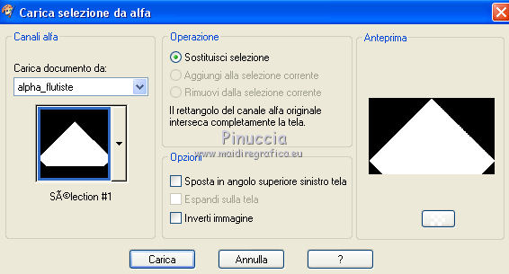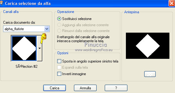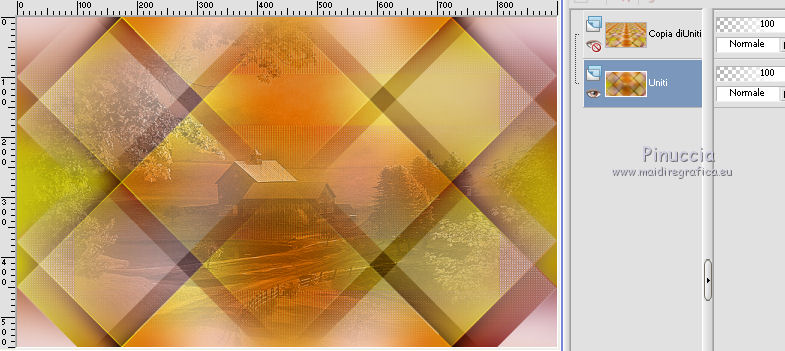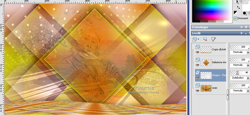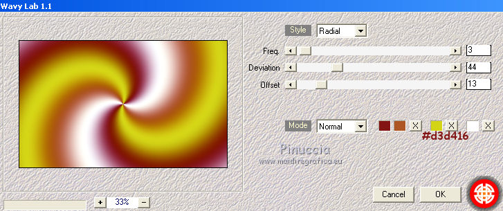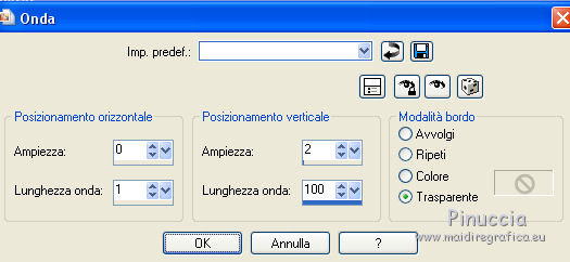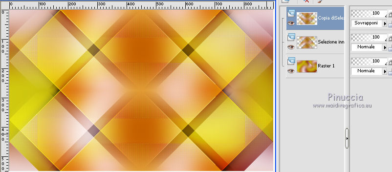 qui puoi trovare qualche risposta ai tuoi dubbi. Se l'argomento che ti interessa non è presente, ti prego di segnalarmelo. Questo tutorial è una creazione di Saturnella e non può essere copiato su altri siti nè essere offerto per il download. Lo stesso vale per la mia traduzione. E' anche proibito togliere il watermark dal materiale; rispettiamo il lavoro dei creatori di tubes, senza i quali non potremmo creare tutorials. Per tradurre questo tutorial, creato con PSP18, ho usato CorelX, ma può essere eseguito anche con le altre versioni di PSP. Dalla versione X4, il comando Immagine>Rifletti è stato sostituito con Immagine>Capovolgi in orizzontale, e il comando Immagine>Capovolgi con Immagine>Capovolgi in verticale. Nelle versioni X5 e X6, le funzioni sono state migliorate rendendo disponibile il menu Oggetti. Nel nuovo X7 sono tornati i comandi Immagine>Rifletti e Immagine>Capovolgi, ma con nuove funzioni. Vedi la scheda sull'argomento qui Occorrente: Materiale qui Grazie per il tube Maryse e per la maschera Narah. (in questa pagina trovi i links ai loro siti). Filtri in caso di dubbi, ricorda di consultare la mia sezione filtri qui Filters Unlimited 2.0 qui Simple - Blintz qui Mehdi - Wavy Lab 1.1. qui AFS IMPORT - sqborder2 qui VanDerLee - Unplugged-X qui Xero - Fritillary qui AAA Frames - Foto Frame qui Mura's Meister - Perspective Tiling qui I filtri Simple e AFS IMPORT si possono usare da soli o importati in Filters Unlimited (come fare vedi qui) Se un filtro fornito appare con questa icona ![]() non esitare a cambiare modalità di miscelatura e opacità secondo i colori utilizzati. Nelle ultime versioni di PSP non c'è il gradiente di primo piano/sfondo (Corel_06_029) Trovi i gradienti delle versioni precedenti qui Apri la maschera in PSP e minimizzala con il resto del materiale. Colori utilizzati ![]() 1. Imposta il colore di primo piano con il colore #ae5624, e il colore di sfondo con il colore scuro #831514. ![]() Apri alpha_flutiste. Finestra>Duplica o sulla tastiera maiuscola+D per fare una copia. ![]() Chiudi l'originale. La copia, che sarà la base del tuo lavoro, non è vuota, ma contiene le selezioni salvate sul canale alfa. 2. Effetti>Plugins>Mehdi - Wavy Lab 1.1. Questo filtro lavora con i colori della paletta; il primo è il colore di sfondo, il secondo quello di primo piano; cambia il terzo colore con #ded416 e il quarto colore con #ffffff. ![]() 3. Regola>Sfocatura>Sfocatura gaussiana - raggio 50. ![]() 4. Effetti>Plugins>Simple - Blintz. ![]() 5. Selezione>Carica/Salva selezione>Carica selezione da disco. La selezione sélection#1 è subito disponibile. Devi soltanto cliccare Carica. ![]() Selezione>Innalza selezione a livello. Effetti>Plugins>AFS Import - sqborder2. ![]() Effetti>Effetti di bordo>aumenta. Selezione>Deseleziona. 6. Effetti>Effetti 3D>Sfalsa ombra. ![]() 7. Effetti>Plugins>VanDerLee - Unplugged-X - Vertical Tile. ![]() 8. Livelli>Duplica. Immagine>Capovolgi. Cambia la modalità di miscelatura di questo livello in Sovrapponi, o altro. ![]() Livelli>Unisci>Unisci giù. 9. Livelli>Duplica. Effetti>Effetti 3D>Sfalsa ombra, con il tuo colore di sfondo. ![]() Livelli>Unisci>Unisci visibile. 10. Livelli>Duplica. Effetti>Plugins>Xero - Fritillary. ![]() 11. Effetti>Plugins>Mura's Meister - Perspective Tiling, con i settaggi standard ![]() Chiudi questo livello e attiva il livello sottostante. 12. Livelli>Nuovo livello raster. Selezione>Seleziona tutto. Apri il tube del paesaggio e vai a Modifica>Copia. Torna al tuo lavoro e vai a Modifica>Incolla nella selezione. Selezione>Deseleziona. Cambia la modalità di miscelatura di questo livello in Luminanza, o altro, e abbassa l'opacità al 50%. Effetti>Effetti di bordo>Aumenta. Livelli>Unisci>Unisci giù. Modalità di miscelatura Normale, opacità 100. ![]() 13. Selezione>Carica/Salva selezione>Carica selezione da canale alfa. Apri il menu delle selezioni e carica sélection#2. ![]() Selezione>Innalza selezione a livello. 14. Livelli>Nuovo livello raster. Apri il tube musicien1. Immagine>Rifletti. Modifica>Copia. Torna al tuo lavoro e vai a Modifica>Incolla nella selezione. Cambia la modalità di miscelatura di questo livello in Luminanza, e abbassa l'opacità al 50%. ![]() Effetti>Effetti di bordo>Aumenta. Livelli>Unisci>Unisci giù. 15. Selezione>Modifica>Seleziona bordature selezione. ![]() Imposta il colore di sfondo con il colore #d3d416. ![]() Modalità di corrispondenza dello strumento Riempimento su Nessuno. ![]() Riempi la selezione con il colore di sfondo #d3d416.Selezione>Deseleziona. 16. Effetti>Effetti 3D>Sfalsa ombra. ![]() 17. Riapri e attiva il livello superiore. Premi il tasto K per attivare lo strumento Puntatore ![]() se stai usando PSP 9 il tasto D per attivare lo strumento Deformazione ![]() in modalità Scala ,spingi il nodo superiore centrale verso il basso fino a 450 pixels (se non visualizzi i Righelli, vai a Visualizza>Righelli) ![]() Tasto M per deselezionare lo strumento. 18. Effetti>Effetti di distorsione>Onda. ![]() 19. Effetti>Effetti di immagine>Scostamento. ![]() 20. Effetti>Effetti 3D>Sfalsa ombra. ![]() 21. Cambia il colore di sfondo con il colore bianco. ![]() Attiva il livello di sfondo. Livelli>Nuovo livello raster. Riempi il livello con il colore bianco.Livelli>Nuovo livello maschera>Da immagine. Apri il menu sotto la finestra di origine e vedrai la lista dei files aperti. Seleziona la maschera Narah_mask_0977. ![]() Effetti>Effetti di bordo>Aumenta di più. Livelli>Unisci>Unisci gruppo. Cambia la modalità di miscelatura di questo livello in Indebolisci, e abbassa l'opacità al 40%. ![]() 22. Attiva il livello superiore. Apri il tube di Maryse e vai a Modifica>Copia. Torna al tuo lavoro e vai a Modifica>Incolla nella come nuovo livello. Immagine>Ridimensiona, 2 volte all'85%, tutti i livelli non selezionato. Regola>Messa a fuoco>Metti a fuoco. Effetti>Effetti 3D>Sfalsa ombra. ![]() Sposta il tube a destra.23. Mantieni i colori della tua paletta: colore di primo piano #a