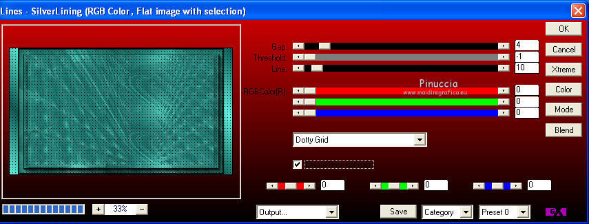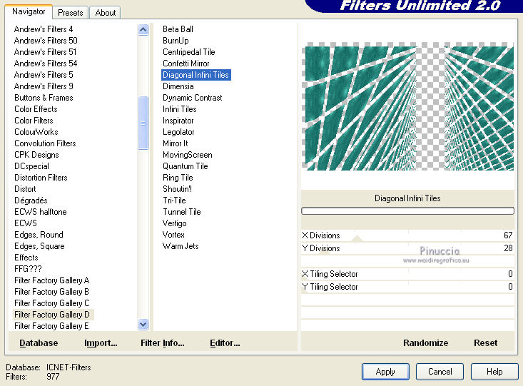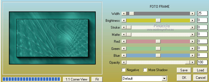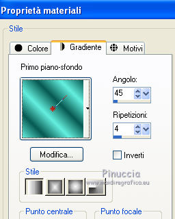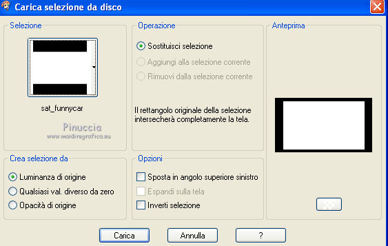 qui puoi trovare qualche risposta ai tuoi dubbi. Se l'argomento che ti interessa non è presente, ti prego di segnalarmelo. Questo tutorial è una creazione di Saturnella e non può essere copiato su altri siti nè essere offerto per il download. Lo stesso vale per la mia traduzione. E' anche proibito togliere il watermark dal materiale; rispettiamo il lavoro dei creatori di tubes, senza i quali non potremmo creare tutorials. Il tutorial è stato creato con PSP12, ma può essere eseguito anche con le altre versioni. Per tradurlo, ho usato PSP X. Occorrente: Materiale qui Il tube dell'auto è di Castorke. Il tube del personaggio è di Lila. Il tube del paesaggio è di Sonia. La maschera è di Jill. Grazie a tutti per il vostro magnifico lavoro. (in questa pagina trovi i links ai loro siti). Filtri in caso di dubbi, ricorda di consultare la mia sezione filtri qui AAA Frames - Foto Frame qui AP 01 Innovations qui Filters Unlimited 2.0 qui Filter Factory Galledy D - Infini tiles qui ![]() non esitare a cambiare modalità di miscelatura e opacità secondo i colori utilizzati. Metti la selezione nella cartella Selezioni. Apri la maschera in PSP e minimizzala con il resto del materiale. 1. Imposta il colore di primo piano con #63efde, e il colore di sfondo con #085952. ![]() 2. Apri una nuova immagine trasparente 900 x 550 pixels, e riempila con il colore scuro.3. Livelli>Nuovo livello raster. Riempi con il colore chiaro.4. Livelli>Nuovo livello maschera>Da immagine. Apri il menu sotto la finestra di origine e vedrai la lista dei files aperti. Seleziona la maschera Jillmask_moonlight5 ![]() Regola>Messa a fuoco>Accentua messa a fuoco. Livelli>Unisci>Unisci gruppo. 5. Effetti>Effetti 3D>Sfalsa ombra. ![]() 6. Livelli>Unisci>Unisci visibile. 7. Livelli>Duplica. Immagine>Ridimensiona, all'80%, tutti i livelli non selezionato. 8. Effetti>Effetti 3D>Sfalsa ombra. ![]() 9. Effetti>Plugins>Filters Unlimited 2.0 - Filter Factory Gallery D - Diagonal Infini Tiles. ![]() Immagine>Capovolgi. Abbassa l'opacità di questo livello all'80%. 10. Livelli>Unisci>Unisci visibile. 11. Livelli>Duplica. Immagine>Ridimensiona, al 90%, tutti i livelli non selezionato. 12. Effetti>Effetti 3D>Sfalsa ombra, con i settaggi precedenti. 13. Livelli>Unisci>Unisci visibile. 14. Effetti>Plugins>AAA Frames - Foto Frame. ![]() Ripeti l'Effetto cambiando width con 5. ![]() 15. Immagine>Aggiungi bordatura, simmetriche non selezionato, colore bianco. ![]() 16. Seleziona i due bordi bianchi con la bacchetta magica ![]() Passa il colore di primo piano a Gradiente, stile Lineare. ![]() Riempi le selezioni con il gradiente.17. Effetti>Plugins>AP 01 Innovations - Lines SilverLining. ![]() Selezione>Inverti. Effetti>Effetti 3D>Sfalsa ombra, con i settaggi precedenti. Selezione>Deseleziona. 18. Livelli>Nuovo livello raster. Selezione>Carica/Salva selezione>Carica selezione da disco. Cerca e carica la selezione sat_funnycar. ![]() 19. Apri il tube Beautiful view di Sonia e vai a Modifica>Copia. Torna al tuo lavoro e vai a Modifica>Incolla nella selezione. Immagine>Ridimensiona, al 120%, tutti i livelli non selezionato. Posiziona correttamente il tube nell'area selezionata.Selezione>Inverti. Premi sulla tastiera il tasto CANC. Selezione>Deseleziona. 20. Effetti>Effetti tecniche di disegno>Pennellate, con i settaggi standard. ![]() 21. Apri il tube dell'auto di Castorke e vai a Modifica>Copia. Torna al tuo lavoro e vai a Modifica>Incolla come nuovo livello. Immagine>Ridimensiona, al 60%, tutti i livelli non selezionato. 22. Effetti>Effetti 3D>Sfalsa ombra, con i settaggi standard. ![]() Sposta il tube a destra.Abbassa l'opacità di questo livello all'80%. 23. Apri il tube di Lila e vai a Modifica>Copia. Torna al tuo lavoro e vai a Modifica>Incolla come nuovo livello. Cancella la firma.Spostalo a sinistra, come nel mio esempio.24. Effetti>Effetti 3D>Sfalsa ombra, con i settaggi precedenti. 25. Firma il tuo lavoro. Livelli>Unisci>Unisci tutto. 26. Immagine>Aggiungi bordatura, 2 pixels, simmetriche, con il colore scuro. Immagine>Aggiungi bordatura, 4 pixels, simmetriche, con il colore chiaro. Immagine>Aggiungi bordatura, 2 pixels, simmetriche, con il colore scuro. Immagine>Aggiungi bordatura, 40 pixels, simmetriche, con il colore chiaro. 27. Seleziona il bordo da 40 pixels con la bacchetta magica ![]() e riempilo con il gradiente.28. Effetti>Plugins>AP 01 Innovations - Lines SilverLining, con i settaggi precedenti. 29. Effetti>Plugins>AAA Frames - Foto Frame - width a 20. Ripeti l'Effetto width a 5. Selezione>Deseleziona. 30. Immagine>Ridimensiona, a 900 pixels di larghezza, tutti i livelli selezionato. Regola>Messa a fuoco>Metti a fuoco. Salva in formato jpg. ![]() Se hai problemi o dubbi, o trovi un link non funzionante, o anche soltanto per dirmi che ti è piaciuto, scrivimi. 18 Maggio 2012 |