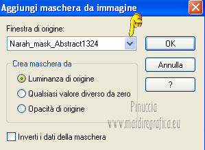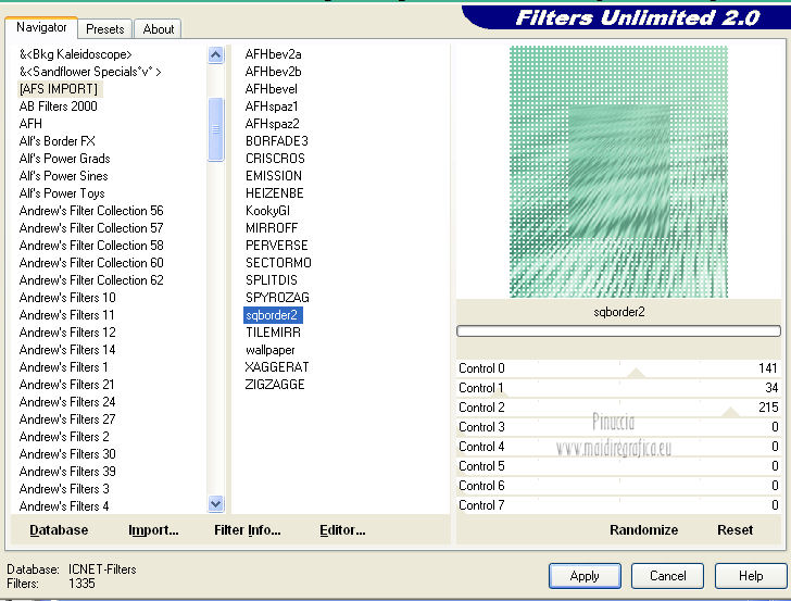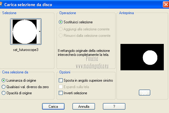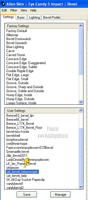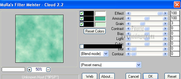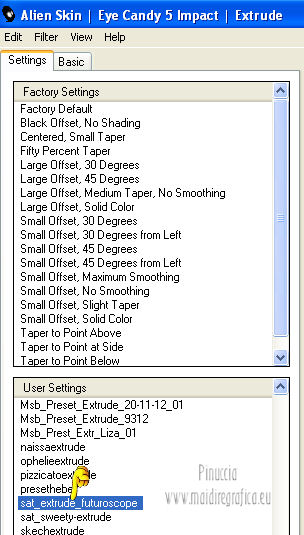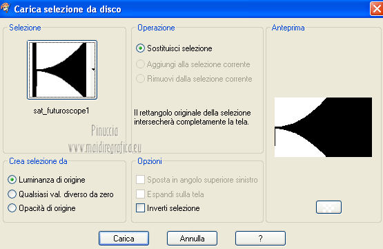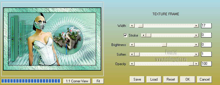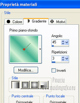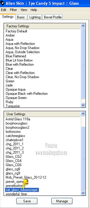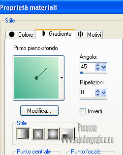 qui puoi trovare qualche risposta ai tuoi dubbi. Se l'argomento che ti interessa non è presente, ti prego di segnalarmelo. Questo tutorial è una creazione di Saturnella e non può essere copiato su altri siti nè essere offerto per il download. Lo stesso vale per la mia traduzione. E' anche proibito togliere il watermark dal materiale; rispettiamo il lavoro dei creatori di tubes, senza i quali non potremmo creare tutorials. Questo tutorial è stato creato con PSP 12, ma può essere eseguito anche con le altre versioni di PSP. Per tradurlo ho usato PSP X. Occorrente: Materiale qui I tubes usati sono di Ana Ridzi, Tyna Reagen. La maschera è di Narah. Grazie a tutti per il vostro magnifico lavoro. (in questa pagina trovi i links ai loro siti). Filtri in caso di dubbi, ricorda di consultare la mia sezione filtri qui Filters Unlimited 2.0 qui AFS Import, sqborder2 qui Adjust - Variations qui Mura's Meister - Cloud qui AAA Frames - Texture Frame qui Alien Skin Eye Candy 5 Impact qui Almathera qui ![]() non esitare a cambiare modalità di miscelatura e opacità secondo i colori utilizzati. Metti i preset nelle rispettive cartelle del filtro Alien Skin Eye Candy 5 Impact>Setting>Bevel/Extrude/Glass. Clicca sul file una o due volte (a seconda delle tue impostazioni) il preset si installerà automaticamente nella cartella corretta. perchè uno o due clic vedi qui Metti le selezioni nella cartella Selezioni. Apri la maschera in PSP e minimizzala con il resto del materiale. 1. Imposta il colore di primo piano con #41b18f, e il colore di sfondo con #f4f1d5. ![]() Passa il colore di primo piano a Gradiente, stile Lineare ![]() Apri una nuova immagine trasparente 900 x 550 pixels, e riempila con il gradiente.2. Livelli>Duplica. Effetti>Plugins>Almathera - A Puddle. ![]() Livelli>Unisci>Unisci giù. 3. Livelli>Nuovo livello raster. Imposta il colore di primo piano con il colore bianco. Riempi il livello con il colore bianco.4. Livelli>Nuovo livello maschera>Da immagine. Apri il menu sotto la finestra di origine e vedrai la lista dei files aperti. Seleziona la maschera Narah_mask_Abstract132. ![]() Effetti>Effetti di bordo>Aumenta. Livelli>Unisci>Unisci gruppo. 5. Effetti>Effetti 3D>Sfalsa ombra, con il colore bianco. ![]() 6. Attiva il livello di sfondo. Selezione>Carica/Salva selezione>Carica selezione da disco. Cerca e carica la selezione sat_futuroscope1. ![]() 7. Effetti>Plugins>Filters Unlimited 2.0 - AFS Import - sqborder2. ![]() 8. Selezione>Innalza selezione a livello. Selezione>Deseleziona. Livelli>Disponi>Porta in alto. Cambia la modalità di miscelatura di questo livello in Moltiplica, e abbassa l'opacità al 62% (o secondo i tuoi colori). ![]() 9. Livelli>Unisci>Unisci visibile. 10. Selezione>Carica/Salva selezione>Carica selezione da disco. Carica nuovamente la selezione sat_futuroscope2. ![]() Livelli>Nuovo livello raster. Imposta nuovamente il colore di primo piano con il colore scuro #41b18f. Riempi con il colore scuro.11. Effetti>Plugins>Alien Skin Eye Candy 5 Impact - Extrude. Seleziona il preset sat_extrude_futuroscope e ok. ![]() 12. Effetti>Plugins>Alien Skin Eye Candy 5 Impact - Bevel. Seleziona il preset sat_bevel_futuroscope e ok. ![]() Selezione>Deseleziona. 13. Effetti>Effetti 3D>Sfalsa ombra. ![]() 14. Livelli>Duplica. Immagine>Ridimensiona, all'80%, tutti i livelli non selezionato. Abbassa l'opacità di questo livello al 75%. 15. Livelli>Duplica. Immagine>Ridimensiona, all'80%, tutti i livelli non selezionato. 16. Livelli>Unisci>Unisci giù - 2 volte. 17. Apri il tube sat_element e vai a Modifica>Copia. Torna al tuo lavoro e vai a Modifica>Incolla come nuovo livello. Spostalo sulla prima colonna, come nell'esempio.![]() La modalità di miscelatura di questo livello è impostata in Moltiplica. 18. Effetti>Effetti 3D>Sfalsa ombra, con i settaggi precedenti. 19. Livelli>Duplica. Immagine>Ridimensiona, all'80%, tutti i livelli non selezionato. 20. Livelli>Duplica. Immagine>Ridimensiona, all'80%, tutti i livelli non selezionato. 21. Livelli>Unisci>Unisci giù - 2 volte. 22. Selezione>Carica/Salva selezione>Carica selezione da disco. Carica nuovamente la selezione sat_futuroscope3. ![]() Livelli>Nuovo livello raster. Effetti>Plugins>Mura's Meister - Clouds, con i colori di partenza. ![]() Mantieni selezionato. 23. Effetti>Plugins>Alien Skin Eye Candy 5 Impact - Glass. Seleziona il preset sat_glass_futuroscope e ok. ![]() Mantieni ancora selezionato. 24. Livelli>Nuovo livello raster. Apri il tube del paesaggio di Tyna Reagen. Cancella il piccolo watermark visibile sul livello del tube, e vai a Modifica>Copia. Torna al tuo lavoro e vai a Modifica>Incolla nella selezione. Selezione>Deseleziona. 25. Effetti>Effetti 3D>Sfalsa ombra, con i settaggi precedenti. 26. Apri il tube del personaggio di Ana Ridzi. Modifica>Copia. Torna al tuo lavoro e vai a Modifica>Incolla come nuovo livello. Immagine>Ridimensiona, al 70%, tutti i livelli non selezionato. 27. Effetti>Effetti 3D>Sfalsa ombra. ![]() 28. Attiva il livello di sfondo. Effetti>Plugins>Adjust - Variations. Per i miei colori (se stai usando altri colori, dovrai adattare i settaggi a questi). Un clic su original per annullare eventuali precedenti settaggi memorizzati dal filtro. Un clic su More blue, un clic su Darker e ok. ![]() 29. Immagine>Aggiungi bordatura, 2 pixels, simmetriche, con il colore scuro. Immagine>Aggiungi bordatura, 45 pixels, simmetriche, con il colore bianco. Seleziona questo bordo con la bacchetta magica ![]() Passa il colore di primo piano a Gradiente, con i seguenti settaggi. ![]() Riempi la selezione con il gradiente.30. Effetti>Plugins>Filters Unlimited 2.0 - AFS Import - sqborder2, con i settaggi standard. 31. Effetti>Plugins>AAA Frames - Texture Frame. ![]() 32. Selezione>Inverti. Effetti>Effetti 3D>Sfalsa ombra. ![]() Selezione>Deseleziona. 33. Immagine>Aggiungi bordatura, 2 pixels, simmetriche, con il colore nero. 34. Apri il file di testo e vai a Modifica>Copia. Torna al tuo lavoro e vai a Modifica>Incol
