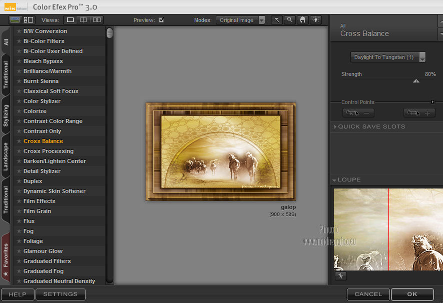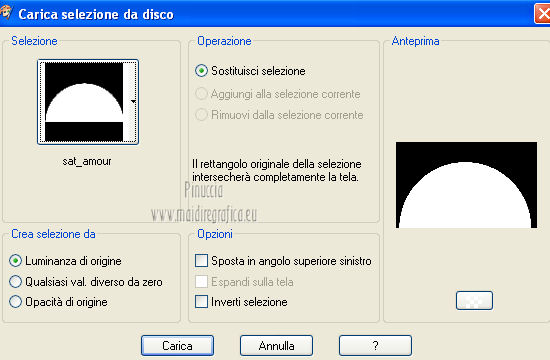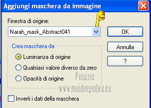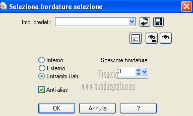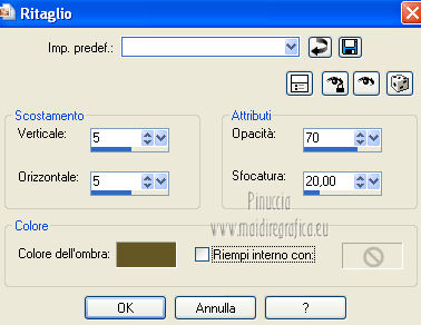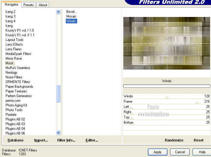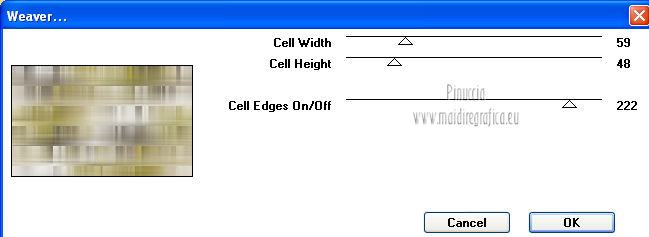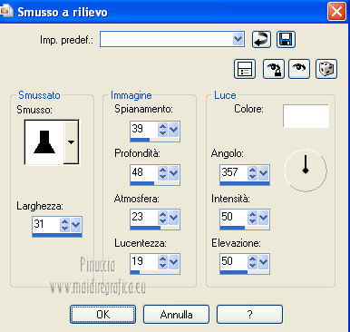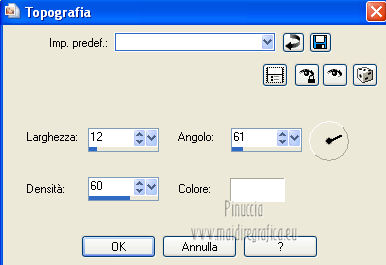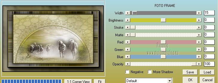 qui puoi trovare qualche risposta ai tuoi dubbi. Se l'argomento che ti interessa non è presente, ti prego di segnalarmelo. Questo tutorial è una creazione di Saturnella e non può essere copiato su altri siti nè essere offerto per il download. Lo stesso vale per la mia traduzione. E' anche proibito togliere il watermark dal materiale; rispettiamo il lavoro dei creatori di tubes, senza i quali non potremmo creare tutorials. Questo tutorial è stato creato con PSP 15, ma può essere eseguito anche con le altre versioni di PSP. Per tradurlo ho usato PSP X. Occorrente: Materiale qui Il tube del paesaggio è di Anny. Il tube dei cavalli è di Logane. La maschera è di Narah. Grazie a tutti per il vostro magnifico lavoro. (in questa pagina trovi i links ai loro siti). Filtri in caso di dubbi, ricorda di consultare la mia sezione filtri qui Filters Unlimited 2.0 qui Mock - Windo qui FM Tile Tools - Blend Emboss qui Toadies - Weaver, What are you qui AAA Frames - Foto Frame qui Nik Software - Color Efex Pro qui Alien Skin Eye Candy 5 Impact - Glass qui Simple - Blintz, 4way average qui ![]() non esitare a cambiare modalità di miscelatura e opacità secondo i colori utilizzati. Metti la selezione nella cartella Selezioni. Apri la maschera in PSP e minimizzala con il resto del materiale. 1. Imposta il colore di primo piano con il colore scuro #655824, e il colore di sfondo con il colore chiaro #ebe3bc. ![]() Apri una nuova immagine trasparente 900 x 550 pixels, e riempila con il colore di sfondo.2. Livelli>Nuovo livello raster. Selezione>Seleziona tutto. Apri il tube del paesaggio Annytubes_paisajes e vai a Modifica>Copia. Torna al tuo lavoro e vai a Modifica>Incolla nella selezione. Selezione>Deseleziona. 3. Effetti>Effetti di immagine>Motivo unico, con i settaggi standard. ![]() 4. Regola>Sfocatura>Sfocatura radiale. ![]() Livelli>Unisci>Unisci visibile. 5. Effetti>Effetti artistici>Topografia. ![]() 6. Livelli>Nuovo livello raster. Riempi con il colore chiaro.7. Livelli>Nuovo livello maschera>Da immagine. Apri il menu sotto la finestra di origine e vedrai la lista dei files aperti. Seleziona la maschera Narah_mask-Abstract041, con i seguenti settaggi: ![]() Effetti>Effetti di bordo>Aumenta. Livelli>Unisci>Unisci gruppo. Cambia la modalità di miscelatura di questo livello in Moltiplica (o secondo i tuoi colori). 8. Effetti>Effetti 3D>Sfalsa ombra. ![]() Livelli>Unisci>Unisci visibile. 9. Selezione>Carica/Salva selezione>Carica selezione da disco. Cerca e carica la selezione sat_amour. ![]() 10. Livelli>Nuovo livello raster. Modifica>Incolla nella selezione. (il tube del paesaggio è ancora in memoria). 11. Selezione>Inverti. Effetti>Effetti 3D>Smusso a rilievo. ![]() 12. Selezione>Inverti. Livelli>Nuovo livello raster. Effetti>Effetti 3D>Ritaglio, con il tuo colore scuro. ![]() 13. Livelli>Nuovo livello raster. Ripeti l'Effetto Ritaglio, cambiando verticale e orizzontale con -5. ![]() Selezione>Deseleziona. 14. Livelli>Unisci>Unisci giù - 2 volte. 15. Effetti>Effetti di immagine>Scostamento. ![]() 16. Apri il tube dei cavalli di Logane e vai a Modifica>Copia. Torna al tuo lavoro e vai a Modifica>Incolla come nuovo livello. Posiziona correttamente il tube.17. Effetti>Plugins>FM Tile Tools - Blend Emboss, con i settaggi standard. ![]() Livelli>Unisci>Unisci visibile. 18. Livelli>Duplica. Immagine>Ridimensiona, al 90%, tutti i livelli non selezionato. 19. Attiva il livello di sfondo. Effetti>Effetti di immagine>Motivo unico, con i settaggi standard. ![]() 20. Effetti>Plugins>Toadies - Weaver. ![]() 21. Effetti>Plugins>Filters Unlimited 2.0 - Mock - Windo. ![]() Effetti>Effetti di bordo>Aumenta. 22. Livelli>Nuovo livello raster. Livelli>Disponi>Porta sotto. Riempi con il colore scuro.23. Attiva il livello superiore. Selezione>Seleziona tutto. Selezione>Mobile. Selezione>Immobilizza. Selezione>Modifica>Seleziona bordature selezione. ![]() 24. Livelli>Nuovo livello raster. Riempi con il colore scuro.25. Effetti>Plugins>Alien Skin Eye Candy 5 Impact - Glass. Seleziona il preset Clear e ok. ![]() 26. Effetti>Effetti 3D>Sfalsa ombra. ![]() Livelli>Unisci>Unisci giù. Selezione>Deseleziona. 27. Effetti>Effetti 3D>Sfalsa ombra. ![]() Livelli>Unisci>Unisci visibile. Modifica>Copia. 28. Immagine>Aggiungi bordatura, 2 pixels, simmetriche, con il colore scuro. Immagine>Aggiungi bordatura, 2 pixels, simmetriche, con il colore chiaro. Immagine>Aggiungi bordatura, 2 pixels, simmetriche, con il colore scuro. Immagine>Aggiungi bordatura, 50 pixels, simmetriche, con il colore bianco. 29. Seleziona il bordo bianco con la bacchetta magica ![]() Modifica>Incolla nella selezione. 30. Effetti>Plugins>Simple - Blintz. Effetti>Plugins>Simple - 4way average. 31. Effetti>Plugins>Toadies - What are you. ![]() 32. Selezione>Inverti. Effetti>Effetti 3D>Sfalsa ombra. ![]() Selezione>Deseleziona. 33. Effetti>Plugins>AAA Frames - Foto Frame. ![]() 34. Aggiungi il tuo nome e/o il tuo watermark su un nuovo livello. Livelli>Unisci>Unisci tutto. 35. Immagine>Ridimensiona - a 900 pixels di larghezza, tutti i livelli non selezionato. Regola>Messa a fuoco>Maschera di contrasto. ![]() Effetti>Plugins>Nik Software - Color Efex Pro - Cross Balance, con i settaggi standard. ![]() Salva in formato jpg. ![]() Se hai problemi o dubbi, o trovi un link non funzionante, o anche soltanto per dirmi che ti è piaciuto, scrivimi. 18 Ottobre 2012 |