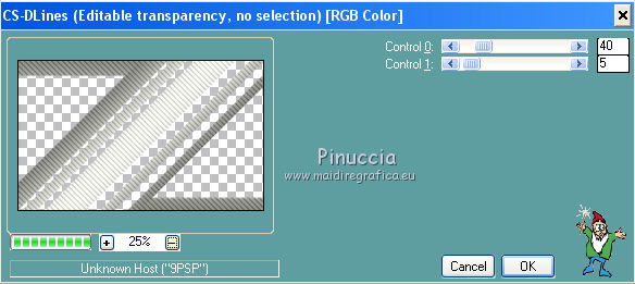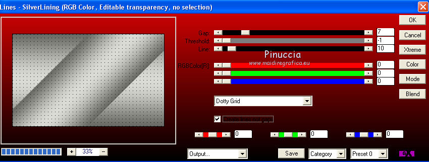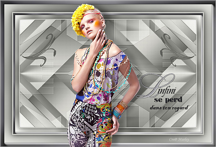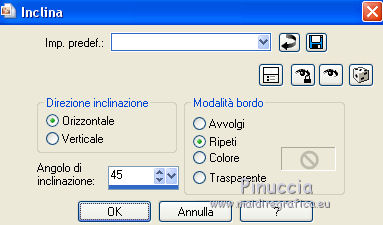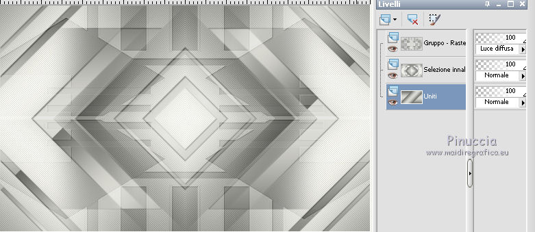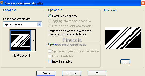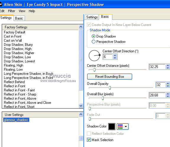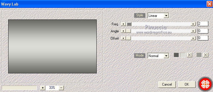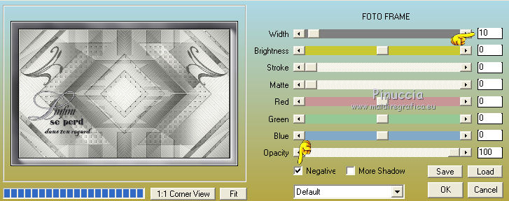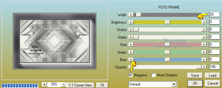 qui puoi trovare qualche risposta ai tuoi dubbi. Se l'argomento che ti interessa non è presente, ti prego di segnalarmelo. Questo tutorial è una creazione di Saturnella e non può essere copiato su altri siti nè essere offerto per il download. Lo stesso vale per la mia traduzione. E' anche proibito togliere il watermark dal materiale; rispettiamo il lavoro dei creatori di tubes, senza i quali non potremmo creare tutorials. Per tradurre questo tutorial, creato con X6, ho usato CorelX, ma può essere eseguito anche con le altre versioni di PSP. Dalla versione X4, il comando Immagine>Rifletti è stato sostituito con Immagine>Capovolgi in orizzontale, e il comando Immagine>Capovolgi con Immagine>Capovolgi in verticale. Nelle versioni X5 e X6, le funzioni sono state migliorate rendendo disponibile il menu Oggetti. Nel nuovo X7 sono tornati i comandi Immagine>Rifletti e Immagine>Capovolgi, ma con nuove funzioni. Vedi la scheda sull'argomento qui Occorrente: Materiale qui Grazie per il tube Min@, per la maschera Cameron. (in questa pagina trovi i links ai loro siti). Filtri in caso di dubbi, ricorda di consultare la mia sezione filtri qui Mehdi - Wavy Lab qui Carolaine and Sensibility - CS-DLines qui Plugin Galaxy - Instant Mirror qui AP 01 [Innovations] - Lines SilverLining qui AAA Frames - Foto Frame qui Alien Skin Eye Candy 5 Impact - Perspective Shadow qui ![]() non esitare a cambiare modalità di miscelatura e opacità secondo i colori utilizzati. Metti il preset Cliccando sul file una o due volte (a seconda delle tue impostazioni), automaticamente il preset si installerà nella cartella corretta. perchè uno o due clic vedi qui Apri la maschera in PSP e minimizzala con il resto del materiale. 1. Imposta il colore di primo piano con il colore chiaro #dbdbd5, e il colore di sfondo con il colore scuro #5c5d58. ![]() Apri alpha_glamour. Finestra>Duplica, o sulla tastiera maiuscola+D, per fare una copia. Chiudi l'originale. La copia, che sarà la base del tuo lavoro, non è vuota, ma contiene una selezione salvata sul canale alfa. Effetti>Plugins>Mehdi - Wavy Lab. Questo filtro lavora con i colori della paletta: il primo è il colore di sfondo, il secondo quello di primo piano. mantieni il terzo colore creato dal filtro. ![]() 2. Livelli>Duplica. Immagine>Ruota per gradi - 90 gradi a sinistra. ![]() 3. Attiva il livello di sfondo. Selezione>Seleziona tutto. Immagine>Ritaglia la selezione. Livelli>Unisci>Unisci visibile. 4. Effetti>Effetti geometrici>Inclina. ![]() 5. Selezione>Carica/Salva selezione>Carica selezione da canale alfa. La selezione sélection#1 è subito disponibile. Devi soltanto cliccare Carica. ![]() Selezione>Innalza selezione a livello. Selezione>Deseleziona. 6. Effetti>Plugins>Carolaine and Sensibility - CS-DLines. ![]() 7. Effetti>Effetti di immagine>Motivo unico. ![]() 8. Effetti>Effetti 3D>Sfalsa ombra, colore scuro. ![]() 9. Effetti>Plugins>The Plugin Site - Instant Mirror i filtri Galaxy nella lista degli effetti si posizionano sotto "The Plugin Site" ![]() 10. Effetti>Effetti 3D>Sfalsa ombra, colore nero. ![]() 11. Livelli>Nuovo livello raster. Riempi il livello con il colore chiaro.Livelli>Nuovo livello maschera>Da immagine. Apri il menu sotto la finestra di origine e vedrai la lista dei files aperti. Seleziona la maschera chmasks_artistic5, con i seguenti settaggi. ![]() Livelli>Unisci>Unisci gruppo. 12. Effetti>Effetti 3D>Sfalsa ombra, colore nero. ![]() Regola>Messa a fuoco>Accentua messa a fuoco. Cambia la modalità di miscelatura di questo livello in Luce diffusa. 13. Attiva il livello di sfondo. ![]() Effetti>Plugins>AP 01 [Innovations] - Lines SilverLining. ![]() Livelli>Unisci>Unisci visibile. 14. Apri il tube deco_glamour e vai a Modifica>Copia. Torna al tuo lavoro e vai a Modifica>Incolla come nuovo livello. Effetti>Effetti di immagine>Scostamento. ![]() 15. Effetti>Effetti 3D>Sfalsa ombra, colore nero. ![]() 16. Apri il tube WA_01 e vai a Modifica>Copia. Torna al tuo lavoro e vai a Modifica>Incolla come nuovo livello. Spostalo dove preferisci.Immagine>Immagine negativa. Se stai usando PSP 9: Immagine>Bilanciamento colore>Immagine negativa 17. Effetti>Effetti 3D>Sfalsa ombra, colore nero. ![]() 18. Attiva il livello di sfondo. Modifica>Copia. 19. Immagine>Aggiungi bordatura, 1 pixel, simmetriche, colore scuro. Immagine>Aggiungi bordatura, 3 pixels, simmetriche, colore chiaro. Immagine>Aggiungi bordatura, 1 pixel, simmetriche, colore scuro. Immagine>Aggiungi bordatura, 30 pixels, simmetriche, colore bianco. 20. Attiva lo strumento Bacchetta magica ![]() e clicca nel bordo bianco per selezionarlo. Modifica>Incolla nella selezione. 21. Regola>Sfocatura>Sfocatura gaussiana, raggio 20. ![]() 22. Effetti>Plugins>AAA Frames - Foto Frame. attenzione, è selezionato Negative; se stai usando altri colori, dovrai valutare. Nella versione in fondo al tutorial, l'opzione non è stata selezionata. ![]() 23. Selezione>Inverti. Effetti>Effetti 3D>Sfalsa ombra, colore nero. ![]() Selezione>Deseleziona. 24. Immagine>Aggiungi bordatura, 1 pixel, simmetriche, colore scuro. Immagine>Aggiungi bordatura, 3 pixels, simmetriche, colore chiaro. Immagine>Aggiungi bordatura, 1 pixel, simmetriche, colore scuro. Immagine>Aggiungi bordatura, 50 pixels, simmetriche, colore bianco. 25. Di nuovo Attiva lo strumento Bacchetta magica ![]() e clicca nel bordo bianco per selezionarlo. Modifica>Incolla nella selezione (l'immagine di sfondo è sempre in memoria). 26. Regola>Sfocatura>Sfocatura gaussiana, raggio 50. ![]() 27. Effetti>Plugins>AAA Frames - Foto Frame. ![]() 28. Selezione>Inverti. Effetti>Effetti 3D>Sfalsa ombra, con i settaggi precedenti ancora in memoria. ![]() Selezione>Deseleziona. 29. Apri il tube della donna di Min@ e vai a Modifica>Copia. Torna al tuo lavoro e vai a Modifica>Incolla come nuovo livello. Immagine>Ridimensiona, al 95%, tutti i livelli non selezionato. Regola>Messa a fuoco>Metti a fuoco. Spostalo un po' più a destra.30. Effetti>Plugins>Alien Skin Eye Candy 5 Im