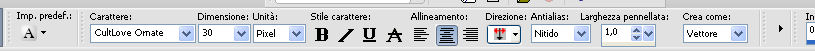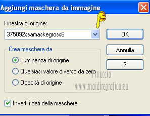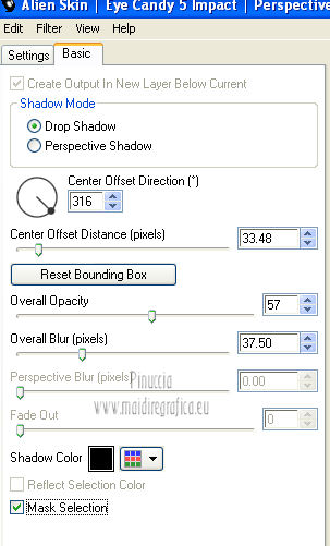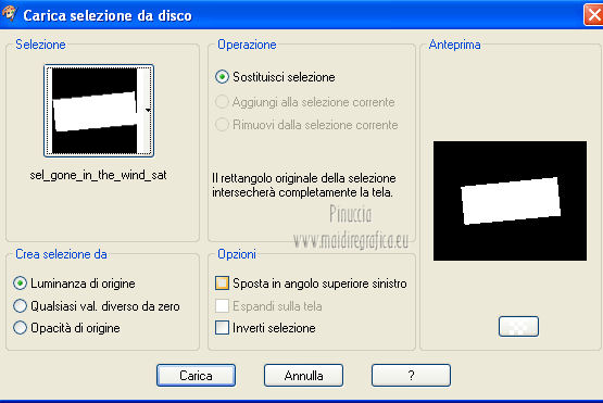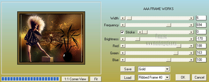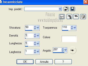 qui puoi trovare qualche risposta ai tuoi dubbi. Se l'argomento che ti interessa non è presente, ti prego di segnalarmelo. Questo tutorial è una creazione di Saturnella e non può essere copiato su altri siti nè essere offerto per il download. Lo stesso vale per la mia traduzione. E' anche proibito togliere il watermark dal materiale; rispettiamo il lavoro dei creatori di tubes, senza i quali non potremmo creare tutorials. Questo tutorial è stato creato con PSP 12, ma può essere eseguito anche con le altre versioni di PSP. Per tradurlo ho usato PSP X. Occorrente: Materiale qui I tubes sono di Patries e Gina. Grazie a tutti per il vostro magnifico lavoro. (in questa pagina trovi i links ai loro siti). Filtri in caso di dubbi, ricorda di consultare la mia sezione filtri qui AAA Frames - Foto Frame, Frame Work qui Alien Skin Eye Candy 5 Impact qui ![]() non esitare a cambiare modalità di miscelatura e opacità secondo i colori utilizzati. Apri il font e minimizzalo. Lo troverai nella lista dei font disponibili, quando ti servirà. Metti la selezione nella cartella Selezioni. Apri la maschera in PSP e minimizzala con il resto del materiale. 1. Imposta il colore di primo piano con #fafabe, e il colore di sfondo con #502f17. ![]() Passa il colore di primo piano a Gradiente, stile Radiale. ![]() 2. Apri una nuova immagine trasparente 700 x 550 pixels, e riempila con il gradiente.Regola>Sfocatura>Sfocatura gaussiana - raggio 20. ![]() 3. Livelli>Nuovo livello raster. Selezione>Seleziona tutto. Apri l'immagine gh_texture_12.jpg e vai a Modifica>Copia. Torna al tuo lavoro e vai a Modifica>Incolla nella selezione. Selezione>Deseleziona. Cambia la modalità di miscelatura di questo livello in Luce netta, e abbassa l'opacità al 90%. 4. Livelli>Nuovo livello raster. Riempi con il colore di primo piano.5. Livelli>Nuovo livello maschera>Da immagine. Apri il menu sotto la finestra di origine e vedrai la lista dei files aperti. Seleziona la maschera 375092ssamaskegross6, con i seguenti settaggi: ![]() Regola>Messa a fuoco>Accentua messa a fuoco. Livelli>Unisci>Unisci gruppo. 6. Effetti>Effetti 3D>Sfalsa ombra. ![]() Cambia la modalità di miscelatura di questo livello in Sovrapponi. 7. Selezione>Carica/Salva selezione>Carica selezione da disco. Cerca e carica la selezione sel_gone_in_the_Wind_sat. ![]() 8. Livelli>Nuovo livello raster. Apri il tube del paesaggio tsgina00550 e vai a Modifica>Copia. Torna al tuo lavoro e vai a Modifica>Incolla nella selezione. Livelli>Nuovo livello raster. Effetti>Effetti 3D>Ritaglio, con il colore nero. ![]() Selezione>Deseleziona. 9. Livelli>Unisci>Unisci visibile. 10. Apri il tube 1Patries VR233-blow e vai a Modifica>Copia. Torna al tuo lavoro e vai a Modifica>Incolla come nuovo livello. Immagine>Rifletti. Immagine>Ridimensiona, all'80%, tutti i livelli non selezionato. Spostalo in basso a sinistra.11. Livelli>Duplica, e attiva il livello sottostante dell'originale. Regola>Sfocatura>Sfocatura gaussiana - raggio 20. ![]() Cambia la modalità di miscelatura di questo livello in Filtra, e abbassa l'opacità al 62%. 12. Attiva il livello superiore. Effetti>Plugins>Alien Skin Eye Candy 6 Impact - Perspective Shadow. seleziona il preset Drop Shadow,Blurry, e sotto Basic, cambia Overall opacity con 57 e Overall Blur con 37.50. ![]() 13. Apri il tube "bamboo" e vai a Modifica>Copia. Torna al tuo lavoro e vai a Modifica>Incolla come nuovo livello. Immagine>Ridimensiona, al 70%, tutti i livelli non selezionato. Spostalo in basso a destra.14. Effetti>Plugins>Alien Skin Eye Candy 5 Impact - Perspective Shadow, con i settaggi precedenti. 15. Firma il tuo lavoro. Livelli>Unisci>Unisci tutto. 16. Immagine>Aggiungi bordatura, 2 pixels, simmetriche, con il colore chiaro. 17. Livelli>Duplica. Immagine>Ridimensiona, al 90%, tutti i livelli non selezionato. 18. Attiva il livello inferiore. Effetti>Effetti di trama>Incannicciato. ![]() 19. Attiva il livello superiore. Effetti>Effetti 3D>Sfalsa ombra, con il colore nero. ![]() Ripeti l'Effetto Sfalsa ombra, cambiando verticale e orizzontale con -5. 20. Livelli>Unisci>Unisci tutto. 21. Effetti>Plugins>AAA Frames - Foto Frame. ![]() 22. Effetti>Plugins>AAA Frame - Frame Work. Seleziona "Ribbed Frame 40" con i seguenti settaggi. ![]() 23. Immagine>Aggiungi bordatura, 1 pixel, simmetriche, con il colore nero. 24. Attiva lo strumento Testo , font Cultlove ornate,dimensione 30, pennellata 1 ![]() e scrivi il tuo testo. Livelli>Converti in livello raster. Livelli>Duplica, e attiva il livello sottostante dell'originale. Effetti>Effetti di distorsione>Vento - da sinistra, intensità 50. ![]() Cambia la modalità di miscelatura di questo livello in Sovrapponi, e abbassa l'opacità al 70%. 25. Attiva il livello superiore. Effetti>Effetti 3D>Sfalsa ombra, con il colore nero. ![]() Livelli>Unisci>Unisci tutto. Immagine>Ridimensiona, a 700 pixels di larghezza, e salva in formato jpg. ![]() Se hai problemi o dubbi, o trovi un link non funzionante, o anche soltanto per dirmi che ti è piaciuto, scrivimi. 22 Agosto 2012 |