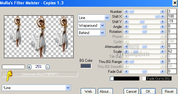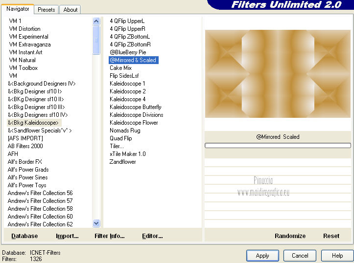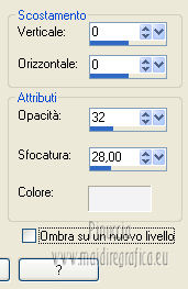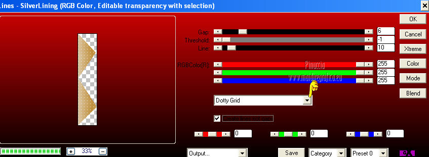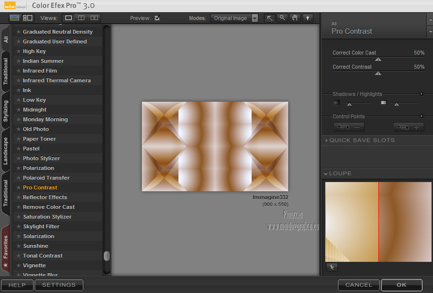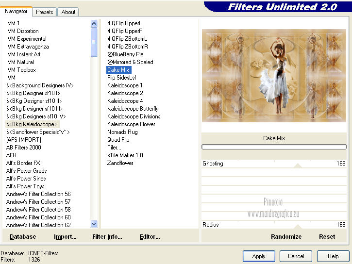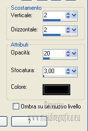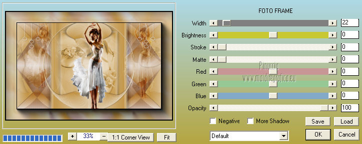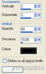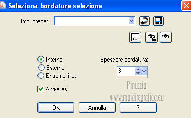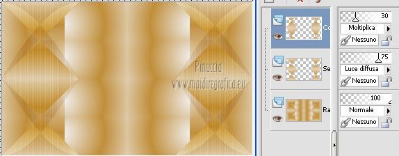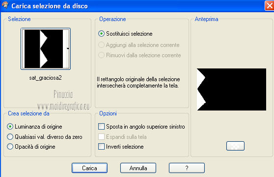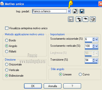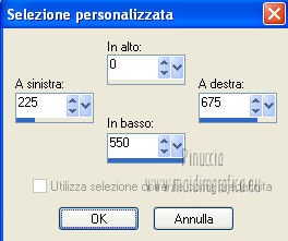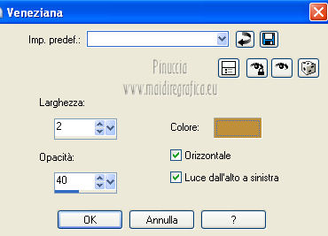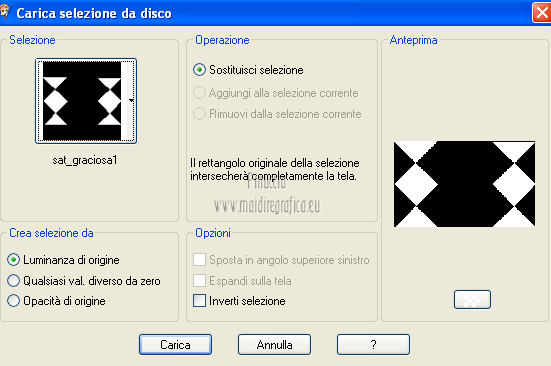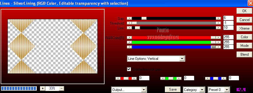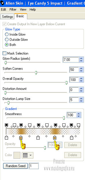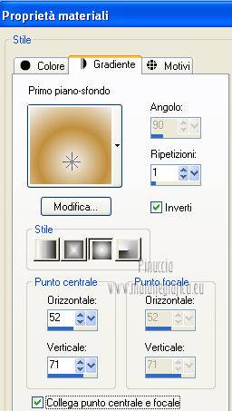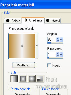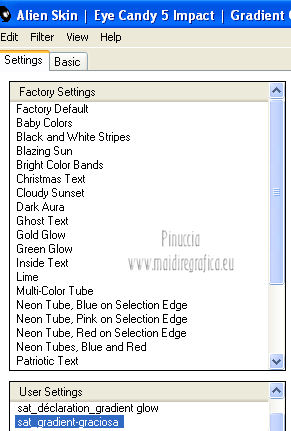 qui puoi trovare qualche risposta ai tuoi dubbi. Se l'argomento che ti interessa non è presente, ti prego di segnalarmelo. Questo tutorial è una creazione di Saturnella e non può essere copiato su altri siti nè essere offerto per il download. Lo stesso vale per la mia traduzione. E' anche proibito togliere il watermark dal materiale; rispettiamo il lavoro dei creatori di tubes, senza i quali non potremmo creare tutorials. Questo tutorial è stato creato con PSP 12, ma può essere eseguito anche con le altre versioni di PSP. Per tradurlo ho usato PSP X. Occorrente: Materiale qui I tubes usati sono di Anna.br e Lizztish. Grazie a tutti per il vostro magnifico lavoro. (in questa pagina trovi i links ai loro siti). Filtri in caso di dubbi, ricorda di consultare la mia sezione filtri qui Filters Unlimited 2.0 qui &<Bkg Kaleidoscope> - Mirrored and Scaled, Cake mik qui AP 01 Innovations - Lines SilverLining qui Simple - Pizza slice mirror qui Flaming Pear - Flexify 2 qui Mura's Meister - Copies qui Nik Software - Color Efex Pro qui AAA Frames - Foto Frame qui Alien Skin Eye Candy 5 Impact - Gradient Glow qui ![]() non esitare a cambiare modalità di miscelatura e opacità secondo i colori utilizzati. Metti il preset nella cartella del filtro Alien Skin Eye Candy 5 Impact>Settings>Gradient Glow. Cliccando sul file una o due volte (a seconda delle tue impostazioni), automaticamente il preset si installerà nella cartella corretta. Metti le selezioni nella cartella Selezioni. 1. Imposta il colore di primo piano con #c08f3b, e il colore di sfondo con #f3f3f6. ![]() Passa il colore di primo piano a Gradiente, stile Sprazzo di luce ![]() Apri una nuova immagine trasparente 900 x 550 pixels, e riempila con il gradiente.2. Effetti>Plugins>Simple - Pizza slice mirror. 3. Effetti>Plugins>Filters Unlimited 2.0 - &<Kaleidoscope> - @Mirrored & Scaled. ![]() 4. Selezione>Carica/Salva selezione>Carica selezione da disco. Cerca e carica la selezione sat_graciosa1. ![]() Selezione>Innalza selezione a livello. 5. Effetti>Plugins>AP 01 Innovations - Lines SilverLining. ![]() Cambia la modalità di miscelatura di questo livello in Luce diffusa, e abbassa l'opacità al 75% (o secondo i tuoi colori). Selezione>Deseleziona. 6. Livelli>Duplica. Effetti>Effetti geometrici>Cilindro orizzontale. ![]() Cambia la modalità di miscelatura di questo livello in Moltiplica, e abbassa l'opacità al 30%. ![]() Livelli>Unisci>Unisci visibile. 7. Selezione>Carica/Salva selezione>Carica selezione da disco. Cerca e carica la selezione sat_graciosa2. ![]() Selezione>Innalza selezione a livello. 8. Effetti>Plugins>AP 01 Innovations - Lines SilverLining. ![]() Selezione>Deseleziona. 9. Effetti>Effetti 3D>Sfalsa ombra. ![]() 10. Livelli>Duplica. Immagine>Rifletti. Livelli>Unisci>Unisci giù. 11. Livelli>Duplica. Effetti>Plugins>Flaming Pear - Flexify 2. ![]() 12. Effetti>Effetti 3D>Sfalsa ombra, con i settaggi precedenti. 13. Attiva il livello di sfondo. ![]() Attiva lo strumento Selezione ,clicca sull'icona Selezione personalizzata ![]() e imposta i seguenti settaggi: ![]() Livelli>Nuovo livello raster. 14. Cambia i settaggi del gradiente in stile Lineare. ![]() Riempi la selezione con il gradiente.15. Regola>Sfocatura>Sfocatura gaussiana - raggio 50. ![]() 16. Effetti>Effetti di trama>Veneziana - con il tuo colore scuro. ![]() 17. Selezione>Modifica>Seleziona bordature selezione. ![]() 18. Livelli>Nuovo livello raster. Riempi con il colore chiaro.19. Effetti>Plugins>Alien Skin Eye Candy 5 Impact - Gradient Glow. Seleziona il preset sat_gradient-graciosa e ok. ![]() Se stai usando altri colori, sotto Basic clicca sui piccoli rettangoli, per attivare i colori e puoi cambiare il colore con il tuo colore scuro. ![]() Selezione>Deseleziona. Livelli>Unisci>Unisci giù. 20. Effetti>Effetti 3D>Sfalsa ombra. ![]() 21. Livelli>Duplica. Immagine>Ridimensiona, al 75%, tutti i livelli non selezionato. 22. Apri il tube lizztish_yesterday-dancing-shoes2 e vai a Modifica>Copia. Torna al tuo lavoro e vai a Modifica>Incolla come nuovo livello. Immagine>Ridimensona, all'80%, tutti i livelli non selezionato. Cambia la modalità di miscelatura di questo livello in luminanza, e abbassa l'opacità al 63%. 23. Attiva il livello di sfondo. Effetti>Plugins>Nik Software - Color Efex Pro - Pro Contrast. ![]() Chiudi il livello di sfondo e rimani posizionato su un livello visibile. Livelli>Unisci>Unisci visibile. Riapri il livello di sfondo. 24. Apri element_graciosa e vai a Modifica>Copia. Torna al tuo lavoro e vai a Modifica>Incolla come nuovo livello. Effetti>Effetti di immagine>Scostamento. ![]() 25. Effetti>Effetti 3D>Sfalsa ombra. ![]() 26. Attiva il livello centrale. ![]() Livelli>Duplica. Effetti>Effetti di immagine>Motivo unico - seleziona il preset Fianco a Fianco e ok. ![]() Abbassa l'opacità di questo livello al 44% (o secondo i tuoi colori) 27. Apri il tube anna.br-1107_mulher e vai a Modifica>Copia. Torna al tuo lavoro e vai a Modifica>Incolla come nuovo livello. Immagine>Ridimensiona, all'80%, tutti i livelli non selezionato. Regola>Messa a fuoco>Metti a fuoco. 28. Livelli>Duplica. Effetti>Plugins>Mura's Meister - Copies. ![]() Cambia la modalità di miscelatura di questo livello in luce diffusa (o secondo i tuoi colori). 29. Attiva il livello sottostante del tube originale. Effetti>Effetti 3D>Sfalsa ombra, con il colore chiaro #f3f3f6. ![]() 30. Livelli>Unisci>Unisci tutto. Modifica>Copia. 31. Immagine>Aggiungi bordatura, 2 pixels, simmetriche, con il colore #c08f3b. Immagine>Aggiungi bordatura, 50 pixels, simmetriche, con il colore #f3f3f6. 32. Seleziona il bordo da 50 pixels con la bacchetta magica ![]() Modifica>Incolla nella selezione. 33. Regola>Sfocatura>Sfocatura gaussiana - raggio 20. ![]() 34. Effetti>Plugins>Filters Unlimited 2.0 - &<Bkg Kaleidoscope> - Cake Mix. ![]() 35. Selezione>Inverti. Effetti>Effetti 3D>Sfalsa ombra. ![]() Ripeti l'Effetto Sfalsa ombra, cambiando verticale e orizzontale con -2. Selezione>Deseleziona. 36. Eff