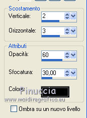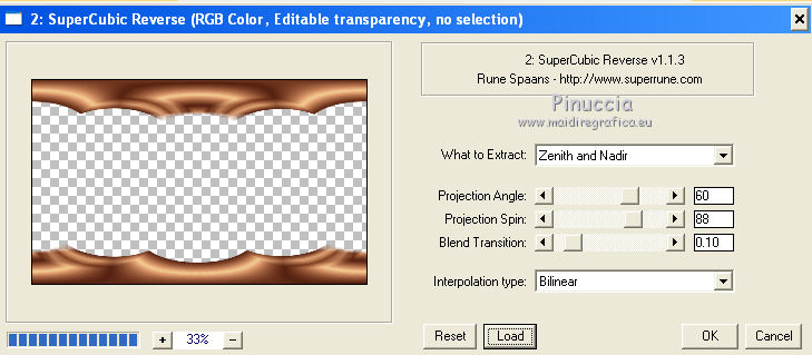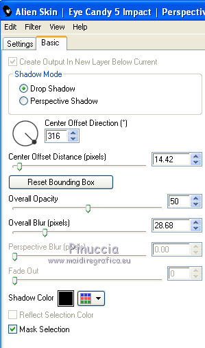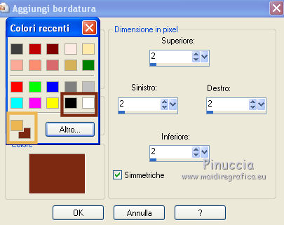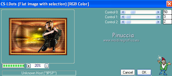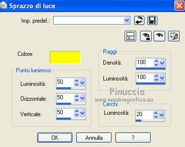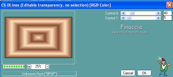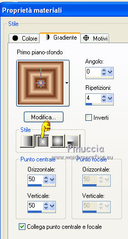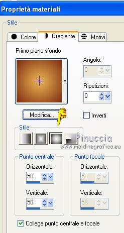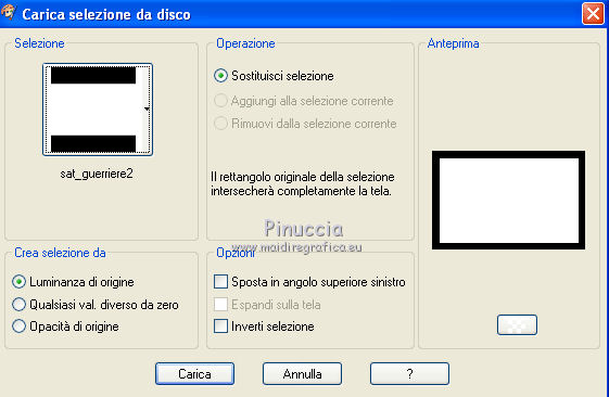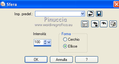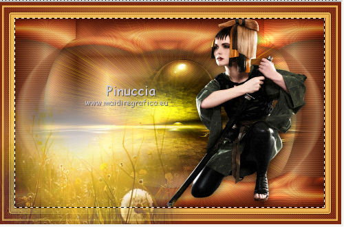 qui puoi trovare qualche risposta ai tuoi dubbi. Se l'argomento che ti interessa non è presente, ti prego di segnalarmelo. Questo tutorial è una creazione di Saturnella e non può essere copiato su altri siti nè essere offerto per il download. Lo stesso vale per la mia traduzione. E' anche proibito togliere il watermark dal materiale; rispettiamo il lavoro dei creatori di tubes, senza i quali non potremmo creare tutorials. Il tutorial è stato creato con PSP12, ma può essere eseguito anche con le altre versioni. Per tradurlo, ho usato PSP X. Occorrente: Materiale qui Il tube della donna è di Athenais. Il tube del paesaggio è di Nicole. Il tube dei fiori è di Guismo. (in questa pagina trovi i links ai loro siti). Filtri in caso di dubbi, ricorda di consultare la mia sezione filtri qui Carolaine&Sensibility qui Alien Skin Eye Candy 5 Impact qui SuperRune Filters qui ![]() non esitare a cambiare modalità di miscelatura e opacità secondo i colori utilizzati. Metti le selezioni nella cartella Selezioni. 1. Imposta il colore di primo piano con #f2cca6, e il colore di sfondo con #703518. Passa il colore di primo piano a Gradiente, stile Rettangolare. ![]() 2. Apri una nuova immagine trasparente 900 x 550 pixels, e riempila con il gradiente.3. Effetti>Plugins>Carolaine and Sensibility - CS-DLines. ![]() 4. Livelli>Duplica. Immagine>Ruota per gradi - 90 gradi a sinistra. ![]() 5. Premi sulla tastiera il tasto K per attivare lo strumento Puntatore ![]() se stai usando PSP 9, il tasto D (valido per tutte le versioni), per attivare lo strumento deformazione ![]() e usando i nodi laterali centrali ![]() spingi i lati dell'immagine fino ai bordi. ![]() Cambia la modalità di miscelatura di questo livello in Moltiplica, e abbassa l'opacità all'80%. 6. Livelli>Unisci>Unisci visibile. 7. Livelli>Duplica. 8. Immagine>Ridimensiona, all'80%, tutti i livelli non selezionato. ![]() 9. Effetti>Plugins>SuperRune Filters - SuperCubic Reverse. ![]() 10. Effetti>Plugins>Alien Skin Eye Candy 5 Impact - Perspective Shadow. ![]() Cambia la modalità di miscelatura di questo livello in Luce netta, e abbassa l'opacità al 60%. 11. Attiva il livello inferiore. Selezione>Carica/Salva selezione>Carica selezione da disco. Cerca e carica la selezione "sat_guerriere1". ![]() 12. Selezione>Innalza selezione a livello. Selezione>Deseleziona. 13. Effetti>Effetti geometrici>Sfera. ![]() 14. Effetti>Plugins>Carolaine & Sensibility - CS-Halloween2. ![]() 15. Livelli>Duplica. Immagine>Rifletti. Livelli>Unisci>Unisci giù. Abbassa l'opacità di questo livello all'80%. 16. Effetti>Effetti 3D>Sfalsa ombra. ![]() 17. Apri il tube di Nicole "nicole-mist-paysage-20-2012" e vai a Modifica>Copia. Torna al tuo lavoro e vai a Modifica>Incolla come nuovo livello. Cambia la modalità di miscelatura di questo livello in Luce netta (puoi cambiare la modalità in base ai tuoi colori). 18. Apri il tube della donna "athe-FM-75" e vai a Modifica>Copia. Torna al tuo lavoro e vai a Modifica>Incolla come nuovo livello. Immagine>Ridimensiona, al 55%, tutti i livelli non selezionato. Regola>Messa a fuoco>Metti a fuoco. Sposta il tube a destra,vedi il mio esempio. 19. Livelli>Duplica, e attiva il livello sottostante dell'originale. Effetti>Effetti di distorsione>Vento - da sinistra, intensità 100. ![]() Attiva il livello superiore della copia. Effetti>Effetti 3D>Sfalsa ombra, con i settaggi precedenti. ![]() 20. Attiva il livello inferiore di sfondo. Effetti>Effetti di illuminazione>Sprazzo di luce. ![]() 21. Imposta il colore di primo piano con #ecb753, e il colore di sfondo con #7d2a12. 22. Immagine>Aggiungi bordatura, 2 pixels, simmetriche, con il colore scuro. cliccando sulla paletta del colore con il tasto destro del mouse, avrai la tabella dei colori recenti e, in basso a sinistra, i tuoi colori (gli ultimi due colori della lista sono sempre il nero e il bianco). Per impostare il colore, clicca sulla palettina corrispondente. ![]() Immagine>Aggiungi bordatura, 10 pixels, simmetriche, con il colore chiaro. Immagine>Aggiungi bordatura, 1 pixel, simmetriche, con il colore scuro. Immagine>Aggiungi bordatura, 25 pixels, simmetriche, con il colore chiaro. 23. Seleziona il bordo da 25 pixels con la bacchetta magica ![]() Selezione>Modifica>Contrai - 5 pixels. Passa il colore di primo piano a Gradiente, stile Sprazzo di luce. ![]() Riempi la selezione con il gradiente.24. Effetti>Plugins>Carolaine and Sensibility - CS-LDots. ![]() 25. Effetti>Effetti di bordo>Aumenta. Selezione>Deseleziona. 26. Immagine>Aggiungi bordatura, 10 pixels, simmetriche, con il colore scuro. 27. Selezione>Carica/Salva selezione>Carica selezione da disco. Cerca e carica la selezione "sat_guerriere2". ![]() 28. Apri il tube calguismisted27410 e vai a Modifica>Copia. Torna al tuo lavoro e vai a Modifica>Incolla come nuovo livello. Posiziona il tube nell'angolo in basso a sinistra.![]() Selezione>Inverti. Premi sulla tastiera il tasto CANC. Selezione>Deseleziona. 29. Firma il tuo lavoro. Livelli>Unisci>Unisci tutto. Immagine>Ridimensiona, a 900 pixels di larghezza, tutti i livelli selezionato. Regola>Messa a fuoco>Metti a fuoco. Salva in formato jpg. ![]() Se hai problemi o dubbi, o trovi un link non funzionante, o anche soltanto per dirmi che ti è piaciuto, scrivimi. 5 Maggio 2012 |