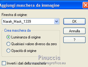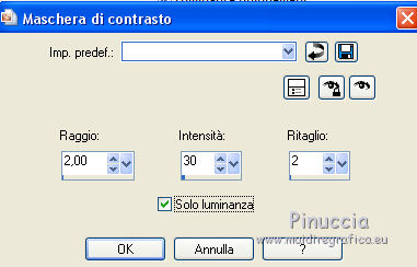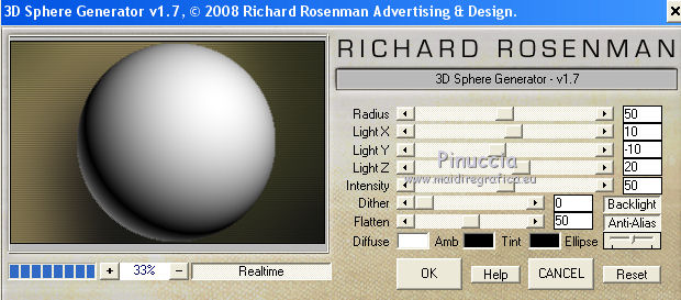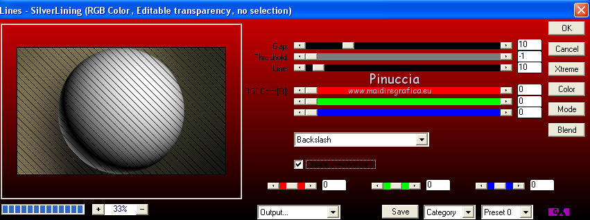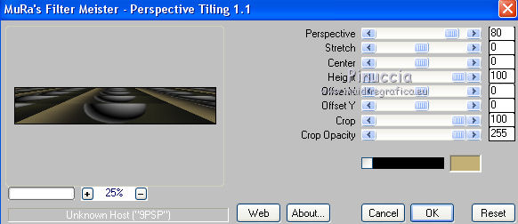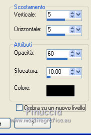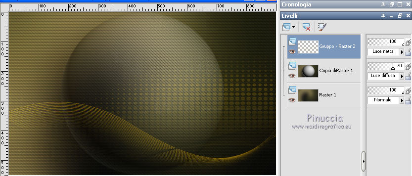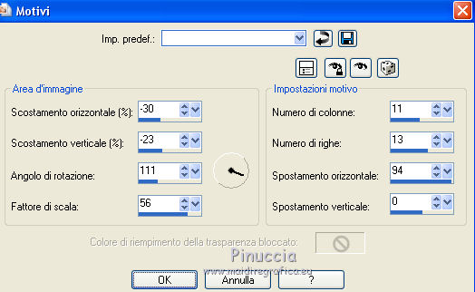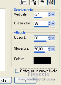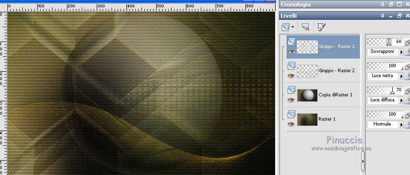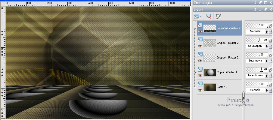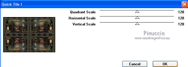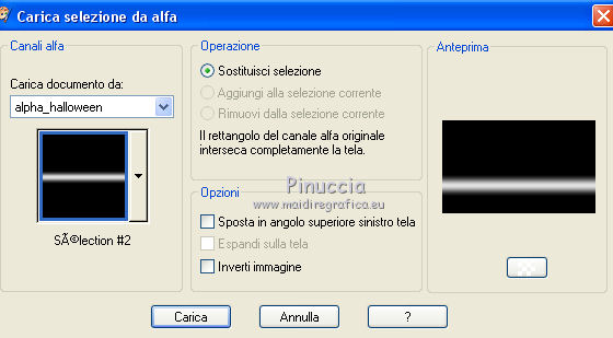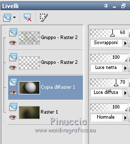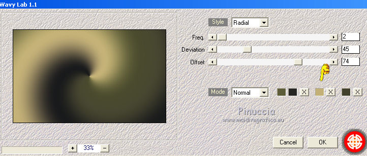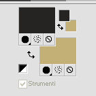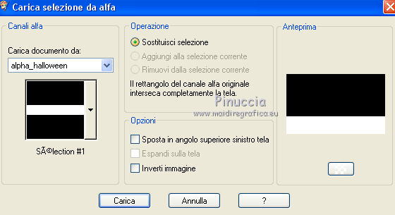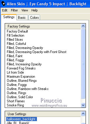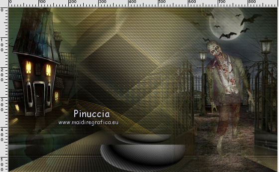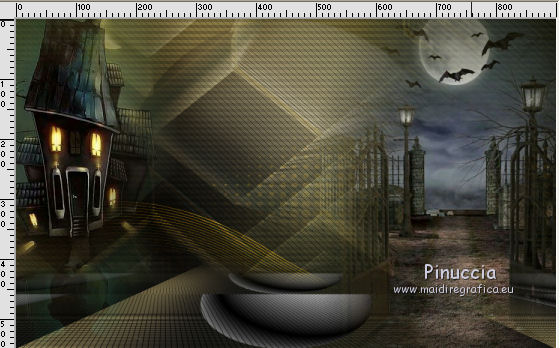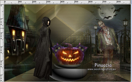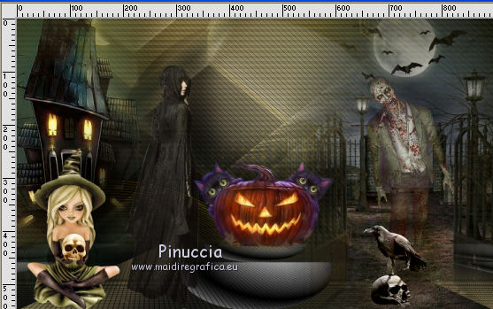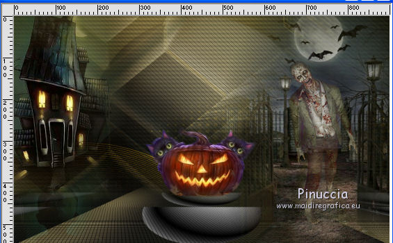 qui puoi trovare qualche risposta ai tuoi dubbi. Se l'argomento che ti interessa non è presente, ti prego di segnalarmelo. Questo tutorial è una creazione di Saturnella e non può essere copiato su altri siti nè essere offerto per il download. Lo stesso vale per la mia traduzione. E' anche proibito togliere il watermark dal materiale; rispettiamo il lavoro dei creatori di tubes, senza i quali non potremmo creare tutorials. Per tradurre questo tutorial, creato con Corel2018, ho usato CorelX, ma può essere eseguito anche con le altre versioni di PSP. Dalla versione X4, il comando Immagine>Rifletti è stato sostituito con Immagine>Capovolgi in orizzontale, e il comando Immagine>Capovolgi con Immagine>Capovolgi in verticale. Nelle versioni X5 e X6, le funzioni sono state migliorate rendendo disponibile il menu Oggetti. Nel nuovo X7 sono tornati i comandi Immagine>Rifletti e Immagine>Capovolgi, ma con nuove funzioni. Vedi la scheda sull'argomento qui Occorrente: Materiale qui Per le maschere grazie Narah. Il resto del materiale è di Saturnella. (in questa pagina trovi i links ai loro siti). Filtri in caso di dubbi, ricorda di consultare la mia sezione filtri qui Filters Unlimited 2.0 qui Mehdi - Wavy Lab 1.1 qui Richard Rosenman - 3D Sphère generator qui AP 01 Innovation - Lines SilverLining qui Mura's Meister - Perspective Tiling qui Graphics Plus - Quick Tile I qui Alien Skin Eye Candy 5 Impact - Backlight qui I filtri Graphics Plus si possono usare da soli o importati in Filters Unlimited (come fare vedi qui) Se un filtro fornito appare con questa icona ![]() non esitare a cambiare modalità di miscelatura e opacità secondo i colori utilizzati. Metti il preset Cliccando sul file una o due volte (a seconda delle tue impostazioni), automaticamente il preset si installerà nella cartella corretta. perchè uno o due clic vedi qui Se preferisci, puoi importare direttamente il preset nel corso del tutorial Come fare vedi la scheda del filtro Eye Candy qui Apri le maschere in PSP e minimizzale con il resto del materiale. colori utilizzati ![]() 1. Imposta il colore di primo piano con il colore 1 #262523, e il colore di sfondo con il colore 2 #5e5d39. ![]() Apri alpha_halloween. Finestra>Duplica, o sulla tastiera tasto della maiuscola+D per fare una copia. Chiudi l'originale. La copia, che sarà la base del tuo lavoro, non è vuota, ma contiene le selezioni salvate sul canale alfa. 2. Effetti>Plugins>Mehdi - Wavy Lab 1.1 Questo filtro crea gradienti con i colori della tua paletta: il primo è il colore di sfondo, il secondo quello di primo piano; degli ultimi due colori creati dal ciltro cambia il terzo colore con il colore 3 #c3b077. ![]() 3. Regola>Sfocatura>Sfocatura gaussiana, raggio 80. ![]() 4. Effetti>Effetti di trama>Veneziana. ![]() 5. Livelli>Duplica. Effetti>Plugins>Richard Rosenman - 3D Sphère Generator. ![]() 6. Effetti>Plugins>AP Innovations - Lines SilverLining. ![]() Cambia la modalità di miscelatura di questo livello in Luce diffusa, e abbassa l'opacità al 70%. ![]() 7. Livelli>Nuovo livello raster. Imposta il colore di sfondo con il colore 3 #c3b077. ![]() Riempi il livello con il colore di sfondo #c3b077.Livelli>Nuovo livello maschera>Da immagine. Apri il menu sotto la finestra di origine e vedrai la lista dei files aperti. Seleziona la maschera Narah_Mask_1336 ![]() Effetti>Effetti di bordo>Aumenta. Livelli>Unisci>Unisci gruppo. Cambia la modalità di miscelatura di questo livello in Luce netta. ![]() Effetti>Effetti 3D>Sfalsa ombra, colore nero. ![]() 8. Livelli>Nuovo livello raster. Riempi il livello con il colore di sfondo #c3b077.Livelli>Nuovo livello maschera>Da immagine. Apri il menu sotto la finestra di origine e seleziona la maschera Narah_Mask_1339 ![]() Regola>Messa a fuoco>Accentua messa a fuoco. Livelli>Unisci>Unisci gruppo. 9. Effetti>Plugins>Alien Skin Eye Candy 5 Impact - Backlight. Seleziona il preset halloween_backlight e ok. ![]() Cambia la modalità di miscelatura di questo livello in Sovrapponi, e abbassa l'opacità al 60%. ![]() Effetti>Effetti 3D>Sfalsa ombra, con i settaggi precedenti. 10. Attiva il livello copia di Raster 1. ![]() Selezione>Carica/Salva selezione>Carica selezione da canale alfa. La selezione sélection#1 è subito disponibile. Devi soltanto cliccare Carica. ![]() Selezione>Innalza selezione a livello. Effetti>Plugins>Mura's Meister - Perspective Tiling, con i settaggi standard. ![]() Selezione>Deseleziona. Livelli>Disponi>Sposta su 2- volte. ![]() 11. Selezione>Carica/Salva selezione>Carica selezione da canale alfa. Apri il menu delle selezioni e carica sélection#2. ![]() Premi 3 volte sulla tastiera il tasto CANC ![]() ![]() Selezione>Deseleziona. Attenzione! Per i tubes, non dimenticare di togliere la firma. Apri il tube della casa sat_mai_05 e vai a Modifica>Copia. Torna al tuo lavoro e vai a Modifica>Incolla come nuovo livello. Spostalo in alto a sinistra.Effetti>Effetti 3D>Sfalsa ombra, con i settaggi precedenti. 12. Apri il tube sat_mai03 e vai a Modifica>Copia. Torna al tuo lavoro e vai a Modifica>Incolla come nuovo livello. Spostalo a destra.![]() 13. Apri il tube dello zombie sat_hal11 e vai a Modifica>Copia. Torna al tuo lavoro e vai a Modifica>Incolla come nuovo livello. Immagine>Ridimensiona, al 50%, tutti i livelli non selezionato. Regola>Messa a fuoco>Metti a fuoco. Spostalo a destraAbbassa l'opacità di questo livello al 60%, o a tuo piacimento. ![]() Effetti>Effetti 3D>Sfalsa ombra, con i settaggi precedenti. 14. Apri il tube dei gatti sat_hal15 e vai a Modifica>Copia. Torna al tuo lavoro e vai a Modifica>Incolla come nuovo livello. Immagine>Ridimensiona, 2 volte al 75%, tutti i livelli non selezionato. Regola>Messa a fuoco>Metti a fuoco. Effetti>Effetti 3D>Sfalsa ombra, con i settaggi precedenti. Spostalo come nel mio esempio![]() 15. Apri il tube sat_got02 e vai a Modifica>Copia. Torna al tuo lavoro e vai a Modifica>Incolla come nuovo livello. Immagine>Ridimensiona, 2 volte al 75%, tutti i livelli non selezio