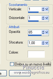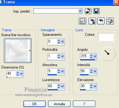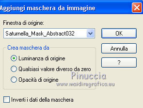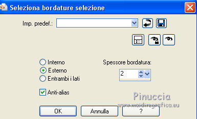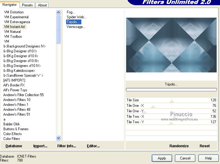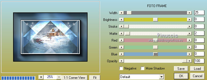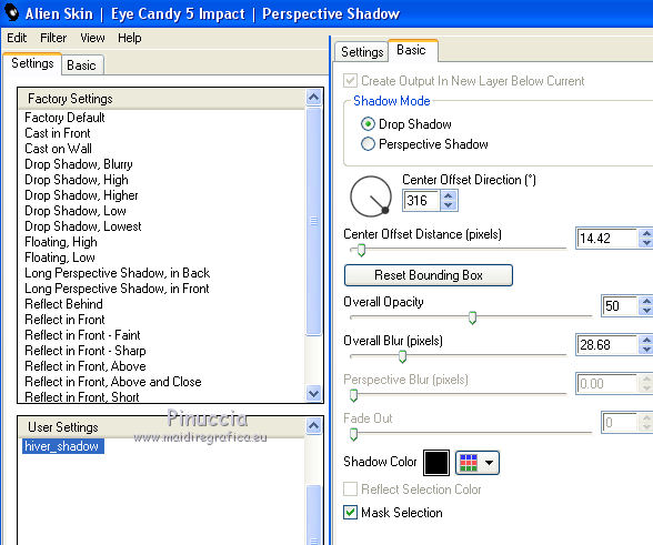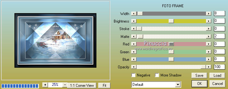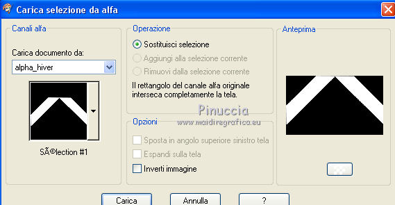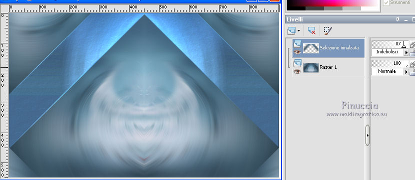 qui puoi trovare qualche risposta ai tuoi dubbi. Se l'argomento che ti interessa non è presente, ti prego di segnalarmelo. Questo tutorial è una creazione di Saturnella e non può essere copiato su altri siti nè essere offerto per il download. Lo stesso vale per la mia traduzione. E' anche proibito togliere il watermark dal materiale; rispettiamo il lavoro dei creatori di tubes, senza i quali non potremmo creare tutorials. Per tradurre questo tutorial, creato con Corel2018, ho usato CorelX, ma può essere eseguito anche con le altre versioni di PSP. Dalla versione X4, il comando Immagine>Rifletti è stato sostituito con Immagine>Capovolgi in orizzontale, e il comando Immagine>Capovolgi con Immagine>Capovolgi in verticale. Nelle versioni X5 e X6, le funzioni sono state migliorate rendendo disponibile il menu Oggetti. Nel nuovo X7 sono tornati i comandi Immagine>Rifletti e Immagine>Capovolgi, ma con nuove funzioni. Vedi la scheda sull'argomento qui Occorrente: Materiale qui Per il tube della donna grazie Thafs. Il resto del materiale è di Saturnella (in questa pagina trovi i links ai loro siti). Filtri in caso di dubbi, ricorda di consultare la mia sezione filtri qui Filters Unlimited 2.0 qui Simple - Blintz qui Graphics Plus - Cross Shadow qui VM Instant Art - Tripolis qui AAA Frames - Foto Frame qui Alien Skin Eye Candy 5 Impact - Perspective Shadow qui I filtri Simple, VM Instant art e Graphics Plus si possono usare da soli o importati in Filters Unlimited (come fare vedi qui) Se un filtro fornito appare con questa icona ![]() non esitare a cambiare modalità di miscelatura e opacità secondo i colori utilizzati. Metti il preset Cliccando sul file una o due volte (a seconda delle tue impostazioni), automaticamente il preset si installerà nella cartella corretta. perchè uno o due clic vedi qui Se preferisci, puoi importare direttamente il preset nel corso del tutorial Come fare vedi la scheda del filtro Eye Candy qui La trama Grana fine nuvoloso o Corel_15_016 è standard in PSP. Se non la trovi nel tuo PSP, metti la trama fornita nella cartella Trame. Apri la maschera in PSP e minimizzala con il resto del materiale. 1. Imposta il colore di primo piano con il colore scuro #517a90, e il colore di sfondo con il colore bianco #ffffff. ![]() Apri alpha_hiver. Finestra>Duplica (o sulla tastiera maiuscola+D) per fare una copia. ![]() Chiudi l'originale. La copia, che sarà la base del tuo lavoro, non è vuota, ma contiene una selezione salvata sul canale alfa. 2. Selezione>Seleziona tutto. Apri l'immagine hiver désert e vai a Modifica>Copia. Torna al tuo lavoro e vai a Modifica>Incolla nella selezione. Selezione>Deseleziona. 3. Regola>Sfocatura>Sfocatura radiale. ![]() Effetti>Effetti di bordo>Aumenta. 4. Effetti>Plugins>Simple - Blintz. Modifica>Ripeti Blintz. 5. Effetti>Effetti di riflesso>Specchio rotante. ![]() 6. Selezione>Carica/Salva selezione>Carica selezione da canale alfa. La selezione sélection#1 è subito disponibile. Devi soltanto cliccare Carica. ![]() Selezione>Innalza selezione a livello. Effetti>Effetti di trama>Trama - seleziona la trama Grana fine nuvoloso o Corel_15_016 ![]() Selezione>Deseleziona. Cambia la modalità di miscelatura di questo livello in Indebolisci, e abbassa l'opacità all'87%. ![]() 7. Attiva il livello sottostante. Apri il tube del paesaggio sat_hiver_13 e vai a Modifica>Copia. Torna al tuo lavoro e vai a Modifica>Incolla come nuovo livello. 8. Effetti>Plugins>Graphics Plus - Cross Shadow. ![]() 9. Attiva il livello di sfondo. Effetti>Plugins>Filters Unlimited 2.0 - VM Instant Art - Tripolis, con i settaggi standard. ![]() 10. Livelli>Unisci>Unisci visibile. 11. Livelli>Duplica. Immagine>Ridimensiona, all'85%, tutti i livelli non selezionato. 12. Selezione>Seleziona tutto. Selezione>Mobile. Selezione>Immobilizza. Selezione>Modifica>Seleziona bordature selezione. ![]() Riempi la selezione con il colore bianco.Selezione>Deseleziona. 13. Attiva il livello inferiore. Regola>Sfocatura>Sfocatura gaussiana - raggio 20 ![]() 14. Livelli>Nuovo livello raster. Riempi il livello con il colore bianco.Livelli>Nuovo livello maschera>Da immagine. Apri il menu sotto la finestra di origine e vedrai la lista dei files aperti. Seleziona la maschera Saturnella_Mask_Abstract0 ![]() Livelli>Unisci>Unisci gruppo. 15. Effetti>Effetti 3D>Sfalsa ombra, colore bianco. ![]() 16. Attiva il livello superiore. Effetti>Plugins>Alien Skin Eye Candy 5 Impact - Perspective Shadow. Seleziona il preset hiver_shadow e ok. ![]() 17. Apri il tube déco e vai a Modifica>Copia. Torna al tuo lavoro e vai a Modifica>Incolla come nuovo livello. Immagine>Ridimensiona, al 60%, tutti i livelli non selezionato. Spostalo in alto a sinistra.Effetti>Effetti 3D>Sfalsa ombra, colore nero. ![]() Livelli>Duplica. Immagine>Rifletti. Livelli>Unisci>Unisci giù. 18. Attiva nuovamente il livello di sfondo. Modifica>Copia. Immagine>Aggiungi bordatura, 2 pixel2, simmetriche, colore bianco. Immagine>Aggiungi bordatura, 15 pixels, simmetriche, colore scuro. Immagine>Aggiungi bordatura, 2 pixels, simmetriche, colore bianco. 19. Selezione>Seleziona tutto. Immagine>Aggiungi bordatura, 50 pixels, simmetriche, colore scuro. Selezione>Inverti. Modifica>Incolla nella selezione. 20. Effetti>Effetti di trama>Veneziana. ![]() 21. Effetti>Plugins>AAA Frames - Foto Frame. ![]() Ripeti Foto Frame con width a 8. ![]() 22. Selezione>Inverti. Effetti>Effetti 3D>Sfalsa ombra. ![]() Selezione>Deseleziona. 23. Apri il tube della donna di Thaf's e vai a Modifica>Copia. Torna al tuo lavoro e vai a Modifica>Incolla come nuovo livello. Immagine>Rifletti. Immagine>Ridimensiona, al 90%, tutti i livelli non selezionato. Regola>Messa a fuoco>Metti a fuoco. 24. Effetti>Plugins>Alien Skin Eye Candy 5 Impact - Perspective Shadow - setting hiver_shadow. 25. Firma il tuo lavoro su un nuovo livello. Immagine>Aggiungi bordatura, 1 pixel, simmetriche, colore nero. Immagine>Ridimensiona, 900 pixels di larghezza, tutti i livelli selezionato. Reg