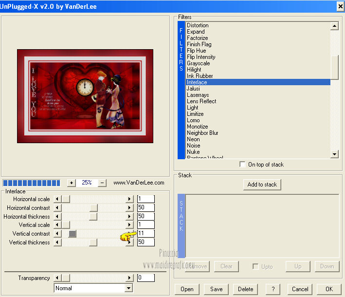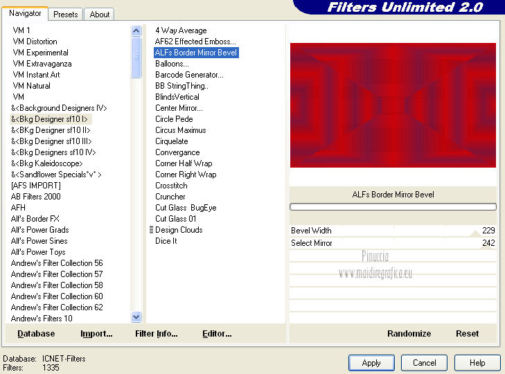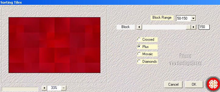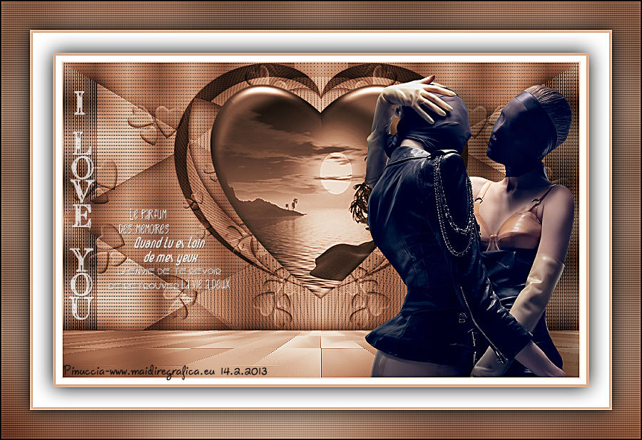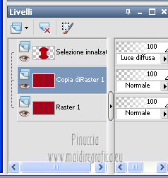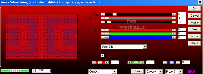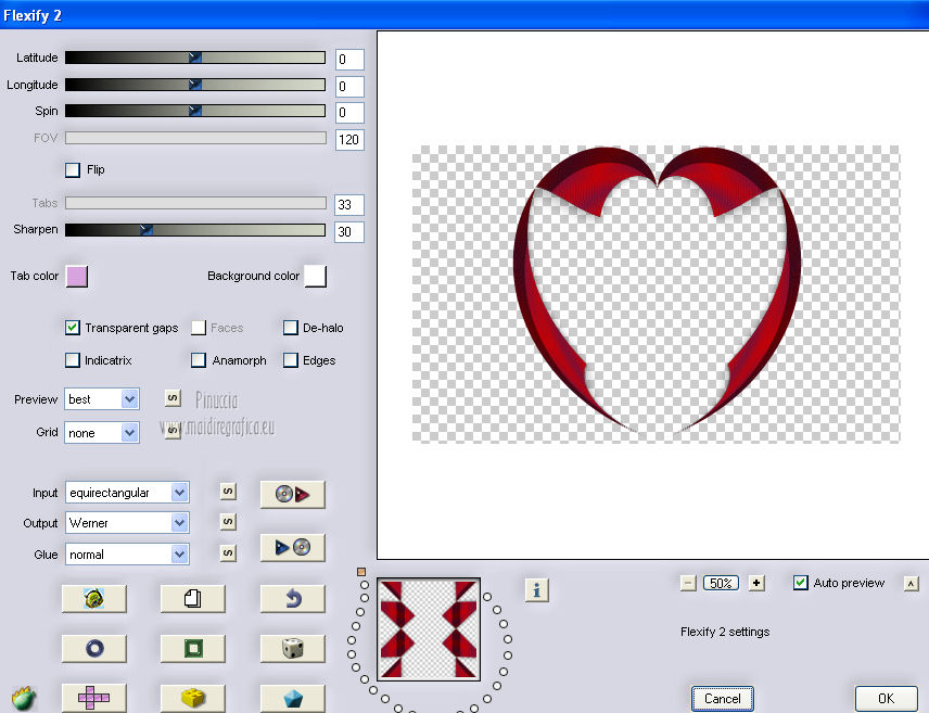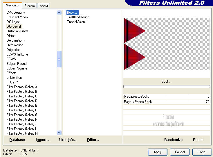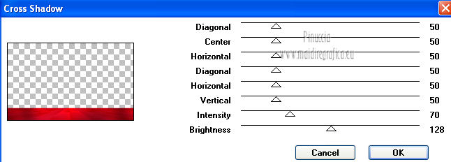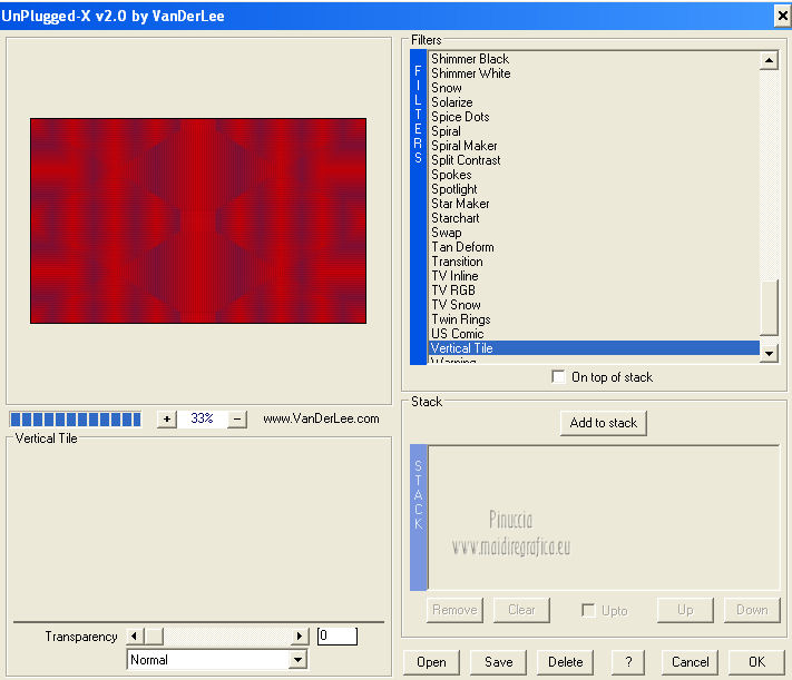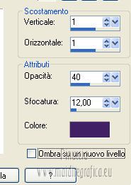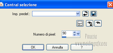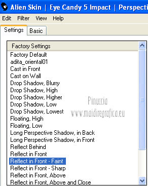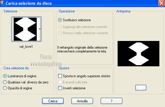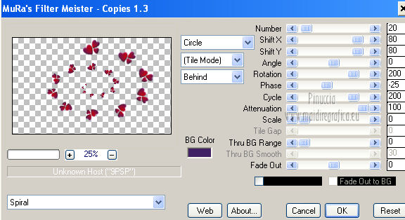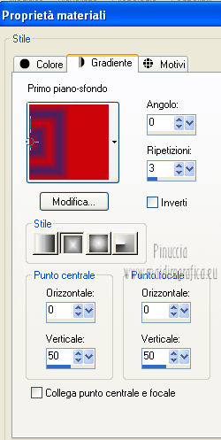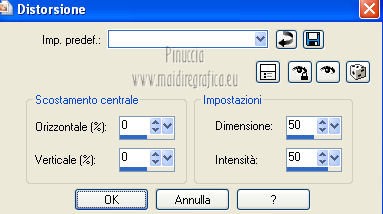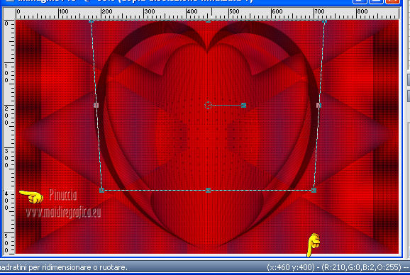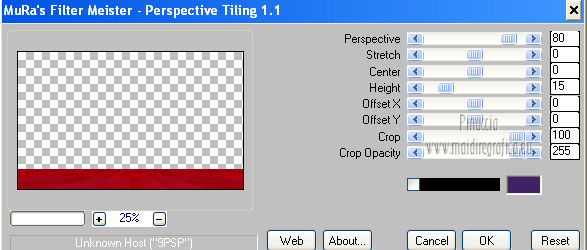 qui puoi trovare qualche risposta ai tuoi dubbi. Se l'argomento che ti interessa non è presente, ti prego di segnalarmelo. Questo tutorial è una creazione di Saturnella e non può essere copiato su altri siti nè essere offerto per il download. Lo stesso vale per la mia traduzione. E' anche proibito togliere il watermark dal materiale; rispettiamo il lavoro dei creatori di tubes, senza i quali non potremmo creare tutorials. Questo tutorial è stato creato con PSP 12, ma può essere eseguito anche con le altre versioni di PSP. Per tradurlo ho usato PSP X. Occorrente: Materiale qui I tubes sono di AngelKeeper e PspDevil. Grazie a tutti per il vostro magnifico lavoro. (in questa pagina trovi i links ai loro siti). Filtri in caso di dubbi, ricorda di consultare la mia sezione filtri qui VanDerLee - Unplugged-X qui AP 01 [Innovations] - Lines SilverLining qui Filters Unlimited 2.0 qui Mura's Meister - Copies qui Mura's Meister - Perspective Tiling qui &<BKG Designer sf10I> - Alf's Border Mirror (da importare in Unlimited) qui DC Special - Book qui Alien Skin Eye Candy 5 Impact - Glass qui Flaming Pear - Flexify 2 qui Mehdi - Sorting Tiles qui Graphics Plus - Cross Shadow qui ![]() non esitare a cambiare modalità di miscelatura e opacità secondo i colori utilizzati. Metti le selezioni nella cartella Selezioni. 1. Imposta il colore di primo piano con #cc030a, e il colore di sfondo con #412166. ![]() Passa il colore di primo piano a Gradiente, stile Rettangolare. ![]() Apri una nuova immagine trasparente 900 x 550 pixels, e riempila con il gradiente.2. Livelli>Duplica. Immagine>Rifletti. Abbassa l'opacità di questo livello al 50%. Livelli>Unisci>Unisci giù. 3. Effetti>Plugins>AP 01 [Innovations] - Lines SilverLining. ![]() 4. Livelli>Duplica. Effetti>Plugins>Filters Unlimited 2.0 - &<B kg Designer sf10I> - Alf's Border Mirror Bevel. ![]() 5. Effetti>Plugins>VanDerLee - Unplugged-X - Vertical Tile. ![]() 6. Selezione>Carica/Salva selezione>Carica selezione da disco. Cerca e carica la selezione sat_love1. ![]() Selezione>Innalza selezione a livello. Selezione>Deseleziona. 7. Effetti>Effetti di distorsione>Distorsione. ![]() Cambia la modalità di miscelatura di questo livello in luce diffusa (o secondo i tuoi colori). 8. Effetti>Effetti 3D>Sfalsa ombra, con il colore nero. ![]() 9. Attiva il livello copia di Raster 1. ![]() Selezione>Carica/Salva selezione>Carica selezione da disco. Cerca e carica la selezione sat_love2. ![]() Selezione>Innalza selezione a livello. Selezione>Deseleziona. 10. Effetti>Plugins>Filters Unlimited 2.0 - Dc Special - Book. ![]() 11. Livelli>Duplica. Immagine>Rifletti. Livelli>Unisci>Unisci giù. Cambia la modalità di miscelatura di questo livello in Sovrapponi (o secondo i tuoi colori). 12. Effetti>Effetti 3D>Sfalsa ombra, con il colore nero. ![]() 13. Livelli>Duplica. Effetti>Plugins>Flaming Pear - Flexify 2. ![]() Cambia la modalità di miscelatura di questo livello in Luminanza. 14. Effetti>Effetti 3D>Sfalsa ombra, con il colore di sfondo. ![]() 15. Premi il tasto K per attivare lo strumento Puntatore ![]() se stai usando PSP 9 il tasto D (valido per tutte le versioni) per attivare lo strumento Deformazione ![]() In modalità Scala spingi il nodo centrale inferiore verso l'alto fino a 400 pixels. (puoi controllare la posizione nella barra inferiore). ![]() 16. Livelli>Unisci>Unisci visibile. 17. Livelli>Duplica. Regola>Sfocatura>Sfocatura gaussiana - raggio 50. ![]() 18. Effetti>Plugins>Mehdi - Sorting Tiles. ![]() Effetti>Effetti di bordo>Aumenta di più. 19. Effetti>Plugins>Mura's Meister - Perspective Tiling. ![]() 20. Effetti>Plugins>Graphics Plus - Cross Shadow. ![]() 21. Effetti>Effetti 3D>Sfalsa ombra, con il colore nero. ![]() 22. Apri il tube "time is ticking our love away - tubed by A psp Devil" e vai a Modifica>Copia. Torna al tuo lavoro e vai a Modifica>Incolla come nuovo livello. Immagine>Ridimensiona, all'80%, tutti i livelli non selezionato. Regola>Messa a fuoco>Metti a fuoco. Spostalo un po' più in alto.![]() 23. Effetti>Plugins>Alien Skin Eye Candy 5 Impact - Perspective Shadow. Seleziona il preset Reflect in front faint e ok. ![]() 24. Effetti>Effetti 3D>Sfalsa ombra, con il colore nero. ![]() 25. Apri il tube coeurs_sat e vai a Modifica>Copia. Torna al tuo lavoro e vai a Modifica>Incolla come nuovo livello. Effetti>Plugins>Mura's Meister - Copies. ![]() 26. Attiva lo strumento Selezione a mano libera ![]() e selezione eventuali cuori che si trovano sul "pavimento". Premi sulla tastiera il tasto CANC. Selezione>Deseleziona. Cambia la modalità di miscelatura di questo livello in Luce netta (o secondo i tuoi colori), e abbassa l'opacità al 60%. 27. Livelli>Duplica. Immagine>Rifletti. Sposta l'immagine un po' più in alto.Nella paletta dei livelli porta i due livelli sotto quello del cuore più grande. Attiva nuovamente il livello superiore. 28. Apri il tube di AngelKeeper "CK Valentine Couple" e vai a Modifica>Copia. Torna al tuo lavoro e vai a Modifica>Incolla come nuovo livello. Immagine>Ridimensiona, all'85%, tutti i livelli non selezionato. Regola>Messa a fuoco>Metti a fuoco. Spostalo a destra, o come preferisci.29. Effetti>Effetti 3D>Sfalsa ombra, con il colore nero. ![]() 30. Apri il wordart e vai a Modifica>Copia. Torna al tuo lavoro e vai a Modifica>Incolla come nuovo livello. Immagine>Immagine negativa. Se stai usando PSP 9: Regola>Bilanciamento colore>Immagine negativa Applica un leggero Effetto Sfalsa ombra, a tua scelta. 31. Apri il titolo e vai a Modifica>Copia. Torna al tuo lavoro e vai a Modifica>Incolla come nuovo livello. Posiziona il testo a sinistra.32. Attiva il livello di sfondo. Modifica>Copia. 33. Immagine>Aggiungi bordatura, 2 pixels, simmetriche, con il colore di primo piano. Immagine>Aggiungi bordatura, 10 pixels, simmetriche, con il colore bianco. Immagine>Aggiungi bordatura, 5 pixels, simmetriche, con il colore di primo piano. Immagine>Aggiungi bordatura, 35 pixels, simmetriche, con il colore bianco. Immagine>Aggiu