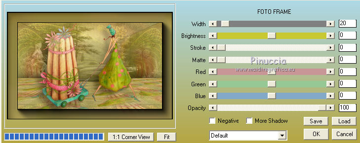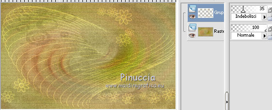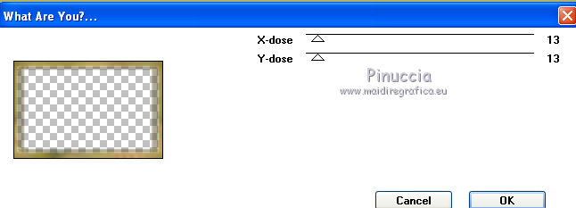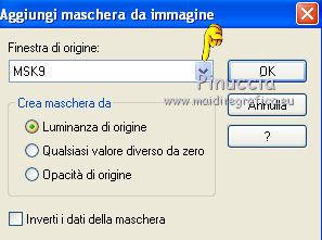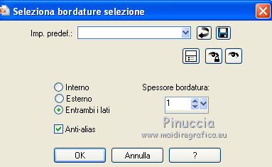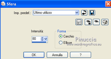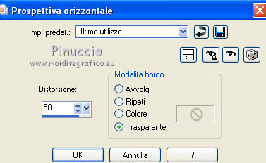 qui puoi trovare qualche risposta ai tuoi dubbi. Se l'argomento che ti interessa non è presente, ti prego di segnalarmelo. Questo tutorial è una creazione di Saturnella e non può essere copiato su altri siti nè essere offerto per il download. Lo stesso vale per la mia traduzione. E' anche proibito togliere il watermark dal materiale; rispettiamo il lavoro dei creatori di tubes, senza i quali non potremmo creare tutorials. Il tutorial è stato creato con PSP12, ma può essere eseguito anche con le altre versioni. Per tradurlo, ho usato PSP X. Occorrente: Materiale qui Grazie a tutti per il vostro magnifico lavoro. (in questa pagina trovi i links ai loro siti). Filtri in caso di dubbi, ricorda di consultare la mia sezione filtri qui AAA Frames - Foto Frame qui Toadies - What are you qui Alien Skin Eye Candy 5 Impact - Perspective Shadow qui Mura's Meister - Perspective Tiling qui ![]() non esitare a cambiare modalità di miscelatura e opacità secondo i colori utilizzati. Metti il preset nella cartella del filtro. Doppio clic sul file e il preset sarà automaticamente installato nella cartella corretta. Apri la maschera in PSP e minimizzala con il resto del materiale. 1. Imposta il colore di primo piano con #756728, e il colore di sfondo con #b7ac6b. ![]() 2. Apri una nuova immagine trasparente 900 x 550 pixels. 3. Selezione>Seleziona tutto. Apri l'immagine background1_saturnella e vai a Modifica>Copia. Torna al tuo lavoro e vai a Modifica>Incolla nella selezione. Selezione>Deseleziona. 4. Livelli>Nuovo livello raster. Riempi con il colore chiaro.5. Livelli>Nuovo livello maschera>Da immagine. Apri il menu sotto la finestra di origine e vedrai la lista dei files aperti. Seleziona la maschera MSK9, con i seguenti settaggi. ![]() Livelli>Unisci>Unisci gruppo. Effetti>Effetti di bordo>Aumenta. 6. Cambia la modalità di miscelatura di questo livello in Indebolisci, e abbassa l'opacità al 35%. ![]() 7. Livelli>Unisci>Unisci visibile. Livelli>Duplica. 8. Effetti>Effetti geometrici>Prospettiva orizzontale. ![]() 9. Se non visualizzi i righelli, vai a Visualizza>Righelli. Premi il tasto K per attivare lo strumento Puntatore ![]() se stai usando PSP 9 il tasto D (valido per tutte le versioni), per attivare lo strumento Deformazione ![]() in modalità Scala, spingi il nodo centrale a destra verso sinistra, fino a 250 pixels. ![]() 10. Livelli>Duplica. Immagine>Rifletti. Livelli>Unisci>Unisci giù. 11. Selezione>Seleziona tutto. Selezione>Mobile. Selezione>Immobilizza. 12. Selezione>Modifica>Seleziona bordature selezione. ![]() 13. Livelli>Nuovo livello raster. Riempi con il colore scuro.Livelli>Unisci>Unisci giù. 14. Attiva lo strumento Bacchetta magica ![]() e clicca nella parte trasparente per selezionarla. ![]() 15. Livelli>Nuovo livello raster. Selezione>Seleziona tutto. 16. Apri il tube paysage 1b864603 e vai a Modifica>Copia. Torna al tuo lavoro e vai a Modifica>Incolla nella selezione. Cambia la modalità di miscelatura di questo livello in Luminanza (esistente), e abbassa l'opacità al 63%. Selezione>Deseleziona. 17. Attiva il livello copia di Uniti. ![]() 18. Effetti>Plugins>Alien Skin Eye Candy 5 Impact - Perspective Shadow. Seleziona il preset sat_invitation-persp e ok. ![]() 19. Attiva il livello "uniti". Rinomina questo livello "sfondo". Livelli>Duplica. Chiudi il livello "sfondo" e rimani posizionato sul livello soprastante. ![]() 20. Livelli>Unisci>Unisci visibile. 21. Attiva il livello "sfondo". Apri il tube del personaggio Jen_Woman619_12-06-2012 e vai a Modifica>Copia. Torna al tuo lavoro e vai a Modifica>Incolla come nuovo livello. Immagine>Ridimensiona, all'80%, tutti i livelli non selezionato. 22. Effetti>Effetti di immagine>Motivo unico, con i settaggi standard. ![]() Abbassa l'opacità di questo livello al 60%. 23. Livelli>Unisci>Unisci giù. 24. Effetti>Plugins>Mura's Meister - Perspective Tiling. ![]() 25. Livelli>Disponi>Porta in alto. 26. Tasto K o D per attivare lo strumento Puntatore/Deformazione, e spingi il nodo superiore centrale in basso fino a 350 pixels. ![]() 27. Effetti>Effetti geometrici>Sfera. ![]() Regola>Messa a fuoco>Metti a fuoco. 28. Effetti>Effetti 3D>Sfalsa ombra. ![]() 29. Modifica>Incolla come nuovo livello (il tube di Jenny è ancora in memoria). Immagine>Ridimensiona, al 75%, tutti i livelli non selezionato. Regola>Messa a fuoco>Metti a fuoco. 30. Effetti>Effetti 3D>Sfalsa ombra. ![]() 31. Riapri il livello chiuso, controlla che tutto sia a posto, e vai a Livelli>Unisci>Unisci tutto. 32. Modifica>Copia. 33. Immagine>Aggiungi bordatura, 2 pixels, simmetriche, con il colore chiaro. Immagine>Aggiungi bordatura, 2 pixels, simmetriche, con il colore scuro. Immagine>Aggiungi bordatura, 45 pixels, simmetriche, con il colore chiaro. Seleziona questo bordo con la bacchetta magica ![]() 34. Livelli>Nuovo livello raster. Modifica>Incolla nella selezione. 35. Regola>Sfocatura>Sfocatura gaussiana - raggio 10. ![]() 36. Effetti>Plugins>Toadies - What are you. ![]() Modifica>Ripeti What are you. 37. Effetti>Effetti di bordo>Aumenta di più. Selezione>Inverti. 38. Effetti>Effetti 3D>Sfalsa ombra. ![]() 39. Livelli>Unisci>Unisci tutto. 40. Immagine>Aggiungi bordatura, 2 pixels, simmetriche, con il colore scuro. 41. Effetti>Plugins>AAA Frames - Foto Frame. ![]() 42. Immagine>Aggiungi bordatura, 1 pixel, simmetriche, con il colore nero. Firma il tuo lavoro. Immagine>Ridimensiona, a 900 pixels di larghezza, tutti i livelli selezionato. Salva in formato jpg. ![]() Se hai problemi o dubbi, o trovi un link non funzionante, o anche soltanto per dirmi che ti è piaciuto, scrivimi. 21 Giugno 2012 |