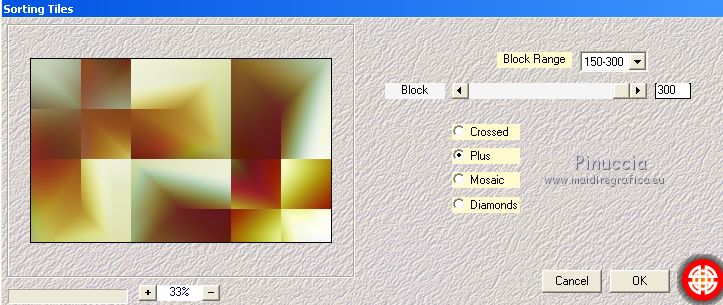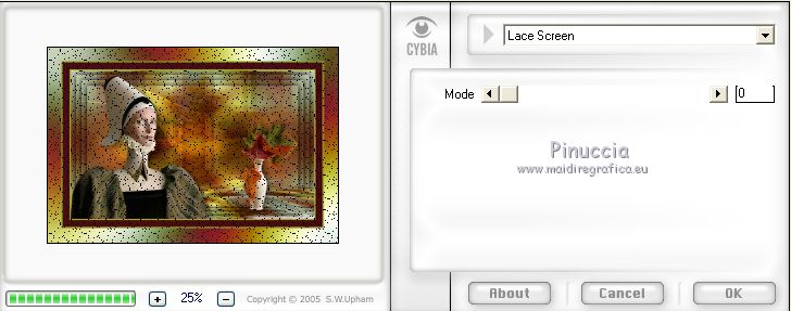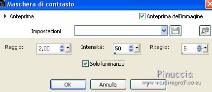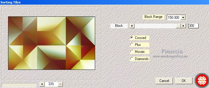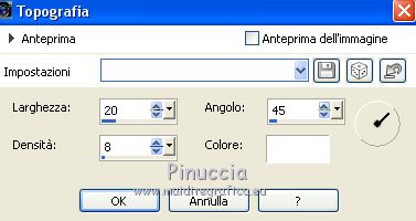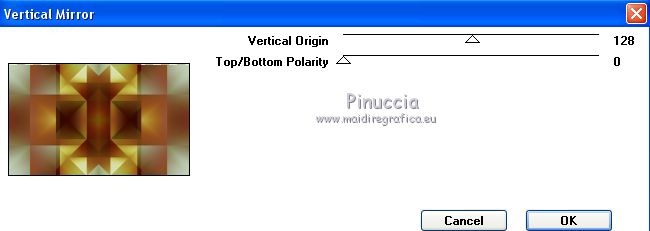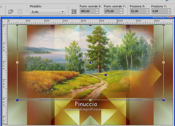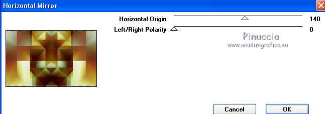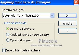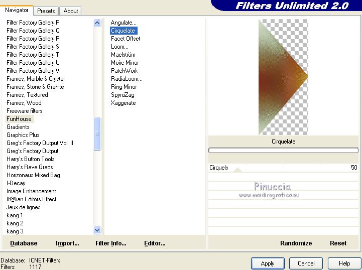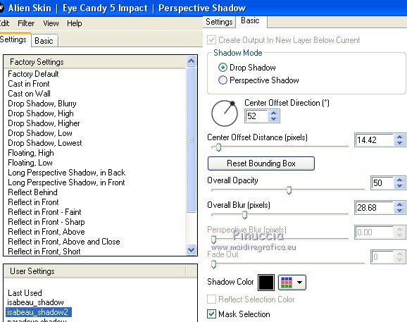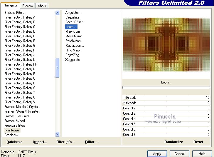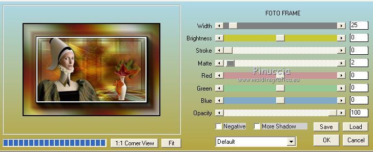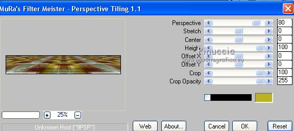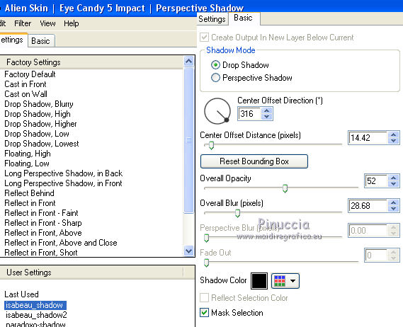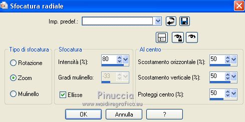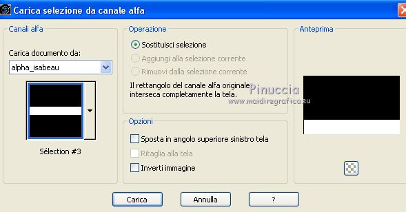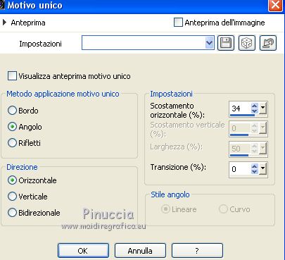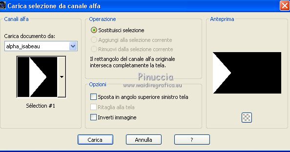qui puoi trovare qualche risposta ai tuoi dubbi. Se l'argomento che ti interessa non è presente, ti prego di segnalarmelo. Questo tutorial è una creazione di Saturnella e non può essere copiato su altri siti nè essere offerto per il download. Lo stesso vale per la mia traduzione. E' anche proibito togliere il watermark dal materiale; rispettiamo il lavoro dei creatori di tubes, senza i quali non potremmo creare tutorials. Per tradurre questo tutorial, creato con Corel2018, ho usato CorelX7, ma può essere eseguito anche con le altre versioni di PSP. Dalla versione X4, il comando Immagine>Rifletti è stato sostituito con Immagine>Capovolgi in orizzontale, e il comando Immagine>Capovolgi con Immagine>Capovolgi in verticale. Nelle versioni X5 e X6, le funzioni sono state migliorate rendendo disponibile il menu Oggetti. Nel nuovo X7 sono tornati i comandi Immagine>Rifletti e Immagine>Capovolgi, ma con nuove funzioni. Vedi la scheda sull'argomento qui Occorrente: Materiale qui Tutto il materiale è di Saturnella. (in questa pagina trovi i links ai loro siti). Filtri in caso di dubbi, ricorda di consultare la mia sezione filtri qui Filters Unlimited 2.0 qui Mehdi - Wavy Lab 1.1 qui Mehdi - Sorting Tiles qui Graphics Plus - Horizontal Mirror, Vertical Mirror qui Funhouse - Cirquelate qui Funhouse - Loom qui Alien Skin Eye Candy 5 Impact - Perspective Shadow qui FM Tile Tools - Saturation Emboss qui Mura's Meister - Perspective Tiling qui Cybia - Screenworks qui AAA Frames - Foto Frame qui I filtri Graphics Plus, Funhouse e Cybia si possono usare da soli o importati in Filters Unlimited (come fare vedi qui) Se un filtro fornito appare con questa icona ![]() non esitare a cambiare modalità di miscelatura e opacità secondo i colori utilizzati. Metti il preset Cliccando sul file una o due volte (a seconda delle tue impostazioni), automaticamente il preset si installerà nella cartella corretta. perchè uno o due clic vedi qui Se preferisci, puoi importare direttamente il preset nel corso del tutorial Come fare vedi la scheda del filtro Eye Candy qui Apri la maschera in PSP e minimizzala con il resto del materiale. Colori utilizzati ![]() 1. Imposta il colore di primo piano con il colore 1 #687f37, e il colore di sfondo con il colore 2 #bab221. ![]() Apri alpha_isabeau. Finestra>Duplica, o sulla tastiera tasto della maiuscola+D per fare una copia. ![]() Chiudi l'originale. La copia, che sarà la base del tuo lavoro, non è vuota, ma contiene le selezioni salvate sul canale alfa. Rinomina il livello Raster 1. 2. Effetti>Plugins>Mehdi - Wavy Lab 1.1 Questo filtro crea gradienti con i colori della tua paletta: il primo è il colore di sfondo, il secondo quello di primo piano; degli ultimi due colori creati dal filtro cambia: il terzo colore con il colore 3 #911a25 e il quarto con il colore bianco #ffffff. ![]() 3. Regola>Sfocatura>Sfocatura radiale. ![]() 4. Livelli>Duplica. Effetti>Plugins>Mehdi - Sorting Tiles. ![]() 5. Ripeti Livelli>Duplica. Effetti>Plugins>Mehdi - Sorting Tiles. ![]() 6. Immagine>Ruota per gradi - 90 gradi a destra ![]() Immagine>Ridimensiona, al 62%, tutti i livelli non selezionato. Cambia la modalità di miscelatura di questo livello in Moltiplica, o altro. Livelli>Unisci>Unisci giù. 7. Effetti>Plugins>Graphics Plus - Horizontal Mirror. ![]() 8. Effetti>Plugins>Graphics Plus - Vertical Mirror. ![]() 9. Selezione>Carica/Salva selezione>Carica selezione da canale alfa. La selezione sélection#1 è subito disponibile. Devi soltanto cliccare Carica. ![]() Selezione>Innalza selezione a livello. Effetti>Plugins>Filters Unlimited 2.0 - Funhouse - Cirquelate. ![]() Selezione>Deseleziona. 10. Livelli>Duplica. Immagine>Rifletti. Livelli>Unisci>Unisci giù. 11. Effetti>Effetti di immagine>Motivo unico. ![]() 12. Apri il tube del paesaggio e vai a Modifica>Copia. Torna al tuo lavoro e vai a Modifica>Incolla come nuovo livello. in alto (Oggetti>Allinea>Superiore).![]() Livelli>Disponi>Sposta giù. Cambia la modalità di miscelatura di questo livello in Luce netta, e abbassa l'opacità al 18%. 13. Effetti>Plugins>FM Tile Tools - Saturation Emboss, con i settaggi standard. ![]() 14. Attiva il livello Copia di Raster 1. Effetti>Plugins>Filters Unlimited 2.0 - Funhouse - Loom. ![]() Ripeti l'Effetto una seconda volta. Selezione>Seleziona tutto. Selezione>Modifica>Contrai - 20 pixels. ![]() 15. Effetti>Effetti 3D>Sfalsa ombra. ![]() 16. Selezione>Modifica>Contrai - 20 pixels. Effetti>Effetti 3D>Sfalsa ombra, con i settaggi precedenti. 17. Ancora Selezione>Modifica>Contrai - 20 pixels. Effetti>Effetti 3D>Sfalsa ombra, con i settaggi precedenti. Selezione>Deseleziona. 18. Rimani posizionato sul livello Copia di Raster 1. ![]() Selezione>Carica/Salva selezione>Carica selezione da canale alfa. Apri il menu delle selezioni e carica sélection#3. ![]() Selezione>innalza selezione a livello. Livelli>Disponi>Porta in alto. 19. Effetti>Effetti artistici>Topografia. ![]() 20. Effetti>Plugins>Mura's Meister - Perspective Tiling. ![]() Selezione>Deseleziona. 21. Attiva lo strumento Bacchetta magica , sfumatura 50,e clicca nella parte trasparente per selezionarla. Premi sulla tastiera 4-5 volte il tasto CANC ![]() Selezione>Deseleziona. 22. Livelli>Nuovo livello raster. Riempi con il colore 2 (colore di sfondo).Livelli>Nuovo livello maschera>Da immagine. Apri il menu sotto la finestra di origine e vedrai la lista dei files aperti. Seleziona la maschera Saturnella_Mask_004. ![]() Effetti>Effetti di bordo>Aumenta. Livelli>Unisci>Unisci gruppo. Cambia la modalità di miscelatura di questo livello in Indebolisci, o altro, e abbassa l'opacità al 70%. 23. Apri il tube del personaggio e vai a Modifica>Copia. Torna al tuo lavoro e vai a Modifica>Incolla nella come nuovo livello. Immagine>Ridimensiona, al 75%, tutti i livelli non selezionato. Sposta il tube a sinistra.24. Effetti>Plugins>Alien Skin Eye Candy 5 Impact - Perspective Shadow. Seleziona il preset isabeau_shadow e ok. Questi i settaggi, in caso di p
