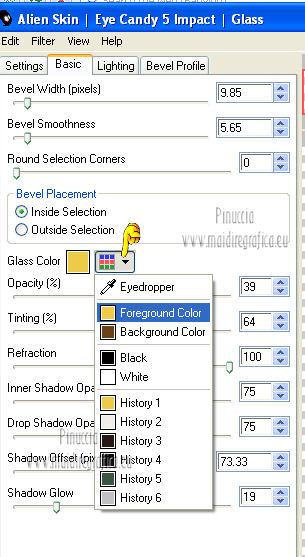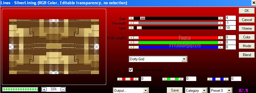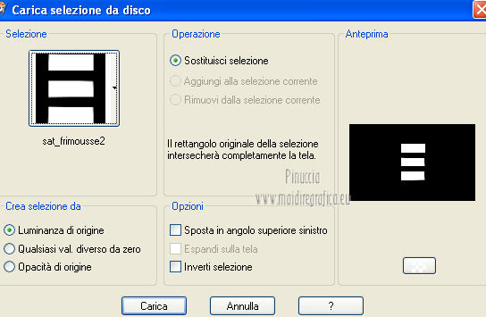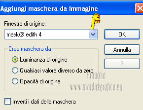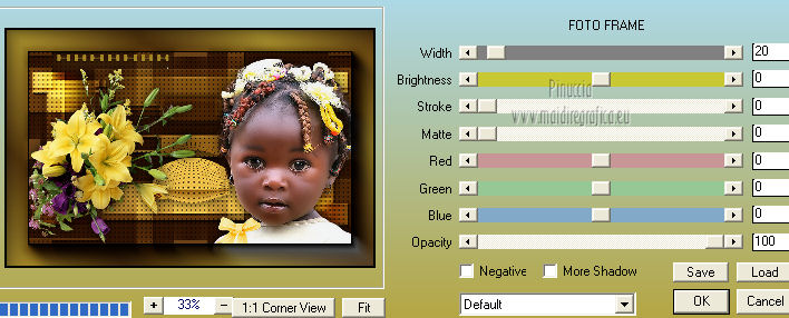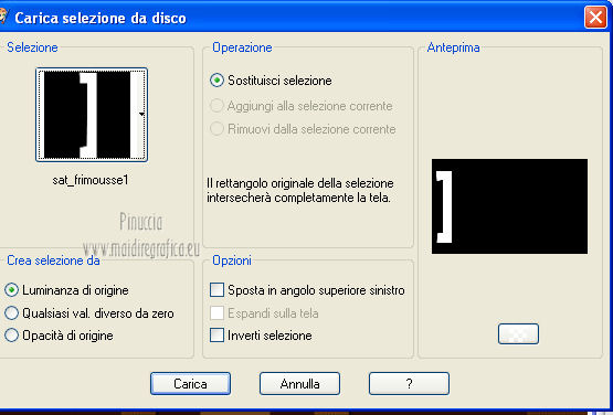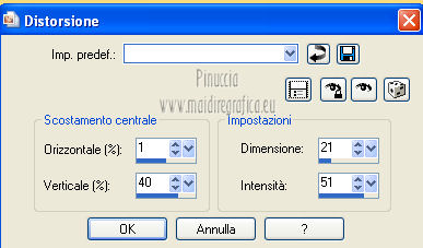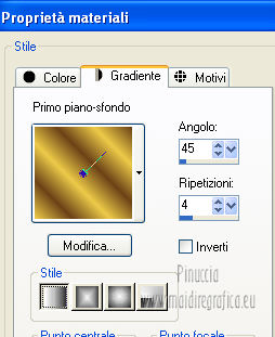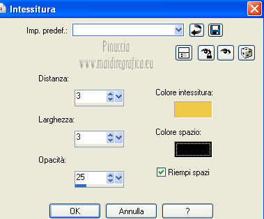 qui puoi trovare qualche risposta ai tuoi dubbi. Se l'argomento che ti interessa non è presente, ti prego di segnalarmelo. Questo tutorial è una creazione di Saturnella e non può essere copiato su altri siti nè essere offerto per il download. Lo stesso vale per la mia traduzione. E' anche proibito togliere il watermark dal materiale; rispettiamo il lavoro dei creatori di tubes, senza i quali non potremmo creare tutorials. Questo tutorial è stato creato con PSP 12, ma può essere eseguito anche con le altre versioni di PSP. Per tradurlo ho usato PSP X. Occorrente: Materiale qui Il tube della bambina è di JHanna, e il tube dei fiori di Gina. Grazie a tutti per il vostro magnifico lavoro. (in questa pagina trovi i links ai loro siti). Filtri in caso di dubbi, ricorda di consultare la mia sezione filtri qui AAA Frames - Foto Frame qui Alien Skin Eye Candy 5 Impact - Glass qui AO 01 Innovations - Lines SilverLining qui ![]() non esitare a cambiare modalità di miscelatura e opacità secondo i colori utilizzati. Metti le selezioni nella cartella Selezioni. Apri la maschera in PSP e minimizzala con il resto del materiale. 1. Imposta il colore di primo piano con #f7e7bd, e il colore di sfondo con #6b4218. 2. Apri una nuova immagine trasparente 900 x 550 pixels, e riempila con il colore scuro.3. Livelli>Nuovo livello raster. Riempi con il colore chiaro.4. Livelli>Nuovo livello maschera>Da immagine. Apri il menu sotto la finestra di origine e vedrai la lista dei files aperti. Seleziona la maschera mask@edith4, con i seguenti settaggi: ![]() Livelli>Unisci>Unisci gruppo. 5. Effetti>Effetti 3D>Sfalsa ombra. ![]() Cambia la modalità di miscelatura di questo livello in Luce netta. 6. Livelli>Unisci>Unisci visibile. 7. Livelli>Duplica. Immagine>Ridimensiona, al 90%, tutti i livelli non selezionato. 8. Effetti>Effetti di immagine>Motivo unico. ![]() Cambia la modalità di miscelatura di questo livello in Moltiplica. 9. Effetti>Plugins>Ap 01 [Innovations] Line Silverlining. ![]() 10. Selezione>Carica/Salva selezione>Carica selezione da disco. Cerca e carica la selezione sat_frimousse1. ![]() Selezione>Innalza selezione a livello. Selezione>Deseleziona. 11. Effetti>Effetti di distorsione>Vento, da sinistra, intensità 100. ![]() Cambia la modalità di miscelatura di questo livello in Luce netta. 12. Livelli>Duplica. Immagine>Rifletti. Livelli>Unisci>Unisci visibile. 13. Selezione>Carica/Salva selezione>Carica selezione da disco. Cerca e carica la selezione sat_frimousse2. ![]() Selezione>Innalza selezione a livello. Selezione>Deseleziona. 14. Effetti>Effetti di distorsione>Distorsione. ![]() 15. Effetti>Effetti 3D>Sfalsa ombra. ![]() 16. Apri il tube della bambina "JHanna 286-tube-1" e vai a Modifica>Copia. Torna al tuo lavoro e vai a Modifica>Incolla come nuovo livello. Spostalo in basso a destra.17. Effetti>Effetti 3D>Sfalsa ombra, con i settaggi precedenti. 18. Imposta il colore di primo piano con #edca48. 19. Attiva lo strumento Penna ![]() linea di stile estremità arrotondata-intervalli - larghezza 3 (se stai usando le versioni più recenti di PSP corrisponde alla linea di stile Corel_13_014) ![]() Tenendo premuto il tasto della maiuscola, traccia una linea come nell'esempio. ![]() 20. Livelli>Converti in livello raster. 21. Effetti>Plugins>Alien Skin Eye Candy 6 Impact - Glass, Glass color: colore di primo piano. ![]() 22. Effetti>Effetti 3D>Sfalsa ombra. ![]() 23. Apri il tube del fiore di Gina e vai a Modifica>Copia. Torna al tuo lavoro e vai a Modifica>Incolla come nuovo livello. Spostalo a sinistra.Effetti>Effetti 3D>Sfalsa ombra, con il colore nero. ![]() Livelli>Unisci>Unisci tutto. 24. Immagine>Aggiungi bordatura, 2 pixels, simmetriche, con il colore scuro. Immagine>Aggiungi bordatura, 45 pixels, simmetriche, con il colore chiaro. Seleziona questo bordo con la bacchetta magica ![]() 25. Passa il colore di primo piano a Gradiente, stile lineare, con i seguenti settaggi. ![]() Riempi la selezione con questo gradiente.26. Effetti>Effetti di trama>Intessitura. Colore intessitura: colore di primo piano - Riempi spazi: nero. ![]() 27. Selezione>Inverti. Effetti>Effetti 3D>Sfalsa ombra, con i settaggi precedenti. Selezione>Deseleziona. 28. Effetti>Plugins>AAA Frames - Foto Frame. ![]() Immagine>Aggiungi bordatura, 1 pixel, simmetriche, con il colore nero. Firma il tuo lavoro. Immagine>Ridimensiona, a 900 pixels di larghezza. Regola>Messa a fuoco>Metti a fuoco. Salva in formato jpg. ![]() Se hai problemi o dubbi, o trovi un link non funzionante, o anche soltanto per dirmi che ti è piaciuto, scrivimi. 21 Agosto 2012 |