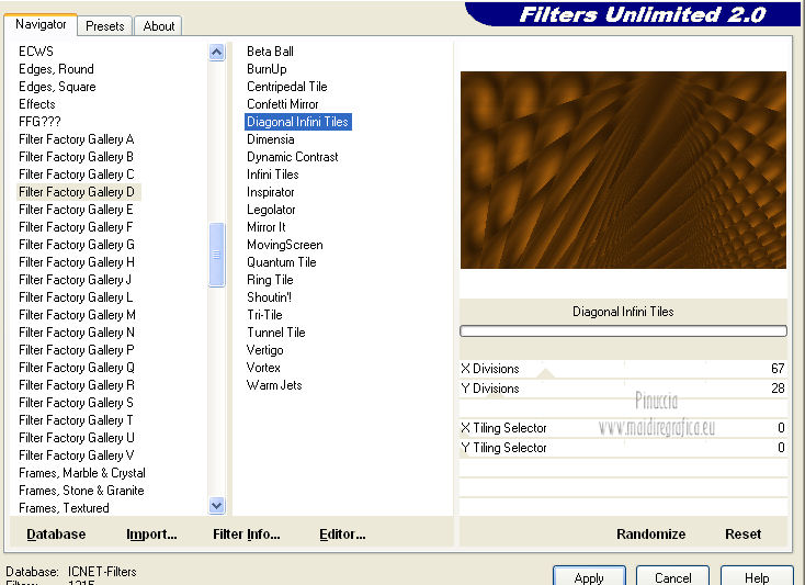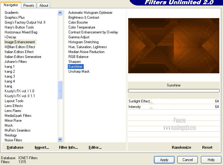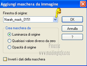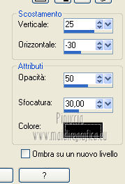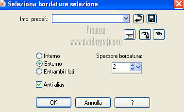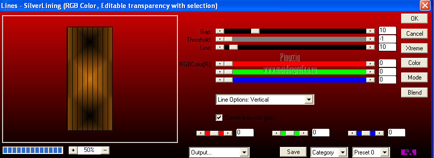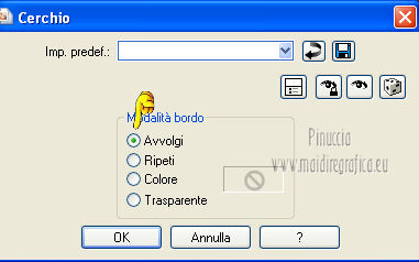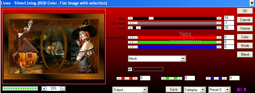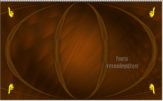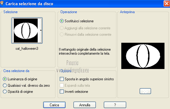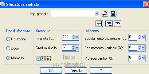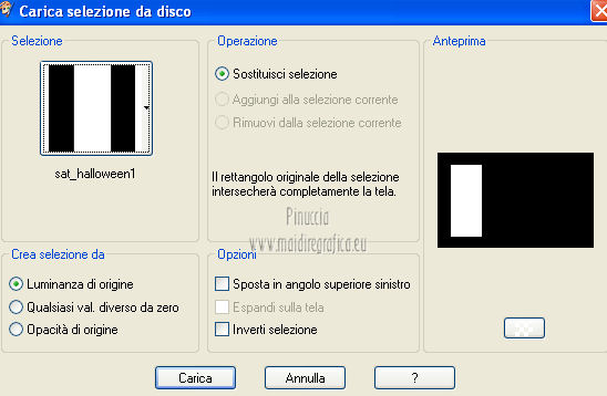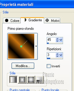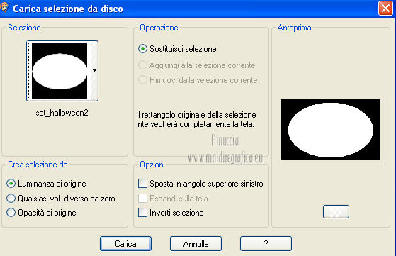 qui puoi trovare qualche risposta ai tuoi dubbi. Se l'argomento che ti interessa non è presente, ti prego di segnalarmelo. Questo tutorial è una creazione di Saturnella e non può essere copiato su altri siti nè essere offerto per il download. Lo stesso vale per la mia traduzione. E' anche proibito togliere il watermark dal materiale; rispettiamo il lavoro dei creatori di tubes, senza i quali non potremmo creare tutorials. Questo tutorial è stato creato con PSP 12, ma può essere eseguito anche con le altre versioni di PSP. Per tradurlo ho usato PSP X. Occorrente: Materiale qui I tubes usati sono di MKM, A Psp Devil, Betsie e TReagen. La maschera è di Narah. Il wordart è di Diablotine. Grazie a tutti per il vostro magnifico lavoro. (in questa pagina trovi i links ai loro siti). Filtri in caso di dubbi, ricorda di consultare la mia sezione filtri qui Filters Unlimited 2.0 qui Filter Factory Gallery D qui Simple qui AP 01 Innovations - Lines SilverLining qui ![]() non esitare a cambiare modalità di miscelatura e opacità secondo i colori utilizzati. Metti le selezioni nella cartella Selezioni. Apri la maschera in PSP e minimizzala con il resto del materiale. 1. Imposta il colore di primo piano con #ca7311, e il colore di sfondo con #000000. ![]() Passa il colore di primo piano a Gradiente, stile Lineare ![]() Apri una nuova immagine trasparente 900 x 550 pixels, riempila con il gradiente.2. Regola>Sfocatura>Sfocatura radiale. ![]() 3. Regola>Sfocatura>Sfocatura gaussiana - raggio 20. ![]() 4. Effetti>Effetti di trama>Veneziana. ![]() 5. Livelli>Duplica. Effetti>Plugins>Filters Unlimited 2.0 - Filter Factory Gallery D - Diagonal infini tiles. ![]() Cambia la modalità di miscelatura di questo livello in Sovrapponi, e abbassa l'opacità al 40% (o secondo i tuoi colori). Effetti>Effetti di bordo>Aumenta. Livelli>Unisci>Unisci visibile. 6. Livelli>Nuovo livello raster. Selezione>Carica/Salva selezione>Carica selezione da disco. Cerca e carica la selezione sat_halloween1. ![]() Riempi la selezione con il gradiente.7. Effetti>Plugins>Simple - 4Way average. 8. Effetti>Plugins>AP01 Innovations - Lines SilverLining. ![]() 9. Effetti>Effetti 3D>Sfalsa ombra. ![]() Selezione>Deseleziona. 10. Livelli>Duplica. Immagine>Rifletti. Livelli>Unisci>Unisci giù. 11. Effetti>Plugins>Simple - Center Tile. 12. Effetti>Effetti geometrici>Cerchio. ![]() 13. Attiva lo strumento Gomma ![]() e cancella le tracce visibili negli angoli, eventualmente, per vedere meglio, chiudi il livello inferiore. ![]() 14. Immagine>Ridimensiona, al 90%, tutti i livelli non selezionato. Rinomina questo livello "forma". Regola>Messa a fuoco>Metti a fuoco. 15. Selezione>Carica/Salva selezione>Carica selezione da disco. Cerca e carica la selezione sat_halloween2. ![]() 16. Selezione>Modifica>Seleziona bordature selezione. ![]() 17. Livelli>Nuovo livello raster. Riempi con il gradiente.Selezione>Deseleziona. Livelli>Unisci>Unisci giù. 18. Selezione>Carica/Salva selezione>Carica selezione da disco. Cerca e carica la selezione sat_halloween3. ![]() 19. Livelli>Nuovo livello raster. Apri il tube del paesaggio Sept_Series_Halloween 3-3 e vai a Modifica>Copia. Torna al tuo lavoro e vai a Modifica>Incolla nella selezione. Mantieni selezionato. 20. Livelli>Nuovo livello raster. Apri il tube Halloween2010-misted tube of a PSP Devil, e vai a Modifica>Copia. Torna al tuo lavoro e vai a Modifica>Incolla nella selezione. Cambia la modalità di miscelatura di questo livello in Sovrapponi, e abbassa l'opacità al 76%. Selezione>Deseleziona. 21. Attiva il livello "forma". Regola>Luminosità e contrasto>Nitidezza. ![]() 22. Effetti>Effetti 3D>Sfalsa ombra. ![]() 23. Chiudi il livello di sfondo, e posizionati su uno dei livelli visibili. Livelli>Unisci>Unisci visibile. 24. Riapri e attiva il livello di sfondo. Effetti>Plugins>Simple - Blintz. Immagine>Rifletti. 25. Effetti>Plugins>Simple - Pizza slice mirror. 26. Effetti>Plugins>Filters Unlimited 2.0 - Image Enhancement - Sunshine, con i settaggi standard. ![]() Ripeti l'Effetto una seconda volta. 27. Livelli>Nuovo livello raster. Imposta il colore di sfondo con il colore bianco. Riempi con il colore bianco (tasto destro del mouse).Livelli>Nuovo livello maschera>Da immagine. Apri il menu sotto la finestra di origine e vedrai la lista dei files aperti. Seleziona la maschera Narah_mask_0151, con i seguenti settaggi: ![]() Livelli>Unisci>Unisci gruppo. Immagine>Capovolgi. Cambia la modalità di miscelatura di questo livello in Indebolisci. 28. Apri il tube TReagen2235_05-10-12, e vai a Modifica>Copia. Torna al tuo lavoro e vai a Modifica>Incolla come nuovo livello. Immagine>Ridimensiona, all'80%, tutti i livelli non selezionato. Spostalo a sinistra.29. Effetti>Effetti 3D>Sfalsa ombra. ![]() 30. Apri il tube Betsie_809-07-10-2011, e vai a Modifica>Copia. Torna al tuo lavoro e vai a Modifica>Incolla come nuovo livello. Spostalo a destra.31. Effetti>Effetti 3D>Sfalsa ombra. ![]() 32. Apri il wordart e vai a Modifica>Copia. Torna al tuo lavoro e vai a Modifica>Incolla come nuovo livello. Spostalo in alto.33. Imposta nuovamente il colore di sfondo con il colore nero. Immagine>Aggiungi bordatura, 2 pixels, simmetriche, con il colore nero. Immagine>Aggiungi bordatura, 2 pixels, simmetriche, con il colore chiaro. Immagine>Aggiungi bordatura, 2 pixels, simmetriche, con il colore nero. Immagine>Aggiungi bordatura, 50 pixels, simmetriche, con il colore bianco. 34. Seleziona il bordo bianco con la bacchetta magica ![]() e riempilo con il gradiente.35. Effetti>Plugins>AP 01 Innovatons - Lines SilverLining. ![]() 36. Effetti>Plugins>Simple - Pizza Slice Mirror. 37. Selezione>Innalza selezione a livello. Selezione>Deseleziona. 38. Livelli>Duplica. Immagine>Rifletti. Abbassa l'opacità di questo livello al 50%. 39. Selezione>Seleziona tutto. Selezione>Modifica>Contrai - 50 pixels. Effetti>Effetti 3D>Sfalsa ombra. ![]() Selezione>Deseleziona. 40. Aggiungi il tuo nome e/o il tuo watermark su un nuovo livello. 41. Imm