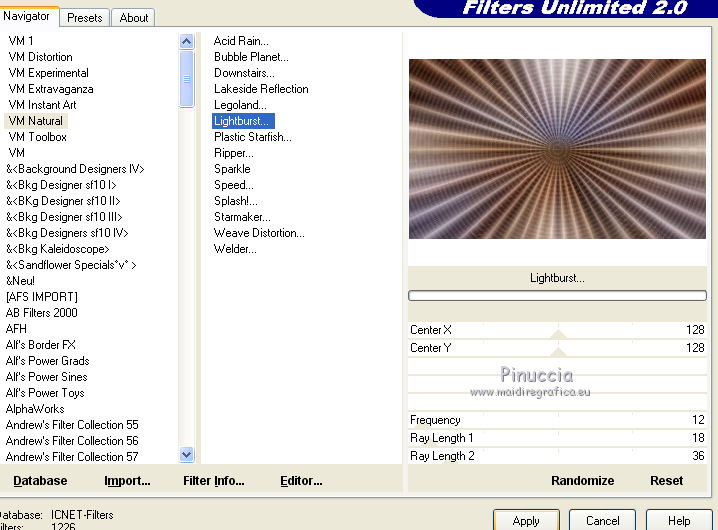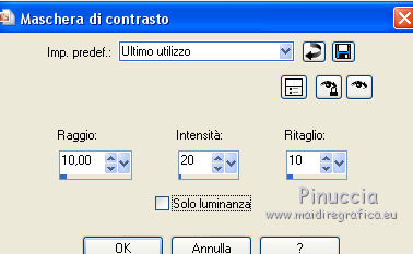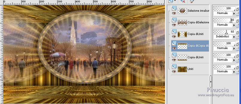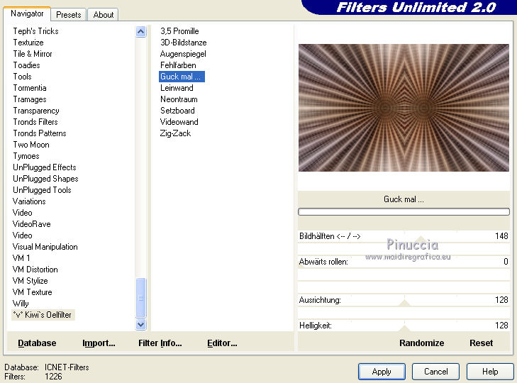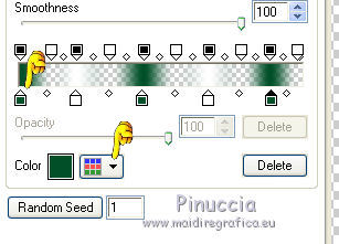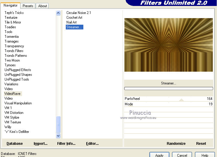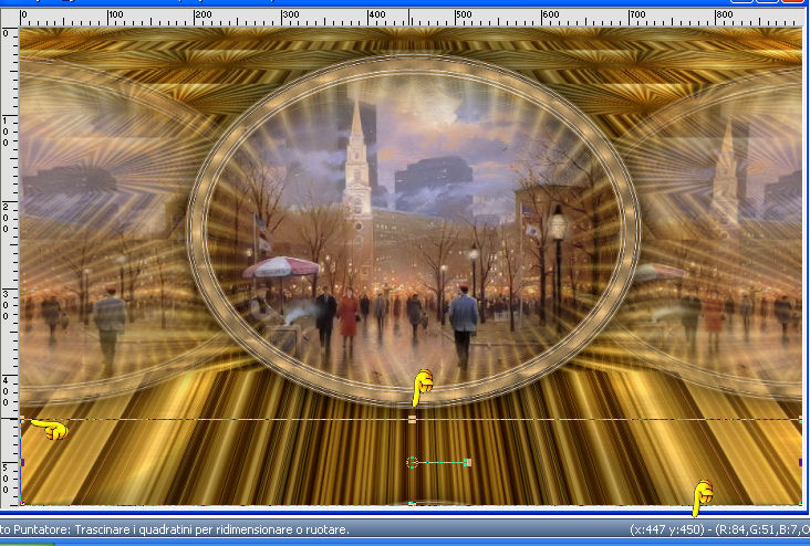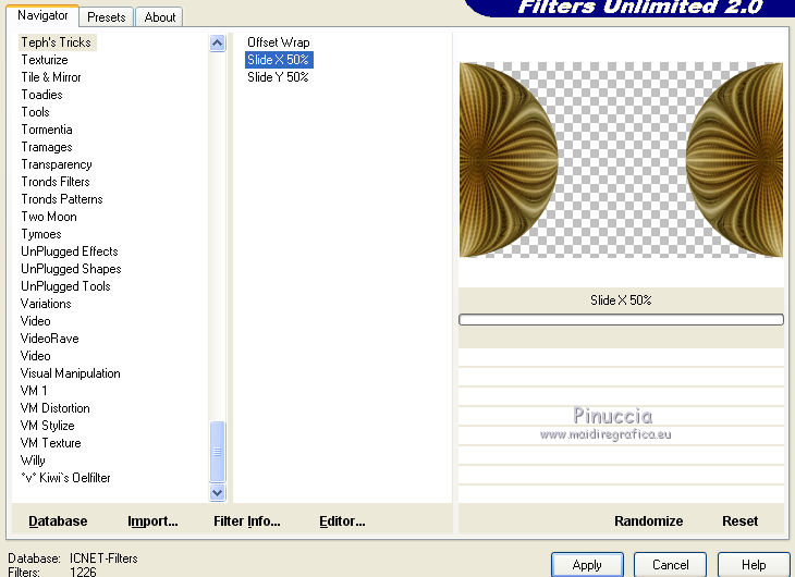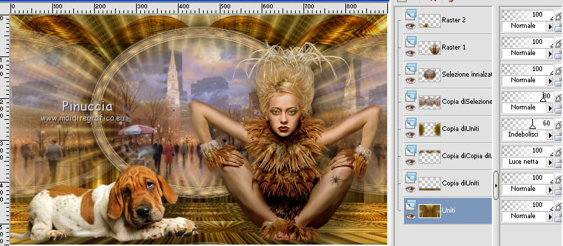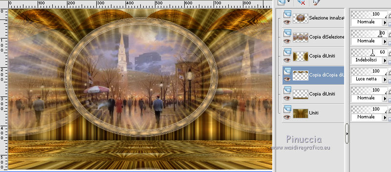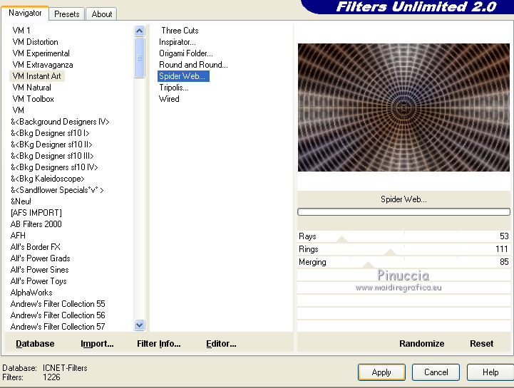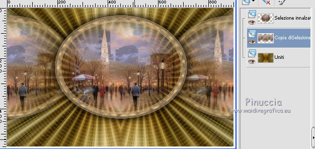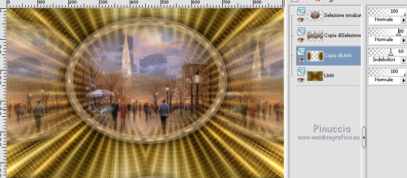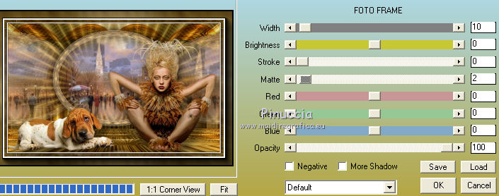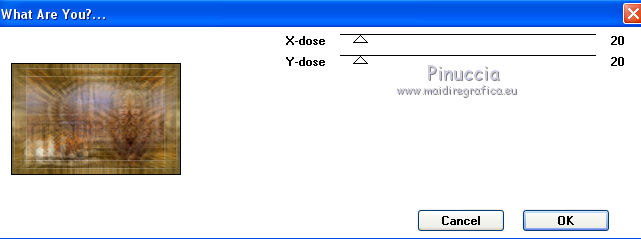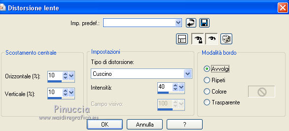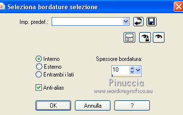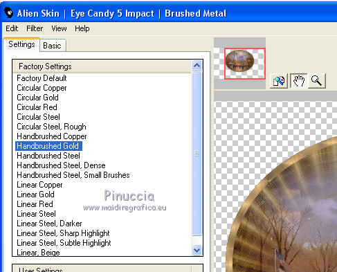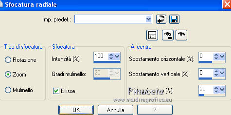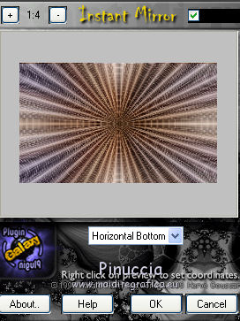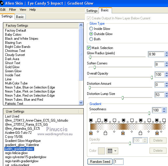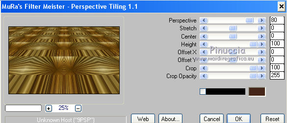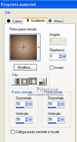 qui puoi trovare qualche risposta ai tuoi dubbi. Se l'argomento che ti interessa non è presente, ti prego di segnalarmelo. Questo tutorial è una creazione di Saturnella e non può essere copiato su altri siti nè essere offerto per il download. Lo stesso vale per la mia traduzione. E' anche proibito togliere il watermark dal materiale; rispettiamo il lavoro dei creatori di tubes, senza i quali non potremmo creare tutorials. Per tradurre questo tutorial, creato con PSP18, ho usato CorelX, ma può essere eseguito anche con le altre versioni di PSP. Dalla versione X4, il comando Immagine>Rifletti è stato sostituito con Immagine>Capovolgi in orizzontale, e il comando Immagine>Capovolgi con Immagine>Capovolgi in verticale. Nelle versioni X5 e X6, le funzioni sono state migliorate rendendo disponibile il menu Oggetti. Nel nuovo X7 sono tornati i comandi Immagine>Rifletti e Immagine>Capovolgi, ma con nuove funzioni. Vedi la scheda sull'argomento qui Occorrente: Materiale qui Per i tubes grazie Alies, Suzi Sgai e Mina. (in questa pagina trovi i links ai loro siti). Filtri in caso di dubbi, ricorda di consultare la mia sezione filtri qui Filters Unlimited 2.0 qui VM Instant Art - Spider Web qui VM Natural - Lightburst qui Plugin Galaxy - Instant Mirror qui Kiwi Oelfilter - Gluck Mal qui Alien Skin Eye Candy 5 Impact - Brushed Metal, Gradient glow qui Flaming Pear - Flexify 2 qui Adjust - Variations qui Teph's Trick - Slide X50 qui Videorave - Streamer qui Mura's Meister - Perspective Tiling qui Simple - 4 way average qui Toadies - What are you qui AAA Frames - Foto Frame qui I filtri VM Instant Art, VM Natural, Kiwi, Teph's Trick, Videorave, Simple e Toadies si possono usare da soli o importati in Filters Unlimited (come fare vedi qui) Se un filtro fornito appare con questa icona ![]() non esitare a cambiare modalità di miscelatura e opacità secondo i colori utilizzati. Nelle ultime versioni di PSP non c'è il gradiente di primo piano/sfondo (Corel_06_029) Trovi i gradienti delle versioni precedenti qui Metti il preset Cliccando sul file una o due volte (a seconda delle tue impostazioni), automaticamente il preset si installerà nella cartella corretta. perchè uno o due clic vedi qui 1. Imposta il colore di primo piano con il colore chiaro #dbc2a5, e il colore di sfondo con il colore scuro #452517. ![]() Passa il colore di primo piano a Gradiente di primo piano/sfondo, stile sprazzo di luce. ![]() Apri alpha_judith. Finestra>Duplica o sulla tastiera maiuscola+D per fare una copia. ![]() Chiudi l'originale. La copia, che sarà la base del tuo lavoro, non è vuota, ma contiene una selezione salvata sul canale alfa. 2. Selezione>Seleziona tutto. Apri il tube del paesaggio di Suzi Sgai e vai a Modifica>Copia. Torna al tuo lavoro e vai a Modifica>Incolla nella selezione. Selezione>Deseleziona. Immagine>Ridimensiona, al 120%, tutti i livelli non selezionato (per riempire il livello; se usi un altro tube regolati di conseguenza) 3. Effetti>Effetti di immagine>Motivo unico. ![]() 4. Regola>Sfocatura>Sfocatura radiale. ![]() Effetti>Effetti di bordo>Aumenta. 5. Livelli>Duplica. Effetti>Plugins>Filters Unlimited 2.0 - VM Instant Art - Spider Web, con i settaggi standard. ![]() Livelli>Unisci>Unisci visibile. 6. Effetti>Plugins>Filters Unlimited 2.0 - VM Natural - Lightburst, con i settaggi standard. ![]() 7. Effetti>Plugin Galaxy - Instant Mirror ![]() 8. Effetti>Plugins>Filters Unlimited 2.0 - Kiwi Oelfilter - Gluck mal, con i settaggi standard. ![]() 9. Effetti>Plugins>Adjust - Variations. 1 clic su Original per annullare eventuali precedenti settaggi memorizzati dal filtro, 2 clic su More yellow, 1 clic su Darker e ok. adatta ai tuoi colori. 10. Selezione>Carica/Salva selezione>Carica selezione da canale alfa. La selezione sélection#1 è subito disponibile. Devi soltanto cliccare Carica. ![]() Selezione>Innalza selezione a livello. 11. Livelli>Nuovo livello raster. Modifica>Incolla nella selezione (il tube del paesaggio è sempre in memoria). Livelli>Unisci>Unisci giù. 12. Selezione>Modifica>Seleziona bordature selezione. ![]() Riempi la selezione con il gradiente.13. Effetti>Plugins>Alien Skin Eye Candy 5 Impact - Brushed Metal. seleziona il preset handbrushed gold e ok. ![]() 14. Effetti>Plugins>Alien Skin Eye Candy 5 Impact - Gradient Glow. Seleziona il preset judith_gradient glow e ok. Questi i settaggi, in caso di problemi con il preset. ![]() se stai usando altri colori, clicca sul "calamaio" per attivare il menu Color, e imposta il tuo colore di sfondo ![]() Selezione>Deseleziona. 15. Effetti>Effetti 3D>Sfalsa ombra. ![]() 16. Livelli>Duplica. Effetti>Effetti di immagine>Motivo unico. ![]() Livelli>Disponi>Sposta giù. ![]() 17. Effetti>Effetti di distorsione>Distorsione lente. ![]() Abbassa l'opacità di questo livello all'80%. 18. Attiva il livello di sfondo. Livelli>Duplica. Effetti>Effetti geometrici>Cerchio. ![]() 19. Effetti>Plugins>Teph’s Tricks - SlideX50 ![]() Effetti>Effetti di distorsione>Vento, da destra, intensità 100. ![]() Ripeti l'Effetto Vento, questa volta da sinistra. ![]() Cambia la modalità di miscelatura di questo livello in Indebolisci, o altro, e abbassa l'opacità al 60%. ![]() 20. Attiva il livello di sfondo. Effetti>Plugins>Filters Unlimited 2.0 - Videorave - Streamer, con i settaggi standard. ![]() Livelli>Duplica. Effetti>Plugins>Mura's Meister - Perspective Tiling, con i settaggi standard. ![]() Premi il tasto K per attivare lo strumento Puntatore ![]() se stai usando PSP 9 il tasto D per attivare lo strumento Deformazione ![]() in modalità Scala ,spingi il nodo superiore centrale verso il basso fino a 450 pixels (se non visualizzi i Righelli, vai a Visualizza>Righelli) ![]() Tasto M per deselezionare lo strumento. 21. Effetti>Effetti 3D>Sfalsa ombra, con i settaggi precedenti. 22. Livelli>Duplica. Immagine>Capovolgi. ![]() 23. Effetti>Plugins>Flaming Pear - Flexify 2. ![]() 24. Effetti>Effetti di immagine>Motivo unico. ![]() Cambia la modalità di misce