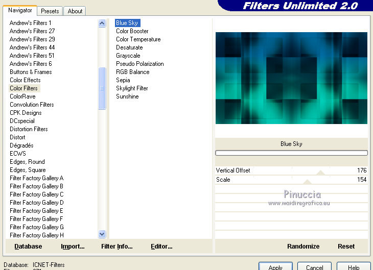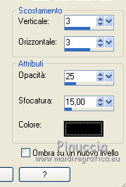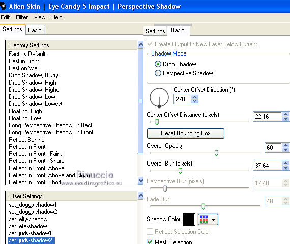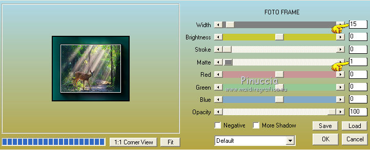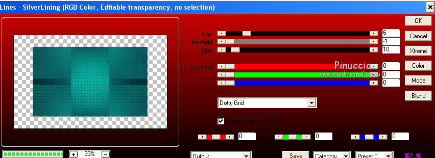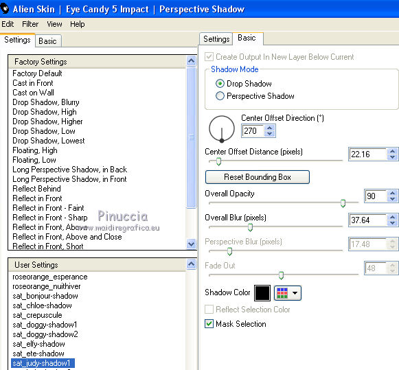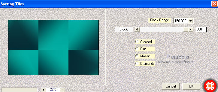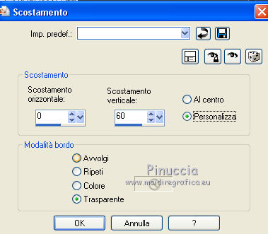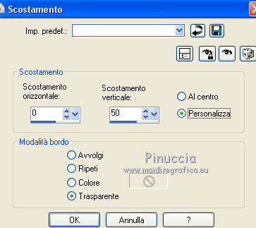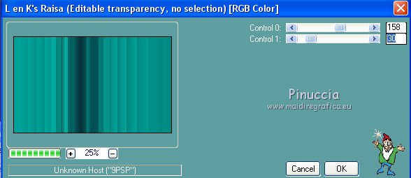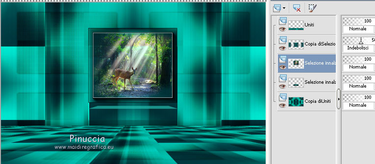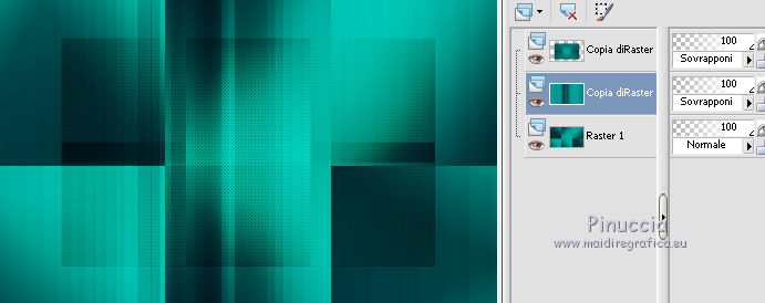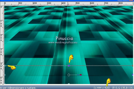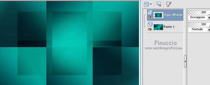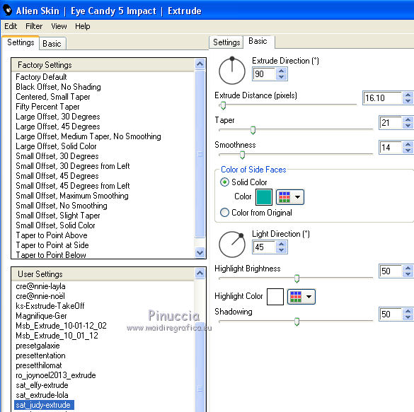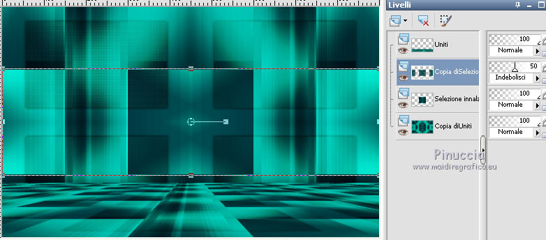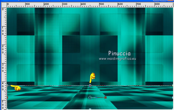 qui puoi trovare qualche risposta ai tuoi dubbi. Se l'argomento che ti interessa non è presente, ti prego di segnalarmelo. Questo tutorial è una creazione di Saturnella e non può essere copiato su altri siti nè essere offerto per il download. Lo stesso vale per la mia traduzione. E' anche proibito togliere il watermark dal materiale; rispettiamo il lavoro dei creatori di tubes, senza i quali non potremmo creare tutorials. Il tutorial è stato scritto con CorelX15, ma può essere eseguito anche con le altre versioni di PSP. Secondo la versione utilizzata (anteriore a PSP X) potresti ottenere dei risultati differenti. Vedi la mia scheda riguardante le funzioni Rifletti>Capovolgi nelle nuove versioni di PSP qui Per tradurre questo tutorial ho usato PSP X. Occorrente: Materiale qui Grazie per i tubes Syl, CibiBijoux, Radyga e Thafs. (in questa pagina trovi i links ai loro siti). Filtri in caso di dubbi, ricorda di consultare la mia sezione filtri qui Filters Unlimited 2.0 qui Simple - 4Way Average qui L&K's Raisa qui Mehdi - Wavy Lab - Sorting Tiles qui AP 01 [Innovations] - Lines SilverLining qui Alien Skin Eye Candy 5 Impact - Extrude qui Mura's Meister - Perspective Tiling qui AAA Frames - Foto Frame qui ![]() non esitare a cambiare modalità di miscelatura e opacità secondo i colori utilizzati. Metti i preset Cliccando sul file una o due volte (a seconda delle tue impostazioni), automaticamente il preset si installerà nella cartella corretta. perchè uno o due clic vedi qui Metti le selezioni nella cartella Selezioni. 1. Imposta il colore di primo piano con il colore chiaro #00ada1, e il colore di sfondo con il colore scuro #082d36. ![]() Apri una nuova immagine trasparente 900 x 550 pixels. 2. Effetti>Plugins>Mehdi - Wavy Lab Questo filtro lavora con i colori della paletta materiali. Il primo è il colore di sfondo, il secondo quello di primo piano. Lascia il terzo colore creato dal filtro. ![]() 3. Effetti>Plugins>Mehdi - Sorting Tiles. ![]() 4. Livelli>Duplica. Immagine>Ridimensiona, al 75%, tutti i livelli non selezionato. Effetti>Plugins>Simple - 4 way average. Il filtro lavora senza schermate. Risultato: ![]() 5. Effetti>Plugins>AP 01 [Innovations] - Lines SilverLining. ![]() Cambia la modalità di miscelatura di questo livello in Sovrapponi, o secondo i tuoi colori. ![]() 6. Attiva il livello di sfondo. Livelli>Duplica. Regola>Sfocatura>Sfocatura gaussiana - raggio 50. ![]() 7. Effetti>Plugins>L&K's - L&K's Raisa. ![]() Cambia la modalità di miscelatura di qusto livello in Sovrapponi, o secondo i tuoi colori. ![]() 8. Attiva il livello superiore. Effetti>Effetti 3D>Sfalsa ombra. ![]() Ripeti l'Effetto Sfalsa ombra, cambiando verticale e orizzontale con 3. ![]() 9. Livelli>Unisci>Unisci visibile. 10. Livelli>Duplica. Effetti>Plugins>Filters Unlimited 2.0 - Tile & Mirror - Mirrored & Scaled. ![]() 11. Attiva il livello di sfondo. Effetti>Plugins>Mura's Meister - Perspective Tiling. ![]() Livelli>Disponi>Porta in alto. 12. Premi il tasto K per attivare lo strumento Puntatore ![]() se stai usando PSP 9 il tasto D (valido per tutte le versioni) per attivare lo strumento Deformazione ![]() in modalità Scala, spingi il nodo superiore centrale verso il basso fino a 420 pixels nella barra inferiore puoi controllare la posizione del livello. (se non visualizzi i Righelli, vai a Visualizza>Righelli) ![]() ![]() 13. Effetti>Effetti 3D>Sfalsa ombra. ![]() 14. Attiva il livello di sfondo. Selezione>Carica/Salva selezione>Carica selezione da disco. Cerca e carica la selezione sat_judy1. ![]() Selezione>Innalza selezione a livello. Selezione>Deseleziona. 15. Livelli>Duplica. Effetti>Effetti di immagine>Motivo unico. ![]() Cambia la modalità di miscelatura di questo livello in Indebolisci, e abbassa l'opacità al 50%. ![]() 16. Attiva il livello sottostante. Selezione>Carica/Salva selezione>Carica selezione da disco. Carica nuovamente la selezione sat_judy1. ![]() Livelli>Nuovo livello raster. Apri il tube del paesaggio di CibiBijoux e vai a Modifica>Copia. Torna al tuo lavoro e vai a Modifica>Incolla nella selezione. 17. Effetti>Plugins>AAA Frames - Foto Frame. ![]() Selezione>Deseleziona. 18. Effetti>Effetti di immagine>Scostamento. ![]() 19. Attiva il livello di sfondo. 20. Selezione>Carica/Salva selezione>Carica selezione da disco. Cerca e carica la selezione sat_judy2. ![]() Selezione>Innalza selezione a livello. Selezione>Deseleziona. 21. Effetti>Effetti di immagine>Scostamento. ![]() 22. Effetti>Alien Skin Eye Candy 5 Impact - Extrude. Seleziona il preset sat_judy_extrude e ok. In caso di problemi con il preset, puoi impostare manualmente i settaggi che vedi nella schermata. Sotto Basic imposta il tuo colore chiaro. ![]() 23. Effetti>Plugins>Alien Skin Eye Candy 5 Impact - Perspective Shadow. Selezione il preset sat_judy-shadow1 e ok. ![]() 24. Attiva il livello soprastante (la cornice). ![]() Effetti>Plugins>Alien Skin Eye Candy 5 Impact - Perspective Shadow. Seleziona il preset sat_judy-shadow2 e ok. ![]() 25. Attiva il livello di sfondo. Apri il tube deco2 e vai a Modifica>Copia. Torna al tuo lavoro e vai a Modifica>Incolla come nuovo livello. E' al suo posto. Il tube è in modalità Luce diffusa. Decidi secondo i tuoi colori. 26. Attiva il livello superiore. Apri il tube deco1 e vai a Modifica>Copia. Torna al tuo lavoro e vai a Modifica>Incolla come nuovo livello. 27. Effetti>Effetti di immagine>Scostamento. ![]() 28. Effetti>Effetti 3D>Sfalsa ombra. ![]() 29. Apri il tube di Radyga e vai a Modifica>Copia. Torna al tuo lavoro e vai a Modifica>Incolla come nuovo livello. Immagine>Ridimensiona, a tuo piacimento. Regola>Messa a fuoco>Metti a fuoco. Sposta il tube sotto la cornice.Effetti>Effetti 3D>Sfalsa ombra, con i settaggi precedenti. 30. Apri il tube della donna di Syl e vai a Modifica>Copia. Torna al tuo lavoro e vai a Modifica>Incolla come nuovo livello. Immagine>Ridimensiona, al 90%, tutti i livelli non selezionato. Regola>Messa a fuoco>Metti a fuoco. Sposta il tube a sini