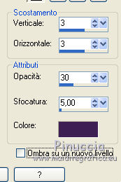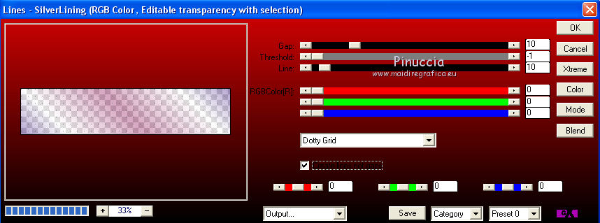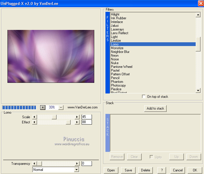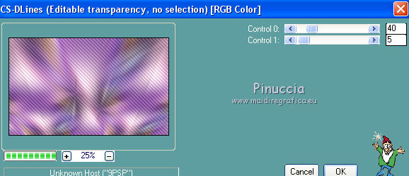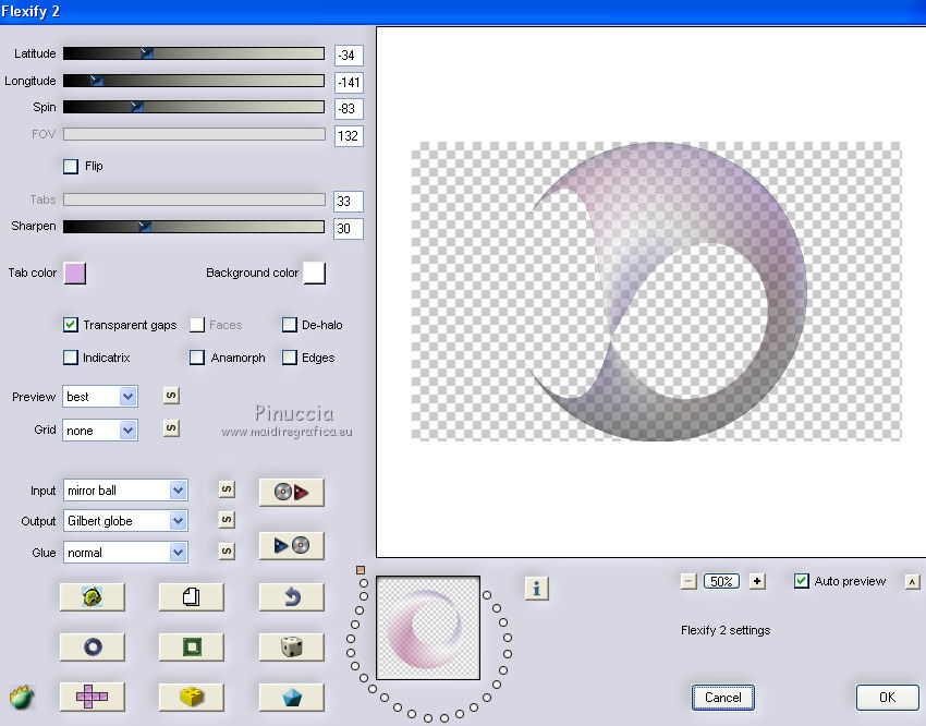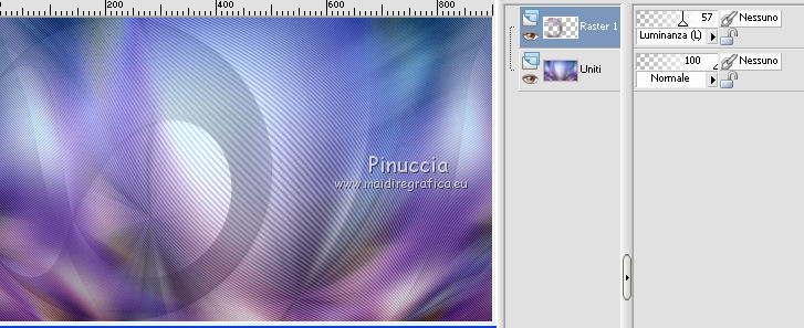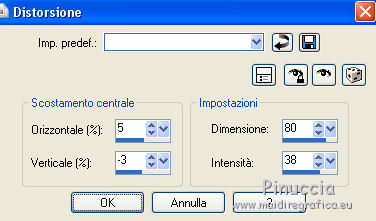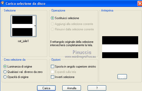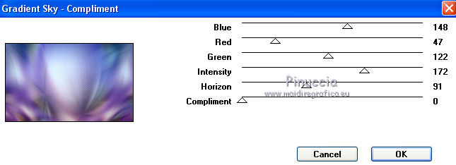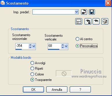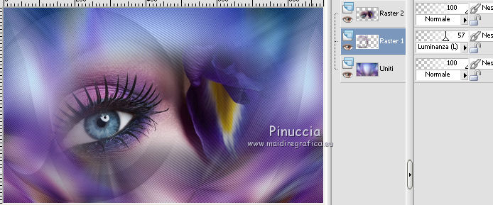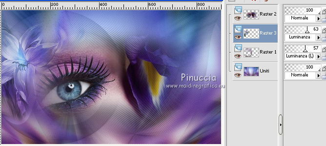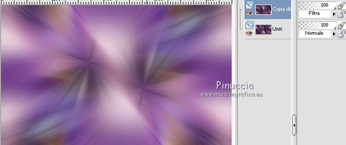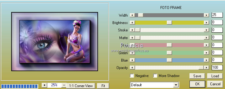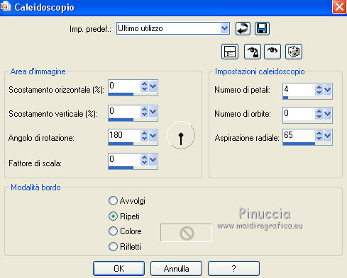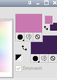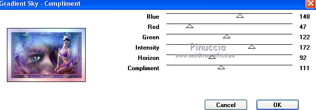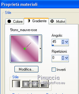 qui puoi trovare qualche risposta ai tuoi dubbi. Se l'argomento che ti interessa non è presente, ti prego di segnalarmelo. Questo tutorial è una creazione di Saturnella e non può essere copiato su altri siti nè essere offerto per il download. Lo stesso vale per la mia traduzione. E' anche proibito togliere il watermark dal materiale; rispettiamo il lavoro dei creatori di tubes, senza i quali non potremmo creare tutorials. Il tutorial è stato scritto con CorelX16, ma può essere eseguito anche con le altre versioni di PSP. Secondo la versione utilizzata (anteriore a PSP X) potresti ottenere dei risultati differenti. Vedi la mia scheda riguardante le funzioni Rifletti>Capovolgi nelle nuove versioni di PSP qui Per tradurre questo tutorial ho usato PSP X. Occorrente: Materiale qui Per i tubes grazie Syl, Lamanouche e Mary. (in questa pagina trovi i links ai loro siti). Filtri in caso di dubbi, ricorda di consultare la mia sezione filtri qui Filters Unlimited 2.0 qui David Blend Filters (Photo Tools) qui Carolaine and Sensibility - CS-DLines qui VanDerLee - Unplugged-X qui Simple - 4way average qui Ap 01 Innovations - Lines SilverLining qui AAA Frames - Foto Frame qui Flaming Pear - Flexify 2 qui I filtri David Blend e Simple si possono usare da soli o importati in Filters Unlimited. come fare vedi qui) Se un filtro fornito appare con questa icona Nel materiale trovi i filtri David Blend in formato .8bf. Dopo averli inseriti nella cartella Percorsi, in PSP li trovi sotto la lettera "P" come "Photo Tools". ![]() non esitare a cambiare modalità di miscelatura e opacità secondo i colori utilizzati. Metti il gradiente nella cartella Gradienti. Metti la selezione nella cartella Selezioni. 1. Imposta il colore di primo piano con #c979af, e il colore di sfondo con il colore #3f1f53. ![]() Passa il colore di primo piano a Gradiente, e seleziona il gradiente 5 tons_mauve_rose, con i seguenti settaggi. ![]() Apri una nuova immagine trasparente 900 x 550 pixels, e riempila con il colore scuro di sfondo.2. Livelli>Nuovo livello raster. Selezione>Seleziona tutto. Apri il tube dell'occhio "Mary 0712-51" e vai a Modifica>Copia. non chiuderlo perchè ti servirà ancora Torna al tuo lavoro e vai a Modifica>Incolla nella selezione. Selezione>Deseleziona. 3. Effetti>Effetti di immagine>Motivo unico, con i settaggi standard. ![]() Livelli>Unisci>Unisci visibile. 4. Regola>Sfocatura>Sfocatura radiale. ![]() 5. Livelli>Duplica. Immagine>Rifletti. Immagine>Capovolgi. Cambia la modalità di miscelatura di questo livello in Filtra (o secondo i tuoi colori). ![]() Livelli>Unisci>Unisci visibile. 6. Livelli>Duplica. Effetti>Effetti geometrici>Prospettiva verticale. ![]() 7. Effetti>Plugins>Carolaine and Sensibility - CS-DLine. ![]() 8. Effetti>Effetti di distorsione>Distorsione. ![]() 9. Effetti>Plugins>VanDerLee - Unplugged-x - Lomo. ![]() 10. Effetti>Plugins>Photo Tools - Gradient sky-Compliment. i filtri David Blend che trovi nel materiale in formato 8bf, una volta inseriti nei Percorsi Files, appaiono come "Photo Tools" ![]() Livelli>Unisci>Unisci visibile. 11. Selezione>Carica/Salva selezione>Carica selezione da disco. Cerca e carica la selezione sat_julie1. ![]() Livelli>Nuovo livello raster. Imposta l'opacità dello strumento Riempimento a 50. ![]() Riempi la selezione con il gradiente.12. Effetti>Plugins>AP01 [Innovations] - Lines SilverLining - Dotty grid. ![]() Selezione>Deseleziona. 13. Effetti>Plugins>Flaming Pear - Flexify 2. ![]() 14. Effetti>Effetti di immagine>Scostamento. ![]() 15. Effetti>Effetti 3D>Sfalsa ombra, con il colore di sfondo. ![]() Cambia la modalità di miscelatura di questo livello in Luminanza (o secondo i tuoi colori) e abbassa l'opacità al 57%. ![]() 16. Attiva nuovamente il tube dell'occhio "Mary 0712-51" e vai a Modifica>Copia. Torna al tuo lavoro e vai a Modifica>Incolla come nuovo livello. Non spostarlo. E' al suo posto. Effetti>Effetti 3D>Sfalsa ombra, colore nero. ![]() 17. Attiva il livello della forma - Raster 1. ![]() Apri il tube di Lamanouche "painted Iris" e vai a Modifica>Copia. Torna al tuo lavoro e vai a Modifica>Incolla come nuovo livello. 18. Effetti>Effetti di immagine>Scostamento. ![]() Cambia la modalità di miscelatura di questo livello in Luminanza (o secondo i tuoi colori), e abbassa l'opacità al 63%. ![]() 19. Attiva il livello superiore. Apri il tube della donna di Syl "SvB(565)Beauty" e vai a Modifica>Copia. Torna al tuo lavoro e vai a Modifica>Incolla come nuovo livello. Immagine>Rifletti. Immagine>Ridimensiona, all'80%, tutti i livelli non selezionato. Regola>Messa a fuoco>Metti a fuoco. Sposta il tube a destra.20. Effetti>Effetti 3D>Sfalsa ombra, colore nero. ![]() 21. Attiva il livello di sfondo e vai a Modifica>Copia. 22. Immagine>Aggiungi bordatura, 1 pixel, simmetriche, con il colore scuro. Immagine>Aggiungi bordatura, 3 pixels, simmetriche, con il colore chiaro. Immagine>Aggiungi bordatura, 1 pixel, simmetriche, con il colore scuro. Immagine>Aggiungi bordatura, 50 pixels, simmetriche, con il colore bianco. 23. Attiva lo strumento Bacchetta magica ![]() e clicca nel bordo bianco per selezionarlo. Modifica>Incolla nella selezione. 24. Effetti>Plugins>Simple - 4 way average. Effetti>Effetti di bordo>Aumenta. Selezione>Innalza selezione a livello. 25. Effetti>Effetti di riflesso>Caleidoscopio. ![]() 26. Mantieni selezionato. Livelli>Unisci>Unisci giù. Selezione>Inverti. 27. Effetti>Effetti 3D>Sfalsa ombra, colore nero. ![]() Selezione>Deseleziona. 28. Immagine>Aggiungi bordatura, 50 pixels, simmetriche, con il colore bianco. Seleziona il bordo con la bacchetta magica ![]() mantieni l'opacità dello strumento Riempimento a 50, e riempi la selezione con il gradiente.30. Effetti>Plugins>Photo Tools - Gradient sky-Compliment. se stai usando altri colori, sperimenta i settaggi delle tre linee superiori ![]() 31. Effetti>Plugins>AAA Frames - Foto Frame. ![]() 32. Selezione>Seleziona tutto. Selezione>Modifica>Contrai - 25 pixels. Selezione>Inverti. 33.