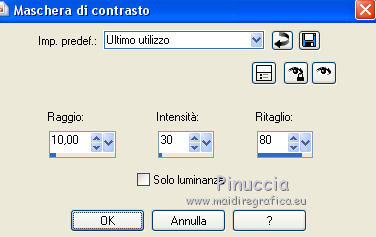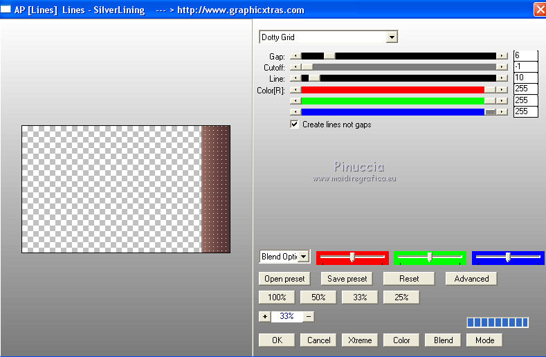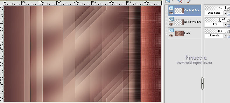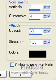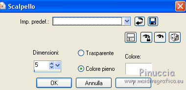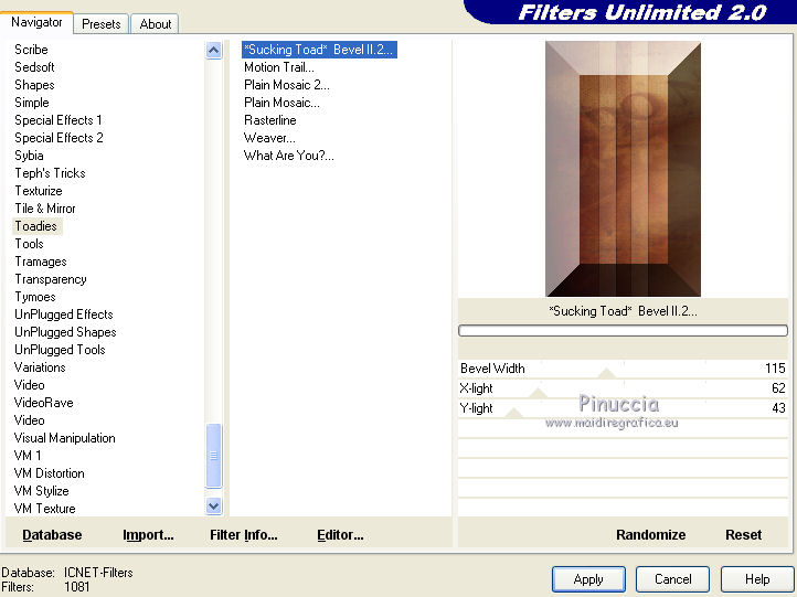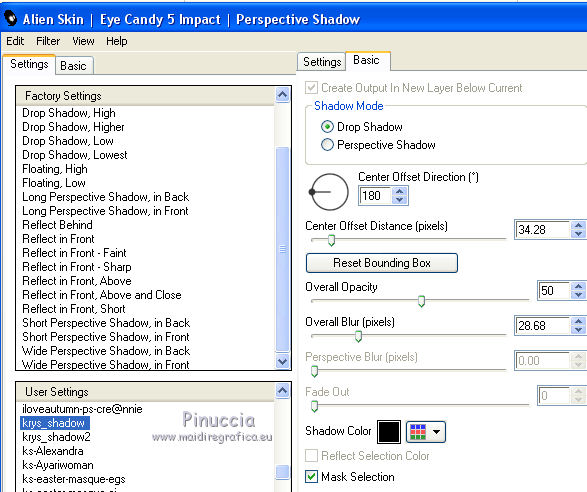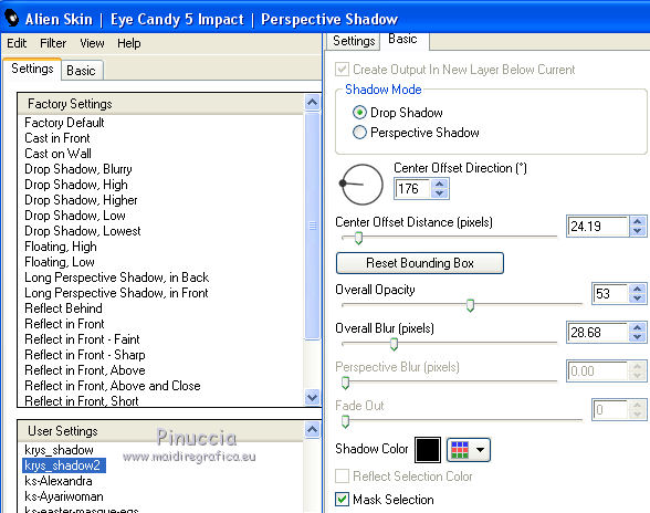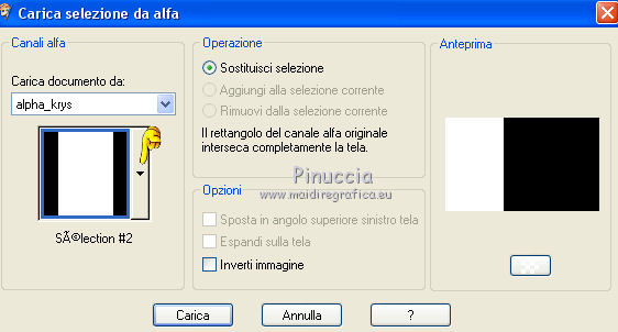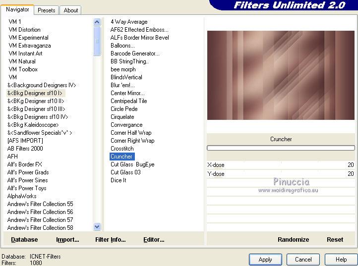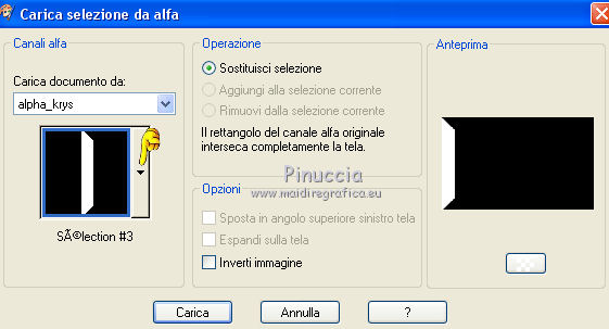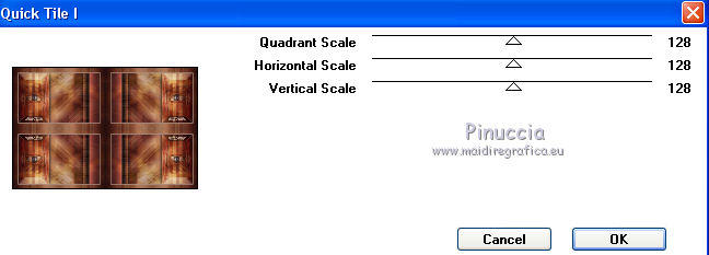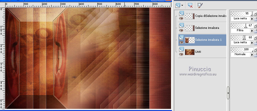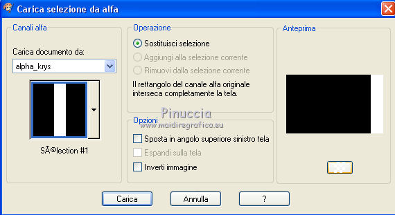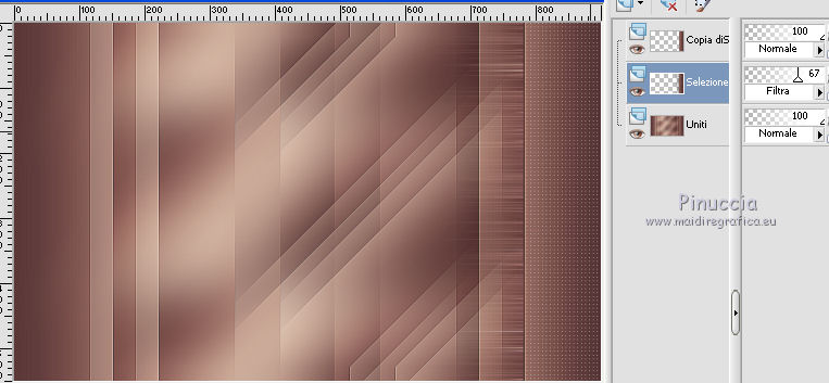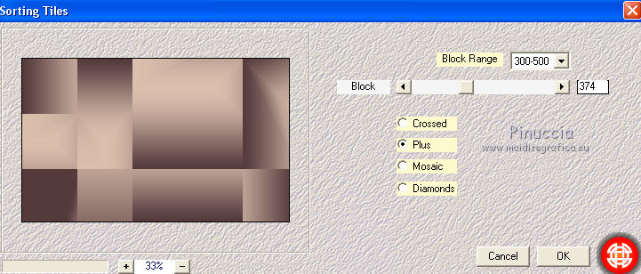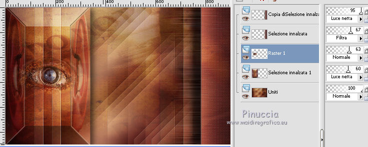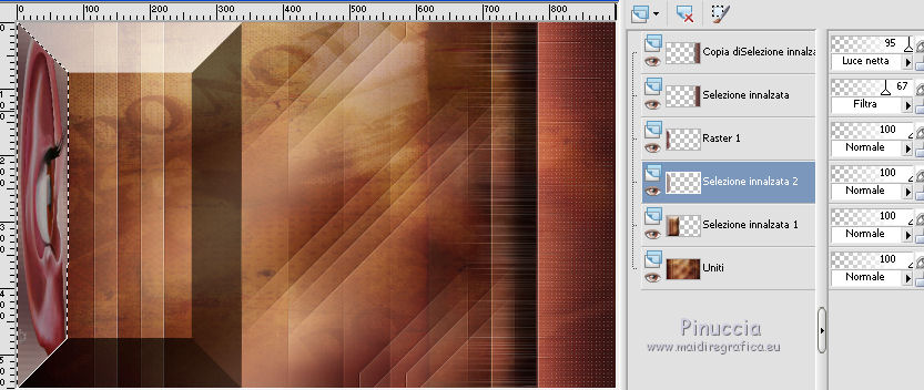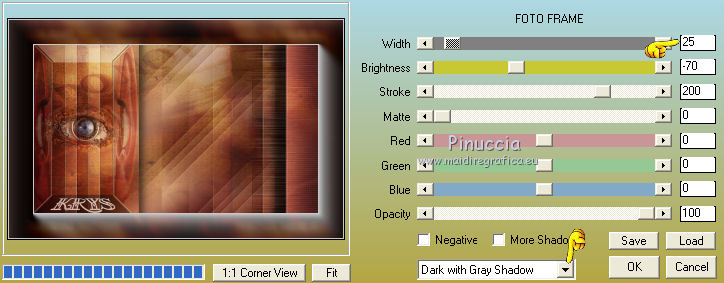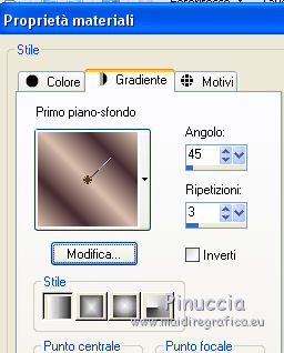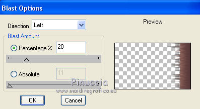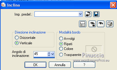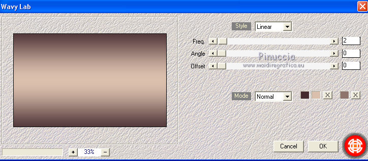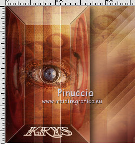 qui puoi trovare qualche risposta ai tuoi dubbi. Se l'argomento che ti interessa non è presente, ti prego di segnalarmelo. Questo tutorial è una creazione di Saturnella e non può essere copiato su altri siti nè essere offerto per il download. Lo stesso vale per la mia traduzione. E' anche proibito togliere il watermark dal materiale; rispettiamo il lavoro dei creatori di tubes, senza i quali non potremmo creare tutorials. Per tradurre questo tutorial, creato con PSP18, ho usato CorelX, ma può essere eseguito anche con le altre versioni di PSP. Dalla versione X4, il comando Immagine>Rifletti è stato sostituito con Immagine>Capovolgi in orizzontale, e il comando Immagine>Capovolgi con Immagine>Capovolgi in verticale. Nelle versioni X5 e X6, le funzioni sono state migliorate rendendo disponibile il menu Oggetti. Nel nuovo X7 sono tornati i comandi Immagine>Rifletti e Immagine>Capovolgi, ma con nuove funzioni. Vedi la scheda sull'argomento qui Occorrente: Materiale qui Grazie per i tubes Krys. (in questa pagina trovi i links ai loro siti). Filtri in caso di dubbi, ricorda di consultare la mia sezione filtri qui Filters Unlimited 2.0 qui &<Bkg Designer sf10I> - Cruncher (da importare in Unlimited) qui Mehdi - Wavy Lab, Sorting Tiles qui Ap [Lines] - Lines SilverLining qui Toadies - Sucking Toad,Bevel II.2 qui DSB Flux - Blast qui Simple - 4 Way Average qui Alien Skin Eye Candy 5 Impact - Perspective Shadow qui Graphics Plus - Quick Tile 1 qui AAA Frames - Foto Frame qui I filtri Graphics Plus, Toadies e Simple si possono usare da soli o importati in Filters Unlimited (come fare vedi qui) Se un filtro fornito appare con questa icona ![]() non esitare a cambiare modalità di miscelatura e opacità secondo i colori utilizzati. Nelle ultime versioni di PSP non c'è il gradiente di primo piano/sfondo (Corel_06_029) Trovi i gradienti delle versioni precedenti qui Metti i preset Cliccando sul file una o due volte (a seconda delle tue impostazioni), automaticamente il preset si installerà nella cartella corretta. perchè uno o due clic vedi qui 1. Imposta il colore di primo piano con #dabfad. e il colore di sfondo con #452a2f. ![]() Passa il colore di primo piano a Gradiente di primo piano/sfondo, stile Lineare. ![]() Apri alpha_krys. Finestra>Duplica o sulla tastiera maiuscola+D per fare una copia. ![]() Chiudi l'originale. La copia, che sarà la base del tuo lavoro, non è vuota, ma contiene le selezioni salvate sul canale alfa. 2. Effetti>Plugins>Mehdi - Wavy Lab. questo filtro lavora con i colori della paletta: il primo è il colore di sfondo, il secondo quello di primo piano, mantieni l'ultimo colore creato dal filtro. ![]() 3. Effetti>Plugins>Mehdi - Sorting Tiles. ![]() 4. Livelli>Duplica. Immagine>Rifletti (con X17 e X18: Immagine>Rifletti>Rifletti orizzontalmente). Cambia la modalità di miscelatura di questo livello in Sovrapponi, o altro, e abbassa l'opacità al 60%. Livelli>Unisci>Unisci giù. Effetti>Effetti di bordo>Aumenta. 5. Livelli>Duplica. Effetti>Effetti geometrici>Inclina. ![]() Livelli>Unisci>Unisci visibile. 6. Effetti>Effetti di immagine>Motivo unico. ![]() 7. Effetti>Plugins>Filters Unlimited 2.0 - &<Bkg Designer sf10I> - ![]() Regola>Messa a fuoco>Accentua messa a fuoco. 8. Selezione>Carica/Salva selezione>Carica selezione da canale alfa. La selezione sélection#1 è subito disponibile. Devi soltanto cliccare Carica. ![]() Selezione>Innalza selezione a livello. Selezione>Deseleziona. 9. Effetti>Plugins>AP [Lines] - Lines SilverLining. ![]() 10. Livelli>Duplica. Attiva il livello sottostante. Effetti>Plugins>Dsb Flux - Blast. ![]() Cambia la modalità di miscelatura di questo livello in Sovrapponi, o altro, e abbassa l'opacità al 67%. ![]() Effetti>Effetti di bordo>Aumenta. 11. Attiva nuovamente il livello superiore. Effetti>Plugins>Alien Skin Eye Candy 5 Impact - Perspective Shadow. Seleziona il preset krys_shadow e ok. Questi i settaggi, in caso di problemi con il preset. ![]() Cambia la modalità di miscelatura di questo livello in Luce netta, o altro, e abbassa l'opacità al 95%. ![]() 12. Attiva il livello di sfondo. Livelli>Nuovo livello raster. Selezione>Seleziona tutto. Apri l'immagine 55.jpg e vai a Modifica>Copia. Torna al tuo lavoro e vai a Modifica>Incolla nella selezione. Cambia la modalità di miscelatura di questo livello in Luce diffusa. Selezione>Deseleziona. Livelli>Unisci>Unisci giù. 13. Selezione>Carica/Salva selezione>Carica selezione da disco. Cerca e carica la selezione sélection#2. ![]() 14. Effetti>Plugins>Filters Unlimited 2.0 - Toadies - Sucking Toad,Bevel2.II. ![]() Selezione>Deseleziona. 15. Selezione>Carica/Salva selezione>Carica selezione da disco. Cerca e carica la selezione sélection#3. ![]() Selezione>Innalza selezione a livello. Mantieni selezionato. 16. Livelli>Nuovo livello raster. Riempi con il gradiente.17. Regola>Sfocatura>Sfocatura gaussiana - raggio 30 ![]() 18. Effetti>Effetti di trama>Veneziana, con il tuo colore scuro. ![]() 19. Apri il tube dell'orecchio di Krys, cancella la firma, e vai a Modifica>Copia. Torna al tuo lavoro e vai a Modifica>Incolla nella selezione. 20. Attiva il livello sottostante. ![]() Effetti>Effetti 3D>Scalpello. ![]() Selezione>Deseleziona. 21. Attiva il livello soprastante. Livelli>Unisci>Unisci giù. 22. Livelli>Duplica. Immagine>Rifletti. 23. Effetti>Effetti di immagine>Scostamento. ![]() Livelli>Unisci>Unisci giù, 2 volte. Cambia la modalità di miscelatura di questo livello in Luce netta, o altro, e abbassa l'opacità al 60%. ![]() 24. Effetti>Plugins>Alien Skin Eye Candy 5 Impact - Perspective Shadow. Seleziona il preset Drop Shadow Blurry e ok. ![]() 25. Attiva il tube dell'occhio di Krys, cancella la firma e vai a Modifica>Copia. Torna al tuo lavoro e vai a Modifica>Incolla come nuovo livello. Immagine>Ridimensiona, al 40%, tutti i livelli non selezionato. Regola>Messa a fuoco>Metti a fuoco. Sposta il tube a sinistra.Per il mio esempio ho abbassato l'opacità al 63%, decidi secondo il tu