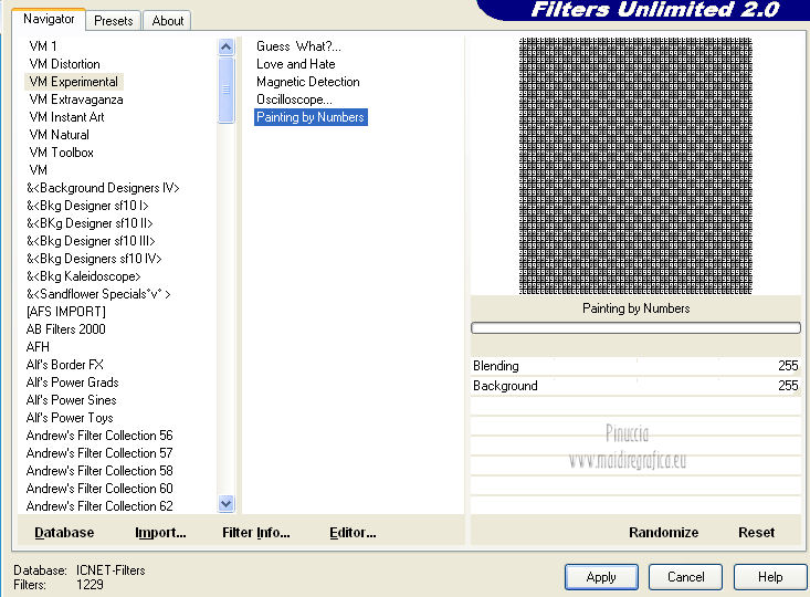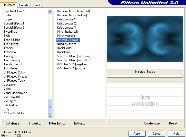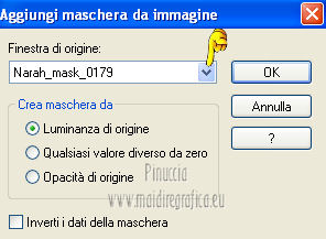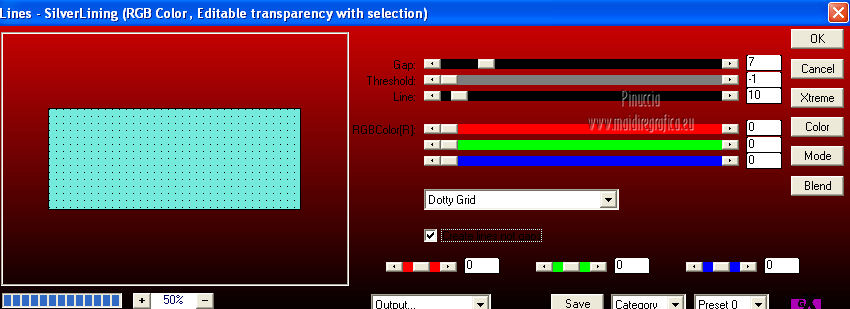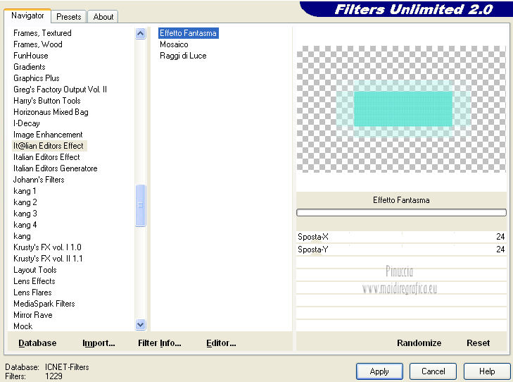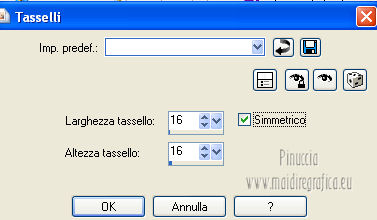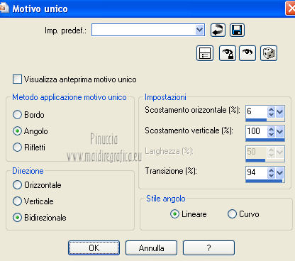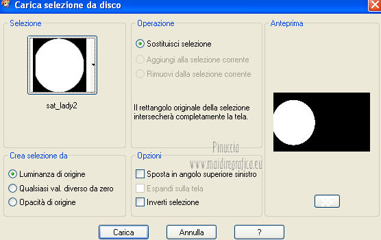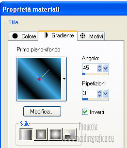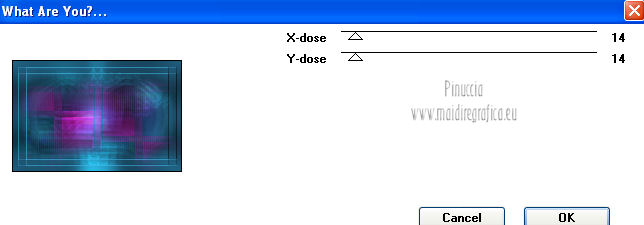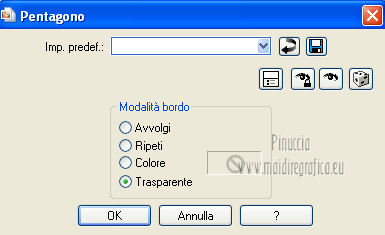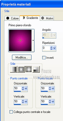 qui puoi trovare qualche risposta ai tuoi dubbi. Se l'argomento che ti interessa non è presente, ti prego di segnalarmelo. Questo tutorial è una creazione di Saturnella e non può essere copiato su altri siti nè essere offerto per il download. Lo stesso vale per la mia traduzione. E' anche proibito togliere il watermark dal materiale; rispettiamo il lavoro dei creatori di tubes, senza i quali non potremmo creare tutorials. Questo tutorial è stato creato con PSP 12, ma può essere eseguito anche con le altre versioni di PSP. Per tradurlo ho usato PSP X. Occorrente: Materiale qui Il tube del paesaggio è di Hanne. Le due maschere sono di Narah. Grazie a tutti per il vostro magnifico lavoro. (in questa pagina trovi i links ai loro siti). Filtri in caso di dubbi, ricorda di consultare la mia sezione filtri qui Filters Unlimited 2.0 qui Simple - Left right wrap (bonus) qui AP 01 Innovations - Lines SilverLining qui Italian Editors - Effetto Fantasma qui VM Experimental qui Toadies - What are you qui i filtri Simple, Italian Editors e Toadies si possono usare da soli o importati in Filters Unlimited. A volte si riscontrano differenze nel risultato tra i diversi usi, ma non ci sono regole codificate. Per questo si possono notare soltanto al momento di usarli. ![]() non esitare a cambiare modalità di miscelatura e opacità secondo i colori utilizzati. Metti le selezioni nella cartella Selezioni. Apri le maschere in PSP e minimizzale con il resto del materiale. 1. Imposta il colore di primo piano con #000000 (nero), e il colore di sfondo con #40aae3. ![]() Passa il colore di primo piano a Gradiente, stile lineare, con i seguenti settaggi. ![]() 2. Apri una nuova immagine trasparente 900 x 550 pixels, e riempila con il gradiente.3. Regola>Sfocatura>Sfocatura radiale. ![]() 4. Effetti>Effetti di distorsione>Tasselli. ![]() 5. Effetti>Effetti di distorsione>Mulinello. ![]() 6. Effetti>Plugins>Filters Unlimited 2.0 - Tile & Mirror - Mirrored & Scaled. ![]() 7. Effetti>Plugins>Simple - Left right wrap. 8. Selezione>Carica/Salva selezione>Carica selezione da disco. Cerca e carica la selezione sat_lady1. ![]() Livelli>Nuovo livello raster. Imposta il colore di primo piano con #73eadb. ![]() Riempi la selezione con il colore di primo piano.9. Effetti>Plugins>AP Innovation - Lines SilverLining. ![]() Selezione>Deseleziona. 10. Effetti>Plugins>Filters Unlimited 2.0 - Effetto Fantasma ![]() Cambia la modalità di miscelatura di qusto livello in Indebolisci, e abbassa l'opacità al 60% (o secondo i tuoi colori). 11. Effetti>Effetti di immagine>Motivo unico. ![]() 12. Effetti>Effetti geometrici>Pentagono. ![]() 13. Effetti>Effetti 3D>Sfalsa ombra. ![]() 14. Imposta il colore di primo piano con #fa14bd, e il colore di sfondo con il colore nero #000000. ![]() Passa il colore di primo piano a Gradiente, stile Sprazzo di luce. ![]() Selezione>Carica/Salva selezione>Carica selezione da disco. Cerca e carica la selezione sat_lady2. ![]() Imposta l'opacità dello strumento Riempimento a 50, e riempi la selezione con il gradiente.15. Livelli>Nuovo livello raster. Effetti>Plugins>Filters Unlimited 2.0 - VM Experimental - Painting by Numbers. ![]() Livelli>Unisci>Unisci giù. Cambia la modalità di miscelatura di questo livello in Luce netta, e abbassa l'opacità al 70%. Selezione>Deseleziona. 16. Livelli>Duplica. Immagine>Rifletti. Livelli>Unisci>Unisci giù. 17. Effetti>Effetti di immagine>Motivo unico. ![]() Cambia la modalità di miscelatura di questo livello in Luce netta, e abbassa l'opacità al 60% (o secondo i tuoi colori). 18. Effetti>Effetti 3D>Sfalsa ombra, con i settaggi precedenti. Effetti>Effetti di immagine>Scostamento. ![]() 19. Attiva il livello di sfondo. Livelli>Nuovo livello raster. Riempi con il colore #fa14bd, opacità 100.![]() 20. Livelli>Nuovo livello maschera>Da immagine. Apri il menu sotto la finestra di origine e vedrai la lista dei files aperti. Seleziona la maschera Narah_mask_0179, con i seguenti settaggi. ![]() Effetti>Effetti di bordo>Aumenta. Livelli>Unisci>Unisci gruppo. 21. Effetti>Effetti 3D>Sfalsa ombra, con i settaggi precedenti. 22. Livelli>Unisci>Unisci giù. 23. Livelli>Nuovo livello raster. Riempi con il colore #73eadb.![]() 24. Livelli>Nuovo livello maschera>Da immagine. Apri il menu sotto la finestra di origine, e seleziona la maschera Narah_Abstract012. ![]() Livelli>Unisci>Unisci gruppo. Cambia la modalità di miscelatura di questo livello in Indebolisci (o secondo i tuoi colori). Livelli>Unisci>Unisci tutto. Modifica>Copia. 25. Immagine>Aggiungi bordatura, 2 pixels, simmetriche, con il colore #40aae3. Immagine>Aggiungi bordatura, 2 pixels, simmetriche, con il colore nero #000000. Aggiungi bordatura, 2 pixels, simmetriche, con il colore #40aae3. Immagine>Aggiungi bordatura, 50 pixels, simmetriche, con il colore bianco #ffffff. 26. Seleziona il bordo bianco con la bacchetta magica ![]() Modifica>Incolla nella selezione. 27. Regola>Sfocatura>Sfocatura gaussiana - raggio 20. ![]() 28. Effetti>Plugins>Toadies - What are you. ![]() Ripeti l'Effetto Toadies, con i settaggi standard. ![]() Effetti>Effetti di bordo>Aumenta. 29. Selezione>Inverti. Effetti>Effetti 3D>Sfalsa ombra. ![]() Selezione>Deseleziona. 30. Apri il tube di Hanne e vai a Modifica>Copia. Torna al tuo lavoro e vai a Modifica>Incolla come nuovo livello. Immagine>Rifletti. Sposta il tube a sinistra.31. Effetti>Effetti 3D>Sfalsa ombra. ![]() 32. Apri il wordart e vai a Modifica>Copia. Torna al tuo lavoro e vai a Modifica>Incolla come nuovo livello. Immagine>Ridimensiona, all'80%, tutti i livelli non selezionato. Spostalo dove preferisci, o vedi il mio esempio.33. Effetti>Effetti 3D>Sfalsa ombra. ![]() 34. Aggiungi il tuo nome e/o il tuo watermark su un nuovo livello. 35. Immagine>Aggiungi bordatura, 2 pixels, simmetriche, con il colore nero. 36. Immagine>Ridimensiona, a 900 pixels di larghezza, tutti i livelli selezionato. Regola>Messa a fuoco>Metti a fuoco. Salva in formato jpg. Per questo esempio ho usato un 