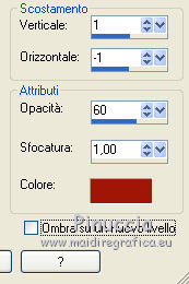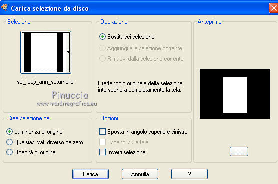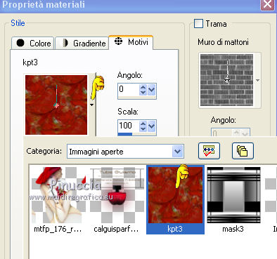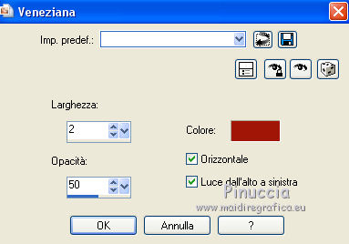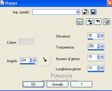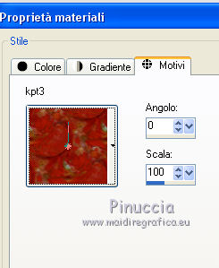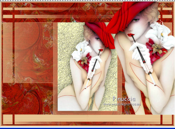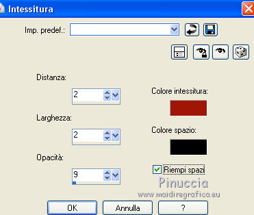 qui puoi trovare qualche risposta ai tuoi dubbi. Se l'argomento che ti interessa non è presente, ti prego di segnalarmelo. Questo tutorial è una creazione di Saturnella e non può essere copiato su altri siti nè essere offerto per il download. Lo stesso vale per la mia traduzione. E' anche proibito togliere il watermark dal materiale; rispettiamo il lavoro dei creatori di tubes, senza i quali non potremmo creare tutorials. Per tradurre questo tutorial ho usato CorelX, ma può essere eseguito anche con le altre versioni di PSP. Dalla versione X4, il comando Immagine>Rifletti è stato sostituito con Immagine>Capovolgi in orizzontale, e il comando Immagine>Capovolgi con Immagine>Capovolgi in verticale. Nelle versioni X5 e X6, le funzioni sono state migliorate rendendo disponibile il menu Oggetti. Vedi la scheda sull'argomento qui Occorrente: Materiale qui ![]() non esitare a cambiare modalità di miscelatura e opacità secondo i colori utilizzati. Metti la selezione nella cartella Selezioni. Apri la maschera e il motivo in PSP e minimizzali con il resto del materiale. Imposta il colore di primo piano con #a11608, e il colore di sfondo con #ffffc0. ![]() Passa il colore di primo piano a Motivi, apri il menu dei motivi e cerca, nella categoria Immagini aperte, il motivo kpt3, ![]() seleziona il motivo con i seguenti settaggi. ![]() 1. Apri una nuova immagine trasparente 700 x 500 pixels, e riempila con il motivo di primo piano.2. Livelli>Nuovo livello raster. Riempi con il colore di sfondo.3. Livelli>Nuovo livello maschera>Da immagine. Apri il menu sotto la finestra di origine e vedrai la lista dei files aperti. Seleziona la maschera "3", con i seguenti settaggi. ![]() Regola>Messa a fuoco>Accentua messa a fuoco. Livelli>Unisci>Unisci gruppo. Effetti>Effetti 3D>Sfalsa ombra, con il colore rosso. ![]() 4. Selezione>Carica/Salva selezione>Carica selezione da disco. Cerca e carica la selezione sel_lady_ann_saturnella. ![]() 5. Livelli>Nuovo livello raster. Riempi con il colore di sfondo.6. Effetti>Effetti di trama>Nappa (il colore grigio è il colore standard di questo effetto). ![]() 7. Livelli>Nuovo livello raster. Apri il tube del personaggio mtfp 176_red_hat. Immagine>Rifletti. Modifica>Copia. Torna al tuo lavoro e vai a Modifica>Incolla nella selezione. Selezione>Deseleziona. 8. Effetti>Effetti 3D>Sfalsa ombra, colore nero. ![]() 9. Livelli>Unisci>Unisci giù. 10. Attiva il livello della maschera. Effetti>Effetti di trama>Veneziana, colore rosso. ![]() 11. Attiva nuovamente il livello superiore. Modifica>Incolla come nuovo livello (il tube del personaggio è ancora in memoria). Immagine>Rifletti. Immagine>Ridimensiona, al 70%, tutti i livelli non selezionato. Spostalo a destra, come nel mio esempio.![]() Regola>Messa a fuoco>Metti a fuoco. 12. Livelli>Duplica. Immagine>Rifletti. Cambia la modalità di miscelatura di questo livello in Luce diffusa, e abbassa l'opacità all'80%. 13. Attiva il livello del tube di destra. Effetti>Effetti 3D>Sfalsa ombra, con i settaggi precedenti. 14. Apri il tube del profumo e vai a Modifica>Copia. Torna al tuo lavoro e vai a Modifica>Incolla come nuovo livello. Immagine>Ridimensiona, al 75%, tutti i livelli non selezionato. Spostalo in basso a sinistra.15. Livelli>Unisci>Unisci tutto. 16. Immagine>Aggiungi bordatura, 2 pixels, simmetriche, con il colore rosso. 17. Livelli>Innalza livello di sfondo. Immagine>Ridimensiona, al 90%, tutti i livelli non selezionato. 18. Livelli>Nuovo livello raster. Livelli>Disponi>Porta sotto. 19. Riempi il livello con il motivo di primo piano.Regola>Sfocatura>Sfocatura gaussiana - raggio 25. ![]() 20. Effetti>Effetti di trama>Intessitura. Colore intessitura rosso Colore spazio nero. ![]() 21. Attiva il livello superiore. Effetti>Effetti 3D>Sfalsa ombra. ![]() Ripeti l'Effetto Sfalsa ombra, cambiando verticale e orizzontale con -10. 22. Attiva lo strumento Testo ![]() con un font a scelta, scrivi il tuo testo. Livelli>Converti in livello raster. 23. Immagine>Ruota per gradi - 15 gradi a sinistra. ![]() 24. Immagine>Aggiungi bordatura, 2 pixels, simmetriche, con il colore giallo. 25. Firma il tuo lavoro su un nuovo livello. Livelli>Unisci>Unisci tutto. Immagine>Ridimensiona, a 700 pixels di larghezza, tutti i livelli selezionato. Regola>Messa a fuoco>Metti a fuoco. Salva in formato jpg. ![]() Le vostre versioni. Grazie ![]() Lina ![]() Se hai problemi o dubbi, o trovi un link non funzionante, o anche soltanto per dirmi che ti è piaciuto, scrivimi. 18 Giugno 2014 |