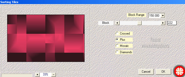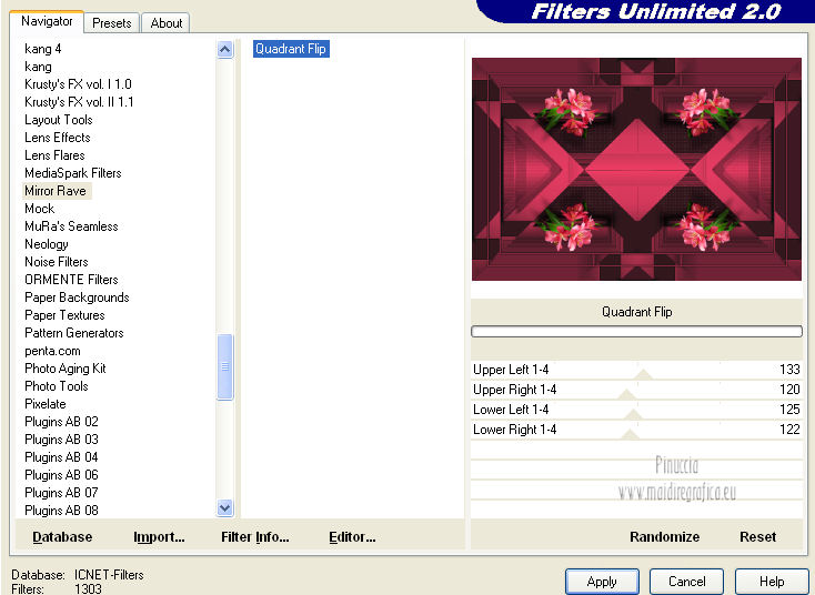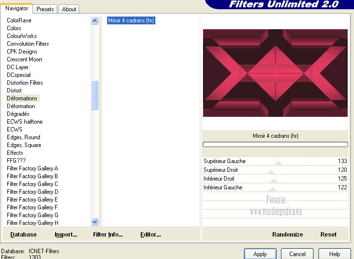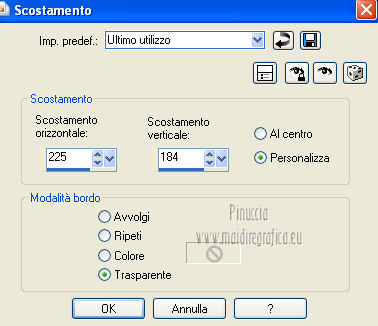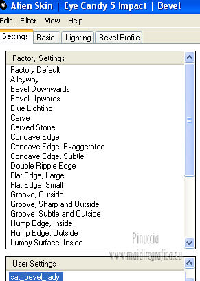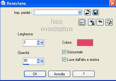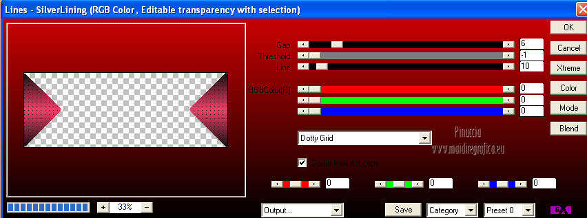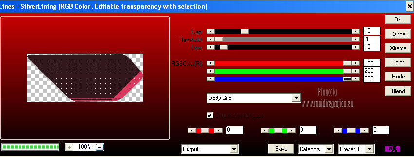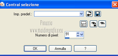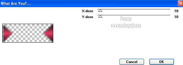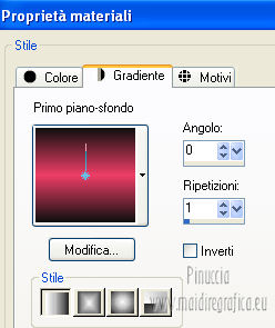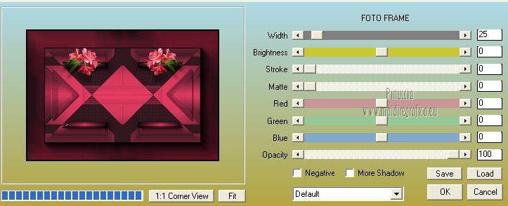 qui puoi trovare qualche risposta ai tuoi dubbi. Se l'argomento che ti interessa non è presente, ti prego di segnalarmelo. Questo tutorial è una creazione di Saturnella e non può essere copiato su altri siti nè essere offerto per il download. Lo stesso vale per la mia traduzione. E' anche proibito togliere il watermark dal materiale; rispettiamo il lavoro dei creatori di tubes, senza i quali non potremmo creare tutorials. Questo tutorial è stato creato con PSP 15, ma può essere eseguito anche con le altre versioni di PSP. Per tradurlo ho usato PSP X. Occorrente: Materiale qui Il tube del personaggio è di Querida. Il tube dei fiori è di FBR. Grazie a tutti per il vostro magnifico lavoro. (in questa pagina trovi i links ai loro siti). Filtri in caso di dubbi, ricorda di consultare la mia sezione filtri qui Filters Unlimited 2.0 qui Mehdi - Sorting Tile qui Deformations - Miroir 4 cadrans (da importare in Unlimited) (nel materiale) Mirror Rave - Quadrant Flip qui AP 01 Innovations - Lines SilverLining qui Toadies - What are you qui AAA Frames - Foto Frame qui Nik Software - Color Efex Pro qui Alien Skin Eye Candy 5 Impact - Bevel, Perspective Shadow qui Simple - Blintz, Pizza slice mirror qui ![]() non esitare a cambiare modalità di miscelatura e opacità secondo i colori utilizzati. Metti il preset nella cartella del filtro Alien Skin Eye Candy 5 Impact>Settings>Bevel. Cliccando sul file una o due volte (a seconda delle tue impostazioni), automaticamente il preset si installerà nella cartella corretta. Metti le selezioni nella cartella Selezioni. 1. Imposta il colore di primo piano con il colore scuro #111111, e il colore di sfondo con il colore chiaro #ef3e66. ![]() Passa il colore di primo piano a Gradiente, stile lineare ![]() Apri una nuova immagine trasparente 900 x 550 pixels, e riempila con il gradiente.2. Effetti>Effetti di trama>Trama - con il colore chiaro. ![]() 3. Effetti>Plugins>Mehdi - Sorting Tile. ![]() Effetti>Effetti di bordo>Aumenta. 4. Effetti>Plugins>Simple - Blintz. 5. Effetti>Plugins>Simple - Pizza slice mirror. 6. Effetti>Plugins>Filters Unlimited 2.0 - Deformation - Miroir 4 cadrans, con i settaggi standard. ![]() 7. Selezione>Carica/Salva selezione>Carica selezione da disco. Cerca e carica la selezione sat_lady1. ![]() Selezione>Innalza selezione a livello. 8. Riempi con il gradiente.Effetti>Plugins>AP 01 Innovations - Lines SilverLining. ![]() 9. Effetti>Plugins>Toadies - What are you. ![]() 10. Effetti>Effetti 3D>Sfalsa ombra. ![]() Selezione>Deseleziona. Livelli>Unisci>Unisci giù. 11. Livelli>Duplica. Immagine>Ridimensiona, al 90%, tutti i livelli non selezionato. 12. Effetti>Effetti 3D>Sfalsa ombra. ![]() Ripeti l'Effetto Sfalsa ombra, cambiando verticale e orizzontale con -3. 13. Attiva il livello di sfondo. Modifica>Copia. Modifica>Incolla come nuova immagine, minimizza questa immagine che ti servirà per i bordi, e torna al tuo lavoro originale. 14. Livelli>Unisci>Unisci visibile. 15. Selezione>Carica/Salva selezione>Carica selezione da disco. Cerca e carica la selezione sat_lady2. ![]() Livelli>Nuovo livello raster. Cambia i settaggi del gradiente. ![]() Riempi il livello con il gradiente.Selezione>Deseleziona. 16. Livelli>Duplica. Immagine>Rifletti. Livelli>Unisci>Unisci giù. 17. Livelli>Duplica. Immagine>Capovolgi. Livelli>Unisci>Unisci giù. 18. Effetti>Plugins>Alien Skin Eye Candy 5 Impact - Bevel seleziona il preset sat_bevel_lady e ok. ![]() 19. Effetti>Plugins>Alien Skin Eye Candy 5 Impact - Perspective Shadow. Seleziona il preset Drop Shadow Blurry e ok. ![]() 20. Attiva il livello di sfondo. Selezione>Carica/Salva selezione>Carica selezione da disco. Cerca e carica la selezione sat_lady3. ![]() Selezione>Innalza selezione a livello. 21. Effetti>Plugins>AP 01 Innovations - Lines SilverLining. ![]() Se i tuoi colori sono chiari imposta i valori RGB a 0, in modo che i punti siano visibili. Selezione>Deseleziona. 22. Livelli>Duplica. Immagine>Rifletti. Livelli>Unisci>Unisci giù. 23. Livelli>Duplica. Immagine>Capovolgi. Livelli>Unisci>Unisci giù. 24. Livelli>Unisci>Unisci visibile. 25. Apri il tube dei fiori e vai a Modifica>Copia. Torna al tuo lavoro e vai a Modifica>Incolla come nuovo livello. Immagine>Ridimensiona, al 30%, tutti i livelli non selezionato. 26. Effetti>Effetti di immagine>Scostamento. ![]() Regola>Messa a fuoco>Metti a fuoco. 27. Effetti>Effetti 3D>Sfalsa ombra. ![]() 28. Livelli>Duplica. Immagine>Rifletti. 29. Immagine>Aggiungi bordatura, 2 pixels, simmetriche, con il colore scuro. Immagine>Aggiungi bordatura, 2 pixels, simmetriche, con il colore chiaro. Immagine>Aggiungi bordatura, 2 pixels, simmetriche, con il colore scuro. Immagine>Aggiungi bordatura, 35 pixels, simmetriche, con il colore bianco. Immagine>Aggiungi bordatura, 2 pixels, simmetriche, con il colore scuro. Immagine>Aggiungi bordatura, 2 pixels, simmetriche, con il colore chiaro. Immagine>Aggiungi bordatura, 2 pixels, simmetriche, con il colore scuro. Immagine>Aggiungi bordatura, 50 pixels, simmetriche, con il colore bianco. 30. Seleziona i bordi bianchi con la bacchetta magica ![]() 31. Attiva l'immagine che hai messo da parte al punto 13. Modifica>Copia. Torna al tuo lavoro e vai a Modifica>Incolla nella selezione. 32. Effetti>Plugins>Simple - Pizza slice mirror. 33. Effetti>Plugins>Filters Unlimited 2.0 - Mirror Rave - Quadrant Flip. ![]() 34. Effetti>Plugins>Toadies - What are you, con i settaggi standard. ![]() Effetti>Effetti di bordo>Aumenta. Selezione>Deseleziona. 35. Selezione>Seleziona tutto. Selezione>Modifica>Contrai - 91 pixels. ![]() Effetti>Effetti 3D>Sfalsa ombra. ![]() 36. Selezione>Inverti. Effetti>Plugins>AAA Frame - Foto Frame. ![]() Ripeti l'Effetto una seconda volta. 37. Apri il tube della donna di Querida e vai a Modifica>Copia. Torna al tuo lavoro e vai a Modifica>Incolla come nuovo livello. Posiziona correttamente il tube.38. Effetti>Plugins>Alien Skin Eye Candy 5 Impact - Perspective Shadow. Seleziona il preset Drop Shadow Blurry 