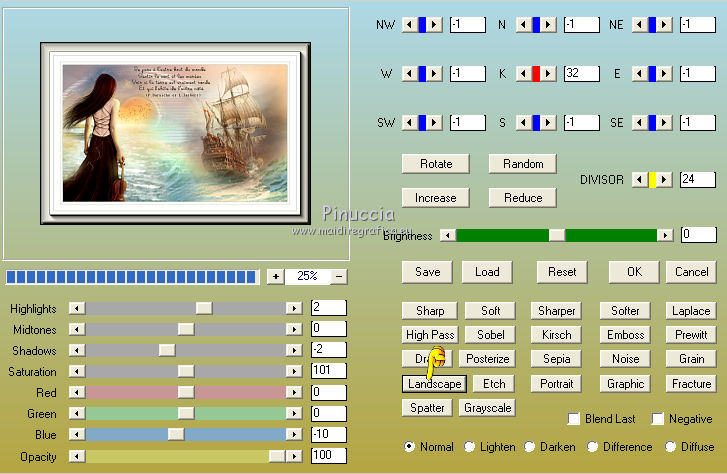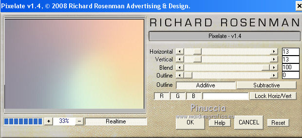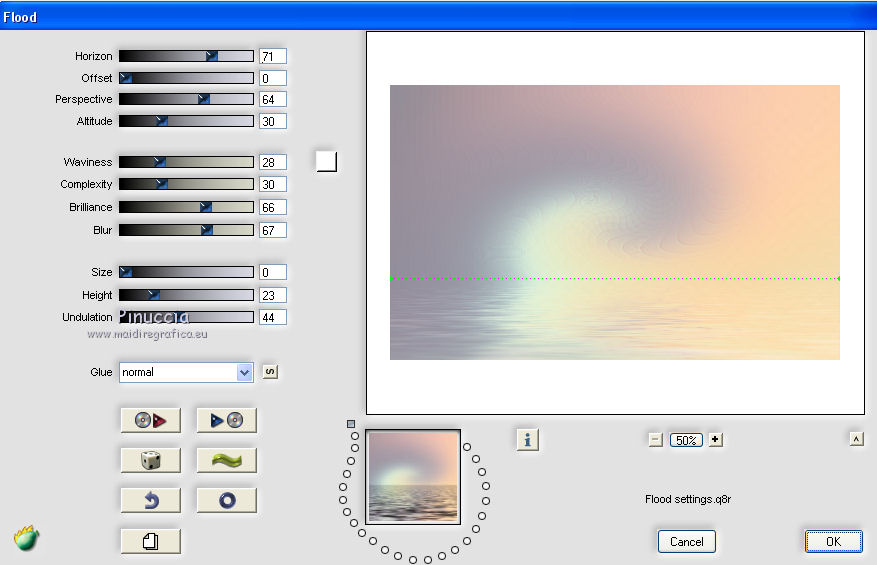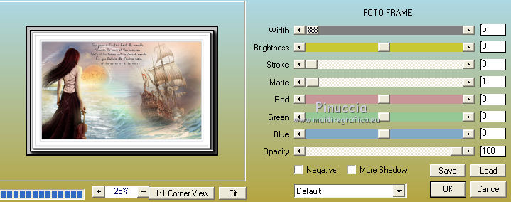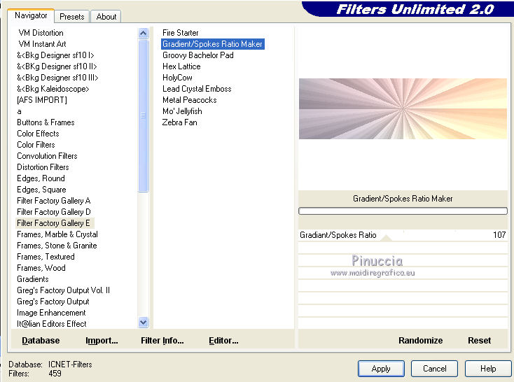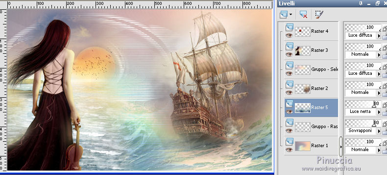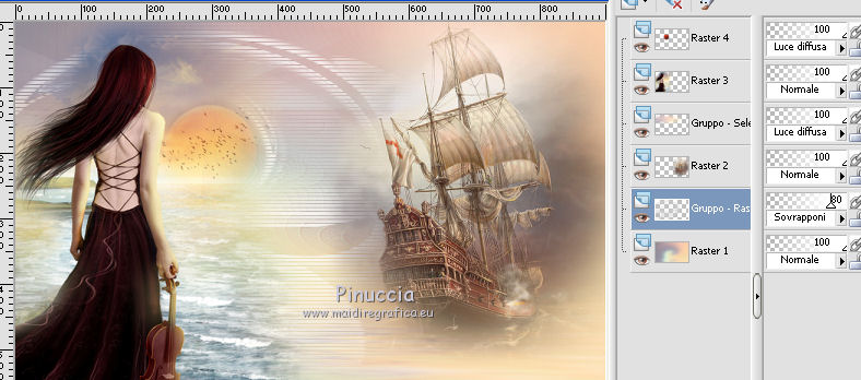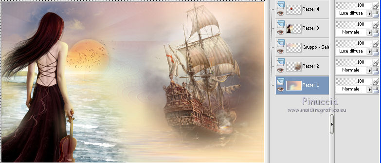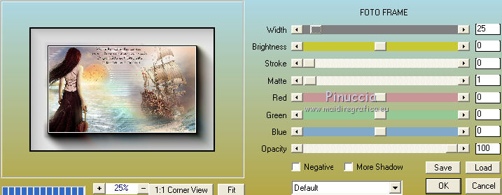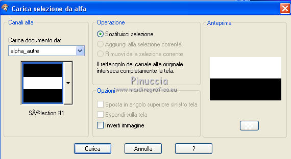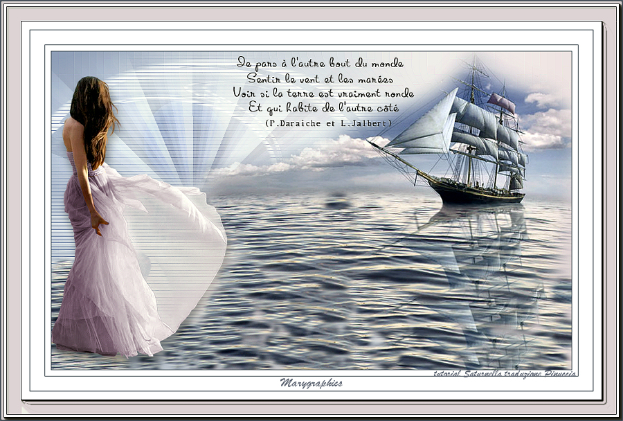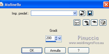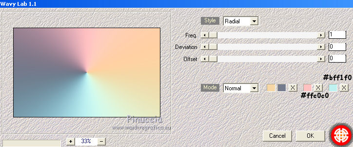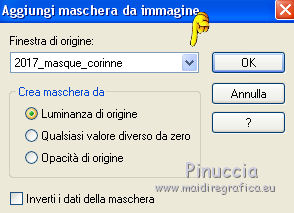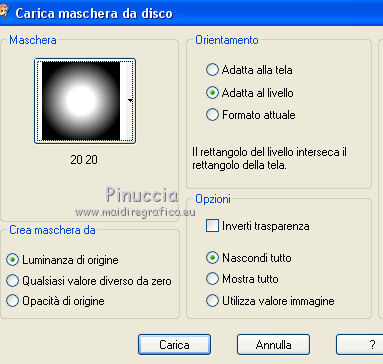 qui puoi trovare qualche risposta ai tuoi dubbi. Se l'argomento che ti interessa non è presente, ti prego di segnalarmelo. Questo tutorial è una creazione di Saturnella e non può essere copiato su altri siti nè essere offerto per il download. Lo stesso vale per la mia traduzione. E' anche proibito togliere il watermark dal materiale; rispettiamo il lavoro dei creatori di tubes, senza i quali non potremmo creare tutorials. Per tradurre questo tutorial, creato con PSP19, ho usato CorelX, ma può essere eseguito anche con le altre versioni di PSP. Dalla versione X4, il comando Immagine>Rifletti è stato sostituito con Immagine>Capovolgi in orizzontale, e il comando Immagine>Capovolgi con Immagine>Capovolgi in verticale. Nelle versioni X5 e X6, le funzioni sono state migliorate rendendo disponibile il menu Oggetti. Nel nuovo X7 sono tornati i comandi Immagine>Rifletti e Immagine>Capovolgi, ma con nuove funzioni. Vedi la scheda sull'argomento qui Occorrente: Materiale qui Grazie: per i tubes Tyna Raegen, A PSP Devil e Nikita. per la maschera Corinne Vicaire, Il resto del materiale è di Saturnella. (in questa pagina trovi i links ai loro siti). Filtri in caso di dubbi, ricorda di consultare la mia sezione filtri qui Filters Unlimited 2.0 qui Mehdi - Wavy Lab 1.1 qui Filter Factory Gallery E - Gradient spoke radio maker qui Richard Rosenman - Pixelate qui Flaming Pear - Flood qui AAA Frames - Foto Frame/AAA Filter - Custom qui Ap Lines - Lines SilverLining qui I filtri Factory Gallery si possono usare da soli o importati in Filters Unlimited (come fare vedi qui) Se un filtro fornito appare con questa icona ![]() non esitare a cambiare modalità di miscelatura e opacità secondo i colori utilizzati. Metti la maschera 20-20 nella cartella Maschere. Apri la maschera di Corinne in PSP e minimizzala con il resto del materiale. Colori utilizzati ![]() 1. Imposta il colore di primo piano con il colore scuro #737b8c e il colore di sfondo con il colore chiaro #f7d6a5. ![]() Apri alpha_autre. Finestra>Duplica o sulla tastiera maiuscola+D per fare una copia. ![]() Chiudi l'originale. La copia, che sarà la base del tuo lavoro, non è vuota, ma contiene una selezione salvata sul canale alfa. 2. Effetti>Plugins>Mehdi - Wavy Lab 1.1 questo filtro lavora con i colori della paletta: il primo è il colore di sfondo, il secondo quello di primo piano; cambia il terzo colore con #ffc0c0 e il quarto colore con #bff1f0. ![]() 3. Regola>Sfocatura>Sfocatura radiale. ![]() 4. Selezione>Carica/Salva selezione>Carica selezione da canale alpha. La selezione sélection#1 è subito disponibile. Devi soltanto cliccare Carica. ![]() Selezione>Innalza selezione a livello. Selezione>Deseleziona. Effetti>Plugins>Filters Unlimited 2.0 - Filter Factory Gallery E - Gradient Spoke Ratio maker, con i settaggi standard. ![]() 5. Livelli>Carica/Salva maschera>Carica maschera da disco. Cerca e carica la maschera 20-20. ![]() Livelli>Unisci>Unisci gruppo. 6. Effetti>Effetti di immagine>Scostamento. ![]() Cambia la modalità di miscelatura di questo livello in Luce diffusa o altro. 7. Attiva il livello di sfondo. Regola>Sfocatura>Sfocatura gaussiana - raggio 30. ![]() 8. Effetti>Plugins>Richard Rosenman - Pixelate. Effetti>Effetti di bordo>Aumenta di più. 9. Effetti>Effetti di distorsione>Mulinello. ![]() 10. Effetti>Plugins>Flaming Pear - Flood, colore bianco ![]() 11. Apri il tube della nave di Tyna Raegen, e vai a Modifica>Copia. Torna al tuo lavoro e vai a Modifica>Incolla come nuovo livello. Immagine>Ridimensiona, al 75%, tutti i livelli non selezionato. Regola>Messa a fuoco>Metti a fuoco. Posiziona correttamente il tube.12. Apri il tube della donna di A PSP Devil, e vai a Modifica>Copia. Torna al tuo lavoro e vai a Modifica>Incolla come nuovo livello. Posiziona correttamente il tube.Livelli>Disponi>Porta in alto. 13. Apri il tube del pianeta di Nikita e vai a Modifica>Copia. Torna al tuo lavoro e vai a Modifica>Incolla come nuovo livello. Immagine>Ridimensiona, al 50%, tutti i livelli non selezionato. Posiziona correttamente il tube.Cambia la modalità di miscelatura di questo livello in Luce diffusa. 14. Attiva il livello di sfondo. ![]() Imposta il colore di primo piano con il colore bianco #ffffff. Livelli>Nuovo livello raster. Riempi il livello con il colore bianco.Livelli>Nuovo livello maschera>Da immagine. Apri il menu sotto la finestra di origine e vedrai la lista dei files aperti. Seleziona la maschera 2017_masque_corinne. ![]() Regola>Messa a fuoco>Accentua messa a fuoco. Livelli>Unisci>Unisci gruppo. 15. Effetti>Effetti di immagine>Scostamento, con i settaggi precedenti. ![]() 16. Effetti>Plugins>AP Lines - Lines SilverLining. ![]() Cambia la modalità di miscelatura di questo livello in Sovrapponi e abbassa l'opacità all'80%. ![]() 17. Apri il tube "wave" e vai a Modifica>Copia. Torna al tuo lavoro e vai a Modifica>Incolla come nuovo livello. Spostalo in basso a destra.18. Effetti>Effetti di immagine>Motivo unico. ![]() Immagine>Rifletti. Cambia la modalità di miscelatura di questo livello in Luce netta e abbassa l'opacità all'80%. ![]() 19. Attiva il livello superiore. Apri il tube "texte" e vai a Modifica>Copia. Torna al tuo lavoro e vai a Modifica>Incolla come nuovo livello. Posiziona correttamente il testo in alto al centro.20. Effetti>Effetti 3D>Sfalsa ombra, colore bianco. ![]() 21. Immagine>Aggiungi bordatura, 1 pixel, simmetriche, colore scuro. Immagine>Aggiungi bordatura, 10 pixels, simmetriche, colore bianco. Immagine>Aggiungi bordatura, 1 pixel, simmetriche, colore scuro. Immagine>Aggiungi bordatura, 25 pixels, simmetriche, colore bianco. Immagine>Aggiungi bordatura, 1 pixel, simmetriche, colore scuro. Immagine>Aggiungi bordatura, 50 pixels, simmetriche, colore bianco. 22. Attiva lo strumento Bacchetta magica ![]() e clicca nel bordo bianco di 50 pixels per selezionarlo. Selezione>Modifica>Contrai - 10 pixels. ![]() 23. Effetti>Plugins>AAA Frames - Foto Frame. ![]() Selezione>Deseleziona. Ripeti Effett