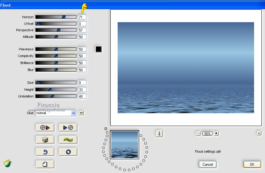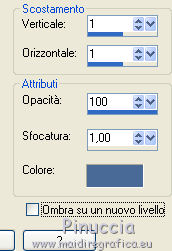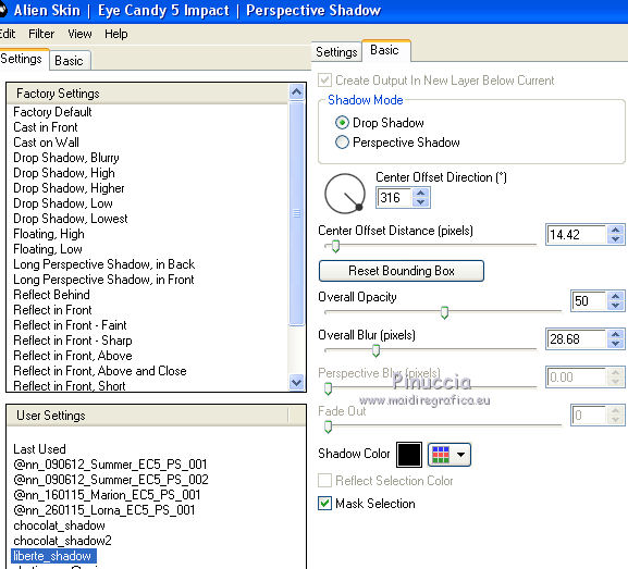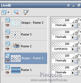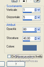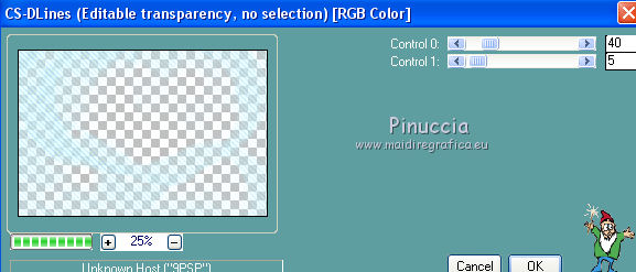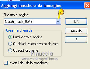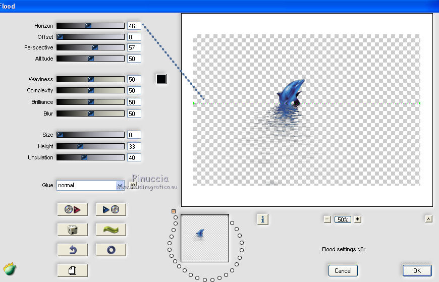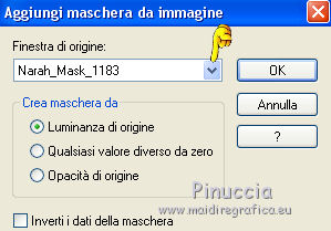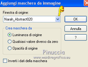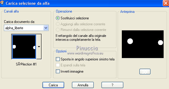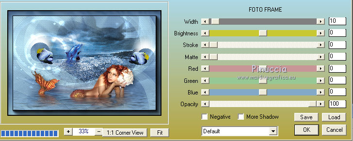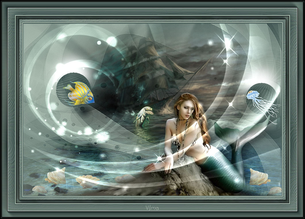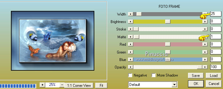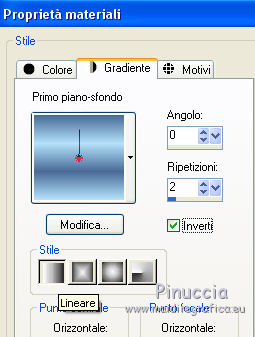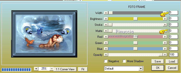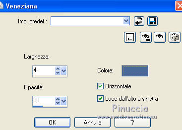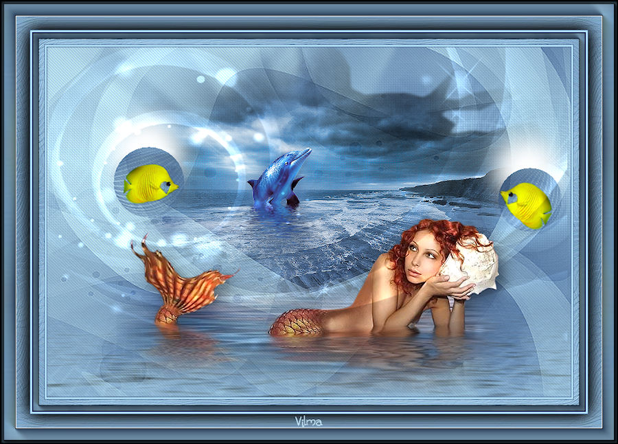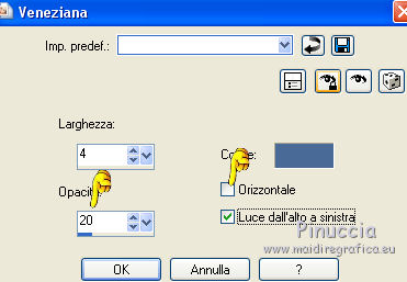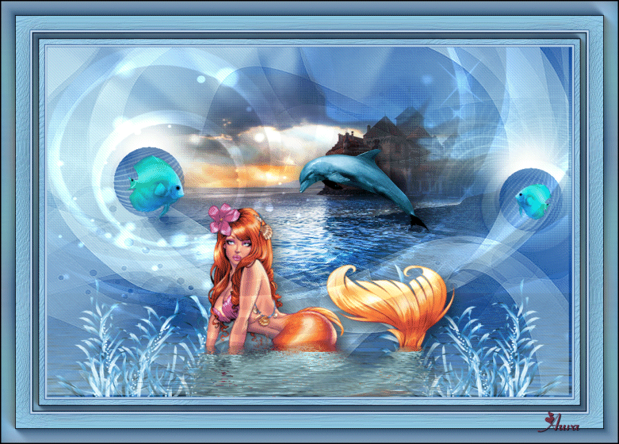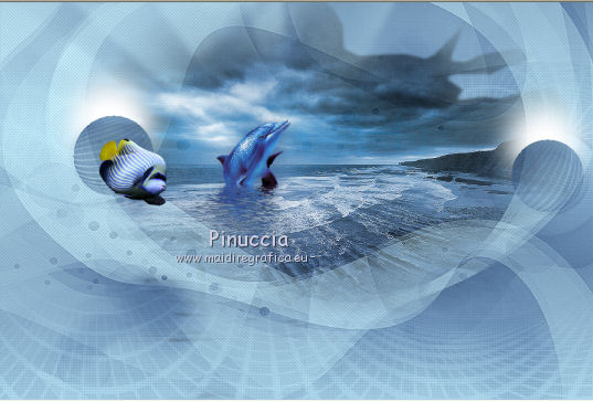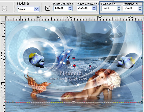 qui puoi trovare qualche risposta ai tuoi dubbi. Se l'argomento che ti interessa non è presente, ti prego di segnalarmelo. Questo tutorial è una creazione di Saturnella e non può essere copiato su altri siti nè essere offerto per il download. Lo stesso vale per la mia traduzione. E' anche proibito togliere il watermark dal materiale; rispettiamo il lavoro dei creatori di tubes, senza i quali non potremmo creare tutorials. Per tradurre questo tutorial, creato con Corel2018, ho usato CorelX, ma può essere eseguito anche con le altre versioni di PSP. Dalla versione X4, il comando Immagine>Rifletti è stato sostituito con Immagine>Capovolgi in orizzontale, e il comando Immagine>Capovolgi con Immagine>Capovolgi in verticale. Nelle versioni X5 e X6, le funzioni sono state migliorate rendendo disponibile il menu Oggetti. Nel nuovo X7 sono tornati i comandi Immagine>Rifletti e Immagine>Capovolgi, ma con nuove funzioni. Vedi la scheda sull'argomento qui Occorrente: Materiale qui Grazie Nurso, Gerry e Guismo per i tubes, Narah per le maschere. (in questa pagina trovi i links ai loro siti). Filtri in caso di dubbi, ricorda di consultare la mia sezione filtri qui Carolaine and Sensibility - CS-DLines qui Alien Skin Eye Candy 5 Impact - Perspective Shadow qui Flaming Pear - Flood qui AAA Frames - Foto Frame qui ![]() non esitare a cambiare modalità di miscelatura e opacità secondo i colori utilizzati. Nelle ultime versioni di PSP non c'è il gradiente di primo piano/sfondo (Corel_06_029) Puoi usare i gradienti delle versioni precedenti. Trovi qui i gradienti Corel X. Metti il preset Cliccando sul file una o due volte (a seconda delle tue impostazioni), automaticamente il preset si installerà nella cartella corretta. perchè uno o due clic vedi qui Se preferisci, puoi importare direttamente il preset nel corso del tutorial Come fare vedi la scheda del filtro Eye Candy qui Apri le maschere in PSP e minimizzale con il resto del materiale. Un consiglio: scegli dei colori molto marcati. 1. Imposta il colore di primo piano con il colore scuro #496a96, e il colore di sfondo con il colore chiaro #b3e2fa. ![]() Passa il colore di primo piano a Gradiente di primo piano/sfondo, stile Lineare. ![]() 2. Apri alpha_liberte. Finestra>Duplica (o sulla tastiera maiuscola+D) per fare una copia. ![]() Chiudi l'originale. La copia, che sarà la base del tuo lavoro, non è vuota, ma contiene una selezione salvata sul canale alfa. Riempi l'immagine trasparente con il gradiente.3. Effetti>Effetti di trama>Veneziana, con il colore scuro. ![]() 4. Di nuovo Effetti>Effetti di trama>Veneziana, colore scuro. ![]() 5. Livelli>Nuovo livello raster. Passa il colore di primo piano a Colore. Riempi con il colore scuro di primo piano.Livelli>Nuovo livello maschera>Da immagine. Apri il menu sotto la finestra di origine e vedrai la lista dei files aperti. Seleziona la maschera Narah_Abstract020. ![]() Effetti>Effetti di bordo>Aumenta. Livelli>Unisci>Unisci gruppo. 6. Effetti>Effetti 3D>Sfalsa ombra, con il colore scuro. ![]() 7. Livelli>Nuovo livello raster. Riempi con il colore chiaro di sfondo.Livelli>Nuovo livello maschera>Da immagine. Apri il menu sotto la finestra di origine e seleziona la maschera Narah_Mask_1183. ![]() Effetti>Effetti di bordo>Aumenta. Livelli>Unisci>Unisci gruppo. 8. Effetti>Plugins>Carolaine and Sensibility - CS_DLine, con i settaggi standard. ![]() 9. Attiva il livello sottostante. Apri il tube del paesaggio di Nurso e vai a Modifica>Copia. Torna al tuo lavoro e vai a Modifica>Incolla come nuovo livello. 10. Per posizionare l'immagine: premi sulla tastiera il tasto K per attivare lo strumento Puntatore ![]() e imposta Posizione X: 121,00 e Posizione Y: -6,00 ![]() Tasto M per deselezionare lo strumento. Cambia la modalità di miscelatura di questo livello in Luminanza, o altro. 11. Apri il tube del delfino di Gerry e vai a Modifica>Copia. Torna al tuo lavoro e vai a Modifica>Incolla come nuovo livello. Immagine>Ridimensiona, 2 volte al 50%, tutti i livelli non selezionato. Regola>Messa a fuoco>Metti a fuoco. Posiziona correttamente il tube.![]() 12. Effetti>Plugins>Flaming Pear - Flood. adatta Horizon in base al tuo tube ![]() 13. Effetti>Effetti 3D>Sfalsa ombra, colore scuro. ![]() 14. Attiva il secondo livello dal basso (la prima maschera) ![]() Selezione>Carica/Salva selezione>Carica selezione da canale alfa. La selezione sélection#1 è subito disponibile. Devi soltanto cliccare Carica. ![]() Selezione>Innalza selezione a livello. Livelli>Disponi>Porta in alto. 15. Effetti>Effetti 3D>Sfalsa ombra, colore bianco. ![]() Selezione>Deseleziona. 16. Apri il tube dei pesci di Guismo Scegli e seleziona un pesce (io ho scelto il primo a sinistra: livello "poisson4"). Modifica>Copia. Torna al tuo lavoro e vai a Modifica>Incolla come nuovo livello. Immagine>Ridimensiona, 1 volta al 50% e 1 volta all'80%, tutti i livelli non selezionato. Regola>Messa a fuoco>Metti a fuoco. Spostalo nel cerchio a sinistra.![]() 17. Livelli>Duplica. Immagine>Rifletti. Immagine>Ruota per gradi - 30 gradi a destra. ![]() Posiziona questo pesce nell'altro cerchio.18. Attiva il livello di sfondo. Effetti>Plugins>Flaming Pear - Flood. ![]() 19. Attiva il livello superiore. Apri il tube della sirena di Guismo e vai a Modifica>Copia. Torna al tuo lavoro e vai a Modifica>Incolla come nuovo livello. Spostalo in basso.20. Effetti>Plugins>Alien Skin Eye Candy 5 Impact - Perspective Shadow. seleziona il preset liberte_shadow e ok. Questi i settaggi, in caso di problemi con il preset. ![]() 21. Livelli>Nuovo livello raster. Imposta il colore di primo piano con il colore bianco. Riempi il livello con il colore bianco.Livelli>Nuovo livello maschera>Da immagine. Apri il menu sotto la finestra di origine e seleziona la maschera Narah_Mask_0546. ![]() Livelli>Unisci>Unisci gruppo. 22. Strumento Puntatore ![]() e imposta Posizione X: -6,00 e Posizione Y: -55,00 ![]() Cambia la modalità di miscelatura di questo livello in Indebolisci, o altro, e