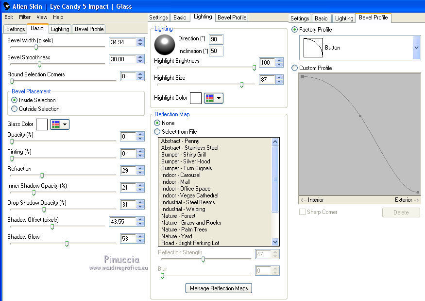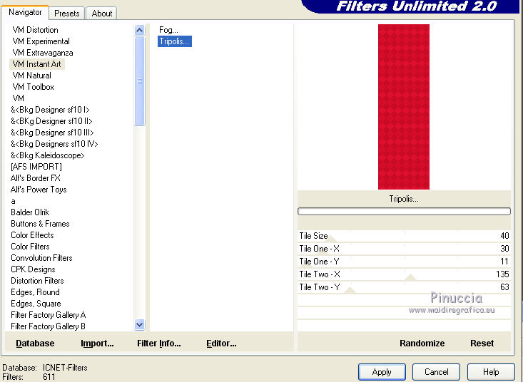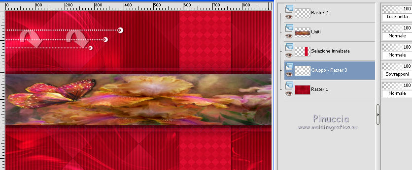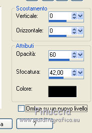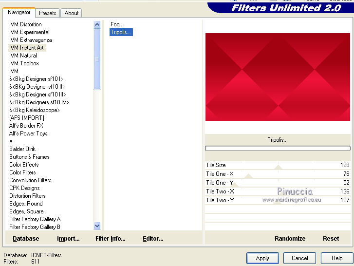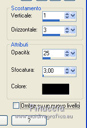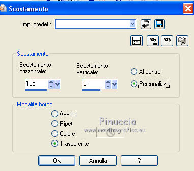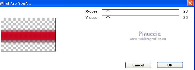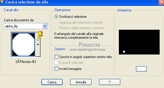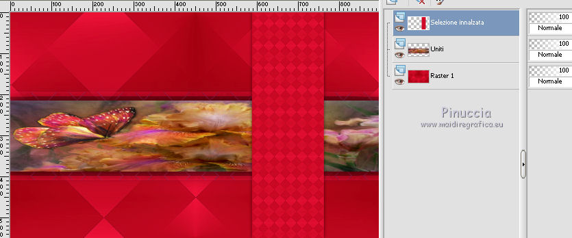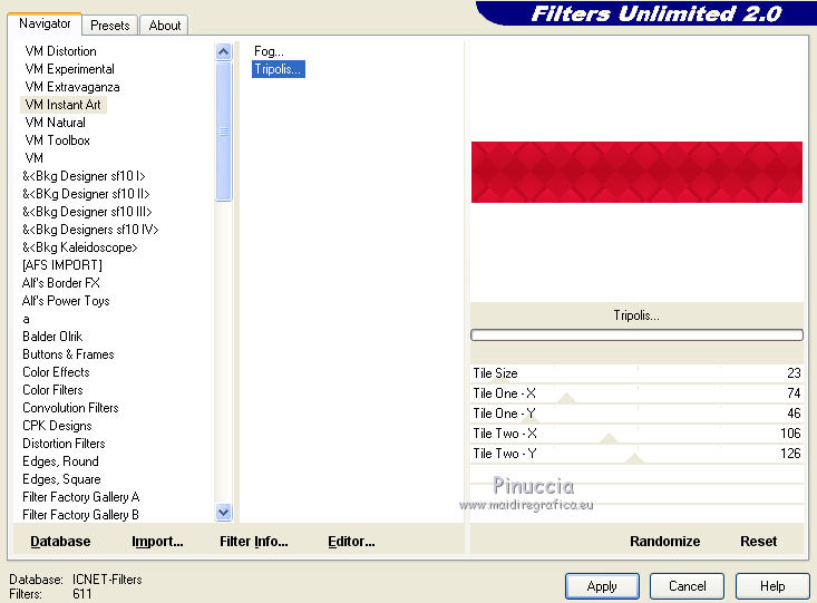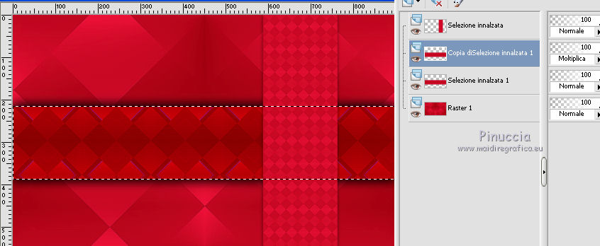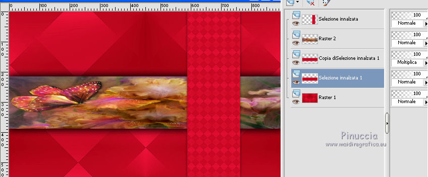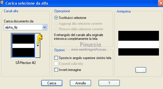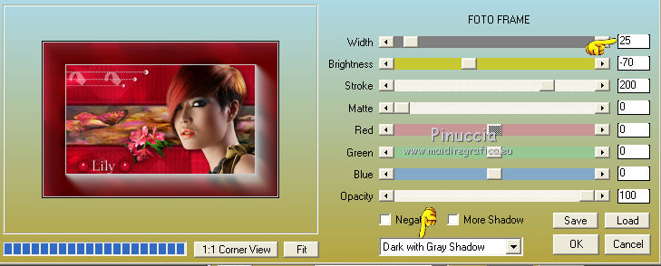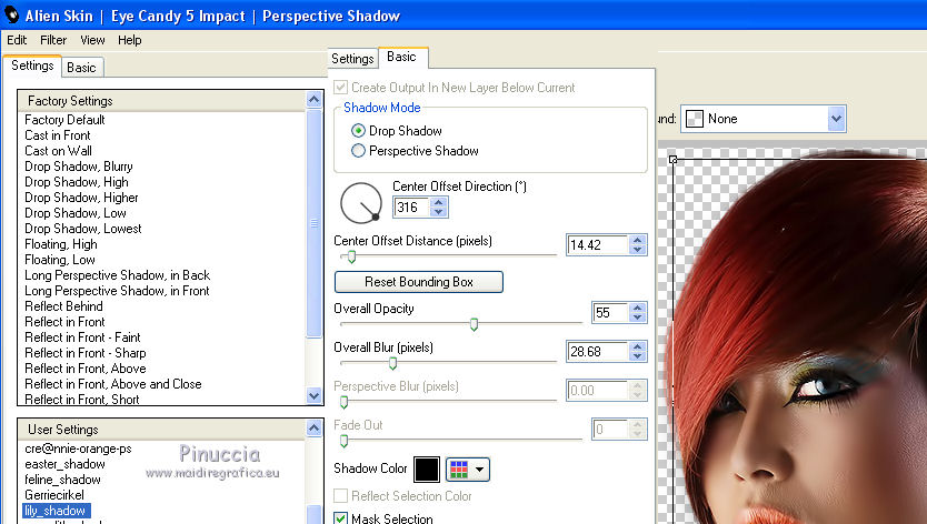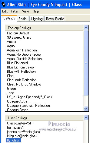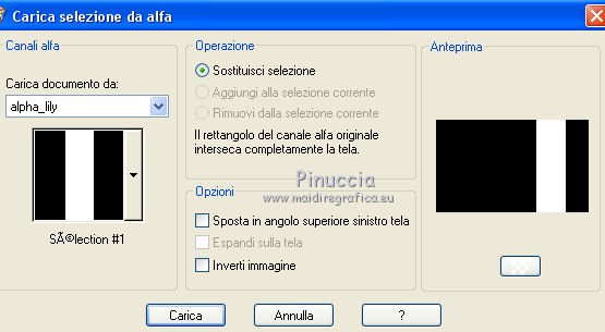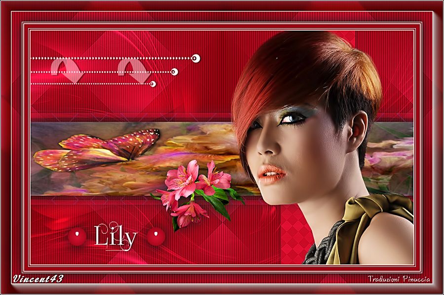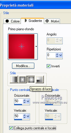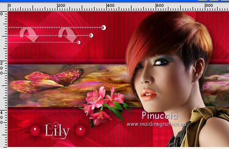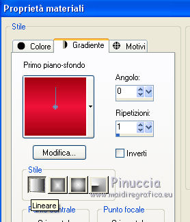 qui puoi trovare qualche risposta ai tuoi dubbi. Se l'argomento che ti interessa non è presente, ti prego di segnalarmelo. Questo tutorial è una creazione di Saturnella e non può essere copiato su altri siti nè essere offerto per il download. Lo stesso vale per la mia traduzione. E' anche proibito togliere il watermark dal materiale; rispettiamo il lavoro dei creatori di tubes, senza i quali non potremmo creare tutorials. Per tradurre questo tutorial, creato con PSP16, ho usato CorelX, ma può essere eseguito anche con le altre versioni di PSP. Dalla versione X4, il comando Immagine>Rifletti è stato sostituito con Immagine>Capovolgi in orizzontale, e il comando Immagine>Capovolgi con Immagine>Capovolgi in verticale. Nelle versioni X5 e X6, le funzioni sono state migliorate rendendo disponibile il menu Oggetti. Nel nuovo X7 sono tornati i comandi Immagine>Rifletti e Immagine>Capovolgi, ma con nuove funzioni. Vedi la scheda sull'argomento qui Occorrente: Materiale qui Grazie: per i tubes Lily e FBR e per la maschera Mary LBDM. (in questa pagina trovi i links ai loro siti). Filtri in caso di dubbi, ricorda di consultare la mia sezione filtri qui Filters Unlimited 2.0 qui VM Instant Art - Tripolis qui AAA Frames - Foto Frame qui Toadies - What are you qui Alien Skin Eye Candy 5 Impact - Perspective Shadow, Glass qui I filtri VM Instant Art e Toadies si possono usare da soli o importati in Filters Unlimited (come fare vedi qui) Se un filtro fornito appare con questa icona ![]() non esitare a cambiare modalità di miscelatura e opacità secondo i colori utilizzati. Nelle ultime versioni di PSP non c'è il gradiente di primo piano/sfondo (Corel_06_029) Puoi usare i gradienti delle versioni precedenti. Trovi qui i gradienti Corel X. Metti i presets Cliccando sul file una o due volte (a seconda delle tue impostazioni), automaticamente il preset si installerà nella cartella corretta. perchè uno o due clic vedi qui Se preferisci, puoi importare direttamente il preset nel corso del tutorial Come fare vedi la scheda del filtro Eye Candy qui Apri la maschera in PSP e minimizzala con il resto del materiale. Imposta il colore di primo piano con #a30211, e il colore di sfondo con #f01339. ![]() Passa il colore di primo piano a Gradiente di primo piano/sfondo, stile Lineare. ![]() 1. Apri alpha_lily. Finestra>Duplica, o sulla tastiera maiuscola+D, per fare una copia. ![]() Chiudi l'originale. La copia, che sarà la base del tuo lavoro, non è vuota, ma contiene le selezioni salvate sul canale alfa. 2. Riempi l'immagine trasparente con il gradiente.3. Effetti>Plugins>Filters Unlimited 2.0 - VM Instant Art - Tripolis, con i settaggi standard. ![]() Effetti>Effetti di bordo>Aumenta. 4. Effetti>Effetti di immagine>Motivo unico. ![]() 5. Selezione>Carica/Salva selezione>Carica selezione da canale alfa. La selezione Sélection#1 è subito disponibile. Devi soltanto cliccare Carica. ![]() Selezione>innalza selezione a livello. 6. Effetti>Plugins>Filters Unlimited 2.0 - VM Instant Art- Tripolis. ![]() Effetti>Effetti di bordo>Aumenta. 7. Effetti>Effetti 3D>Sfalsa ombra. ![]() Selezione>Deseleziona. 8. Attiva il livello di sfondo. Selezione>Carica/Salva selezione>Carica selezione da canala alfa. apri il menu delle selezioni e carica sélection#2. ![]() Selezione>Innalza selezione a livello. 9. Effetti>Plugins>Filters Unlimited 2.0 - VM Instant Art - Tripolis. ![]() Effetti>Effetti di bordo>Aumenta. 10. Effetti>Effetti 3D>Sfalsa ombra. ![]() Mantieni selezionato. 11. Livelli>Duplica. Cambia la modalità di miscelatura di questo livello in Moltiplica, o altro. ![]() Livelli>Nuovo livello raster. Apri l'immagine image_lily.jpg e vai a Modifica>Copia. Torna al tuo lavoro e vai a Modifica>Incolla nella selezione. Selezione>Deseleziona. 12. Attiva il livello Selezione innalzata 1. ![]() Effetti>Plugins>Toadies - What are you, con i settaggi standard. ![]() Effetti>Effetti di bordo>Aumenta. 13. Chiudi il livello di sfondo e il livello superiore. ![]() Livelli>Unisci>Unisci visibile. 14. Riapri i livelli chiusi e attiva il livello superiore (selezione innalzata). ![]() Livelli>Disponi>Sposta giù. 15. Attiva il livello superiore. Effetti>Effetti 3D>Sfalsa ombra, con i settaggi precedenti, in memoria. ![]() 16. Apri il tube deco1 e vai a Modifica>Copia. Torna al tuo lavoro e vai a Modifica>Incolla come nuovo livello. Effetti>Effetti di immagine>Scostamento. ![]() Cambia la modalità di miscelatura di questo livello in Luce netta. 17. Effetti>Effetti 3D>Sfalsa ombra. ![]() 18. Attiva il livello di sfondo. Effetti>Effetti di trama>Veneziana, colore nero. ![]() 19. Livelli>Nuovo livello raster. Imposta il colore di primo piano con il colore bianco. ![]() Riempi il livello con il colore bianco.Livelli>Nuovo livello maschera>Da immagine. Apri il menu sotto la finestra di origine e vedrai la lista dei files aperti. Seleziona la maschera Lbdm-masque-016. ![]() Regola>Messa a fuoco>Metti a fuoco. Livelli>Unisci>Unisci gruppo. Cambia la modalità di miscelatura di questo livello in Sovrapponi, o altro. ![]() 20. Effetti>Effetti 3D>Sfalsa ombra, con i settaggi precedenti, in memoria. ![]() 21. Attiva il livello superiore. Apri il tube della donna di Lily e vai a Modifica>Copia. Torna al tuo lavoro e vai a Modifica>Incolla come nuovo livello. Immagine>Rifletti. Cancella firma. Immagine>Ridimensiona, all'85%, tutti i livelli non selezionato. Regola>Messa a fuoco>Metti a fuoco. Sposta il tube a destra.22. Effetti>Plugins>Alien Skin Eye Candy 5 Impact - Perspective Shadow. Seleziona il preset lily_shadow e ok. Questi i settaggi, in caso di problemi con il preset ![]() 23. Livelli>Nuovo livello raster. Selezione>Carica/Salva selezione>Carica selezione da canala alfa. apri il menu delle selezioni e carica sélection#3. ![]() Riporta il colore di primo piano al colore iniziale #a30211, e cambia i settaggi del gradiente, stile Sprazzo di luce. ![]() Riempi la selezione con il gradiente.24. Effetti>Plugins>Alien Skin Eye Candy 5 Impac