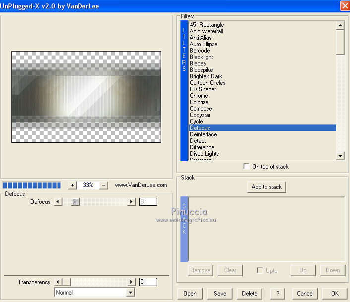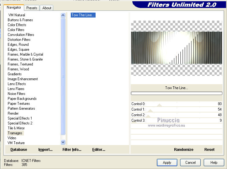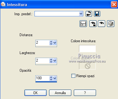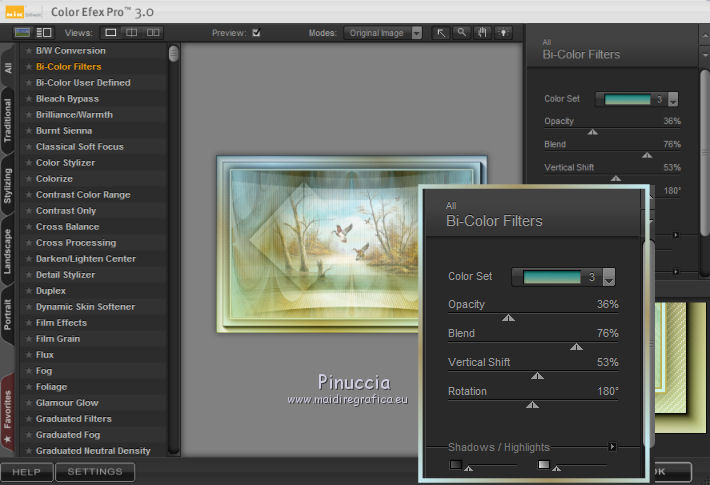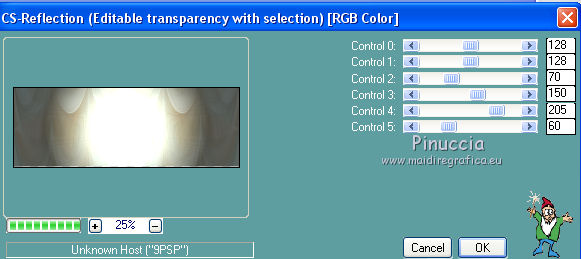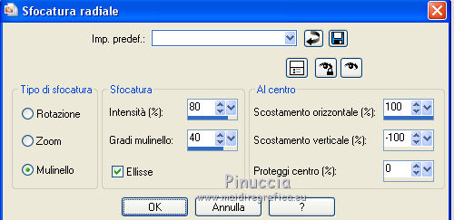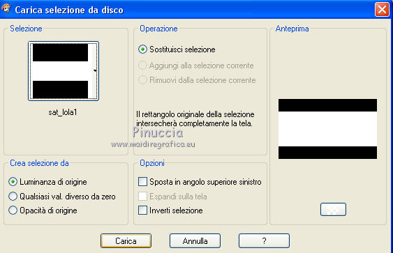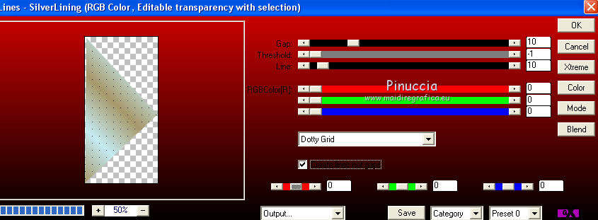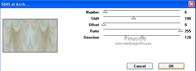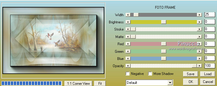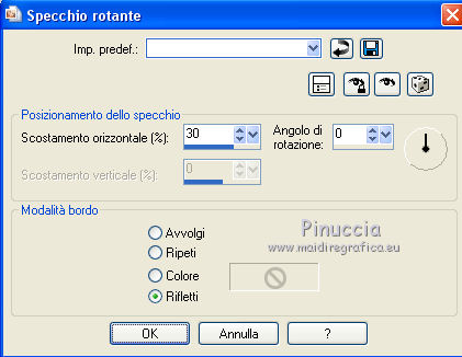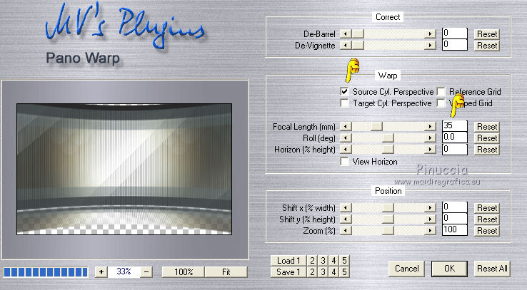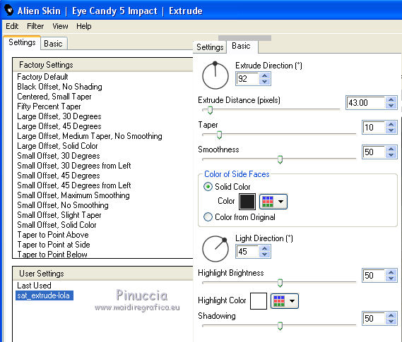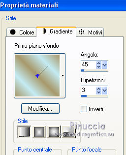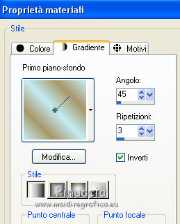 qui puoi trovare qualche risposta ai tuoi dubbi. Se l'argomento che ti interessa non è presente, ti prego di segnalarmelo. Questo tutorial è una creazione di Saturnella e non può essere copiato su altri siti nè essere offerto per il download. Lo stesso vale per la mia traduzione. E' anche proibito togliere il watermark dal materiale; rispettiamo il lavoro dei creatori di tubes, senza i quali non potremmo creare tutorials. Questo tutorial è stato creato con PSP x5, ma può essere eseguito anche con le altre versioni di PSP. Per tradurlo ho usato PSP X. La principale differenza tra le due versioni riguarda le funzioni Immagine>Rifletti/Capovolgi. Vedi la mia scheda qui Occorrente: Materiale qui Per i tubes grazie ClaudiaViza, Anna.br. (in questa pagina trovi i links ai loro siti). Filtri in caso di dubbi, ricorda di consultare la mia sezione filtri qui Filters Unlimited 2.0 qui Mura's Seamless - Shift at arch qui AP 01 Innovations - Lines SilverLining qui Carolaine and Sensibility qui MV's Plugins - Panowarp qui AAA Frames - Foto Frame qui Alien Skin Eye Candy 5 Impact - Perspective Shadow, Extrude qui Nik Software - Color Efex Pro qui VanDerLee - Unplugged X qui Tramages - Tow the line qui I filtri Tramages si possono usare da soli o importati in Filters Unlimited (come fare vedi qui) Se un filtro fornito appare con questa icona ![]() non esitare a cambiare modalità di miscelatura e opacità secondo i colori utilizzati. Metti il preset Cliccando sul file una o due volte (a seconda delle tue impostazioni), automaticamente il preset si installerà nella cartella corretta. perchè uno o due clic vedi qui Metti il preset Emboss_3 nella cartella Impostazioni predefinite. Metti le selezioni nella cartella Selezioni. 1. Imposta il colore di primo piano con #a79869, e il colore di sfondo con #c4ebf3. ![]() 2. Apri una nuova immagine trasparente 900 x 550 pixels. Selezione>Seleziona tutto. 3. Apri il tube del paesaggio "anna.br bird-poster-21-11-10" e vai a Modifica>Copia. non chiuderlo perchè ti servirà ancora Torna al tuo lavoro e vai a Modifica>Incolla nella selezione. Selezione>Deseleziona. 3. Effetti>Effetti di immagine>Motivo unico. ![]() Di nuovo Effetti>Effetti di immagine>Motivo unico, con i settaggi standard. ![]() 5. Regola>Sfocatura>Sfocatura radiale. ![]() 6. Livelli>Duplica. Immagine>Rifletti. Abbassa l'opacità di questo livello al 50%. 7. Livelli>Nuovo livello raster. Livelli>Disponi>Porta sotto. Riempi con il colore di sfondo.Livelli>Unisci>Unisci visibile. 8. Effetti>Filtro definito dall'utente - seleziona il preset Emboss_3 e ok. se hai problemi con il preset, puoi impostare manualmente i settaggi che vedi nella schermata. ![]() 9. Effetti>Plugins>Mura's Seamless - Shift at arch. ![]() 10. Effetti>Effetti di immagine>Motivo unico, con i settaggi standard. ![]() Effetti>Effetti di bordo>Aumenta. 11. Selezione>Carica/Salva selezione>Carica selezione da disco. Cerca e carica la selezione sat_lola1. ![]() Selezione>Innalza selezione a livello. 12. Effetti>Plugins>Carolaine and Sensibility - Reflexion. ![]() Selezione>Deseleziona. 13. Effetti>Plugins>Filters Unlimited 2.0 - Tramages - Tow the line. ![]() 14. Effetti>Plugins>VanDerLee - Unplugged-X - Defocus. ![]() Cambia la modalità di miscelatura di questo livello in Sovrapponi, o secondo i tuoi colori. 15. Effetti>Plugins>Alien Skin Eye Candy 5 Impact - Extrude. Seleziona il preset sat_extrude-lola e ok. se hai problemi con il preset, puoi impostare manualmente i settaggi che vedi nella schermata. ![]() 16. Effetti>Plugins>Alien Skin Eye Candy 5 Impact - Perspective Shadow. Seleziona il preset Reflect in front sharp e ok. ![]() 17. Effetti>Effetti di immagine>Scostamento. ![]() 18. Effetti>Plugins>Mv's Plugins - Panowarp. ![]() 19. Effetti>Effetti 3D>Sfalsa ombra, con il colore nero. ![]() 20. Attiva il livello di sfondo. Selezione>Carica/Salva selezione>Carica selezione da disco. Cerca e carica la selezione sat_lola2. ![]() Selezione>Innalza selezione a livello. Passa il colore di primo piano a Gradiente, stile Lineare. ![]() Riempi la selezione con il gradiente.21. Effetti>Plugins>AP 01 [Innovations] Lines SilverLining. ![]() Effetti>Effetti di bordo>Aumenta. Selezione>Deseleziona. 22. Livelli>Duplica. Immagine>Rifletti. Livelli>Unisci>Unisci giù. 23. Effetti>Effetti di riflesso>Specchio rotante. ![]() 24. Livelli>Duplica. Immagine>Ridimensiona, all'85%, tutti i livelli non selezionato. 25. Effetti>Effetti di immagine>Scostamento. ![]() 26. Effetti>Effetti 3D>Sfalsa ombra, con il colore nero. ![]() Ripeti l'Effetto Sfalsa ombra, cambiando verticale e orizzontale con -3. 27. Livelli>Unisci>Unisci giù. Cambia la modalità di miscelatura di questo livello in Luce diffusa, o secondo i tuoi colori. 28. Effetti>Effetti 3D>Sfalsa ombra, con il colore nero. ![]() Livelli>Unisci>Unisci visibile. 29. Attiva nuovamente il tube del paesaggio "anna.br bird-poster-21-11-10" e vai a Modifica>Copia. Torna al tuo lavoro e vai a Modifica>Incolla come nuovo livello. Immagine>Ridimensiona, all'85%, tutti i livelli non selezionato. Posiziona correttamente il tube.Abbassa l'opacità di questo livello al 50%, o secondo il tuo tube. 30. Effetti>Effetti 3D>Sfalsa ombra, con i settaggi precedenti. 31. Immagine>Aggiungi bordatura, 2 pixels, simmetriche, con il colore scuro. Immagine>Aggiungi bordatura, 4 pixels, simmetriche, con il colore chiaro. Immagine>Aggiungi bordatura, 2 pixels, simmetriche, con il colore scuro. Immagine>Aggiungi bordatura, 50 pixels, simmetriche, con il colore bianco. 32. Seleziona il bordo bianco con la bacchetta magica ![]() Cambia i settaggi del gradiente, selezionando Inverti. ![]() Riempi la selezione con il gradiente.33. Effetti>Effetti di trama>Intessitura. ![]() 34. Selezione>Inverti. Effetti>Effetti 3D>Sfalsa ombra, con i settaggi precedenti, ancora in memoria. Selezione>Deseleziona. 35. Effetti>Plugins>AAA Frames - Foto Frame. ![]() 36. Apri il tube della donna tubeclaudiaviza-mujer3301 e vai a Modifica>Copia. T