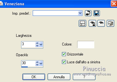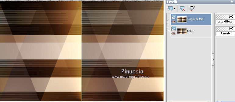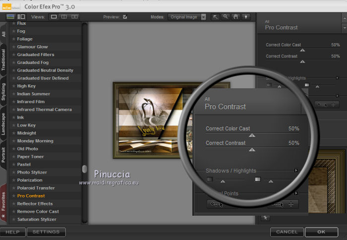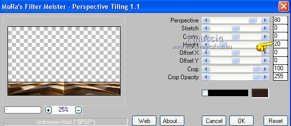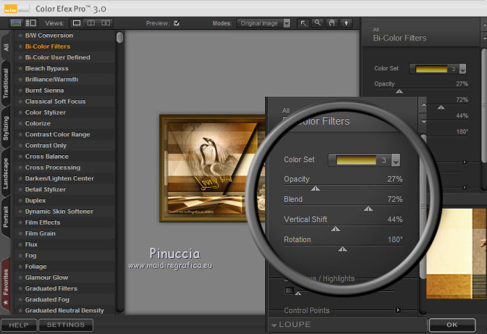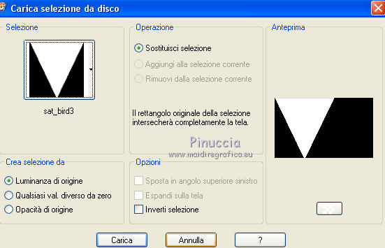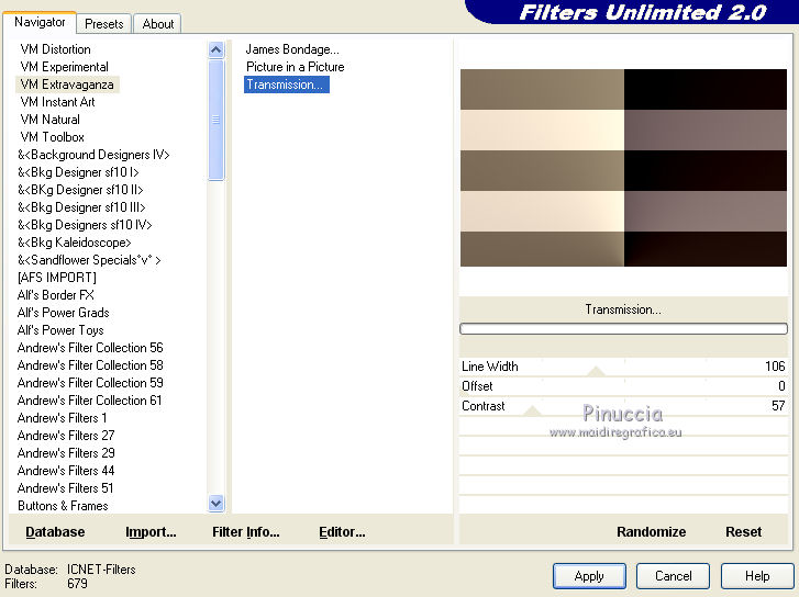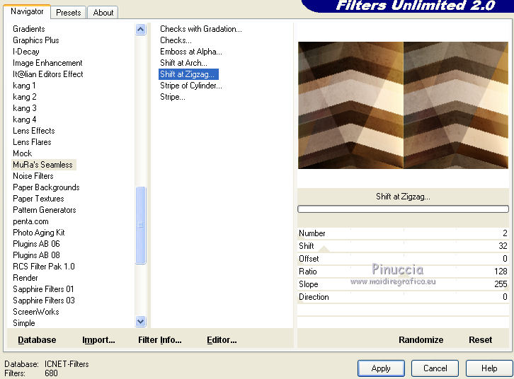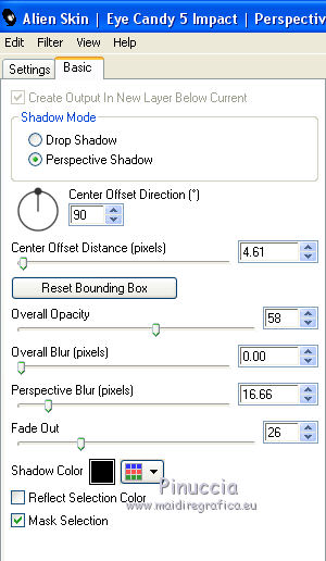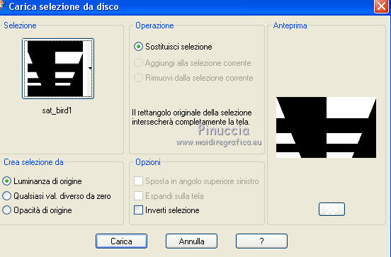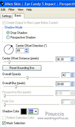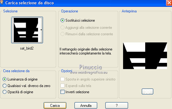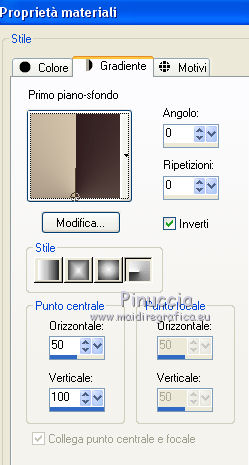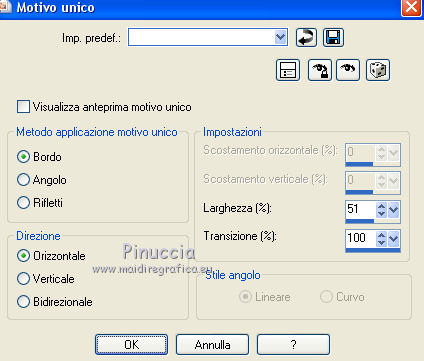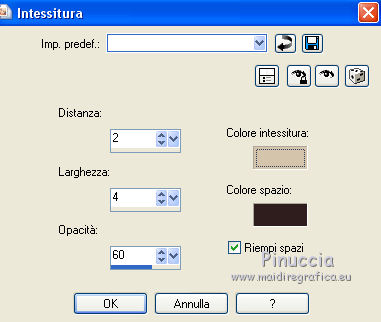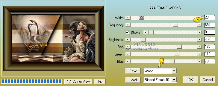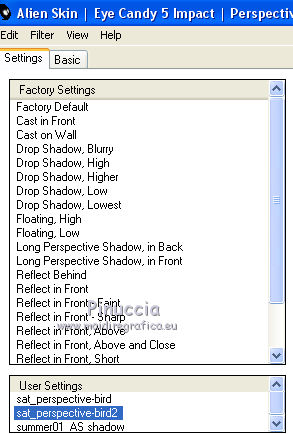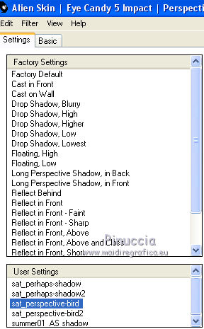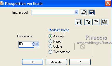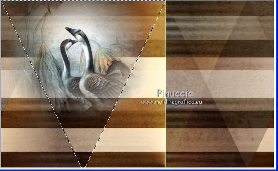 qui puoi trovare qualche risposta ai tuoi dubbi. Se l'argomento che ti interessa non è presente, ti prego di segnalarmelo. Questo tutorial è una creazione di Saturnella e non può essere copiato su altri siti nè essere offerto per il download. Lo stesso vale per la mia traduzione. E' anche proibito togliere il watermark dal materiale; rispettiamo il lavoro dei creatori di tubes, senza i quali non potremmo creare tutorials. Il tutorial è stato scritto con CorelX16, ma può essere eseguito anche con le altre versioni di PSP. Secondo la versione utilizzata (anteriore a PSP X) potresti ottenere dei risultati differenti. Vedi la mia scheda riguardante le funzioni Rifletti>Capovolgi nelle nuove versioni di PSP qui Per tradurre questo tutorial ho usato PSP X. Occorrente: Materiale qui Per il tube del personaggio grazie Schiwa. Per il tube delle oche grazie Carol. (in questa pagina trovi i links ai loro siti). Filtri in caso di dubbi, ricorda di consultare la mia sezione filtri qui Filters Unlimited 2.0 qui VM Extravaganza - Transmission qui Mura's Seamless - Shift at zig zag qui Alien Skin Eye Candy 5 Impact - Perspective Shadow qui Mura's Meister - Perspective Tiling qui Simple - Top Left Mirror qui Nik Software - Color Efex Pro qui AAA Frames - Frame works qui I filtri WM Extravaganza, Mura's Seamless e Simple si possono usare da soli o importati in Filters Unlimited. come fare vedi qui) Se un filtro fornito appare con questa icona ![]() non esitare a cambiare modalità di miscelatura e opacità secondo i colori utilizzati. Metti i preset Cliccando sul file una o due volte (a seconda delle tue impostazioni), automaticamente il preset si installerà nella cartella corretta. perchè uno o due clic vedi qui Metti le selezioni nella cartella Selezioni. 1. Imposta il colore di primo piano con #d4c4ab, e il colore di sfondo con il colore #301d1e. ![]() Passa il colore di primo piano a Gradiente, stile Radiale, con i seguenti settaggi: ![]() Apri una nuova immagine trasparente 900 x 550 pixels, e riempila con il gradiente.2. Effetti>Plugins>Filters Unlimited 2.0 - VM Extravaganza - Transmission. ![]() 3. Effetti>Effetti geometrici>Prospettiva verticale. ![]() 4. Selezione>Carica/Salva selezione>Carica selezione da disco. Cerca e carica la selezione sat_bird1. ![]() Effetti>Effetti di trama>Veneziana - colore bianco. ![]() Selezione>Deseleziona. 5. Effetti>Effetti di immagine>Motivo unico. ![]() 6. Selezione>Carica/Salva selezione>Carica selezione da disco. Cerca e carica la selezione sat_bird2. ![]() Selezione>Innalza selezione a livello. Selezione>Deseleziona. Cambia la modalità di miscelatura di questo livello in Sovrapponi, o secondo i tuoi colori. 7. Livelli>Duplica. Livelli>Unisci>Unisci visibile. 8. Livelli>Duplica. Immagine>Rifletti. Immagine>Capovolgi. Cambia la modalità di miscelatura di questo livello in Luce diffusa, o secondo i tuoi colori. ![]() 9. Livelli>Nuovo livello raster. Selezione>Seleziona tutto. Apri l'immagine grungemaps0123 e vai a Modifica>Copia. Torna al tuo lavoro e vai a Modifica>Incolla nella selezione. Selezione>Deseleziona. Cambia la modalità di miscelatura di questo livello in Luce diffusa (o altro), e abbassa l'opacità al 38%. Effetti>Effetti di bordo>Aumenta. Livelli>Unisci>Unisci visibile. 10. Livelli>Duplica. Effetti>Plugins>Filters Unlimited 2.0 - Mura’s seamless - Shift at zig zag. ![]() 11. Chiudi questo livello. Attiva il livello di sfondo. 12. Effetti>Effetti di immagine>Motivo unico. ![]() 13. Selezione>Carica/Salva selezione>Carica selezione da disco. Cerca e carica la selezione sat_bird3. ![]() Selezione>Innalza selezione a livello. 14. Apri il tube geese.mistedbycarol e vai a Modifica>Copia. Torna al tuo lavoro e vai a Modifica>Incolla come nuovo livello. Posiziona il tube nell'area selezionata.![]() Cambia la modalità di miscelatura di questo livello in Luminanza (esistente). Selezione>Inverti. Premi sulla tastiera il tasto CANC ![]() 15. Di nuovo Selezione>Inverti. Livelli>Unisci>Unisci giù. Effetti>Effetti 3D>Sfalsa ombra. ![]() Selezione>Deseleziona. 16. Effetti>Plugins>Alien Skin Eye Candy 5 Impact - Perspective Shadow. Seleziona il preset Drop shadow blurry e ok. ![]() 17. Riapri e attiva il livello superiore. Effetti>Plugins>Mura's Meister - Perspective Tiling. ![]() 18. Effetti>Plugins>Alien Skin Eye Candy 5 Impact - Perspective Shadow. Seleziona il preset sat_perspective-bird e ok. ![]() Questi i settaggi che, in caso di problemi con il preset, puoi impostare manualmente. ![]() 19. Apri il tube di Schiwa "tube1892" e vai a Modifica>Copia. Torna al tuo lavoro e vai a Modifica>Incolla come nuovo livello. Posiziona il tube a destra, come nel mio esempio.20. Effetti>Plugins>Alien Skin Eye Candy 5 Impact - Perspective Shadow. Seleziona il preset sat_perspective-bird2 e ok. ![]() Questi i settaggi che, in caso di problemi con il preset, puoi impostare manualmente. ![]() 21. Apri il file di testo e vai a Modifica>Copia. Torna al tuo lavoro e vai a Modifica>Incolla come nuovo livello. Spostalo dove preferisci, o vedi il mio esempio.22. Attiva il livello di sfondo e vai a Modifica>Copia. Immagine>Aggiungi bordatura, 1 pixel, simmetriche, con il colore nero. Immagine>Aggiungi bordatura, 50 pixels, simmetriche, con il colore bianco. Seleziona il bordo bianco con la bacchetta magica ![]() Modifica>Incolla nella selezione. 23. Effetti>Plugins>Simple - Top Left Mirror. 24. Effetti>Effetti di trama>Intessitura. colore intessitura: primo piano; colore spazio: colore di sfondo. ![]() 25. Effetti>Plugins>AAA Frames - Frame Works, prima seleziona le impostazioni nel menu inferiore, e poi cambia width con 28. ![]() 26. Selezione>Inverti. Effetti>Effetti 3D>Sfalsa ombra. ![]() Selezione>Deseleziona. 27. Immagine>Aggiungi bordatura, 1 pixel, simmetriche, con il colore nero. 28. Aggiungi il tuo nome e/o il tuo watermark su un nuovo livello. Livelli>Unisci>Unisci tutto. Immagine>Ridimensiona, a 900 pixels di larghezza, tutti i livelli selezionato. Regola>Mes