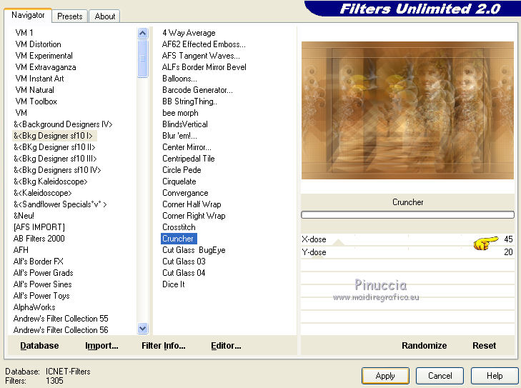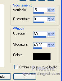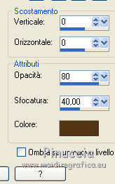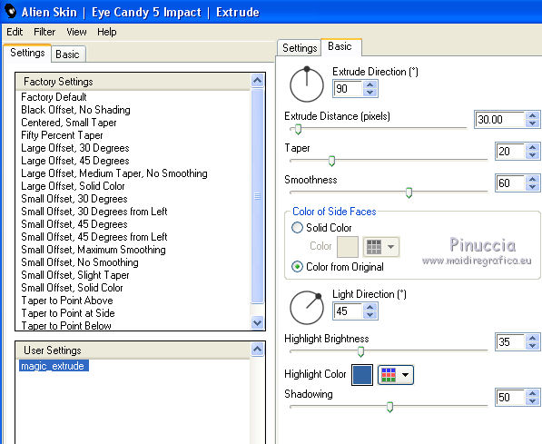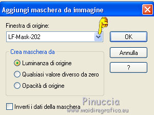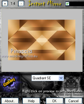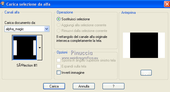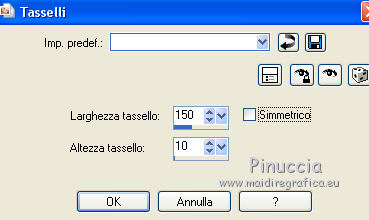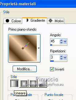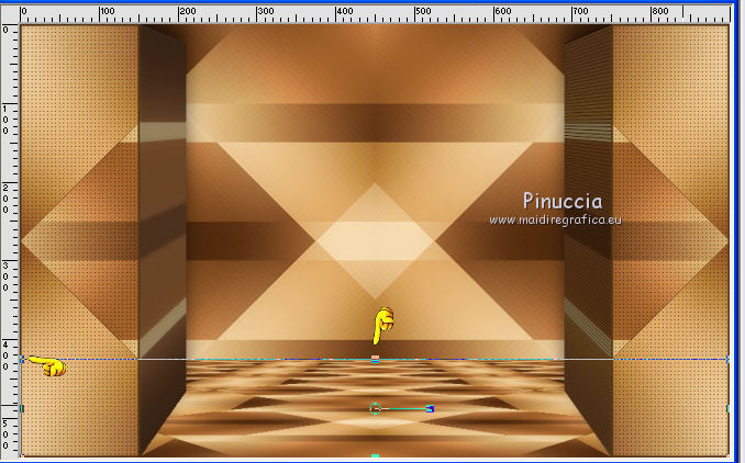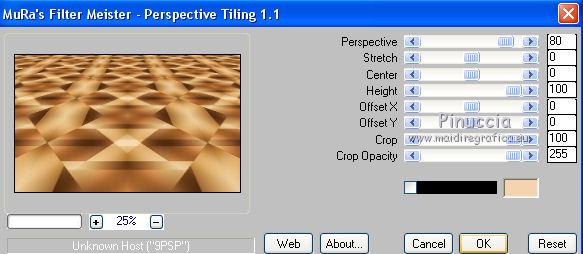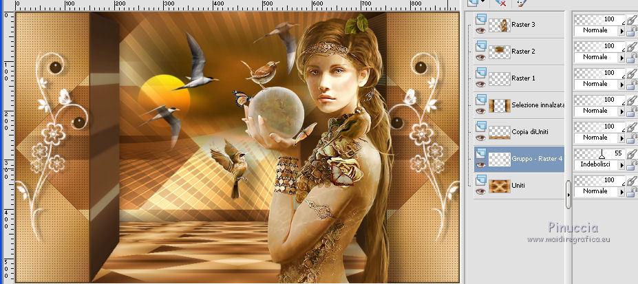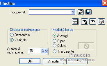 qui puoi trovare qualche risposta ai tuoi dubbi. Se l'argomento che ti interessa non è presente, ti prego di segnalarmelo. Questo tutorial è una creazione di Saturnella e non può essere copiato su altri siti nè essere offerto per il download. Lo stesso vale per la mia traduzione. E' anche proibito togliere il watermark dal materiale; rispettiamo il lavoro dei creatori di tubes, senza i quali non potremmo creare tutorials. Per tradurre questo tutorial, creato con PSP19, ho usato CorelX, ma può essere eseguito anche con le altre versioni di PSP. Dalla versione X4, il comando Immagine>Rifletti è stato sostituito con Immagine>Capovolgi in orizzontale, e il comando Immagine>Capovolgi con Immagine>Capovolgi in verticale. Nelle versioni X5 e X6, le funzioni sono state migliorate rendendo disponibile il menu Oggetti. Nel nuovo X7 sono tornati i comandi Immagine>Rifletti e Immagine>Capovolgi, ma con nuove funzioni. Vedi la scheda sull'argomento qui Occorrente: Materiale qui Grazie per i tubes Luz Cristina e Lisa T; per la maschera Linda Ferdinand. Il tube del paesaggio è di Saturnella (in questa pagina trovi i links ai loro siti). Filtri in caso di dubbi, ricorda di consultare la mia sezione filtri qui Filters Unlimited 2.0 qui AP Lines - Lines SilverLining qui Mura's Meister - Perspective Tiling qui Plugin Galaxy - Instant Mirror qui Simple - Blintz qui Alien Skin Eye Candy 5 Impact - Perspective Shadow, Extrude qui &<Bkg Designer sf10I> - Cruncher (da importare in Unlimited) qui I filtri Simple si possono usare da soli o importati in Filters Unlimited (come fare vedi qui) Se un filtro fornito appare con questa icona ![]() non esitare a cambiare modalità di miscelatura e opacità secondo i colori utilizzati. Nelle ultime versioni di PSP non c'è il gradiente di primo piano/sfondo (Corel_06_029) Puoi usare i gradienti delle versioni precedenti. Trovi qui i gradienti Corel X. Apri la maschera in PSP e minimizzala con il resto del materiale. 1. Imposta il colore di primo piano con il colore scuro #533514, e il colore di sfondo con il colore chiaro #f6d3af. ![]() Passa il colore di primo piano a Gradiente di primo piano/sfondo, stile Lineare. ![]() 2. Apri alpha_magic. Finestra>Duplica o sulla tastiera maiuscola+D per fare una copia. ![]() Chiudi l'originale. La copia, che sarà la base del tuo lavoro, non è vuota, ma contiene una selezione salvata sul canale alfa. Riempi l'immagine trasparente con il gradiente.3. Effetti>Effetti di distorsione>Tasselli. ![]() 4. Livelli>Duplica. Effetti>Effetti geometrici>Inclina ![]() Effetti>Plugins>Simple - Blintz. 5. Livelli>Duplica. Immagine>Rifletti. Cambia la modalità di miscelatura di queseto livello in Sovrapponi, o altro, e abbassa l'opacità all'80%. Livelli>Unisci>Unisci visibile. 6. Effetti>Plugins>Plugin Galaxy - Instant Mirror. ![]() 7. Selezione>Carica/Salva selezione>Carica selezione da canale alfa. la selezione sélection1 è subito disponibile. Devi soltanto cliccare Carica. ![]() Selezione>Innalza selezione a livello. Effetti>Plugins>AP Lines - Lines SilverLining. ![]() 8. Effetti>Plugins>Alien Skin Eye Candy 5 Impact - Extrude. Seleziona il preset magic_extrude e ok. Questi i settaggi, in caso di problemi con il preset. ![]() 9. Selezione>Modifica>Seleziona bordature selezione. ![]() Modalità di corrispondenza dello strumento Riempimento su Nessuno ![]() Riporta il colore di primo piano a Colore. Riempi la selezione con il tuo colore scuro di primo piano.Selezione>Deseleziona. 10. Effetti>Plugins>Alien Skin Eye Candy 5 Impact - Perspective Shadow. Seleziona il preset magic_shadow e ok. Questi i settaggi, in caso di problemi con il preset. ![]() 11. Attiva il livello di sfondo. Livelli>Duplica. Effetti>Plugins>Mura's Meister - Perspective Tiling, con i settaggi standard. ![]() 12. Premi il tasto K per attivare lo strumento Puntatore ![]() se stai usando PSP 9 il tasto D per attivare lo strumento Deformazione ![]() in modalità Scala , spingi il nodo superiore centrale verso il basso fino a 425 pixels, (se non visualizzi i Righelli, vai a Visualizza>Righelli) ![]() Tasto M per deselezionare lo strumento. 13. Effetti>Effetti 3D>Sfalsa ombra ![]() 14. Attiva il livello superiore. Apri il tube deco e vai a Modifica>Copia. Torna al tuo lavoro e vai a Modifica>Incolla come nuovo livello. Effetti>Effetti 3D>Sfalsa ombra. ![]() 15. Apri il tube degli uccelli di Luz Cristina e vai a Modifica>Copia. Torna al tuo lavoro e vai a Modifica>Incolla come nuovo livello. Immagine>Rifletti. Posiziona il tube come nel mio esempio.16. Apri il tube della donna di LisaT e vai a Modifica>Copia. Torna al tuo lavoro e vai a Modifica>Incolla come nuovo livello. Immagine>Ridimensiona, all'85%, tutti i livelli non selezionato. Regola>Messa a fuoco>Metti a fuoco. 17. Effetti>Effetti 3D>Sfalsa ombra. ![]() 18. Attiva il livello di sfondo. Livelli>Nuovo livello raster. Imposta il colore di primo piano con il colore bianco, e riempi il livello con questo colore.Livelli>Nuovo livello maschera>Da immagine. Apri il menu sotto la finestra di origine e vedrai la lista dei files aperti. Seleziona la maschera LF-Mask-202. ![]() Effetti>Effetti di vordo>Aumenta. Livelli>Unisci>Unisci gruppo. Immagine>Rifletti. Cambia la modalità di miscelatura di questo livello in Indebolisci e abbassa l'opacità al 55%. ![]() 19. Effetti>Effetti 3D>Sfalsa ombra. ![]() 20. Attiva il livello di sfondo. Modifica>Copia. Immagine>Aggiungi bordatura, 1 pixel, simmetriche, colore scuro. Immagine>Aggiungi bordatura, 3 pixels, simmetriche, colore chiaro. Immagine>Aggiungi bordatura, 1 pixel, simmetriche, colore scuro. Immagine>Aggiungi bordatura, 50 pixels, simmetriche, colore bianco. 21. Attiva lo strumento Bacchetta magica ![]() e clicca nel bordo di 50 pixels per selezionarlo. Modifica>Incolla nella selezione. 22. Regola>Sfocatura>Sfocatura gaussiana - raggio 60. ![]() 23. Effetti>Plugins>Filters Unlimited 2.0 - &<Bkg Designer sf10I> - Cruncher. ![]() Effetti>Effetti di bordo>Aumenta. 24. Selezi