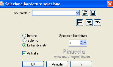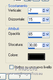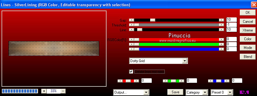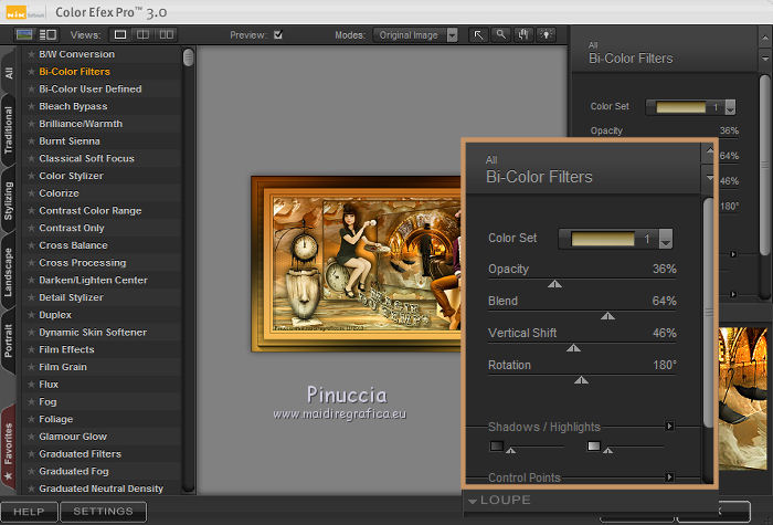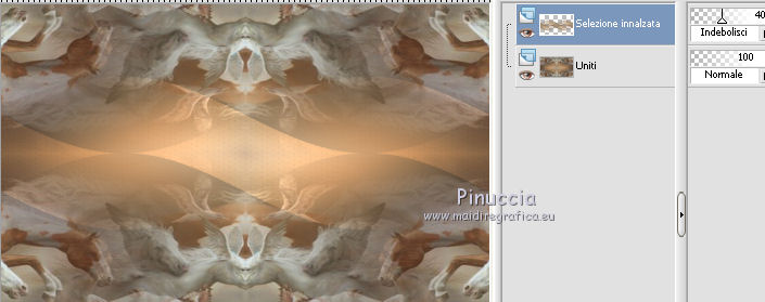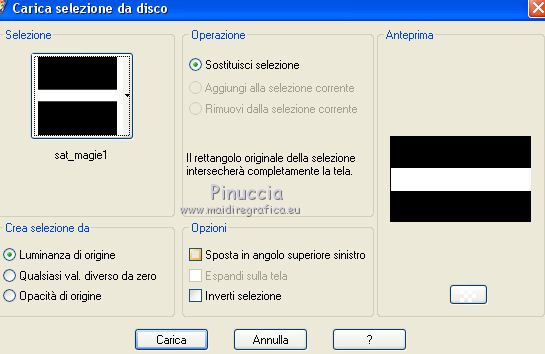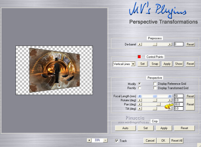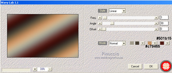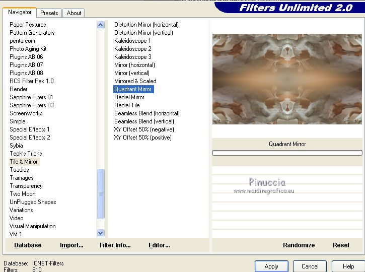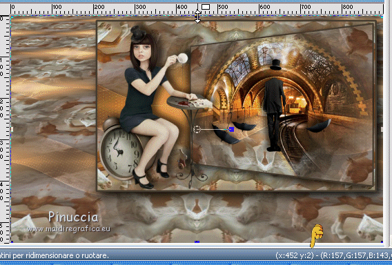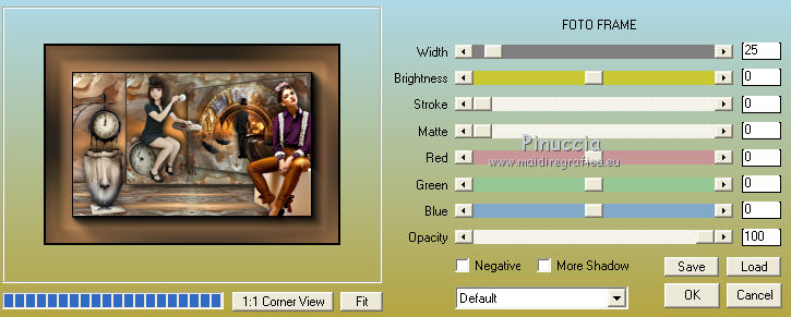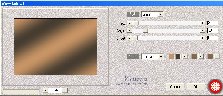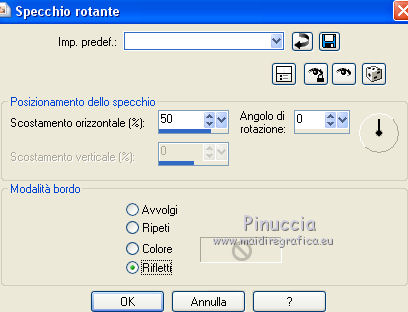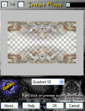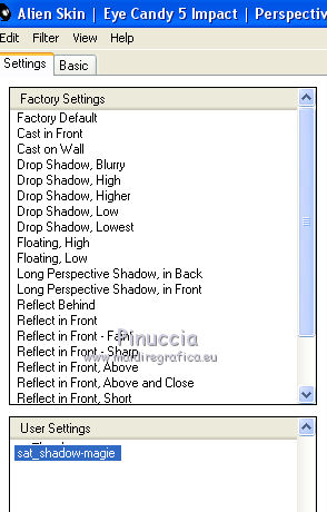 qui puoi trovare qualche risposta ai tuoi dubbi. Se l'argomento che ti interessa non è presente, ti prego di segnalarmelo. Questo tutorial è una creazione di Saturnella e non può essere copiato su altri siti nè essere offerto per il download. Lo stesso vale per la mia traduzione. E' anche proibito togliere il watermark dal materiale; rispettiamo il lavoro dei creatori di tubes, senza i quali non potremmo creare tutorials. Il tutorial è stato scritto con CorelX16, ma può essere eseguito anche con le altre versioni di PSP. Secondo la versione utilizzata (anteriore a PSP X) potresti ottenere dei risultati differenti. Vedi la mia scheda riguardante le funzioni Rifletti>Capovolgi nelle nuove versioni di PSP qui Per tradurre questo tutorial ho usato PSP X. Occorrente: Materiale qui Per i tubes grazie Krys, Nikita, Thafs e Nicole. (in questa pagina trovi i links ai loro siti). Filtri in caso di dubbi, ricorda di consultare la mia sezione filtri qui Filters Unlimited 2.0 qui Mehdi - Wavy Lab 1.1 qui Plugin Galaxy - Instant Mirror qui MV's Plugins - Perspective Trasformation qui Alien Skin Eye Candy 5 Impact - Perspective Shadow qui Ap 01 [Innovations] - Lines SilverLining qui FM Tile Tools - Saturation Emboss qui AAA Frames - Foto Frame qui Mura's Meister - Perspective Tiling qui Nik Software - Color Efex Pro qui ![]() non esitare a cambiare modalità di miscelatura e opacità secondo i colori utilizzati. Metti il preset Cliccando sul file una o due volte (a seconda delle tue impostazioni), automaticamente il preset si installerà nella cartella corretta. perchè uno o due clic vedi qui Metti la maschera nella cartella Maschere. Metti le selezioni nella cartella Selezioni. 1. Imposta il colore di primo piano con #463c30, e il colore di sfondo con il colore #a39d8d. ![]() Apri una nuova immagine trasparente 900 x 550 pixels. Effetti>Plugins>Mehdi - Wavy Lab 1.1. Questo filtro lavora con i colori impostati nella paletta dei materiali. Il primo è il colore di sfondo, il secondo è il colore di primo piano; cambia il terzo colore con #c79465 e il quarto con #501b15. ![]() 2. Regola>Sfocatura>Sfocatura gaussiana - raggio 50. ![]() 3. Livelli>Nuovo livello raster. Selezione>Seleziona tutto. Apri il tube KRISTMISTSURREALISME14 e vai a Modifica>Copia. Torna al tuo lavoro e vai a Modifica>Incolla nella selezione. Selezione>Deseleziona. 4. Effetti>Effetti di immagine>Motivo unico. ![]() 5. Effetti>Effetti di riflesso>Specchio rotante. ![]() 6. Effetti>Plugins>The Plugins Site - Instant Mirror I plugins Galaxy, una volta inseriti nei Percorsi Files, si trovano sotto The Plugins Site ![]() (secondo il tube utilizzato, il risultato sarà differente). Livelli>Unisci>Unisci visibile. 7. Effetti>Plugins>Filters Unlimited 2.0 - Tile & Mirror - Quadrant Mirror. ![]() 8. Selezione>Carica/Salva selezione>Carica selezione da disco. Cerca e carica la selezione sat_magie1. ![]() Selezione>Innalza selezione a livello. 9. Effetti>Plugins>AP 01 [Innovations] - Lines SilverLining. ![]() Selezione>Deseleziona. 10. Effetti>Effetti di distorsione>Onda. ![]() 11. Effetti>Effetti di immagine>Motivo unico, con i settaggi precedenti, ancora in memoria. Cambia la modalità di miscelatura di questo livello in Indebolisci, e abbassa l'opacità al 40% (o secondo i tuoi colori). ![]() 12. Effetti>Effetti di bordo>Aumenta di più. Livelli>Unisci>Unisci visibile. 13. Modifica>Copia. Modifica>Incolla come nuova immagine e minimizza questa immagine, che ti servirà più tardi. 14. Torna al tuo lavoro. Apri il tube del paesaggio di Nikita (1293040308_pausages_nikita). Elimina il watermark e vai a Modifica>Copia. Torna al tuo lavoro e vai a Modifica>Incolla come nuovo livello. 15. Livelli>Carica/Salva maschera>Carica maschera da disco. Cerca e carica la maschera 20-20. ![]() Livelli>Unisci>Unisci gruppo. Cambia la modalità di miscelatura di questo livello in Luce netta, o secondo i tuoi colori. 16. Attiva il livello di sfondo. ![]() Selezione>Carica/Salva selezione>Carica selezione da disco. Cerca e carica la selezione sat_magie2. ![]() Selezione>Innalza selezione a livello. 17. Selezione>Modifica>Seleziona bordature selezione. ![]() Riempi con il colore scuro di primo piano #463c30.Selezione>Deseleziona. 18. Attiva il livello superiore con il paesaggio di Nikita. Livelli>Unisci>Unisci giù. 19. Apri il tube 58393413186825846feeriquenikita (cancella il watermark), e vai a Modifica>Copia. Torna al tuo lavoro e vai a Modifica>Incolla come nuovo livello. Posiziona correttamente il tube.20. Effetti>Effetti 3D>Sfalsa ombra. ![]() Livelli>Unisci>Unisci giù. 21. Immagine>Ridimensiona, al 120%, tutti i livelli non selezionato. Regola>Messa a fuoco>Metti a fuoco. 22. Effetti>Plugins>MV's Plugins - Perspective Transformation. ![]() Attenzione, se dopo aver inserito il filtro nei Percorsi Files non lo vedi nell'elenco dei filtri, rimuovi dai Percorsi il filtro Andromeda Perspective. Il primo filtro inserito impedisce l'uso del secondo. 23. Effetti>Effetti di immagine>Scostamento. ![]() 24. Effetti>Plugins>Alien Skin Eye Candy 5 Impact - Perspective Shadow. Seleziona il preset sat_shadow-magie e ok. ![]() Questi i settaggi che, in caso di problemi con il preset, puoi impostare manualmente. ![]() Immagine>Rifletti. 25. Apri il tube KRYSFANTASTIQUE19KULIK e vai a Modifica>Copia. Torna al tuo lavoro e vai a Modifica>Incolla come nuovo livello. Spostalo a sinistra.Effetti>Effetti 3D>Sfalsa ombra, con i settaggi precedenti, ancora in memoria. 26. Attiva il livello di sfondo. Effetti>Plugins>FM Tile Tools - Saturation Emboss. ![]() Modifica>Copia Unione. 26. Attiva l'immagine duplicata che hai messo da parte al punto 13. ![]() Modifica>Incolla come nuovo livello. 27. Immagine>Ridimensiona, al 75%, tutti i livelli non selezionato. Selezione>Seleziona tutto. Selezione>Mobile. Selezione>Immobilizza. Selezione>Modifica>Seleziona bordature selezione, con i settaggi precedenti. ![]() Riempi la selezione con il colore scuro #463c30.Selezione>Deseleziona. 