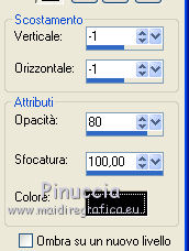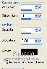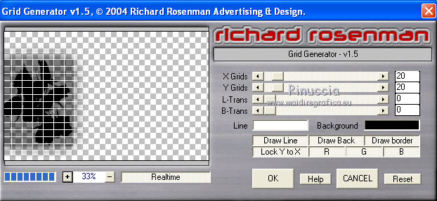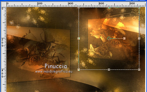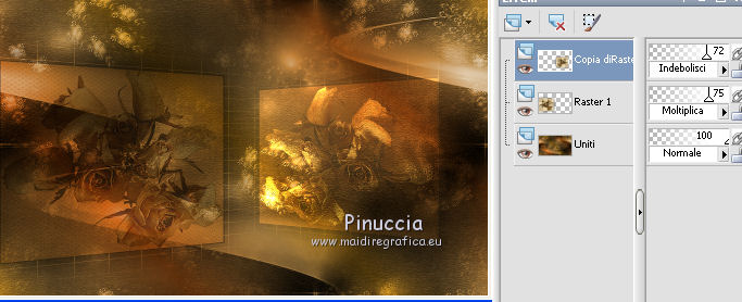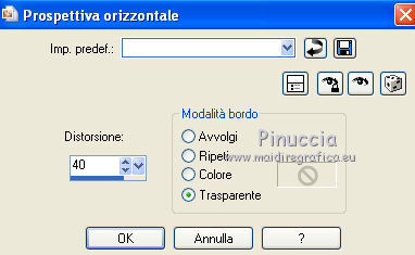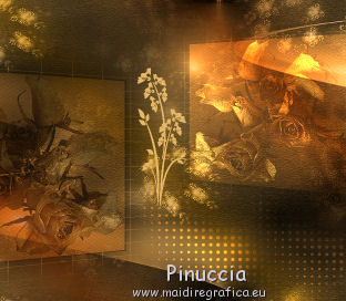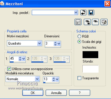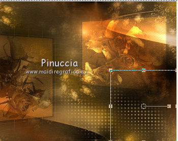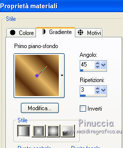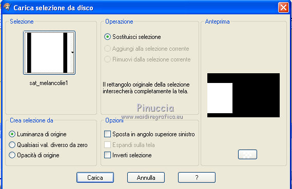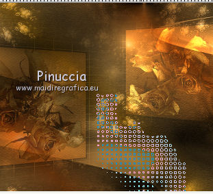 qui puoi trovare qualche risposta ai tuoi dubbi. Se l'argomento che ti interessa non è presente, ti prego di segnalarmelo. Questo tutorial è una creazione di Saturnella e non può essere copiato su altri siti nè essere offerto per il download. Lo stesso vale per la mia traduzione. E' anche proibito togliere il watermark dal materiale; rispettiamo il lavoro dei creatori di tubes, senza i quali non potremmo creare tutorials. Il tutorial è stato creato con PSP12, ma può essere eseguito anche con le altre versioni. Per tradurlo, ho usato PSP X. Occorrente: Materiale qui Il tube della donna è di MMC. Il tube del fiore è di Jhanna. (in questa pagina trovi i links ai loro siti). Filtri in caso di dubbi, ricorda di consultare la mia sezione filtri qui Toadies - What are you qui Simple - 4way Average qui Richard Rosenman - Grid Generator qui ![]() non esitare a cambiare modalità di miscelatura e opacità secondo i colori utilizzati. Metti la selezione nella cartella Selezioni. Apri i pennelli (cartella pinceaux) in PSP ed esportali come Pennelli personalizzati. Vedi gli appunti sui pennelli qui 1. Imposta il colore di primo piano con #e5b866, e il colore di sfondo con #572d0d. ![]() Passa il colore di primo piano a Gradiente, stile Lineare, con i seguenti settaggi. ![]() 2. Apri una nuova immagine trasparente 900 x 550 pixels, e riempila con il gradiente.3. Livelli>Nuovo livello raster. Selezione>Seleziona tutto. 4. Apri l'immagine di sfondo "5" e vai a Modifica>Copia. Torna al tuo lavoro e vai a Modifica>Incolla nella selezione. Selezione>Deseleziona. Cambia la modalità di miscelatura di questo livello in Luminanza. 5. Effetti>Effetti di immagine>Motivo unico. ![]() 6. Livelli>Unisci>Unisci visibile. 7. Livelli>Nuovo livello raster. Selezione>Carica/Salva selezione>Carica selezione da disco. Cerca e carica la selezione sat_melancolie1. ![]() 8. Effetti>Effetti 3D>Sfalsa ombra. ![]() 9. Riporta il colore di primo piano da Gradiente a Colore. Imposta l'opacità dello strumento Riempimento a 50 ![]() e riempi la selezione con il colore chiaro.Riporta subito - prima di dimenticartene - l'opacità dello strumento Riempimento a 100. 10. Selezione>Modifica>Contrai - 2 pixels. 11. Effetti>Effetti artistici>Mezzitoni. ![]() Mantieni selezionato. 12. Apri il tube del fiore di JHanna e vai a Modifica>Copia. Torna al tuo lavoro e vai a Modifica>Incolla nella selezione. 13. Selezione>Inverti. Effetti>Plugins>Richard Rosenman - Grid Generator. ![]() Selezione>Deseleziona. 14. Effetti>Effetti geometrici>Prospettiva orizzontale. ![]() Cambia la modalità di miscelatura di questo livello in Moltiplica, e abbassa l'opacità al 75%. 15. Livelli>Duplica. Immagine>Rifletti. Immagine>Ridimensiona, all'80%, tutti i livelli non selezionato. ![]() Cambia la modalità di miscelatura di questo livello in Indebolisci, e abbassa l'opacità al 72% (regola i settaggi, se stai usando altri colori) ![]() Sposta questo livello in un po' più in alto.![]() 16. Livelli>Nuovo livello raster. Attiva lo strumento Pennello ![]() Cerca e seleziona il pennello "penello", che hai esportato prima di iniziare, e applicalo in basso al centro, cliccando con il tasto sinistro del mouse per usare il colore chiaro di primo piano. ![]() 17. Livelli>Duplica. Sposta questo pennello a destra.![]() 18. Livelli>Unisci>Unisci giù. Cambia la modalità di miscelatura di questo livello in Indebolisci (opacità 100). 19. Livelli>Nuovo livello raster. Cerca e seleziona il secondo pennello "Floral_Deco_Brushes 11", e applicalo al centro, sempre con il colore di primo piano. ![]() Cambia la modalità di miscelatura di questo livello in Indebolisci, e abbassa l'opacità all'80%. 20. Effetti>Effetti 3D>Sfalsa ombra. ![]() 21. Livelli>Unisci>Unisci visibile. Modifica>Copia. 22. Immagine>Aggiungi bordatura, 2 pixels, simmetriche, con il colore scuro. Immagine>Aggiungi bordatura, 45 pixels, simmetriche, con il colore chiaro. 23. Seleziona il bordo da 45 pixels con la bacchetta magica ![]() Livelli>Nuovo livello raster. Modifica>Incolla nella selezione. 24. Effetti>Plugins>Simple - 4Way average. Cambia la modalità di miscelatura di questo livello in Moltiplica. 25. Effetti>Plugins>Toadies - What are you. ![]() Effetti>Effetti di bordo>Aumenta. Di nuovo Effetti>Plugins>Toadies - What are you, con gli stessi settaggi. 26. Selezione>Inverti. Effetti>Effetti 3D>Sfalsa ombra. ![]() Selezione>Deseleziona. 27. Apri il tube della donna di MMC e vai a Modifica>Copia. Torna al tuo lavoro e vai a Modifica>Incolla come nuovo livello. Spostalo un po' più a sinistra.28. Effetti>Effetti 3D>Sfalsa ombra, con i settaggi precedenti. 29. Immagine>Aggiungi bordatura, 1 pixel, simmetriche, con il colore scuro. 30. Firma il tuo lavoro. 31. Livelli>Unisci>Unisci tutto. Immagine>Ridimensiona, a 900 pixels di larghezza. Regola>Messa a fuoco>Metti a fuoco. Salva in formato jpg. Per questi esempi ho usato tubes di Lila e Luna. ![]() Nicky e Luna. ![]() ![]() Se hai problemi o dubbi, o trovi un link non funzionante, o anche soltanto per dirmi che ti è piaciuto, scrivimi. 9 Maggio 2012 |