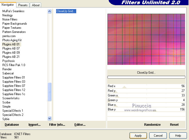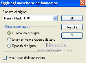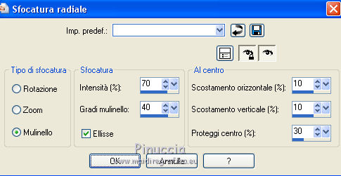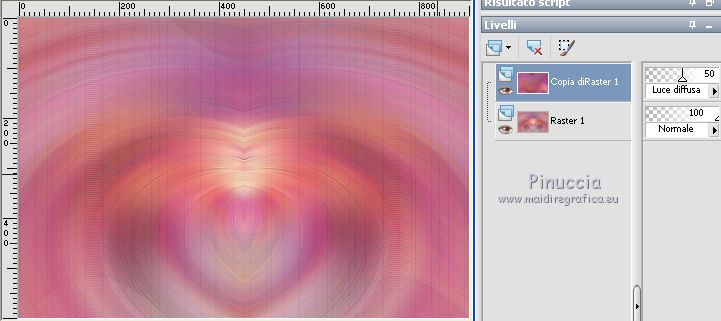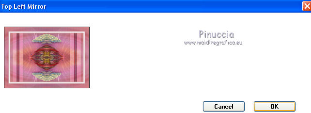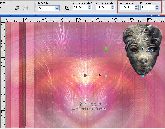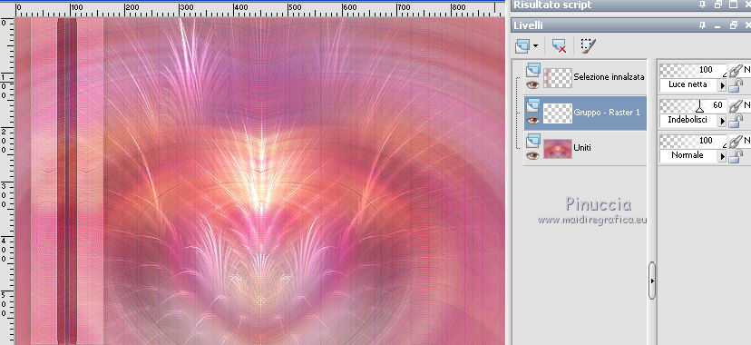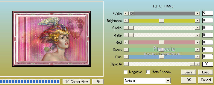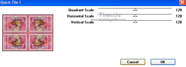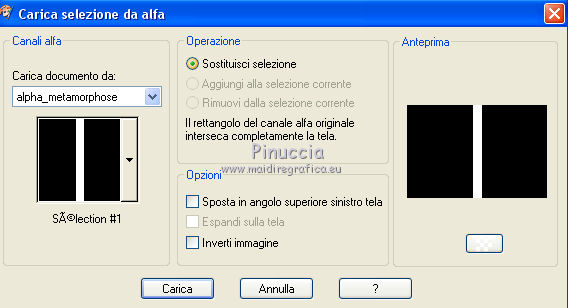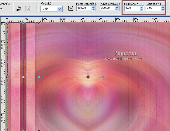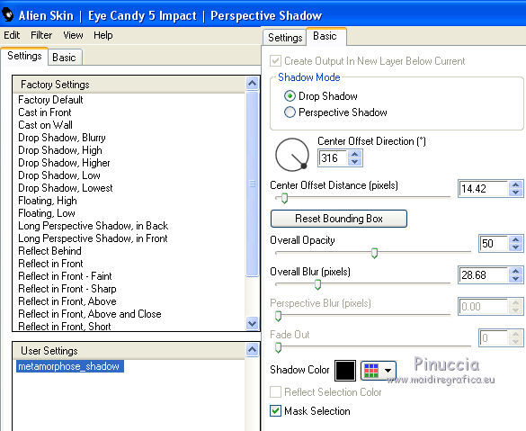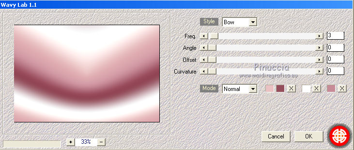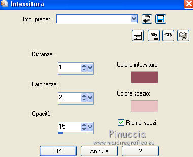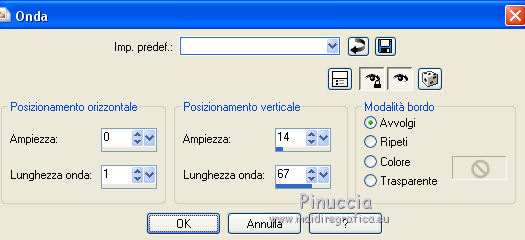 qui puoi trovare qualche risposta ai tuoi dubbi. Se l'argomento che ti interessa non è presente, ti prego di segnalarmelo. Questo tutorial è una creazione di Saturnella e non può essere copiato su altri siti nè essere offerto per il download. Lo stesso vale per la mia traduzione. E' anche proibito togliere il watermark dal materiale; rispettiamo il lavoro dei creatori di tubes, senza i quali non potremmo creare tutorials. Per tradurre questo tutorial, creato con Corel2018, ho usato CorelX7, ma può essere eseguito anche con le altre versioni di PSP. Dalla versione X4, il comando Immagine>Rifletti è stato sostituito con Immagine>Capovolgi in orizzontale, e il comando Immagine>Capovolgi con Immagine>Capovolgi in verticale. Nelle versioni X5 e X6, le funzioni sono state migliorate rendendo disponibile il menu Oggetti. Nel nuovo X7 sono tornati i comandi Immagine>Rifletti e Immagine>Capovolgi, ma con nuove funzioni. Vedi la scheda sull'argomento qui Occorrente: Materiale qui Per il tube della donna grazie Odette, per la maschera grazie Narah. Il resto del materiale è di Saturnella (in questa pagina trovi i links ai loro siti). Filtri in caso di dubbi, ricorda di consultare la mia sezione filtri qui Filters Unlimited 2.0 qui Mehdi - Wavy lab 1.1 qui Simple - Pizza slice mirror, Blintz, Top Left Mirror qui Graphics Plus - Quick Tile I qui AB 01 - Close Up, Grid qui Alien Skin Eye Candy 5 Impact - Perspective Shadow qui Toadies - What are you qui AAA Frames - Foto Frame qui I filtri Graphics Plus, Toadies e Simple si possono usare da soli o importati in Filters Unlimited (come fare vedi qui) Se un filtro fornito appare con questa icona ![]() non esitare a cambiare modalità di miscelatura e opacità secondo i colori utilizzati. Metti i preset Cliccando sul file una o due volte (a seconda delle tue impostazioni), automaticamente il preset si installerà nella cartella corretta. perchè uno o due clic vedi qui Se preferisci, puoi importare direttamente il preset nel corso del tutorial Come fare vedi la scheda del filtro Eye Candy qui Apri la maschera in PSP e minimizzala con il resto del materiale. 1. Imposta il colore di primo piano con il colore scuro #954f5c, e il colore di sfondo con il colore chiaro #eac2c3. ![]() Apri alpha_metamorphose. Finestra>Duplica, o sulla tastiera tasto della maiuscola+D per fare una copia. Chiudi l'originale. La copia, che sarà la base del tuo lavoro, non è vuota, ma contiene le selezioni salvate sul canale alfa. 2. Effetti>Plugins>Mehdi - Wavy Lab 1.1 Questo filtro crea gradienti con i colori della paletta: il primo è il colore di sfondo, il secondo quello di primo piano. Degli ultimi due colori creati dal filtro, cambia il terzo con il colore bianco #ffffff, e il quarto colore con #c78b97. ![]() 3. Selezione>Seleziona tutto. Apri l'immagine image_metamorphose e vai a Modifica>Copia. Torna al tuo lavoro e vai a Modifica>Incolla nella selezione. Selezione>Deseleziona. 4. Effetti>Effetti di immagine>Motivo unico, con i settaggi standard. ![]() 5. Regola>Sfocatura>Sfocatura radiale. ![]() 6. Effetti>Effetti di bordo>Aumenta di più. 7. Effetti>Effetti di riflesso>Specchio rotante. ![]() 8. Livelli>Duplica. Effetti>Plugins>Filters Unlimited 2.0 - Plugins AB 01 - Close up, Grid, con i settaggi standard. ![]() 9. Effetti>Effetti di distorsione>Onda. ![]() Cambia la modalità di miscelatura di questo livello in Luce diffusa, e abbassa l'opacità al 50% (o altro) ![]() Livelli>Unisci>Unisci visibile. 10. Selezione>Carica/Salva selezione>Carica selezione da canale alfa. La selezione #1 è subito disponibile. Devi soltanto cliccare Carica. ![]() Selezione>Innalza selezione a livello. 11. Effetti>Effetti 3D>Sfalsa ombra. ![]() Selezione>Deseleziona. 12. Effetti>Plugins>Toadies - What are you. ![]() Effetti>Effetti di bordo>Aumenta. Cambia la modalità di miscelatura di questo livello in Luce netta. Tasto K per attivare lo strumento Puntatore ![]() e imposta Posizione X: 9,00 e Posizione Y 0,00. ![]() 13. Attiva il livello di sfondo. Livelli>Nuovo livello raster. Imposta il colore di primo piano con il colore bianco. Riempi il livello con il colore bianco.Livelli>Nuovo livello maschera>Da immagine. Apri il menu sotto la finestra di origine e vedrai la lista dei files aperti. Seleziona la maschera Narah_Mask_1184. ![]() Effetti>Effetti di bordo>Aumenta di più. Livelli>Unisci>Unisci gruppo. Cambia la modalità di miscelatura di questo livello in Indebolisci, e abbassa l'opacità al 60%. ![]() 14. Effetti>Effetti 3D>Sfalsa ombra. ![]() 15. Attiva il livello superiore. Apri il tube fant_05 e vai a Modifica>Coipia. Torna al tuo lavoro e vai a Modifica>Incolla come nuovo livello. Cancella la firma. Immagine>Ridimensiona, 2 volte al 70%, tutti i livelli non selezionato. Regola>Messa a fuoco>Maschera di contrasto, con i settaggi precedenti. Tasto K per attivare lo strumento Puntatore ![]() e imposta Posizione X: 567,00 e Posizione Y -6,00. ![]() Cambia la modalità di miscelatura di questo livello in Luminanza (esistente), e abbassa l'opacità al 40%. 16. Apri il tube della donna di Odette e vai a Modifica>Copia. Torna al tuo lavoro e vai a Modifica>Incolla come nuovo livello. Immagine>Ridimensiona, all'80%, tutti i livelli non selezionato. Regola>Messa a fuoco>Maschera di contrasto, con i settaggi precedenti. 17. Effetti>Plugins>Alien skin Eye Candy 5 Impact - Perspective Shadow. Seleziona il preset Metamorphose_shadow e ok. ![]() 18. Attiva il livello di sfondo. Modifica>Copia. Immagine>Aggiungi bordatura, 1 pixel, simmetriche, colore scuro. Immagine>Aggiungi bordatura, 3 pixels, simmetriche, colore chiaro. Immagine>Aggiungi bordatura, 1 pixel, simmetriche, colore scuro. 19. Selezione>Seleziona tutto. Immagine>Aggiungi bordatura, 15 pixels, simmetriche, colore bianco. Selezione>Inverti. Effetti>Effetti di trama>Intessitura colore intessitura: colore di primo colore spazo: colore di sfondo ![]() Selezione>Deseleziona. 20. Immagine>Aggiungi bordatura, 1 pixel, simmetriche, 