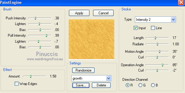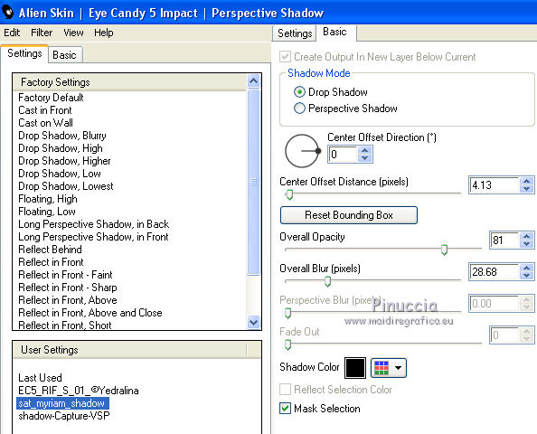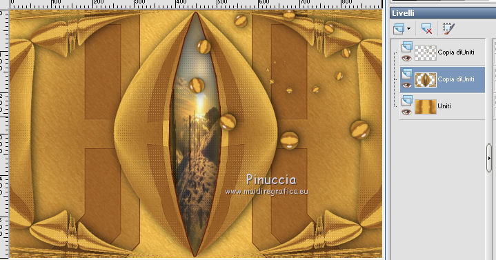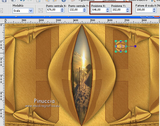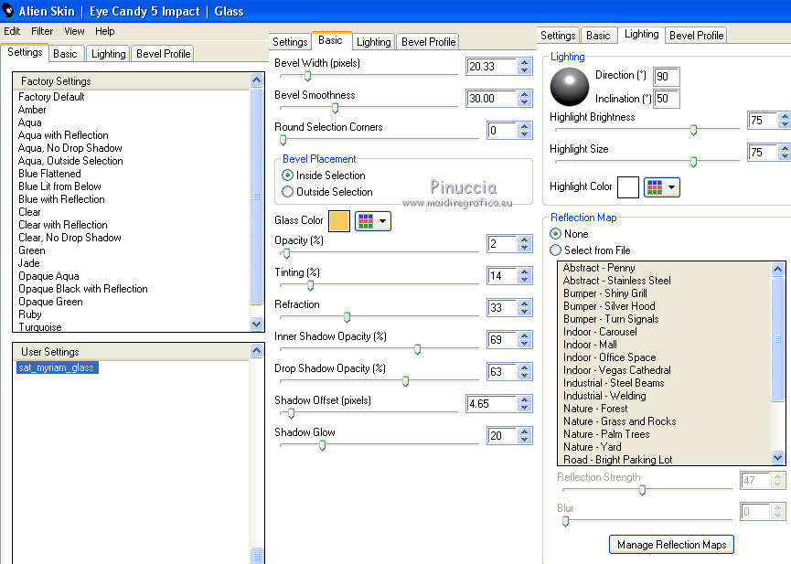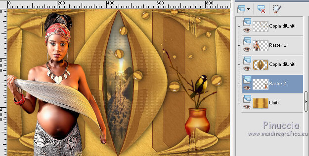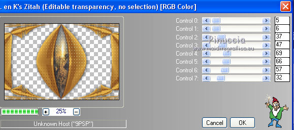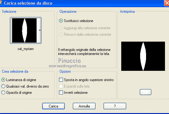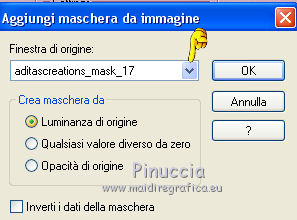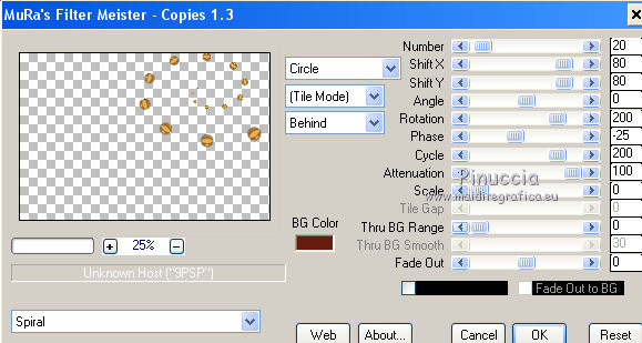 qui puoi trovare qualche risposta ai tuoi dubbi. Se l'argomento che ti interessa non è presente, ti prego di segnalarmelo. Questo tutorial è una creazione di Saturnella e non può essere copiato su altri siti nè essere offerto per il download. Lo stesso vale per la mia traduzione. E' anche proibito togliere il watermark dal materiale; rispettiamo il lavoro dei creatori di tubes, senza i quali non potremmo creare tutorials. Per tradurre questo tutorial, creato con PSP18, ho usato CorelX, ma può essere eseguito anche con le altre versioni di PSP. Dalla versione X4, il comando Immagine>Rifletti è stato sostituito con Immagine>Capovolgi in orizzontale, e il comando Immagine>Capovolgi con Immagine>Capovolgi in verticale. Nelle versioni X5 e X6, le funzioni sono state migliorate rendendo disponibile il menu Oggetti. Nel nuovo X7 sono tornati i comandi Immagine>Rifletti e Immagine>Capovolgi, ma con nuove funzioni. Vedi la scheda sull'argomento qui Occorrente: Materiale qui Per i tubes e la maschera grazie Guismo, Anny, Ann e Adita. (in questa pagina trovi i links ai loro siti). Filtri in caso di dubbi, ricorda di consultare la mia sezione filtri qui Filters Unlimited 2.0 qui Toadies - What are you qui Fantastic Machine - Paint Engine qui L&K's - L&K Zitah qui Alien Skin Eye Candy 5 Impact - Perspective Shadow, Glass qui Mura's Meister - Copies qui I filtri Toadies si possono usare da soli o importati in Filters Unlimited (come fare vedi qui) Se un filtro fornito appare con questa icona ![]() non esitare a cambiare modalità di miscelatura e opacità secondo i colori utilizzati. Metti i preset Cliccando sul file una o due volte (a seconda delle tue impostazioni), automaticamente il preset si installerà nella cartella corretta. perchè uno o due clic vedi qui Metti la selezione nella cartella Selezioni. Apri la maschera in PSP e minimizzala con il resto del materiale. Imposta il colore di primo piano con il colore chiaro #fcc95e, e il colore di sfondo con il colore scuro #651c0d. ![]() 1. Apri una nuova immagine trasparente 900 x 600 pixels, e riempi con il colore chiaro.2. Regola>Aggiungi/Rimuovi disturbo>Aggiungi disturbo. ![]() 3. Effetti>Plugins>Fantastic Machine - Paint Engine. ![]() Se non trovi il preset growth nella lista dei preset, imposta manualmente i settaggi che vedi nella schermata. Vedi qui le particolarità di questo filtro 4. Livelli>Nuovo livello raster. Riempi con il colore scuro.5. Livelli>Nuovo livello maschera>Da immagine. Apri il menu sotto la finestra di origine e vedrai la lista dei files aperti. Seleziona la maschera aditascreations_mask_17 ![]() Regola>Messa a fuoco>Accentua messa a fuoco. Livelli>Unisci>Unisci gruppo. 6. Effetti>Effetti 3D>Sfalsa ombra, colore nero. ![]() Livelli>Unisci>Unisci visibile. 7. Livelli>Duplica. 8. Effetti>Effetti geometrici>Cerchio. ![]() 9. Ripeti Effetti>Effetti geometrici>Cerchio, questa volta Avvolgi selezionato. ![]() 10. Selezione>Carica/Salva selezione>Carica selezione da disco. Cerca e carica la selezione sat_myriam. ![]() Premi sulla tastiera il tasto CANC .11. Livelli>Nuovo livello raster. Apri il tube del paesaggio e vai a Modifica>Copia. Trona al tuo lavoro e vai a Modifica>Incolla nella selezione. 12. Livelli>Nuovo livello raster. Effetti>Effetti 3D>Ritaglio. ![]() 13. Livelli>Unisci>Unisci giù - 2 volte. 14. Selezione>Modifica>Seleziona bordature selezione. ![]() Riempi con il colore scuro.Selezione>Deseleziona. 15. Effetti>Plugins>Alien Skin Eye Candy 5 Impact - Perspective Shadow. Seleziona il preset sat_myriam_shadow e ok. Questi i settaggi, in caso di problemi con il preset. ![]() 16. Effetti>Plugins>L&K's - L&K Zitah ![]() 17. Attiva il livello di sfondo. Livelli>Duplica. 18. Effetti>Effetti geometrici>Cerchio. ![]() 19. Livelli>Disponi>Porta in alto. Immagine>Ridimensiona, al 10%, tutti i livelli non selezionato. 20. Immagine>Ruota per gradi - 90 gradi a sinistra. ![]() Regola>Messa a fuoco>Metti a fuoco. 21. Per posizionare lo sfera: tasto K per attivare lo strumento Puntatore ![]() se stai usando PSP 9 tasto D per attivare lo strumento Deformazione ![]() imposta le coordinate Posizione X: 646,00 - Posizione Y: 102,00 ![]() 22. Effetti>Plugins>Alien Skin Eye Candy 5 Impact - Glass. Seleziona il preset sat_myriam_glass e ok. ![]() 23. Effetti>Plugins>Mura's Meister - Copies. ![]() 24. Effetti>Plugins>Alien Skin Eye Candy 5 Impact - Perspective Shadow, con i settaggi precedenti. 25. Attiva il livello centrale. ![]() 26. Apri il tube della donna di Guismo e vai a Modifica>Copia. Torna al tuo lavoro e vai a Modifica>Incolla come nuovo livello. Immagine>Ridimensiona, al 70%, tutti i livelli non selezionato. Regola>Messa a fuoco>Metti a fuoco. Effetti>Effetti 3D>Sfalsa ombra, colore nero. ![]() Sposta il tube a sinistra.27. Apri il tube del vaso e vai a Modifica>Copia. Torna al tuo lavoro e vai a Modifica>Incolla come nuovo livello. Sposta il tube a destra.Porta questo livello sopra il livello di sfondo. ![]() Effetti>Effetti 3D>Sfalsa ombra, con i settaggi precedenti. 28. Attiva il livello di sfondo. Modifica>copia. Livelli>Unisci>Unisci tutto. 29. Immagine>Aggiungi bordatura, 2 pixels, simmetriche, colore scuro. Immagine>Aggiungi bordatura, 50 pixels, simmetriche, colore chiaro. 30. Attiva lo strumento Bacchetta magica ![]() e clicca nel bordo da 50 pixels per selezionarlo. 31. Modifica>Incolla nella selezione (hai in memoria il livello di sfondo). Selezione>Innalza selezione a livello. 32. Effetti>Plugins>Toadies - What are you - 2 volte con i settaggi standard. ![]() 33. Effetti>Effetti di bordo>Aumenta di più. Selezione>Inverti. 34. Effetti>Effetti 3D>Sfalsa ombra, colore nero. ![]() Selezione>Deseleziona. 35. Immagine>Aggiungi bordatura, 2 pixels, simmetriche, colore chiaro. 36. Firma il tuo lavoro. Immagine>Ridimensiona, a 900 pixels di larghezza, tutti i livelli selezionato. Salva in formato jpg. Per questo esempio ho usato tubes di Krys ![]() ![]() Puoi scrivermi per qualsiasi problema, o dubbio, se trovi un