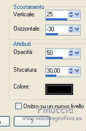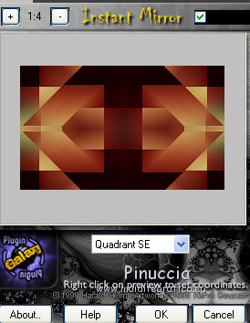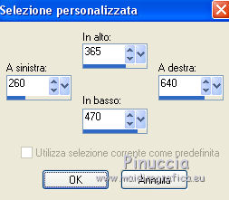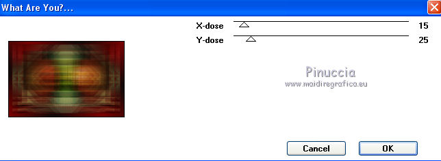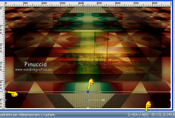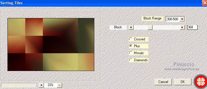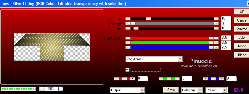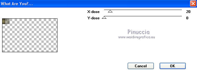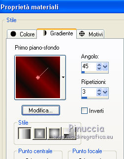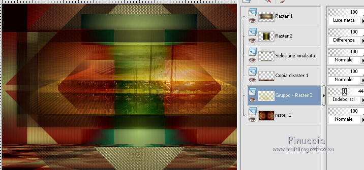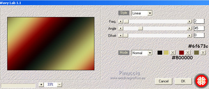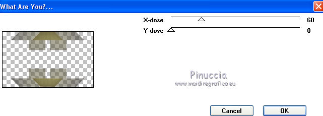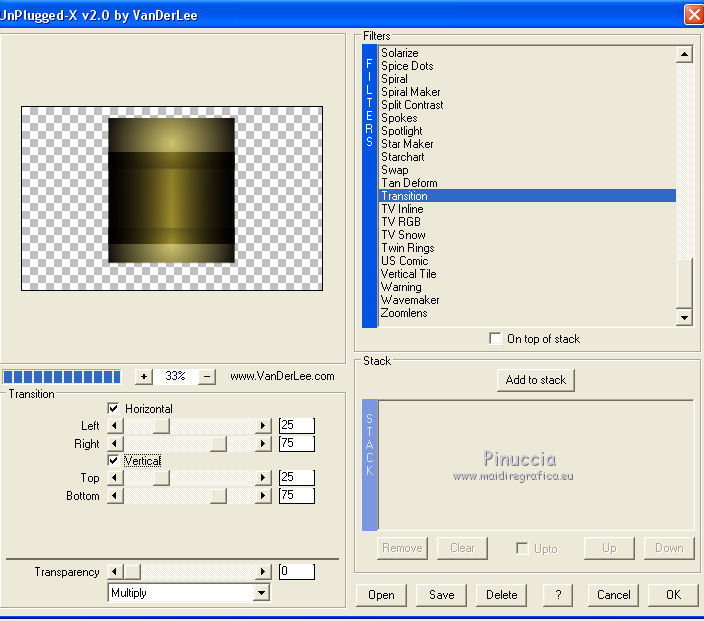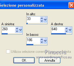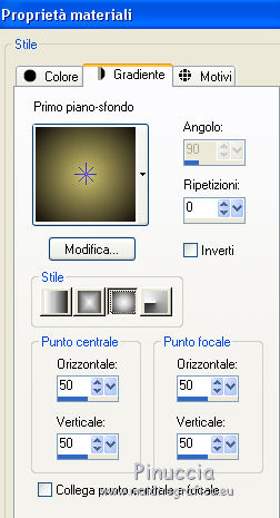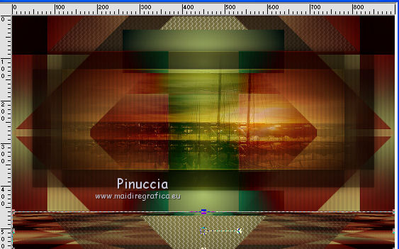 qui puoi trovare qualche risposta ai tuoi dubbi. Se l'argomento che ti interessa non è presente, ti prego di segnalarmelo. Questo tutorial è una creazione di Saturnella e non può essere copiato su altri siti nè essere offerto per il download. Lo stesso vale per la mia traduzione. E' anche proibito togliere il watermark dal materiale; rispettiamo il lavoro dei creatori di tubes, senza i quali non potremmo creare tutorials. Il tutorial è stato scritto con CorelX15, ma può essere eseguito anche con le altre versioni di PSP. Dalla versione X4, il comando Immagine>Rifletti è stato sostituito con Immagine>Capovolgi in orizzontale, e il comando Immagine>Capovolgi con Immagine>Capovolgi in verticale. Nelle versioni X5 e X6, le funzioni sono state migliorate rendendo disponibile il menu Oggetti. Vedi la scheda sull'argomento qui Per tradurre questo tutorial ho usato PSP X. Occorrente: Materiale qui Per i tubes utilizzati grazie Roby e MJR. Per la maschera grazie Narah. Il tube del paesaggio è di Saturnella. (in questa pagina trovi i links ai loro siti). Filtri in caso di dubbi, ricorda di consultare la mia sezione filtri qui Filters Unlimited 2.0 qui Mehdi - Sorting Tiles qui Toadies - What are you qui Mehdi - Wavy Lab 1.1 qui Plugin Galaxy - Instant Mirror qui Mura's Meister - Perspective Tiling qui AP 01 [Innovations] - Lines SilverLining qui VanDerLee - Unplugged-X qui Simple - Blintz qui I filtri Toadies e Simple si possono usare da soli o importati in Filters Unlimited (come fare vedi qui) Se un filtro fornito appare con questa icona ![]() non esitare a cambiare modalità di miscelatura e opacità secondo i colori utilizzati. Apri la maschera in PSP e minimizzala con il resto del materiale. 1. Imposta il colore di primo piano con il colore chiaro #cfc46e, e il colore di sfondo con il colore scuro #0f0b0a ![]() Passa il colore di primo piano a Gradiente di primo piano/sfondo, stile Sprazzo di luce. ![]() Apri alpha_natacha. Finestra>Duplica, o sulla tastiera maiuscola+D, per fare una copia. Chiudi l'originale. La copia, che sarà la base del tuo lavoro, non è vuota, ma contiene le selezioni salvate sul canale alfa. Rinomina il livello Raster 1. Effetti>Plugins>Mehdi - Wavy Lab 1.1. Il filtro lavora con i colori della paletta dei materiali. Il primo è il colore di sfondo, il secondo quello di primo piano. Cambia il terzo colore con #800000, e mantieni il quarto colore creato dal filtro (#6f673c). ![]() 2. Regola>Sfocatura>Sfocatura radiale. ![]() 3. Effetti>Plugins>Mehdi - Sorting Tiles. ![]() Regola>Messa a fuoco>Accentua messa a fuoco. 4. Effetti>Plugins>Simple - Blintz - 2 volte. Risultato. ![]() 5. Effetti>Plugins>The Plugin Site - Instant Mirror. questa è la denominazione assunta dal filtro Galaxy nella lista dei Filtri ![]() 6. Selezione>Carica/Salva selezione>Carica selezione da canale alfa. La selezione selection#1 è subito disponibile. Devi soltanto cliccare Carica. ![]() Selezione>Innalza selezione a livello. Riempi la selezione con il gradiente.7. Effetti>Plugins>AP 01 [Innovations] - Lines SilverLining. ![]() Selezione>Deseleziona. 8. Livelli>Duplica. Immagine>Capovolgi. Livelli>Unisci>Unisci giù. 9. Effetti>Plugins>Toadies - What are you. ![]() 10. Attiva il livello di sfondo - Raster 1. Effetti>Effetti di trama>Veneziana. ![]() 11. Attiva nuovamente il livello soprastante. Attiva lo strumento Selezione ![]() (non importa il tipo di selezione impostato, perchè con la selezione personalizzata si ottiene sempre un rettangolo) clicca sull'icona Selezione personalizzata ![]() e imposta i seguenti settaggi. ![]() Premi sulla tastiera il tasto CANC ![]() Mantieni selezionato. Livelli>Nuovo livello raster. Riempi con il gradiente.Selezione>Deseleziona. 12. Attiva nuovamente il livello della selezione innalzata. ![]() Selezione personalizzata ![]() ![]() Premi sulla tastiera il tasto CANC ![]() Mantieni selezionato. Livelli>Nuovo livello raster. Riempi con il gradiente.Selezione>Deseleziona. 13. Attiva il livello superiore. Livelli>Unisci>Unisci giù. Per il mio esempio ho cambiato la modalità di miscelatura di questo livello in Differenza. ![]() 14. Effetti>Plugins>VanDerLee - Unplugged-X - Transition. ![]() 15. Livelli>Unisci>Unisci visibile. Selezione>Carica/Salva selezione>Carica selezione da canale alfa. Apri il menu delle selezioni e carica selection#2. ![]() Livelli>Nuovo livello raster. Riempi con il gradiente.Livelli>Nuovo livello raster. Apri il tube del paesaggio e vai a Modifica>Copia. Torna al tuo lavoro e vai a Modifica>Incolla nella selezione. Selezione>Deseleziona. Livelli>Unisci>Unisci giù. 16. Effetti>Plugins>Toadies - What are you. ![]() Effetti>Effetti di bordo>Aumenta. Cambia la modalità di miscelatura di questo livello in Luce netta. ![]() 17. Effetti>Effetti 3D>Sfalsa ombra. ![]() 18. Effetti>Effetti di immagine>Scostamento. ![]() 19. Attiva il livello di sfondo. ![]() Livelli>Duplica. Effetti>Plugins>Mura's Meister - Perspective Tiling. ![]() 20. Premi il tasto K per attivare lo strumento Puntatore ![]() se stai usando PSP 9 il tasto D per attivare lo strumento Deformazione ![]() in modalità Scala, spingi il nodo superiore centrale verso il basso fino a 460 pixels (se non visualizzi i Righelli, vai a Visualizza>Righelli) Puoi controllare la posizione nella barra inferiore. ![]() Risultato. ![]() Premi il tasto M per disattivare lo strumento. 21. Effetti>Effetti 3D>Sfalsa ombra, con i settaggi precedenti. 22. Attiva nuovamente il livello inferiore. Riporta il colore di primo piano al colore iniziale. ![]() Livelli>Nuovo livello raster. Riempi con il colore chiaro di primo piano.23. Livelli>Nuovo livello maschera>Da immagine. Apri il menu sotto la finestra di origine e vedrai la lista dei files aperti. Seleziona la maschera Narah_mask_0600, con i seguenti settaggi. ![]() Livelli>Unisci>Unisci gruppo. Immagine>Capovolgi. Cambia la modalità di miscelatura di questo livello in Indebolisci, e abbassa l'opacità al 44% (o secondo i tuoi colori). ![]() R