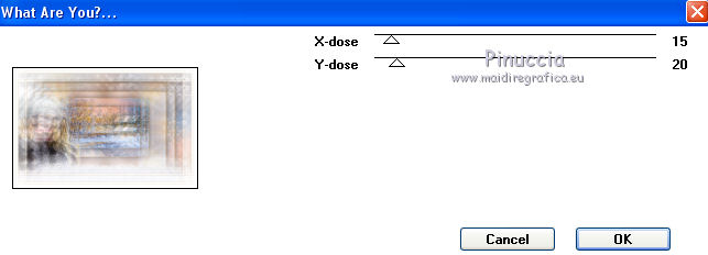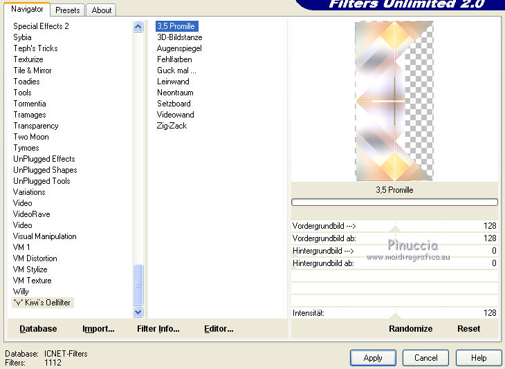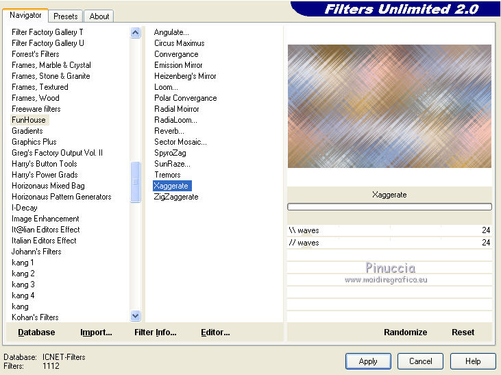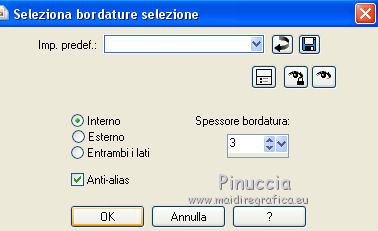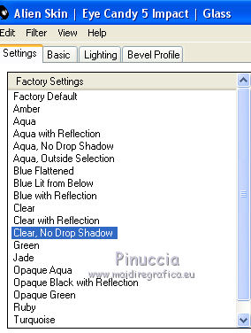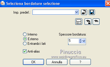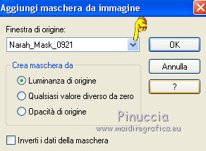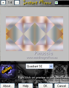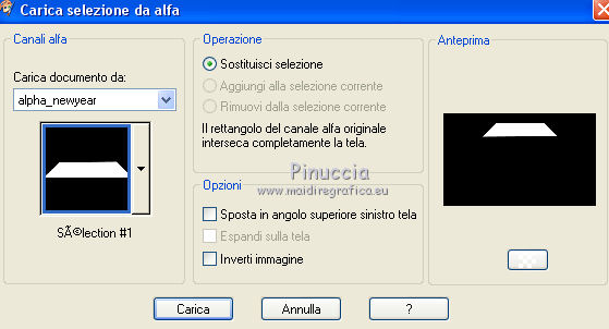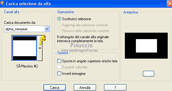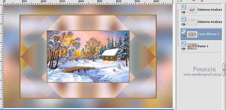 qui puoi trovare qualche risposta ai tuoi dubbi. Se l'argomento che ti interessa non è presente, ti prego di segnalarmelo. Questo tutorial è una creazione di Saturnella e non può essere copiato su altri siti nè essere offerto per il download. Lo stesso vale per la mia traduzione. E' anche proibito togliere il watermark dal materiale; rispettiamo il lavoro dei creatori di tubes, senza i quali non potremmo creare tutorials. Per tradurre questo tutorial, creato con PSP18, ho usato CorelX, ma può essere eseguito anche con le altre versioni di PSP. Dalla versione X4, il comando Immagine>Rifletti è stato sostituito con Immagine>Capovolgi in orizzontale, e il comando Immagine>Capovolgi con Immagine>Capovolgi in verticale. Nelle versioni X5 e X6, le funzioni sono state migliorate rendendo disponibile il menu Oggetti. Nel nuovo X7 sono tornati i comandi Immagine>Rifletti e Immagine>Capovolgi, ma con nuove funzioni. Vedi la scheda sull'argomento qui Occorrente: Materiale qui Grazie per i tubes CibiBijoux; per la maschera Narah. (in questa pagina trovi i links ai loro siti). Filtri in caso di dubbi, ricorda di consultare la mia sezione filtri qui Filters Unlimited 2.0 qui Kiwi Oelfilter - 3,5 Promille qui Simple - Pizza Slice Mirror, Blintz qui Plugin Galaxy - Instant Mirror qui AP Lines - Lines SilverLining qui Funhouse - Xaggerate qui Alien Skin Eye Candy 5 Impact - Glass qui Toadies - What are you qui I filtri Simple, Kiwi, Funhouse e Toadies si possono usare da soli o importati in Filters Unlimited (come fare vedi qui) Se un filtro fornito appare con questa icona Animation Shop qui ![]() non esitare a cambiare modalità di miscelatura e opacità secondo i colori utilizzati. Nelle ultime versioni di PSP non c'è il gradiente di primo piano/sfondo (Corel_06_029) Trovi i gradienti delle versioni precedenti qui Apri il font e minimizzalo. Lo troverai nella lista dei font disponibili quando ti servirà. Con i nuovi sistemi operativi questo non è più possibile: per usare un font occorre copiarlo nella cartella Font di Windows. Apri la maschera in PSP e minimizzala con il resto del materiale, tranne la gif che userai in Animation Shop. 1. Imposta il colore di primo piano con il colore scuro #bd8a40, e il colore di sfondo con il colore bianco #ffffff. ![]() Apri alpha_newyear. Finestra>Duplica o sulla tastiera maiuscola+D per fare una copia. ![]() Chiudi l'originale. La copia, che sarà la base del tuo lavoro, non è vuota, ma contiene le selezioni salvate sul canale alfa. 2. Selezione>Seleziona tutto. Apri l'immagine image_hiver e vai a Modifica>Copia. Torna al tuo lavoro e vai a Modifica>Incolla nella selezione. Selezione>Deseleziona. 3. Effetti>Effetti di immagine>Motivo unico, con i settaggi standard. ![]() 4. Regola>Sfocatura>Sfocatura gaussiana - raggio 30. ![]() 5. Livelli>Duplica. Effetti>Plugins>Simple - Pizza Slice Mirror. 6. Effetti>Plugins>Simple - Blintz. 7. Livelli>Duplica. Immagine>Rifletti. Cambia la modalità di miscelatura di questo livello in Sovrapponi, o altro. Livelli>Unisci>Unisci giù. 8. Effetti>Plugins>The Plugin Site - Instant Mirror i filtri Galaxy nella lista si posizionano come The Plugin Site ![]() 9. Immagine>Ridimensiona, all'80%, tutti i livelli non selezionato. 10. Selezione>Seleziona tutto. Selezione>Mobile. Selezione>Modifica>Seleziona bordature selezione. ![]() Livelli>Nuovo livello raster. Riempi con il colore scuro.11. Effetti>Plugins>Alien Skin Eye Candy 5 Impact - Glass. Seleziona il preset Clear,no Drop Shadow e ok. ![]() Livelli>Unisci>Unisci giù. Selezione>Deseleziona. 12. Selezione>Carica/Salva selezione>Carica selezione da canale alfa. La selezione sélection#1 è subito disponibile. Devi soltanto cliccare Carica. ![]() Selezione>Innalza selezione a livello. 13. Effetti>Plugins>AP 01 Innovations - Lines SilverLining. ![]() Selezione>Deseleziona. 14. Livelli>Duplica. Immagine>Rifletti. Livelli>Unisci>Unisci giù. 15. Attiva il livello sottostante. Selezione>Carica/Salva selezione>Carica selezione da canale alfa. Apri il menu delle selezioni e carica sélection#2. ![]() Selezione>Innalza selezione a livello. Modifica>Incolla nella selezione (l'immagine image_hiver è sempre in memoria). 16. Selezione>Modifica>Seleziona bordature selezione. ![]() Livelli>Nuovo livello raster. Riempi con il colore scuro.17. Effetti>Plugins>Alien Skin Eye Candy 5 Impact - Glass, con i settaggi precedenti. Livelli>Unisci>Unisci giù. Selezione>Deseleziona. 18. Livelli>Disponi>Porta in alto. Attiva il livello Copia di Raster 1. ![]() Selezione>Carica/Salva selezione>Carica selezione da canale alfa. Apri il menu delle selezioni e carica sélection#3. ![]() Selezione>Innalza selezione a livello. 19. Effetti>Plugins>Filters Unlimited 2.0 - Kiwi's Oelfilter - 3,5 Promille, con i settaggi standard. ![]() Abbassa l'opacità di questo livello all'80%, o secondo i tuoi colori. Livelli>Duplica. Immagine>Rifletti. Livelli>Unisci>Unisci giù. 20. Attiva il livello superiore (il quadro). Effetti>Effetti 3D>Sfalsa ombra. ![]() 21. Chiudi il livello di sfondo (Raster 1), e rimani posizionato sul livello superiore. Livelli>Unisci>Unisci visibile. 22. Effetti>Effetti 3D>Sfalsa ombra, con i settaggi precedenti. 23. Riapri e attiva il livello Raster 1. Effetti>Plugins>Filters Unlimited 2.0 - Funhouse - Xaggerate, con i settaggi standard. ![]() 24. Attiva il livello superiore. Apri il tube neige e vai a Modifica>Copia. Torna al tuo lavoro e vai a Modifica>Incolla come nuovo livello. Posiziona correttamente il tube in basso.Livelli>Duplica. Immagine>Rifletti. Livelli>Unisci>Unisci giù. 25. Apri il tube della donna di CibiBijoux e vai a Modifica>Copia. Torna al tuo lavoro e vai a Modifica>Incolla come nuovo livello. Livelli>Disponi>Sposta giù. Posiziona a sinistra.26. Effetti>Effetti 3D>Sfalsa ombra. ![]() 27. Attiva il livello di sfondo Raster 1. Livelli>Nuovo livello raster. Riempi con il colore bianco.Livelli>Nuovo livello maschera>Da immagine. Apri il menu sotto la finestra di origine 