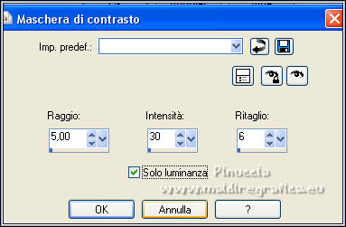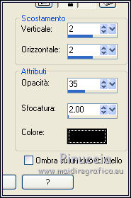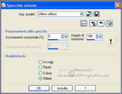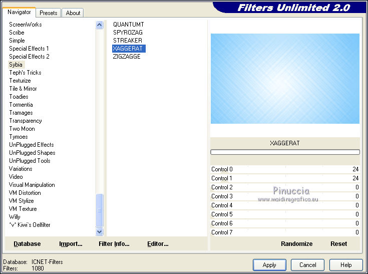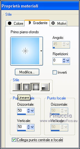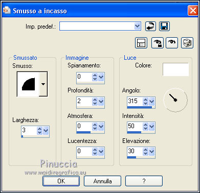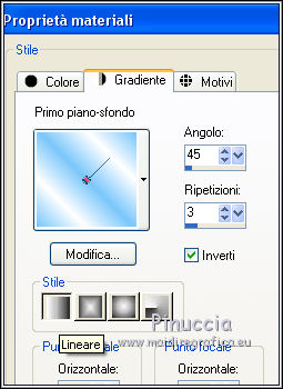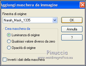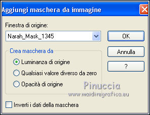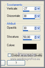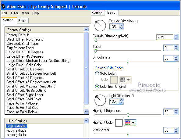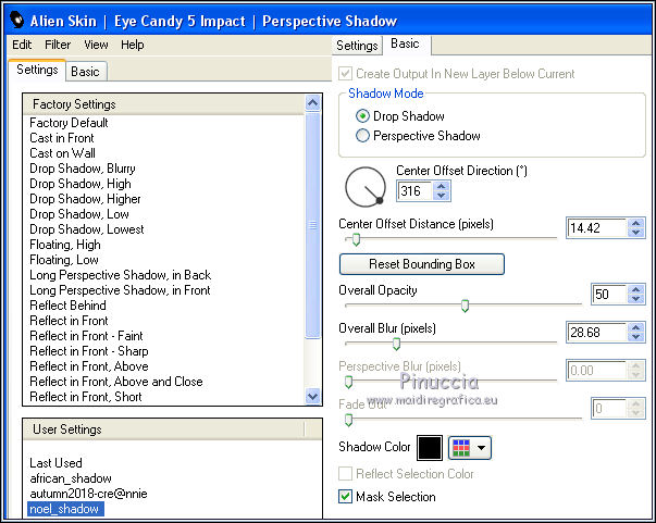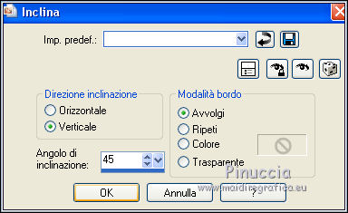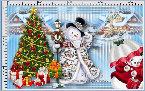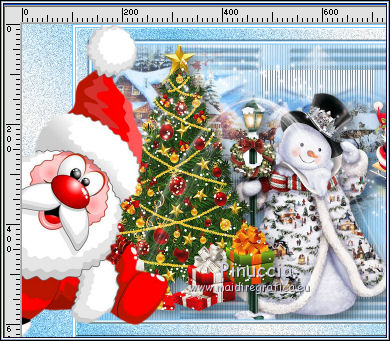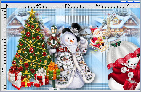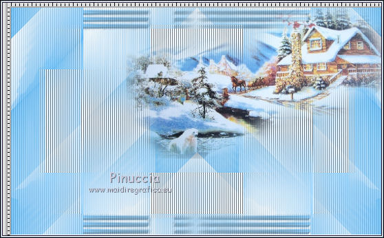 qui puoi trovare qualche risposta ai tuoi dubbi. Se l'argomento che ti interessa non è presente, ti prego di segnalarmelo. Questo tutorial è una creazione di Saturnella e non può essere copiato su altri siti nè essere offerto per il download. Lo stesso vale per la mia traduzione. E' anche proibito togliere il watermark dal materiale; rispettiamo il lavoro dei creatori di tubes, senza i quali non potremmo creare tutorials. Per tradurre questo tutorial, creato con Corel2018, ho usato CorelX, ma può essere eseguito anche con le altre versioni di PSP. Dalla versione X4, il comando Immagine>Rifletti è stato sostituito con Immagine>Capovolgi in orizzontale, e il comando Immagine>Capovolgi con Immagine>Capovolgi in verticale. Nelle versioni X5 e X6, le funzioni sono state migliorate rendendo disponibile il menu Oggetti. Nel nuovo X7 sono tornati i comandi Immagine>Rifletti e Immagine>Capovolgi, ma con nuove funzioni. Vedi la scheda sull'argomento qui ![]() Occorrente: Materiale qui Per le maschere grazie Narah. Il resto del materiale è di Saturnella. (in questa pagina trovi i links ai loro siti). Filtri in caso di dubbi, ricorda di consultare la mia sezione filtri qui Filters Unlimited 2.0 qui Mehdi - Sorting Tiles qui Sybia - Xaggerate qui AP 01 [Innovations] - Lines SilverLining qui Alien Skin Eye Candy 5 Impact - Perspective Shadow, Extrude qui I filtri Sybia si possono usare da soli o importati in Filters Unlimited (come fare vedi qui) Se un filtro fornito appare con questa icona ![]() non esitare a cambiare modalità di miscelatura e opacità secondo i colori utilizzati. Nelle ultime versioni di PSP non c'è il gradiente di primo piano/sfondo (Corel_06_029) Puoi usare i gradienti delle versioni precedenti. Trovi qui i gradienti Corel X. Metti i preset Cliccando sul file una o due volte (a seconda delle tue impostazioni), automaticamente il preset si installerà nella cartella corretta. perchè uno o due clic vedi qui Se preferisci, puoi importare direttamente il preset nel corso del tutorial Come fare vedi la scheda del filtro Eye Candy qui Apri le maschere in PSP e minimizzale con il resto del materiale. colori utilizzati ![]() Attenzione: non dimenticare di togliere la firma prima di copiare i tubes. 1. Imposta il colore di primo piano con il colore bianco #ffffff, e il colore di sfondo con il colore #79c6fa. ![]() Passa il colore di primo piano a Gradiente di primo piano/sfondo, stile Sprazzo di luce. ![]() Apri una nuova immagine trasparente 900 x 550 pixels, e riempila con il gradiente.2. Regola>Sfocatura>Sfocatura gaussiana, raggio 30 ![]() 3. Effetti>Plugins>Filters Unlimited 2.0 - Sybia - Xaggerate. ![]() Effetti>Effetti di bordo>Aumenta. 4. Effetti>Plugins>Mehdi - Sorting Tiles. ![]() Regola>Messa a fuoco>Accentua messa a fuoco. 5. Effetti>Effetti di riflesso>Specchio rotante. ![]() 6. Livelli>Duplica. Effetti>Effetti geometrici>Inclina. ![]() Livelli>Unisci>Unisci visibile. 7. Effetti>Effetti di riflesso>Specchio rotante, con i settaggi precedenti. ![]() 8. Livelli>Nuovo livello raster. Riempi con il colore di sfondo.Livelli>Nuovo livello maschera>Da immagine. Apri il menu sotto la finestra di origine e vedrai la lista dei files aperti. Seleziona la maschera Narah_Mask_1335 ![]() Effetti>Effetti di bordo>Aumenta di più. Livelli>Unisci>Unisci gruppo. 9. Effetti>Plugins>Alien Skin Eye Candy 5 Impact - Extrude seleziona il preset noel_extrude e ok. Questi i settaggi, in caso di problemi con il preset. ![]() 10. Immagine>Ruota per gradi - 90 gradi a sinistra. ![]() 11. Livelli>Nuovo livello raster. Riporta il colore di primo piano a Colore. Riempi il livello con il colore bianco.Livelli>Nuovo livello maschera>Da immagine. Apri il menu sotto la finestra di origine e seleziona la maschera Narah_Mask_1260 ![]() Effetti>Effetti di bordo>Aumenta. Livelli>Unisci>Unisci gruppo. 12. Effetti>Plugins>AP 01 [Innovations] - Lines SilverLining. ![]() 13. Effetti>Effetti 3D>Sfalsa ombra, colore di sfondo. ![]() 14. Apri il tube del paesaggio e vai a Modifica>Copia. Torna al tuo lavoro e vai a Modifica>Incolla come nuovo livello. Spostalo in alto a destra.![]() 15. Livelli>Duplica. Immagine>Rifletti. Livelli>Unisci>Unisci giù. 16. Apri il tube dell'albero e vai a Modifica>Copia. Torna al tuo lavoro e vai a Modifica>Incolla come nuovo livello. Immagine>Ridimensiona, al 70%, tutti i livelli non selezionato. Spostalo a sinistra.Regola>Messa a fuoco>Metti a fuoco. 17. Effetti>Plugins>Alien Skin Eye Candy 5 Impact - Perspective Shadow seleziona il preset noel_shadow e ok. Questi i settaggi, in caso di problemi con il preset. ![]() 18. Apri il tube del pupazzo di neve e vai a Modifica>Copia. Torna al tuo lavoro e vai a Modifica>Incolla come nuovo livello. Immagine>Rifletti. Immagine>Ridimensiona, una volta al 70% e una volta all'85%, tutti i livelli non selezionato. Regola>Messa a fuoco>Metti a fuoco. Spostalo a fianco dell'albero.Livelli>Disponi>Sposta giù. ![]() Effetti>Plugins>Alien Skin Eye Candy 5 Impact - Perspective Shadow, con i settaggi precedenti. 19. Attiva nuovamente il livello superiore. Apri il tube del personaggio e vai a Modifica>Copia. Torna al tuo lavoro e vai a Modifica>Incolla come nuovo livello. Immagine>Ridimensiona, al 45%, tutti i livelli non selezionato. Regola>Messa a fuoco>Metti a fuoco. Spostalo a destra.![]() Effetti>Plugins>Alien Skin Eye Candy 5 Impact - Perspective Shadow, con i settaggi precedenti. 20. Apri il tube del babbo natale sulla slitta e vai a Modifica>Copia. Torna al tuo lavoro e vai a Modifica>Incolla come nuovo livello. Immagine>Ridimensiona, al 25%, tutti i livelli non selezionato. Regola>Messa a fuoco>Metti a fuoco. Spostalo in alto a destra.![]() Effetti>Plugins>Alien Skin Eye Candy 5 Impact - Perspective Shadow, con i settaggi precedenti. 21. Livelli>Nuovo livello raster. Riempi con il colore bianco.Livelli>Nuovo livello maschera>Da immagine. Apri il menu sotto la finestra di origine e seleziona la maschera Narah_Mask_1345 ![]() Livelli>Unisci>Un