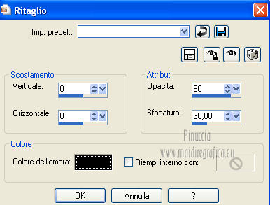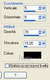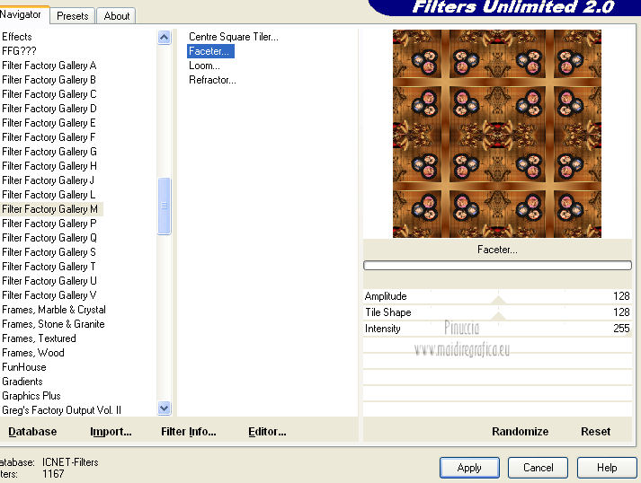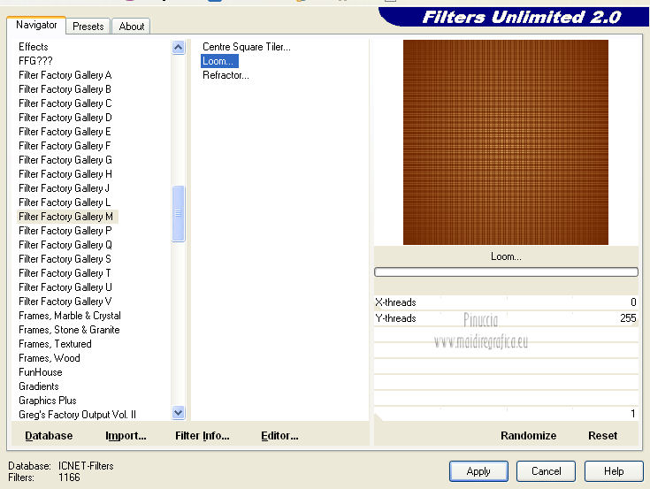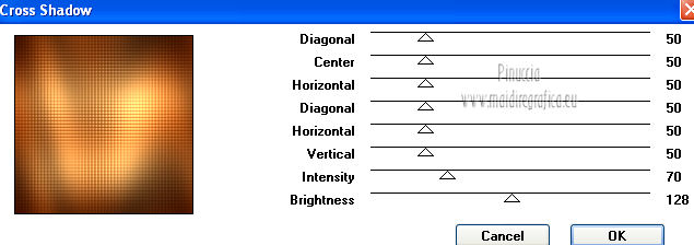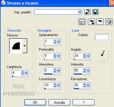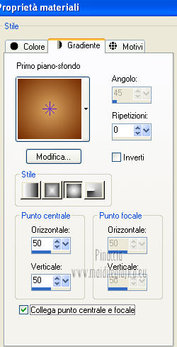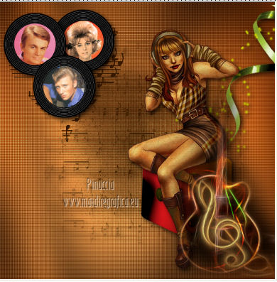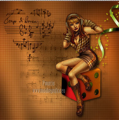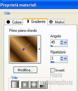 qui puoi trovare qualche risposta ai tuoi dubbi. Se l'argomento che ti interessa non è presente, ti prego di segnalarmelo. Questo tutorial è una creazione di Saturnella e non può essere copiato su altri siti nè essere offerto per il download. Lo stesso vale per la mia traduzione. E' anche proibito togliere il watermark dal materiale; rispettiamo il lavoro dei creatori di tubes, senza i quali non potremmo creare tutorials. Questo tutorial è stato creato con PSP 12, ma può essere eseguito anche con le altre versioni di PSP. Per tradurlo ho usato PSP X. Occorrente: Materiale qui Filtri in caso di dubbi, ricorda di consultare la mia sezione filtri qui Filters Unlimited 2.0 qui Filter Factory Gallery M - Loom, Faceter qui Toadies - What are you qui Graphics Plus - Cross Shadow qui ![]() non esitare a cambiare modalità di miscelatura e opacità secondo i colori utilizzati. 1. Imposta il colore di primo piano con #daa55f, e il colore di sfondo con #712900. Passa il colore di primo piano a Gradiente, stile Sprazzo di luce. ![]() 2. Apri una nuova immagine bianca 650 x 650 pixels. ![]() Livelli>Nuovo livello raster. Riempi con il gradiente.3. Effetti>Plugins>Filters Unlimited 2.0 - Filter Factory Gallery M - Loom, con i settaggi standard. ![]() Regola>Messa a fuoco>Metti a fuoco. 4. Apri i pennelli musique e musique 2. File>Esporta>Pennello personalizzato - assegna un nome al pennello e ok. 5. Attiva lo strumento Pennello ![]() uno alla volta e ciascuno su un proprio livello, cerca e seleziona i pennelli che hai appena esportati, e applicali con un colore scuro scelto dal tuo lavoro. ![]() 6. Apri il tube del cubo "kTs Thing CAH003" e vai a Modifica>Copia. Torna al tuo lavoro e vai a Modifica>Incolla come nuovo livello. Immagine>Rifletti. Spostalo a destra.Effetti>Effetti 3D>Sfalsa ombra, con il colore nero. ![]() 7. Apri il tube "Vinegaria-Zielinska" e vai a Modifica>Copia. Torna al tuo lavoro e vai a Modifica>Incolla come nuovo livello. Posiziona il tube sul cubo.Effetti>Effetti 3D>Sfalsa ombra, con i settaggi precedenti. ![]() 8. Apri il tube "guitar lights" e vai a Modifica>Copia. Torna al tuo lavoro e vai a Modifica>Incolla come nuovo livello. Spostalo in basso a destra, come nel mio esempio.9. Copia e incolla sul tuo lavoro i tre dischi (cloclo, johnny, sheila). Per tutti e tre: Immagine>Ridimensiona, al 60%, tutti i livelli non selezionato. Effetti>Effetti 3D>Sfalsa ombra, con i settaggi precedenti. Disponi i dischi a tuo piacimento,o vedi il mio esempio. ![]() 10. Apri il tube "calguismusicnote3059" e vai a Modifica>Copia. Torna al tuo lavoro e vai a Modifica>Incolla come nuovo livello. Immagine>Ridimensiona, al 50%, tutti i livelli non selezionato. Posiziona le note dove preferisci, o vedi il mio esempio.Selezione>Seleziona tutto. Selezione>Mobile. Selezione>Immobilizza. Selezione>Modifica>Espandi - 1 pixel. Riempi con il colore chiaro.Selezione>Modifica>Contrai - 1 pixel. Riempi con il colore scuro.Selezione>Deseleziona. Regola>Messa a fuoco>Metti a fuoco. Effetti>Effetti 3D>Sfalsa ombra, con i settaggi precedenti. Nella paletta dei livelli porta questo livello sotto il livello del tube della donna. 11. Attiva il livello del tube della donna. Livelli>Duplica. Livelli>Disponi>Sposta giù. Regola>Sfocatura>Sfocatura gaussiana - raggio 10. ![]() Effetti>Effetti di distorsione>Vento - da sinistra, intensità 100. ![]() Cambia la modalità di miscelatura di questo livello in Filtra, e abbassa l'opacità al 62%. 13. Attiva il livello Raster 1 (il livello con il gradiente Sprazzo di luce). Effetti>Plugins>Graphics Plus - Cross Shadow. ![]() 14. Livelli>Unisci>Unisci tutto. 15. Immagine>Aggiungi bordatura, 1 pixels, simmetriche, con il colore scuro. Immagine>Aggiungi bordatura, 5 pixels, simmetriche, con il colore chiaro. Immagine>Aggiungi bordatura, 2 pixels, simmetriche, con il colore scuro. Seleziona il bordo chiaro con la bacchetta magica ![]() Effetti>Plugins>Graphics Plus, con i settaggi standard. ![]() Selezione>Deseleziona. 16. Immagine>Aggiungi bordatura, 30 pixels, simmetriche, con il colore bianco. Seleziona questo bordo con la bacchetta magica ![]() Passa il colore di primo piano a Gradiente, stile Lineare, con i seguenti settaggi. ![]() Riempi la selezione con il gradiente.Effetti>Plugins>Filters Unlimited 2.0 - Filter Factory Gallery M - Faceter, con i settaggi standard. ![]() Regola>Sfocatura>Sfocatura gaussiana - raggio 10. ![]() Effetti>Plugins>Toadies - What are you. ![]() Regola>Messa a fuoco>Metti a fuoco. 17. Effetti>Effetti 3D>Smusso a incasso. ![]() 18. Selezione>Inverti. Selezione>Modifica>Contrai - 7 pixels. Effetti>Effetti 3D>Ritaglio, con il colore nero. ![]() 19. Immagine>Aggiungi bordatura, 1 pixel, simmetriche, con il colore nero. Firma il tuo lavoro. Immagine>Ridimensiona, a 650x650 pixels. Regola>Messa a fuoco>Metti a fuoco. Salva in formato jpg. ![]() Se hai problemi o dubbi, o trovi un link non funzionante, o anche soltanto per dirmi che ti è piaciuto, scrivimi. 21 Agosto 2012 |