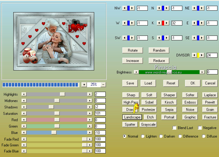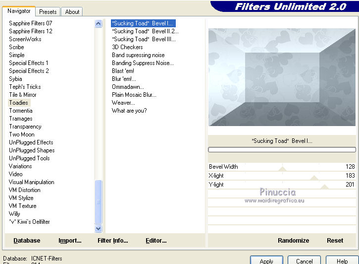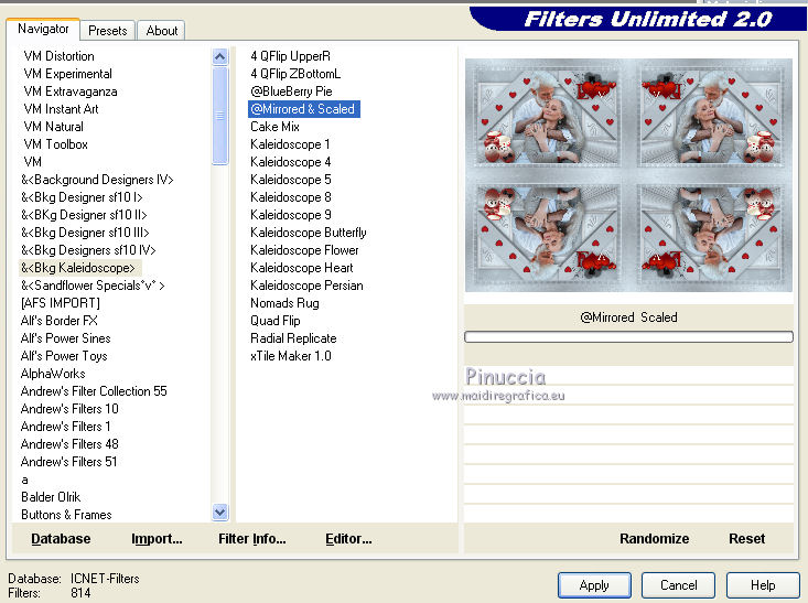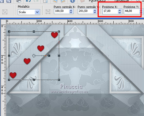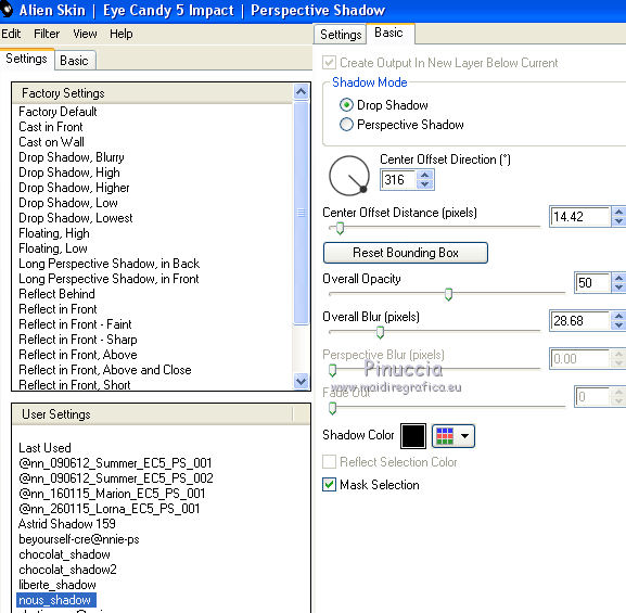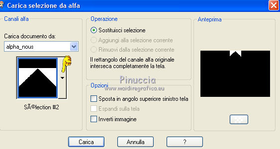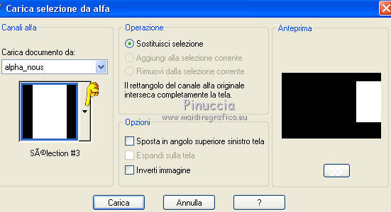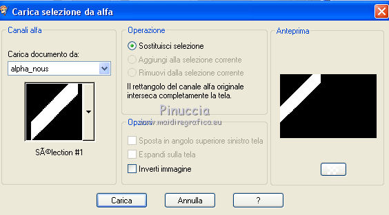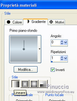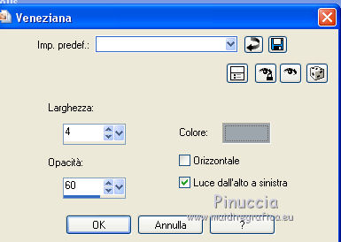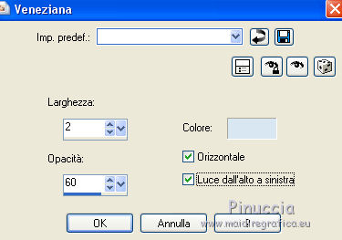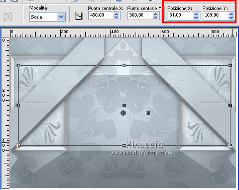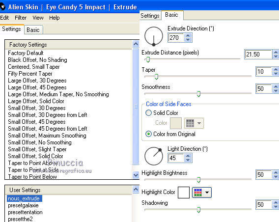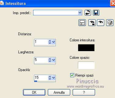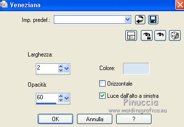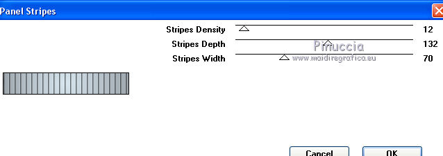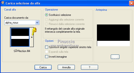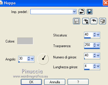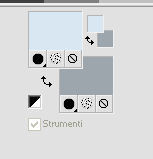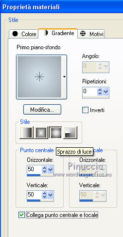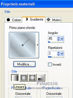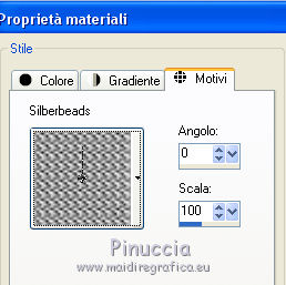 qui puoi trovare qualche risposta ai tuoi dubbi. Se l'argomento che ti interessa non è presente, ti prego di segnalarmelo. Questo tutorial è una creazione di Saturnella e non può essere copiato su altri siti nè essere offerto per il download. Lo stesso vale per la mia traduzione. E' anche proibito togliere il watermark dal materiale; rispettiamo il lavoro dei creatori di tubes, senza i quali non potremmo creare tutorials. Per tradurre questo tutorial, creato con Corel2018, ho usato CorelX, ma può essere eseguito anche con le altre versioni di PSP. Dalla versione X4, il comando Immagine>Rifletti è stato sostituito con Immagine>Capovolgi in orizzontale, e il comando Immagine>Capovolgi con Immagine>Capovolgi in verticale. Nelle versioni X5 e X6, le funzioni sono state migliorate rendendo disponibile il menu Oggetti. Nel nuovo X7 sono tornati i comandi Immagine>Rifletti e Immagine>Capovolgi, ma con nuove funzioni. Vedi la scheda sull'argomento qui Occorrente: Materiale qui Grazie: Mina per il tube della coppia, Krys per il tube dell'uovo e Thafs per il wordart. Il resto del materiale è di Saturnella. (in questa pagina trovi i links ai loro siti). Filtri in caso di dubbi, ricorda di consultare la mia sezione filtri qui FM Tile Tools Blend Emboss qui Alien Skin Eye Candy 5 Impact - Perspective Shadow, Extrude qui Toadies - Sucking Toad Bevel I qui Simple - Blintz qui Graphics Plus - Panel Stripes qui Mura's Meister - Perspective Tiling qui &<Bkg Kaleidoscope> - Mirror and Scaled (da importare in Unlimited) qui Facoltativo: AAA Filters - Custom qui I filtri Toadies, Simple e Graphics Plus si possono usare da soli o importati in Filters Unlimited (come fare vedi qui) Se un filtro fornito appare con questa icona ![]() non esitare a cambiare modalità di miscelatura e opacità secondo i colori utilizzati. Nelle ultime versioni di PSP non c'è il gradiente di primo piano/sfondo (Corel_06_029) Puoi usare i gradienti delle versioni precedenti. Trovi qui i gradienti Corel X. Metti i presets Cliccando sul file una o due volte (a seconda delle tue impostazioni), automaticamente il preset si installerà nella cartella corretta. perchè uno o due clic vedi qui Se preferisci, puoi importare direttamente il preset nel corso del tutorial Come fare vedi la scheda del filtro Eye Candy qui Metti il motivo nella cartella Motivi. 1. Imposta il colore di primo piano con il colore chiaro #d8e7f1, e il colore di sfondo con il colore scuro #9da6ad. ![]() Passa il colore di primo piano a Gradiente di primo piano/sfondo, stile Lineare. ![]() 2. Apri alpha_nous. Finestra>Duplica (o sulla tastiera maiuscola+D) per fare una copia. ![]() Chiudi l'originale. La copia, che sarà la base del tuo lavoro, non è vuota, ma contiene le selezioni salvate sul canale alfa. Riempi l'immagine trasparente con il gradiente.3. Regola>Sfocatura>Sfocatura gaussiana - raggio 50. ![]() 4. Livelli>Nuovo livello raster. Selezione>Seleziona tutto. Apri l'immagine di sfondo sat_background_01 e vai a Modifica>Copia. Torna al tuo lavoro e vai a Modifica>Incolla nella selezione. Cambia la modalità di miscelatura di questo livello in Luminanza (esistente) e abbassa l'opacità al 20%. 5. Effetti>Plugins>FM Tile Tools - Blend Emboss, con i settaggi standard. ![]() Regola>Messa a fuoco>Accentua messa a fuoco. Selezione>Deseleziona. Livelli>Unisci>Unisci visibile. 6. Effetti>Plugins>Filters Unlimited 2.0 - Toadies - Sucking Toad Bevel I. ![]() 7. Effetti>Effetti di immagine>Motivo unico. ![]() 8. Effetti>Plugins>Simple - Blintz. Modifica>Ripeti Blintz. 9. Effetti>Effetti di riflesso>Specchio rotante. ![]() 10. Selezione>Carica/Salva selezione>Carica selezione da canale alfa. La selezione sélection#1 è subito disponibile. Devi soltanto cliccare Carica. ![]() Selezione>Innalza selezione a livello. Effetti>Effetti di trama>Veneziana, con il colore scuro. ![]() 11. Effetti>Plugins>Alien Skin Eye Candy 5 Impact - Extrude. Seleziona il preset nous_extrude e ok. ![]() Selezione>Deseleziona. 12. Livelli>Duplica. Immagine>Rifletti. Livelli>Unisci>Unisci giù. 13. Effetti>Effetti 3D>Sfalsa ombra. ![]() 14. Attiva il livello di sfondo. Selezione>Carica/Salva selezione>Carica selezione da canale alfa. Apri il menu delle selezioni e carica sélection#2. ![]() Selezione>Innalza selezione a livello. Effetti>Effetti di trama>Veneziana, colore chiaro. ![]() Ripeti l'Effetto Veneziana, togliendo la selezione a Orizzontale. ![]() 15. Selezione>Modifica>Seleziona bordature selezione. ![]() Passa il colore di primo piano a Motivi e seleziona il motivo silverbeads, con i seguenti settaggi. ![]() Riempi la selezione con il motivo.Selezione>Deseleziona. 16. Attiva nuovamente il livello di sfondo. Selezione>Carica/Salva selezione>Carica selezione da canale alfa. Apri il menu delle selezioni e carica sélection#3. ![]() Selezione>Innalza selezione a livello. Livelli>Nuovo livello raster. Riempi con il colore scuro di sfondo.Selezione>Modifica>Contrai - 2 pixels. ![]() Imposta il colore di primo piano con il colore bianco #ffffff. Riempi la selezione con il colore bianco.Selezione>Modifica>Contrai - 2 pixels. Riempi la selezione con il colore scuro di sfondo.Selezione>Modifica>Contrai - 2 pixels. Riempi la selezione con il colore bianco.Selezione>Modifica>Contrai - 2 pixels. Riempi la selezione con il colore scuro di sfondo.Selezione>Modifica>Contrai - 2 pixels. Riempi la selezione con il colore bianco.Selezione>Modifica>Contrai - 2 pixels. Premi sulla tastiera il tasto CANC ![]() Selezione>Deseleziona. 17. Effetti>Effetti 3D>Sfalsa ombra, con i settaggi precedenti. ![]() 18. Livelli>Duplica. Immagine>Rifletti. Livelli>Unisci>Unisci giù. 19. Apri il tube deco1 e vai a Modifica>Copia. Torna al tuo lavoro e vai a Modifica>Incolla come nuovo livello. Per posizionare il tube: premi sulla tastiera il tasto K per attivare lo strumento Puntatore ![]() e imposta Posizione X: 31,00 e Posizione Y: 109,00 ![]() 20. Effetti>Effetti 3D>Sfalsa ombra, colore bianco. ![]() 21. Attiva 