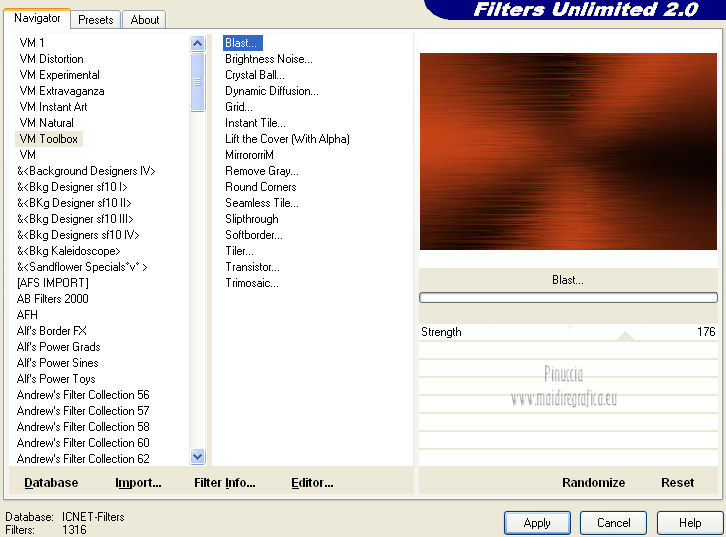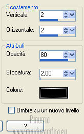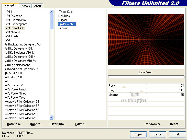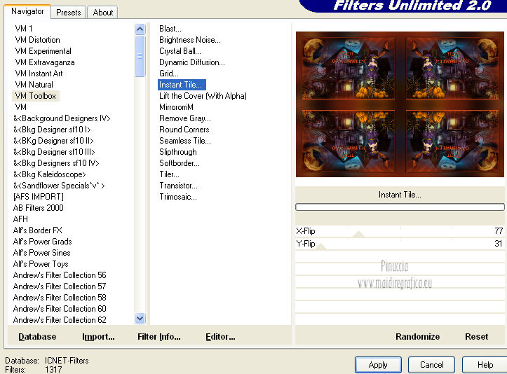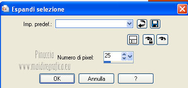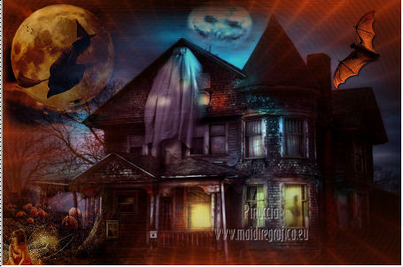 qui puoi trovare qualche risposta ai tuoi dubbi. Se l'argomento che ti interessa non è presente, ti prego di segnalarmelo. Questo tutorial è una creazione di Saturnella e non può essere copiato su altri siti nè essere offerto per il download. Lo stesso vale per la mia traduzione. E' anche proibito togliere il watermark dal materiale; rispettiamo il lavoro dei creatori di tubes, senza i quali non potremmo creare tutorials. Questo tutorial è stato creato con PSP 12, ma può essere eseguito anche con le altre versioni di PSP. Per tradurlo ho usato PSP X. Occorrente: Materiale qui I tubes usati sono di Gina, Lizztish, FBR, Mtfp, DonnaK e Guismo. Grazie a tutti per il vostro magnifico lavoro. (in questa pagina trovi i links ai loro siti). Filtri in caso di dubbi, ricorda di consultare la mia sezione filtri qui Filters Unlimited 2.0 qui VM Toolbox - Blast, Instant Tile qui VM Instant Art qui I filtri VM si possono usare da soli o importati in Unlimited ![]() non esitare a cambiare modalità di miscelatura e opacità secondo i colori utilizzati. 1. Imposta il colore di primo piano con #000000 (nero), e il colore di sfondo con #d84b1b. ![]() Passa il colore di primo piano a Gradiente, stile Radiale ![]() Apri una nuova immagine trasparente 900 x 600 pixels, riempila con il gradiente.2. Regola>Sfocatura>Sfocatura gaussiana - raggio 50. ![]() 3. Effetti>Plugins>Filters Unlimited 2.0 - VM Toolbox - Blast. ![]() 4. Livelli>Duplica. Effetti>Plugins>Filters Unlimited 2.0 - VM Instant Art- Spider Web. ![]() Abbassa l'opacità di questo livello al 40% (o secondo i tuoi colori). 5. Livelli>Nuovo livello raster. Selezione>Seleziona tutto. Apri il tube del paesaggio di Gina "ginatubes divers 291" e vai a Modifica>Copia. Torna al tuo lavoro e vai a Modifica>Incolla nella selezione. Selezione>Deseleziona. 6. Apri il tube "lizztish_riding-on-a-broom1" e vai a Modifica>Copia. Torna al tuo lavoro e vai a Modifica>Incolla come nuovo livello. Immagine>Rifletti. Immagine>Ridimensiona, al 50%, tutti i livelli non selezionato. Sposta il tube nell'angolo in alto a sinistra.Livelli>Disponi>Sposta giù. Regola>Messa a fuoco>Metti a fuoco. Cambia la modalità di miscelatura di questo livello in Luce netta (o secondo i tuoi colori). 7. Apri il tube di "FBR Bat in Flight 10-25-08" e vai a Modifica>Copia. Torna al tuo lavoro e vai a Modifica>Incolla come nuovo livello. Immagine>Ridimensiona, al 60%, tutti i livelli non selezionato. Immagine>Rifletti. Sposta il tube in alto a destra.Regola>Messa a fuoco>Metti a fuoco. 8. Effetti>Effetti 3D>Sfalsa ombra. ![]() 9. Apri il tube "mtfp 442 halloween ©Lia" e vai a Modifica>Copia. Torna al tuo lavoro e vai a Modifica>Incolla come nuovo livello. Immagine>Ridimensiona, all'80%, tutti i livelli non selezionato. Regola>Messa a fuoco>Metti a fuoco. Sposta il tube in basso a destra.10. Effetti>Effetti 3D>Sfalsa ombra. ![]() 11. Apri il tube "calguismisthalloween12102011" e vai a Modifica>Copia. Torna al tuo lavoro e vai a Modifica>Incolla come nuovo livello. Immagine>Ridimensiona, al 50%, tutti i livelli non selezionato. Regola>Messa a fuoco>Metti a fuoco. Spostalo in basso a sinistra Nella paletta dei livelli porta questo livello sotto il livello della casa. ![]() 12. Apri il tube "donnaK accents1616" e vai a Modifica>Copia. Torna al tuo lavoro e vai a Modifica>Incolla come nuovo livello. Spostalo in basso a destra.Nella paletta dei livelli porta questo livello sotto il livello della streghina. Regola>Messa a fuoco>Metti a fuoco. Effetti>Effetti 3D>Sfalsa ombra. ![]() 13. Apri il tube texte e vai a Modifica>Copia. Torna al tuo lavoro e vai a Modifica>Incolla come nuovo livello. Effetti>Effetti 3D>Sfalsa ombra, con settaggi a tua scelta. Spostalo in alto.14. Aggiungi il tuo nome e/o il tuo watermark su un nuovo livello. 15. Livelli>Unisci>Unisci visibile. Modifica>Copia. 16. Immagine>Aggiungi bordatura, 2 pixels, simmetriche, con il colore nero. Immagine>Aggiungi bordatura, 4 pixels, simmetriche, con il colore di sfondo. Immagine>Aggiungi bordatura, 2 pixels, simmetriche, con il colore nero. Immagine>Aggiungi bordatura, 50 pixels, simmetriche, con il colore bianco. 17. Seleziona il bordo bianco con la bacchetta magica ![]() Modifica>Incolla nella selezione. 18. Regola>Sfocatura>Sfocatura gaussiana - raggio 50. ![]() 19. Effetti>Filters Unlimited 2.0 - VM Toolbox - Instant Tile. ![]() 20. Selezione>Inverti. Selezione>Modifica>Espandi - 25 pixels. ![]() 21. Effetti>Effetti 3D>Sfalsa ombra. ![]() Selezione>Deseleziona. 22. Immagine>Aggiungi bordatura, 2 pixels, simmetriche, con il colore nero. Immagine>Aggiungi bordatura, 4 pixels, simmetriche, con il colore di sfondo. Immagine>Aggiungi bordatura, 2 pixels, simmetriche, con il colore nero. Immagine>Ridimensiona, a 900 pixels di larghezza, tutti i livelli selezionato. Regola>Messa a fuoco>Metti a fuoco. Salva in formato jpg. ![]() Se hai problemi o dubbi, o trovi un link non funzionante, o anche soltanto per dirmi che ti è piaciuto, scrivimi. 1 Novembre 2012 |