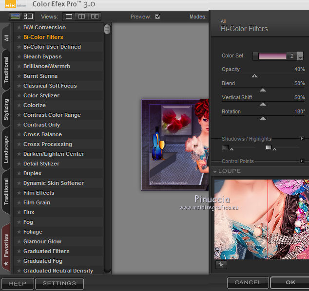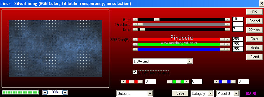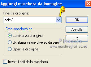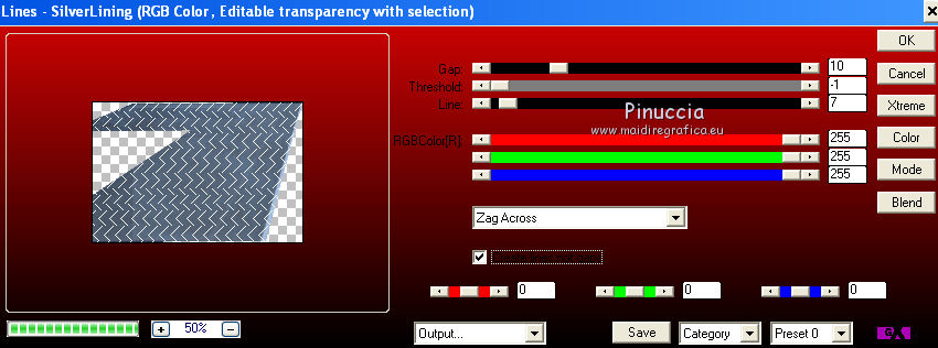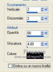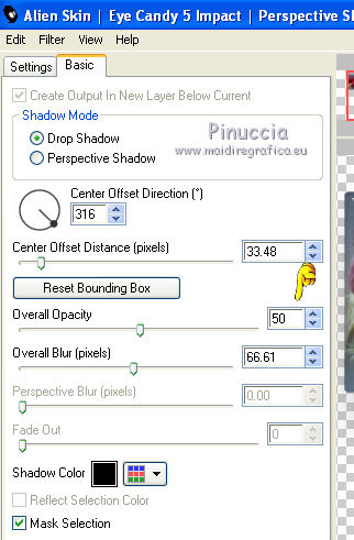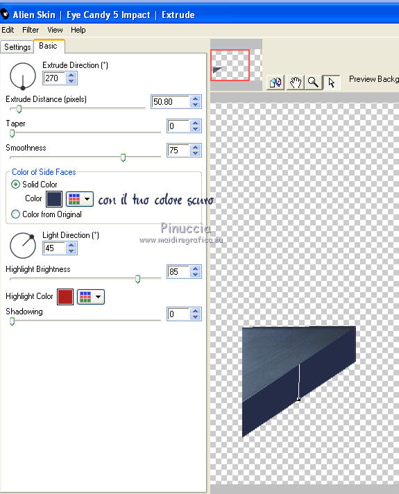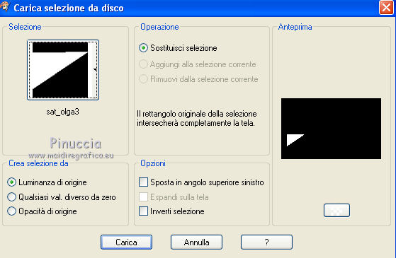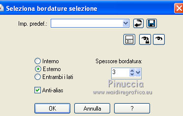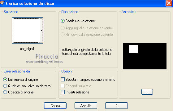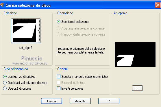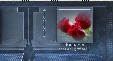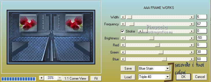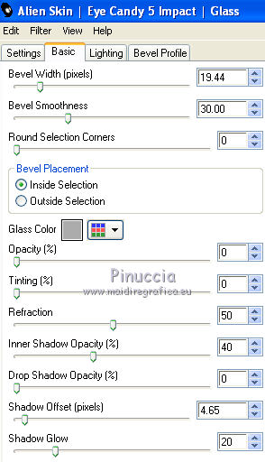 qui puoi trovare qualche risposta ai tuoi dubbi. Se l'argomento che ti interessa non è presente, ti prego di segnalarmelo. Questo tutorial è una creazione di Saturnella e non può essere copiato su altri siti nè essere offerto per il download. Lo stesso vale per la mia traduzione. E' anche proibito togliere il watermark dal materiale; rispettiamo il lavoro dei creatori di tubes, senza i quali non potremmo creare tutorials. Il tutorial è stato creato con PSP12, ma può essere eseguito anche con le altre versioni. Per tradurlo, ho usato PSP X. Occorrente: Materiale qui I tubes sono di Crealine, Christin, Syl e Thafs. La maschera è di Edith. Grazie a tutti per il vostro magnifico lavoro. (in questa pagina trovi i links ai loro siti). Filtri in caso di dubbi, ricorda di consultare la mia sezione filtri qui AP 01 [Innovations] qui Alien Skin Eye Candy 5 Impact qui AAA Frames - Frame Work qui Nik Software - Color Efex Pro qui ![]() non esitare a cambiare modalità di miscelatura e opacità secondo i colori utilizzati. Metti le selezioni nella cartella Selezioni. Metti ligne_sat1 nella cartella Linee di stile. Apri la maschera in PSP e minimizzala con il resto del materiale. 1. Scegli due colori dai tuoi tubes. Imposta il colore di primo piano con il colore chiaro (il mio #a5bedd) e il colore di sfondo con il colore scuro (il mio #2d3657). ![]() 2. Apri una nuova immagine trasparente 900 x 550 pixels, e riempila con il colore chiaro.Livelli>Nuovo livello raster. Selezione>Seleziona tutto. Apri l'immagine di sfondo ATT01689.jpg e vai a Modifica>Copia. Torna al tuo lavoro e vai a Modifica>Incolla nella selezione. Selezione>Deseleziona. Cambia la modalità di miscelatura di questo livello in Luminanza, e abbassa l'opacità al 75%. Livelli>Unisci>Unisci visibile. 3. Livelli>Duplica. Immagine>Ridimensiona, al 90%, tutti i livelli non selezionato. 4. Selezione>Seleziona tutto. Selezione>Mobile. Selezione>Immobilizza. 5. Livelli>Nuovo livello raster. Riempi con il colore chiaro.6. Livelli>Nuovo livello maschera. Apri il menu sotto la finestra di origine e vedrai la lista dei files aperti. Seleziona la maschera edith3, con i seguenti settaggi. ![]() Effetti>Effetti di bordo>Aumenta. Livelli>Unisci>Unisci gruppo. 7. Attiva il livello sottostante (copia di uniti). ![]() Selezione>Modifica>Seleziona bordature selezione. ![]() Livelli>Nuovo livello raster. Riempi con il colore scuro.8. Effetti>Effetti 3D>Smusso a incasso. ![]() Selezione>Deseleziona. Livelli>Unisci>Unisci giù. 9. Attiva il livello superiore della maschera. Effetti>Effetti 3D>Sfalsa ombra. ![]() Livelli>Unisci>Unisci giù. 10. Selezione>Carica/Salva selezione>Carica selezione da disco. Cerca e carica la selezione sat_olga1. ![]() Selezione>Innalza selezione a livello. 11. Apri il tube Christin_misted_Bluemen36_2010 e vai a Modifica>Copia. Torna al tuo lavoro e vai a Modifica>Incolla come nuovo livello. Immagine>Ridimensiona, al 50%, tutti i livelli non selezionato. Sposta il tube nell'area selezionata.Selezione>Inverti. Premi sulla tastiera il tasto CANC. Selezione>Deseleziona. Livelli>Unisci>Unisci giù. 12. Effetti>Plugins>Alien Skin Eye Candy 5 Impact - Glass. Settings: Clear - Basic: ![]() 13. Livelli>Duplica. Immagine>Rifletti. Livelli>Unisci>Unisci giù. 14. Effetti>Plugins>Alien Skin Eye Candy 5 Impact - Perspective Shadow. Seleziona il preset Drop Shadow Blurry e cambia Overall opacity con 50. ![]() Livelli>Unisci>Unisci giù. 15. Selezione>Carica/Salva selezione>Carica selezione da disco. Cerca e carica la selezione sat_olga2. ![]() Selezione>Innalza selezione a livello. 16. Effetti>Plugins>AP 01 Innovations - Lines SilverLining. ![]() Cambia la modalità di miscelatura di questo livello in Sovrapponi, e abbassa l'opacità all'80%. Selezione>Deseleziona. 17. Livelli>Duplica. Immagine>Rifletti. Livelli>Unisci>Unisci giù. 18. Effetti>Plugins>Alien Skin Eye Candy 5 Impact - Perspective Shadow, con i settaggi precedenti. 19. Attiva il livello di sfondo. Effetti>Plugins>AP 01 Innovations - Lines SilverLining. ![]() 20. Attiva nuovamente il livello superiore. Selezione>Carica/Salva selezione>Carica selezione da disco. Cerca e carica la selezione sat_olga3. ![]() Selezione>Innalza selezione a livello. 21. Effetti>Plugins>Alien Skin Eye Candy 5 Impact - Extrude. ![]() Selezione>Deseleziona. Livelli>Duplica. Immagine>Rifletti. Livelli>Unisci>Unisci giù. Cambia la modalità di miscelatura di questo livello in Filtra (secondo i tuoi colori) Per il mio esempio ho cambiato in Moltiplica. 22. Livelli>Unisci>Unisci giù. 23. Attiva lo strumento Penna ![]() seleziona la linea di stile ligne1_sat, larghezza 6, colore chiaro come colore di primo piano. ![]() Tenendo premuto il tasto della maiuscola, traccia una linea come nell'esempio. ![]() Livelli>Converti in livello raster. 24. Effetti>Plugins>Alien Skin Eye Candy 5 Impact - Glass. ![]() 25. Effetti>Effetti 3D>Sfalsa ombra. ![]() 26. Livelli>Duplica. Immagine>Rifletti. Livelli>Unisci>Unisci giù - 2 volte. 27. Effetti>Effetti 3D>Sfalsa ombra. ![]() Modifica>Ripeti Sfalsa ombra. 28. Immagine>Aggiungi bordatura, 4 pixels, simmetriche, con il colore scuro. Immagine>Aggiungi bordatura, 2 pixels, simmetriche, con il colore chiaro. Immagine>Aggiungi bordatura, 2 pixels, simmetriche, con il colore scuro. 29. Effetti>Plugins>AAA Frame - Frame Work. Prima seleziona Blue Stain e Triple 40 (secondo i tuoi colori), e poi imposta i settaggi. ![]() 30. Apri il tube woman_624_bycrealinemai2012 e vai a Modifica>Copia. Torna al tuo lavoro e vai a Modifica>Incolla come nuovo livello. Immagine>Ridimensiona, al 75%, tutti i livelli non selezionato. Regola>Messa a fuoco>Metti a fuoco. 31. Effetti>Effetti 3D>Sfalsa ombra. ![]() 32. Apri il tube SvB Blauwe glazen de Syl e vai a Modifica>Copia. Torna al tuo lavoro e vai a Modifica>Incolla come nuovo livello. Immagine>Ridimensiona, al 40%, tutti i livelli non selezionato. Sposta il tube a destra.33. Effetti>Effetti 3D>Sfalsa ombra. ![]() 34. Apri il tube verres_e