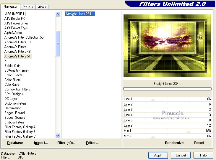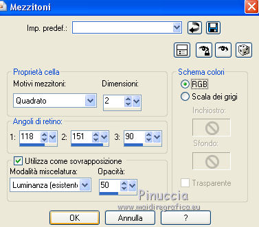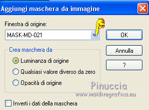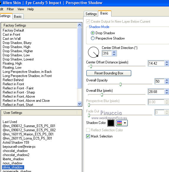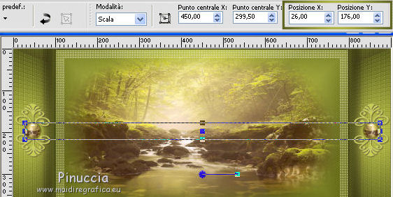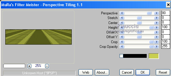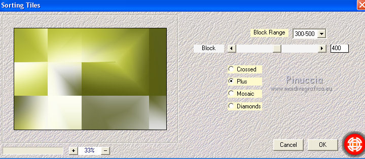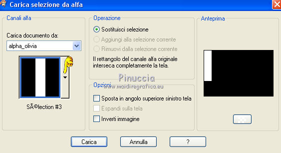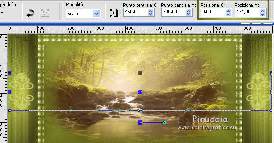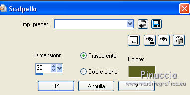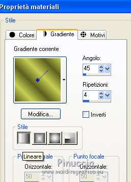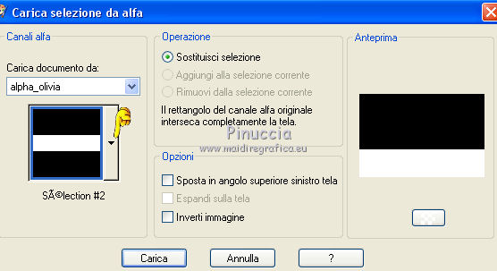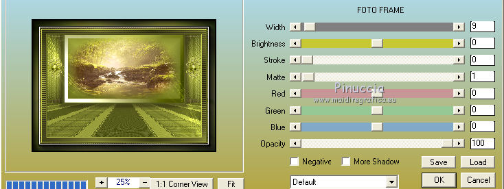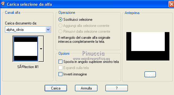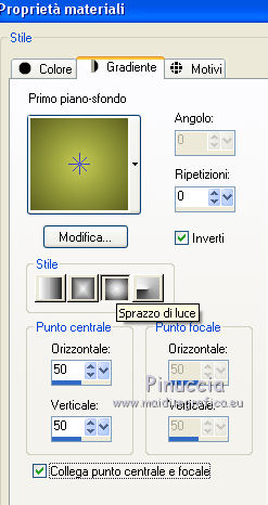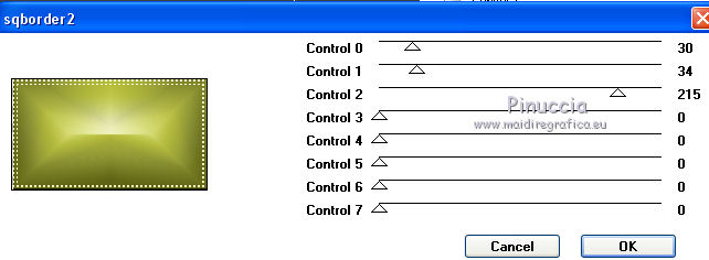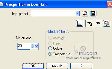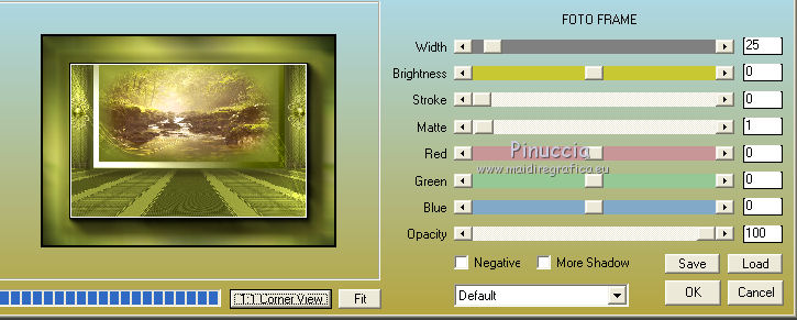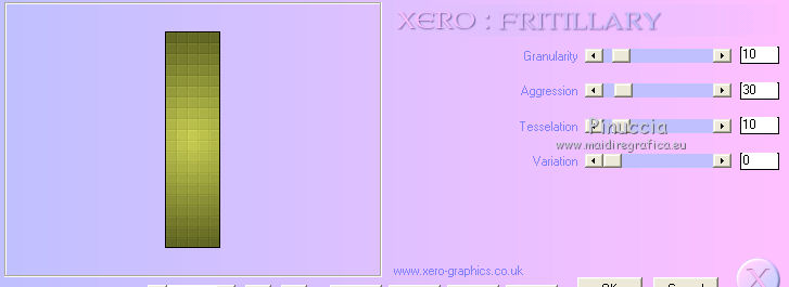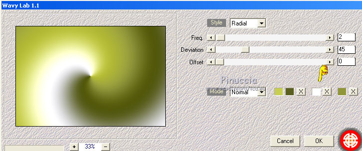 qui puoi trovare qualche risposta ai tuoi dubbi. Se l'argomento che ti interessa non è presente, ti prego di segnalarmelo. Questo tutorial è una creazione di Saturnella e non può essere copiato su altri siti nè essere offerto per il download. Lo stesso vale per la mia traduzione. E' anche proibito togliere il watermark dal materiale; rispettiamo il lavoro dei creatori di tubes, senza i quali non potremmo creare tutorials. Per tradurre questo tutorial, creato con Corel2018, ho usato CorelX, ma può essere eseguito anche con le altre versioni di PSP. Dalla versione X4, il comando Immagine>Rifletti è stato sostituito con Immagine>Capovolgi in orizzontale, e il comando Immagine>Capovolgi con Immagine>Capovolgi in verticale. Nelle versioni X5 e X6, le funzioni sono state migliorate rendendo disponibile il menu Oggetti. Nel nuovo X7 sono tornati i comandi Immagine>Rifletti e Immagine>Capovolgi, ma con nuove funzioni. Vedi la scheda sull'argomento qui Occorrente: Materiale qui Grazie: Syl per il tube della donna, Monica per il tube del paesaggio, Thafs per il tube del vaso, e per le maschere SmArt e MD. Il resto del materiale è di Saturnella. (in questa pagina trovi i links ai loro siti). Filtri in caso di dubbi, ricorda di consultare la mia sezione filtri qui Filters Unlimited 2.0 qui Mehdi - Sorting Tile qui Mehdi - Wavy Lab 1.1 qui AFS IMPORT - sqborder 2 qui Xero - Fritillary qui Alien Skin Eye Candy 5 Impact - Perspective Shadow, Glass qui Andrew's Filter 51 - Straight lines 234 qui AAA Frames - Texture Frame qui I filtri AFS IMPORT si possono usare da soli o importati in Filters Unlimited (come fare vedi qui) Se un filtro fornito appare con questa icona ![]() non esitare a cambiare modalità di miscelatura e opacità secondo i colori utilizzati. Nelle ultime versioni di PSP non c'è il gradiente di primo piano/sfondo (Corel_06_029) Puoi usare i gradienti delle versioni precedenti. Trovi qui i gradienti Corel X. Metti il preset Cliccando sul file una o due volte (a seconda delle tue impostazioni), automaticamente il preset si installerà nella cartella corretta. perchè uno o due clic vedi qui Se preferisci, puoi importare direttamente il preset nel corso del tutorial Come fare vedi la scheda del filtro Eye Candy qui Apri le maschere in PSP e minimizzale con il resto del materiale 1. Imposta il colore di primo piano con il colore scuro #5b6020, e il colore di sfondo con il colore chiaro #c8ce51. ![]() Apri alpha_olivia. Finestra>Duplica (o sulla tastiera maiuscola+D) per fare una copia. ![]() Chiudi l'originale. La copia, che sarà la base del tuo lavoro, non è vuota, ma contiene le selezioni salvate sul canale alfa. 2. Effetti>Plugins>Mehdi - Wavy Lab 1.1. Questo filtro lavora con i colori della paletta: il primo è il colore di sfondo, il secondo quello di primo piano; degli ultimi due colori creati dal filtro, cambia il terzo colore con il colore bianco ![]() 3. Regola>Sfocatura>Sfocatura gaussiana - raggio 50. ![]() 4. Effetti>Plugins>Mehdi - Sorting Tiles. ![]() Effetti>Effetti di bordo>Aumenta. 5. Effetti>Effetti di riflesso>Specchio rotante, con i settaggi standard. ![]() 6. Selezione>Carica/Salva selezione>Carica selezione da canale alfa. La selezione sélection#1 è subito disponibile. Devi soltanto cliccare Carica. ![]() Selezione>Innalza selezione a livello. Effetti>Plugins>AFS IMPORT - sqborder2. ![]() 7. Selezione>Modifica>Contrai - 50 pixels. ![]() Livelli>Nuovo livello raster. Effetti>Effetti 3D>Scalpello, colore scuro di primo piano. ![]() 8. Apri il tube del paesaggio e vai a Modifica>Copia. Torna al tuo lavoro e vai a Modifica>Incolla nella selezione. Selezione>Modifica>Seleziona bordature selezione. ![]() Livelli>Nuovo livello raster. Riempi con il colore scuro di primo piano.Effetti>Plugins>Alien Skin Eye Candy 5 Impact - Glass. Seleziona il preset Clear no drop shadow e ok. ![]() Selezione>Deseleziona. 9. Livelli>Unisci>Unisci giù - 2 volte. 10. Effetti>Effetti 3D>Sfalsa ombra. ![]() 11. Attiva il livello di sfondo. Selezione>Carica/Salva selezione>Carica selezione da canale alfa. Apri il menu delle selezioni e carica sélection#2. ![]() Selezione>Innalza selezione a livello. Riempi la selezione con il colore scuro.Effetti>Effetti artistici>Mezzitoni. ![]() Mantieni selezionato. Livelli>Nuovo livello raster. Riempi con il colore chiaro di sfondo.Livelli>Nuovo livello maschera>Da immagine. Apri il menu sotto la finestra di origine e vedrai la lista dei files aperti. Selezione la maschera smArt_maszk_79. ![]() Aspetta a unire il gruppo. 12. Effetti>Effetti di riflesso>Specchio rotante, con i settaggi precedenti. ![]() Livelli>Unisci>Unisci gruppo. Livelli>Unisci>Unisci giù. 13. Effetti>Plugins>Mura's Meister - Perspective Tiling. ![]() Selezione>Deseleziona. 14. Effetti>Effetti 3D>Sfalsa ombra, con i settaggi precedenti. ![]() 15. Attiva il livello di sfondo. Selezione>Carica/Salva selezione>Carica selezione da canale alfa. Apri il menu delle selezioni e carica sélection#3. ![]() Selezione>Innalza selezione a livello. 16. Passa il colore di primo piano a Gradiente di primo piano/sfondo, stile Sprazzo di luce. ![]() Riempi la selezione con il gradiente.17. Effetti>Plugins>Xero - Fritillary. ![]() Effetti>Effetti di bordo>Aumenta. 18. Effetti>Effetti geometrici>Prospettiva orizzontale. ![]() Mantieni selezionato. 19. Effetti>Effetti 3D>Sfalsa ombra, con i settaggi precedenti. Selezione>Deseleziona. 20. Livelli>Duplica. Immagine>Rifletti. Livelli>Unisci>Unisci giù. 21. Attiva il livello superiore. Apri il tube deco e vai a Modifica>Copia. Torna al tuo lavoro e vai a Modifica>Incolla come nuovo livello. Per posizionare il tube, tasto K per attivare lo strumento Puntatore ![]() e imposta Posizione X: 4,00 e Posizione Y: 131,00 ![]() Tasto M per deselezionare lo strumento. 22. Effetti>Effetti 3D>Sfalsa ombra. ![]() 23. Apri il tube deco2 e vai a Modifica>Copia. Torna al tuo lavoro e vai a Modifica>Incolla come nuovo livello. Tasto K per attivare lo strumento Puntato