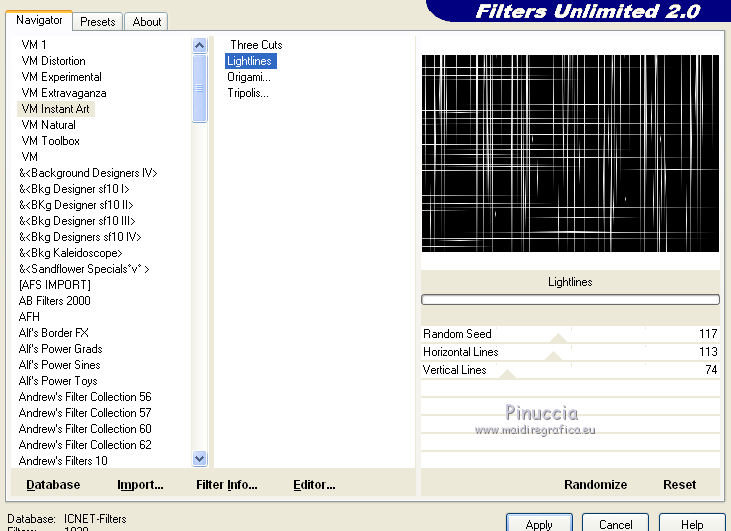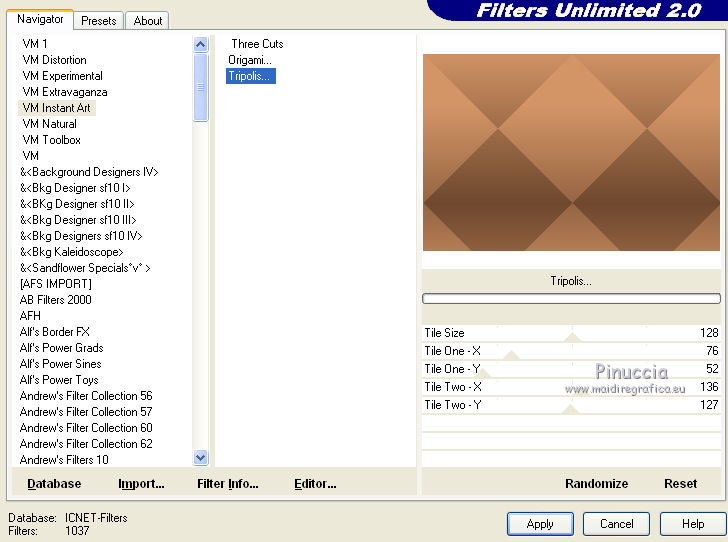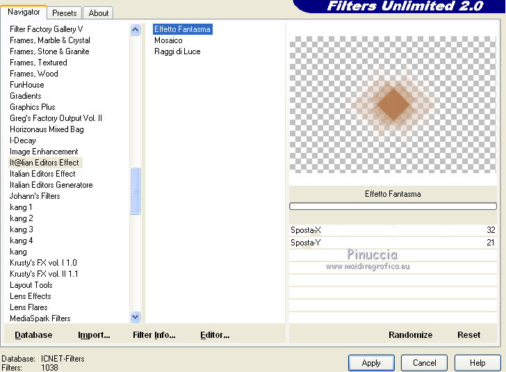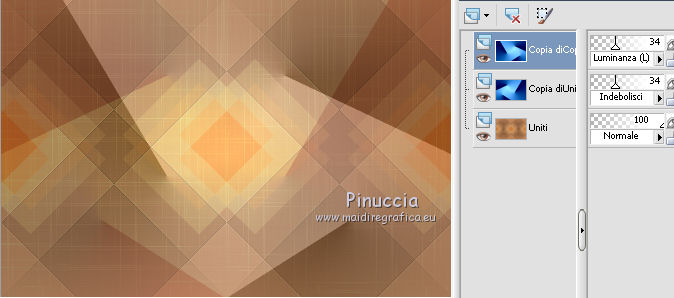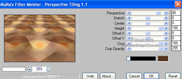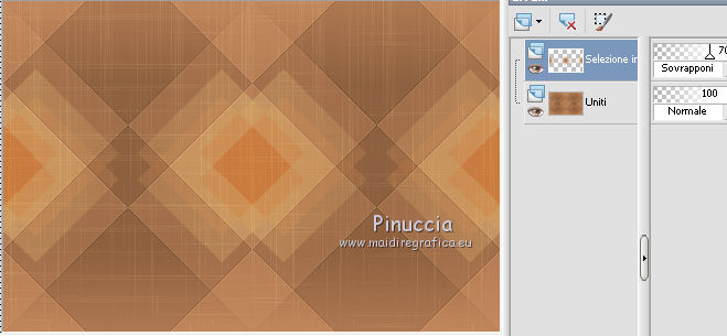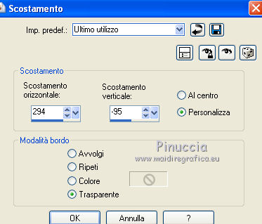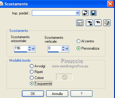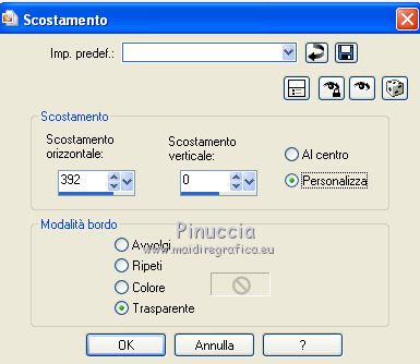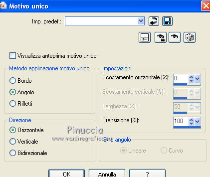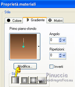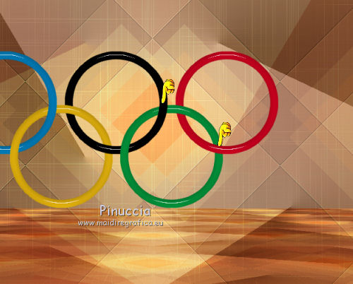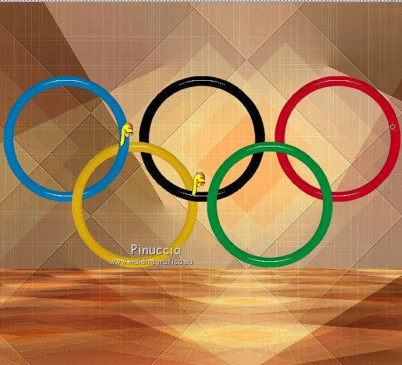 qui puoi trovare qualche risposta ai tuoi dubbi. Se l'argomento che ti interessa non è presente, ti prego di segnalarmelo. Questo tutorial è una creazione di Saturnella e non può essere copiato su altri siti nè essere offerto per il download. Lo stesso vale per la mia traduzione. E' anche proibito togliere il watermark dal materiale; rispettiamo il lavoro dei creatori di tubes, senza i quali non potremmo creare tutorials. Questo tutorial è stato creato con PSP 12, ma può essere eseguito anche con le altre versioni di PSP. Per tradurlo ho usato PSP X. Occorrente: Materiale qui Il tube della donna è di Thafs. Grazie a tutti per il vostro magnifico lavoro. (in questa pagina trovi i links ai loro siti). Filtri in caso di dubbi, ricorda di consultare la mia sezione filtri qui VM Instant Art qui Transparency - Eliminate Black qui Italian Editors Effect - Effetto Fantasma qui Mura's Meister - Perspective Tiling qui Alien Skin Eye Candy 5 Impact - Glass qui Simple - Pizza Slice Mirror qui Andrew's Filter 51 - Straight Lines 234 qui I filtri Andrews per essere usati devono prima essere convertiti. Come fare vedi qui Si usano importandoli in Filters Unlimited (come fare vedi qui) ma possono funzionare anche da soli Anche i filtri VM Instant Art, Transparency, Italian Editors e Simple si possono usare da soli e importati in Unlimited. A volte i risultati sono differenti, ma queste differenze si possono riscontrare soltanto con l'uso, perchè non ci sono regole codificate ![]() non esitare a cambiare modalità di miscelatura e opacità secondo i colori utilizzati. Metti le selezioni nella cartella Selezioni. 1. Imposta il colore di primo piano con #d49566, e il colore di sfondo con #553520. ![]() Passa il colore di primo piano a Gradiente. ![]() 2. Apri una nuova immagine trasparente 900 x 600 pixels, e riempila con il gradiente.3. Effetti>Plugins>Filters Unlimited 2.0 - VM Instant Art - Tripolis. ![]() Effetti>Effetti di bordo>Aumenta. 4. Livelli>Duplica. Immagine>Capovolgi. Abbassa l'opacità di questo livello al 50%. 5. Livelli>Unisci>Unisci visibile. 6. Livelli>Duplica. Effetti>Plugins>Filters Unlimited 2.0 - VM Instant art - Lightlines, con i settaggi standard. ![]() 7. Effetti>Plugins>Transparency - Eliminate black. ![]() Cambia la modalità di miscelatura di questo livello in Sovrapponi, e abbassa l'opacità al 20% (da adattare ai tuoi colori). 8. Livelli>Unisci>Unisci visibile. 9. Selezione>Carica/Salva selezione>Carica selezione da disco. Cerca e carica la selezione sat_olympie2. ![]() Selezione>Innalza selezione a livello. Selezione>Deseleziona. 10. Effetti>Plugins>Filters Unlimited 2. - Italian Editor Effect - Effetto Fantasma. ![]() 11. Effetti>Effetti di immagine>Motivo unico. ![]() Cambia la modalità di miscelatura di questo livello in Sovrapponi, e abbassa l'opacità al 70% (o secondo i tuoi colori). ![]() 12. Livelli>Unisci>Unisci visibile. 13. Livelli>Duplica. Effetti>Plugins>Filters Unlimited 2.0 - VM Instant Art - Three cuts, con i settaggi standard. ![]() Cambia la modalità di miscelatura di questo livello in Indebolisci, e abbassa l'opacità al 34%. ![]() 14. Livelli>Duplica. Immagine>Rifletti. Cambia la modalità di miscelatura di questo livello in Luminanza (Esistente). 15. Livelli>Unisci>Unisci visibile. 16. Livelli>Duplica. Effetti>Plugins>Mura's Meister - Perspective Tiling. ![]() Se non visualizzi i righelli, vai a Visualizza>Righelli. Premi sulla tastiera il tasto K per attivare lo strumento Puntatore ![]() se stai usando PSP 9 il tasto D (valido per tutte le versioni) per attivare lo strumento Deformazione ![]() e spingi verso il basso il nodo superiore centrale, fino a 450 pixels. ![]() Cambia la modalità di miscelatura di questo livello in Sovrapponi, e abbassa l'opacità al 90%. 17. Attiva il livello di sfondo. Modifica>Copia. Modifica>Incolla come nuova immagine, e minimizza questa immagine che ti servirà più tardi. 18. Torna al tuo lavoro. Selezione>Carica/Salva selezione>Carica selezione da disco. Cerca e carica la selezione sat_olympie. ![]() 19. Livelli>nuovo livello raster. Imposta il colore di primo piano con il colore blu #0185c6, e riempi la selezione con il colore blu.20. Effetti>Plugins>Alien Skin Eye Candy 5 Impact - Glass. Seleziona il preset clear no drop shadow e ok. ![]() Selezione>Deseleziona. Rinomina questo livello "anello 1". 21. Livelli>Nuovo livello raster. Selezione>Carica/Salva selezione>Carica selezione da disco. Carica nuovamente la selezione sat_olympie. Imposta il colore di primo piano con il colore nero #000000, e riempi la selezione con il colore nero.Effetti>Plugins>Alien Skin Eye Candy 5 Impact - Glass, con i settaggi precedenti. Selezione>Deseleziona. Rinomina questo livello "anello 2". Effetti>Effetti di immagine>Scostamento. ![]() 22. Livelli>Nuovo livello raster. Selezione>Carica/Salva selezione>Carica selezione da disco. Carica nuovamente la selezione sat_olympie. Imposta il colore di primo piano con il colore rosso #da0322, e riempi la selezione con il colore rosso.Effetti>Plugins>Alien Skin Eye Candy 5 Impact - Glass, con i settaggi precedenti. Selezione>Deseleziona. Rinomina questo livello "anello 3". Effetti>Effetti di immagine>Scostamento. ![]() 23. Livelli>Nuovo livello raster. Selezione>Carica/Salva selezione>Carica selezione da disco. Carica nuovamente la selezione sat_olympie. Imposta il colore di primo piano con il colore giallo #f4bf11, e riempi la selezione con il colore giallo.Effetti>Plugins>Alien Skin Eye Candy 5 Impact - Glass, con i settaggi precedenti. Selezione>Deseleziona. Rinomina questo livello "anello 4". Effetti>Effetti di immagine>Scostamento. ![]() 24. Livelli>Nuovo livello raster. Selezione>Carica/Salva selezione>Carica selezione da disco. Carica nuovamente la selezione sat_olympie. Imposta il colore di primo piano con il colore verde #039d3f, e riempi la selezione con il colore verde.Effetti>Plugins>Alien Skin Eye Candy 5 Impact - Glass, con i settaggi precedenti. Selezione>Deseleziona. Rinom