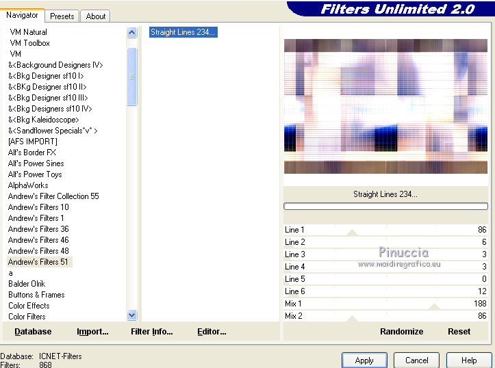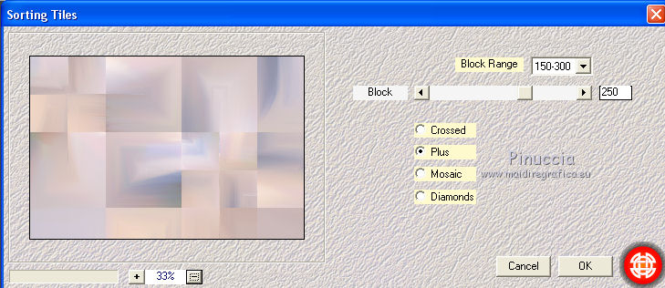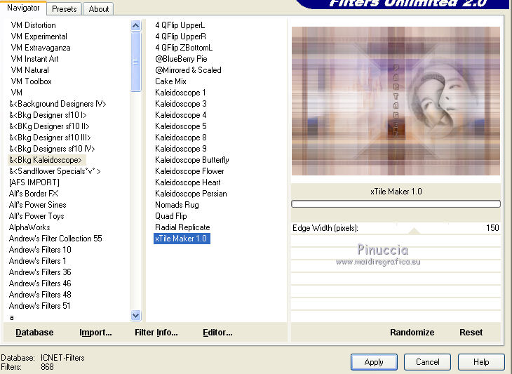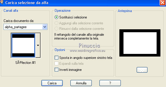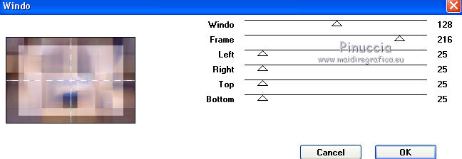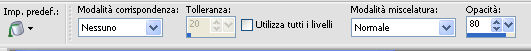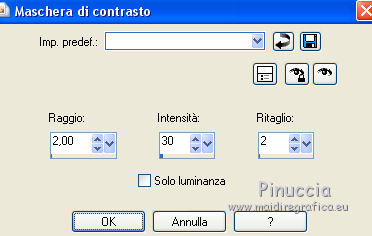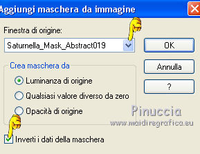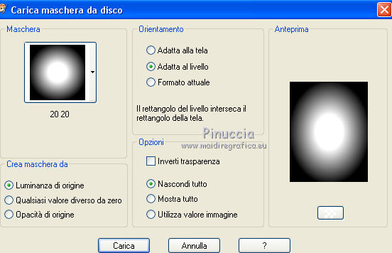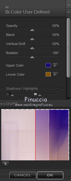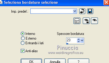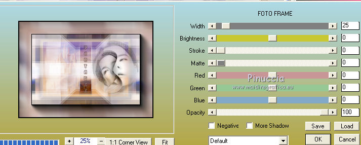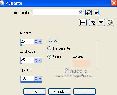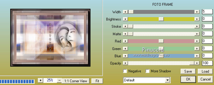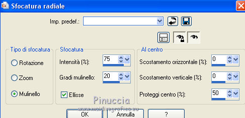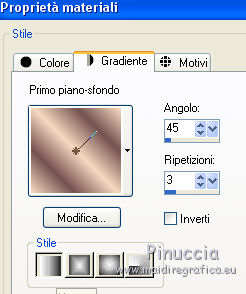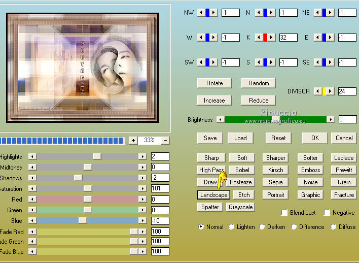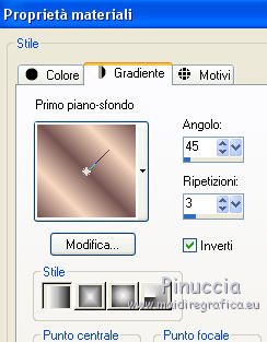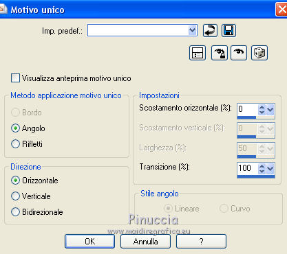 qui puoi trovare qualche risposta ai tuoi dubbi. Se l'argomento che ti interessa non è presente, ti prego di segnalarmelo. Questo tutorial è una creazione di Saturnella e non può essere copiato su altri siti nè essere offerto per il download. Lo stesso vale per la mia traduzione. E' anche proibito togliere il watermark dal materiale; rispettiamo il lavoro dei creatori di tubes, senza i quali non potremmo creare tutorials. Per tradurre questo tutorial, creato con Corel2018, ho usato CorelX7, ma può essere eseguito anche con le altre versioni di PSP. Dalla versione X4, il comando Immagine>Rifletti è stato sostituito con Immagine>Capovolgi in orizzontale, e il comando Immagine>Capovolgi con Immagine>Capovolgi in verticale. Nelle versioni X5 e X6, le funzioni sono state migliorate rendendo disponibile il menu Oggetti. Nel nuovo X7 sono tornati i comandi Immagine>Rifletti e Immagine>Capovolgi, ma con nuove funzioni. Vedi la scheda sull'argomento qui Occorrente: Materiale qui Tutto il materiale è di Saturnella. (in questa pagina trovi i links ai loro siti). Filtri in caso di dubbi, ricorda di consultare la mia sezione filtri qui Filters Unlimited 2.0 qui Mehdi - Sorting Tiles qui Mock - Windo qui Andrew's Filter 51 - Straight lines 234 qui Nik Software - Color Efex Pro qui FM Tile Tools - Saturation Emboss qui &<Bkg Kaleidoscope> - xTile Maker 1.0 (da importare in Unlimited) qui AAA Frames - Foto Frame; AAA Filters - Custom qui I filtri Mock e Andrew's si possono usare da soli o importati in Filters Unlimited (come fare vedi qui) Se un filtro fornito appare con questa icona ![]() non esitare a cambiare modalità di miscelatura e opacità secondo i colori utilizzati. Nelle ultime versioni di PSP non c'è il gradiente di primo piano/sfondo (Corel_06_029) Puoi usare i gradienti delle versioni precedenti. Trovi qui i gradienti Corel X. Metti la maschera 20-20 nella cartella Maschere. Apri la maschera Saturnella_Mask_Abstract019 in PSP e minimizzala con il resto del materiale. 1. Imposta il colore di primo piano con il colore chiaro #f7d9c1, e il colore di sfondo con il colore scuro #745250. ![]() Apri alpha_partagee. Finestra>Duplica (o sulla tastiera maiuscola+D) per fare una copia. ![]() Chiudi l'originale. La copia, che sarà la base del tuo lavoro, non è vuota, ma contiene una selezione salvata sul canale alfa. Riempi l'immagine trasparente con il colore chiaro di primo piano.2. Selezione>Seleziona tutto. Apri il tube del paesaggio e vai a Modifica>Copia. Torna al tuo lavoro e vai a Modifica>Incolla nella selezione. Selezione>Deseleziona. 3. Effetti>Effetti di immagine>Motivo unico, con i settaggi standard. ![]() 4. Regola>Sfocatura>Sfocatura radiale. ![]() Effetti>Effetti di bordo>Aumenta di più. 5. Effetti>Plugins>Mehdi - Sorting Tiles. ![]() Effetti>Effetti di bordo>Aumenta. 6. Livelli>Duplica. Immagine>Rifletti. Cambia la modalità di miscelatura di questo livello in Rafforza o altro. Livelli>Unisci>Unisci giù. 7. Livelli>Duplica. Effetti>Plugins>Mock - Windo, con i settaggi standard. ![]() Livelli>Unisci>Unisci visibile. 8. Selezione>Carica/Salva selezione>Carica selezione da canale alfa. La selezione sélection#1 è subito disponibile. Devi soltanto cliccare Carica. ![]() Effetti>Effetti di immagine>Motivo unico. ![]() 9. Selezione>Inverti. Effetti>Plugins>Andrew's Filter 51 - Straight Lines 234, con i settaggi standard. ![]() 10. Selezione>Inverti. Effetti>Plugins>Nik Software - Color Efex Pro - Bi-color used defined. ![]() 11. Effetti>Effetti 3D>Sfalsa ombra. ![]() Selezione>Deseleziona. 12. Imposta il colore di primo piano con il colore bianco. Livelli>Nuovo livello raster. Abbassa l'opacità dello strumento Riempimento a 80. ![]() Riempi il livello con il colore bianco.Livelli>Nuovo livello maschera>Da immagine. Apri il menu sotto la finestra di origine e vedrai la lista dei files aperti. Seleziona la maschera Saturnella_Mask_Abstract019. ![]() Regola>Messa a fuoco>Metti a fuoco. Livelli>Unisci>Unisci gruppo. Cambia la modalità di miscelatura di questo livello in Luce netta, o altro. 13. Modifica>Incolla come nuovo livello (il tube del paesaggio è ancora in memoria). Lascialo come sta. E' al suo posto. 14. Effetti>Plugins>FM Tile Tools - Saturation Emboss, con i settaggi standard. ![]() Cambia la modalità di miscelatura di questo livello in Luce diffusa. Effetti>Effetti 3D>Sfalsa ombra, colore scuro. ![]() 15. Apri il tube del viso e vai a Modifica>Copia. Torna al tuo lavoro e vai a Modifica>Incolla come nuovo livello. 16. Livelli>Carica/Salva maschera>Carica maschera da disco. Cerca e carica la maschera 20-20. ![]() Livelli>Unisci>Unisci gruppo. 17. Immagine>Rifletti. Premi sulla tastiera il tasto K per attivare lo strumento Puntatore ![]() e imposta Posizione X: 497,00 e Posizione Y: 68,00 ![]() Cambia la modalità di miscelatura di questo livello in Luminanza (esistente) o altro. 18. Effetti>Effetti 3D>Sfalsa ombra, con i settaggi precedenti, ancora in memoria. 19. Attiva il livello di sfondo. Selezione>Carica/Salva selezione>Carica selezione da canale alfa. Carica nuovamente la selezione sélection#1. ![]() Effetti>Effetti 3D>Pulsante, colore di primo piano. ![]() 20. Selezione>Modifica>Seleziona bordature selezione. ![]() 21. Effetti>Effetti di trama>Intessitura Colore intessitura: colore di primo piano Colore spazio: colore di sfondo ![]() Selezione>Deseleziona. 21. Attiva il livello superiore. Apri il tube titre e vai a Modifica>Copia. Torna al tuo lavoro e vai a Modifica>Incolla come nuovo livello. E' al suo posto. 22. Riporta il colore di primo piano al colore chiaro ![]() Passa il colore di primo piano a Gradiente di primo piano/sfondo, stile Lineare. ![]() Immagine>Aggiungi bordatura, 1 pixel, simmetriche, colore scuro. Immagine>Aggiungi bordatura, 3 pixels, simmetriche, colore chiaro. Immagine>Aggiungi bordatura, 1 pixel, simmetriche, colore scuro. Selezione>Seleziona tutto. Immagine>Aggiungi bordatura, 20 pixels, simmetriche, colore bianco. Selezione>Inverti