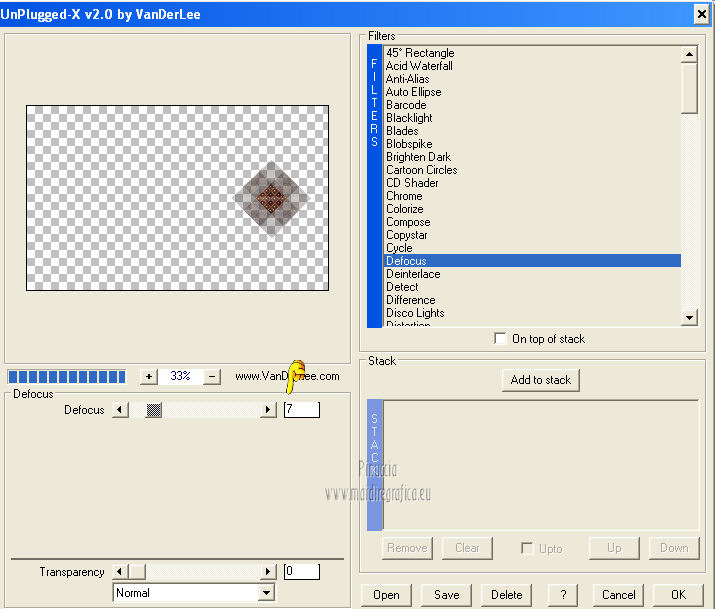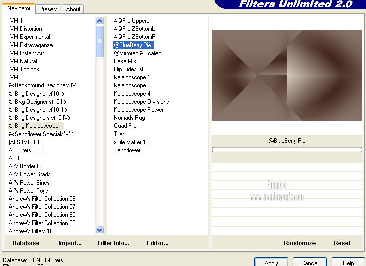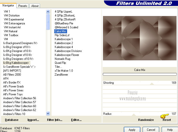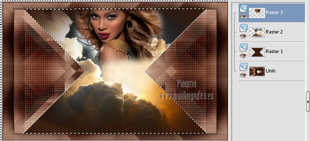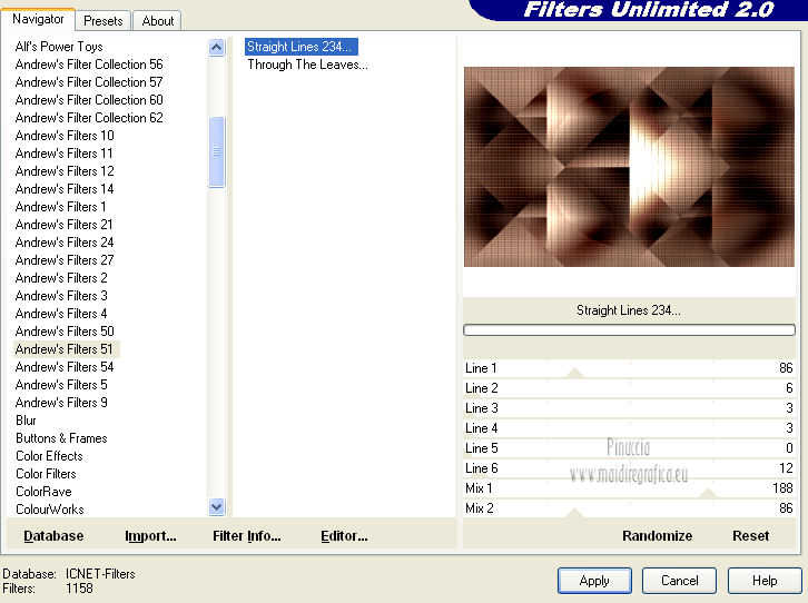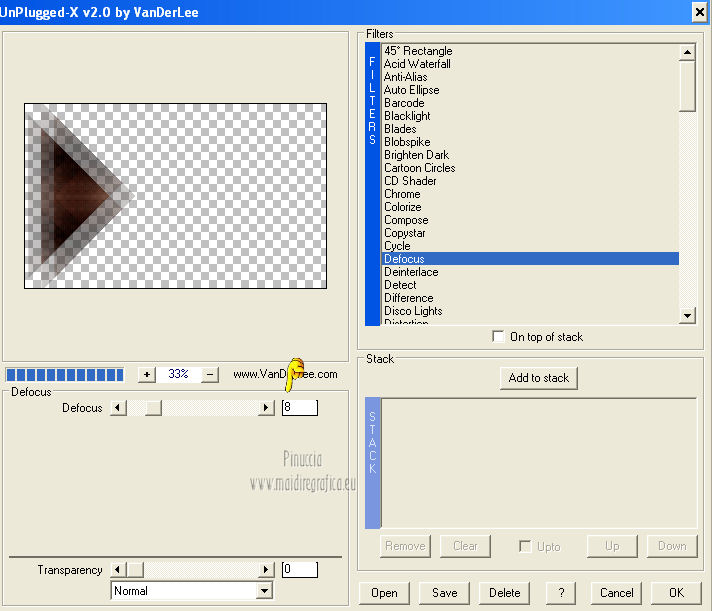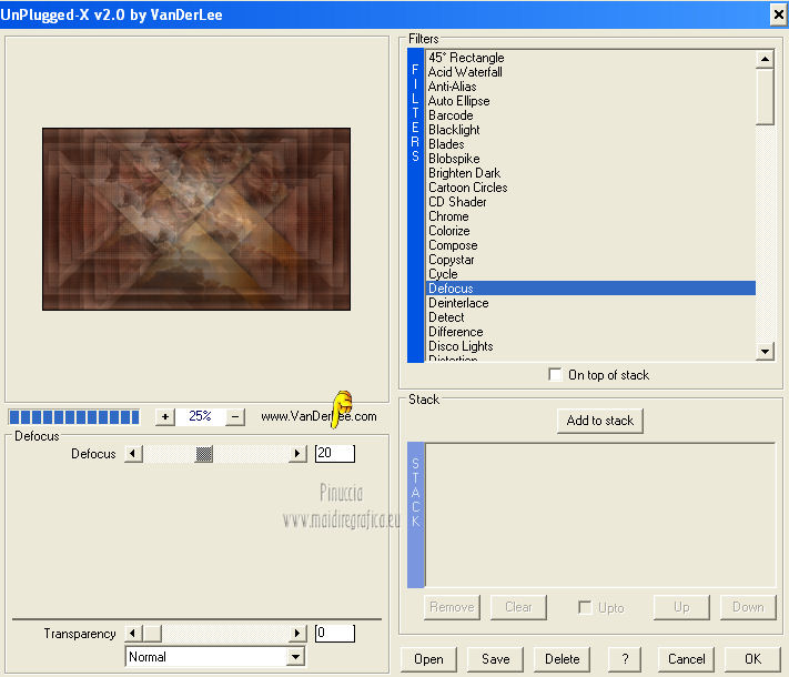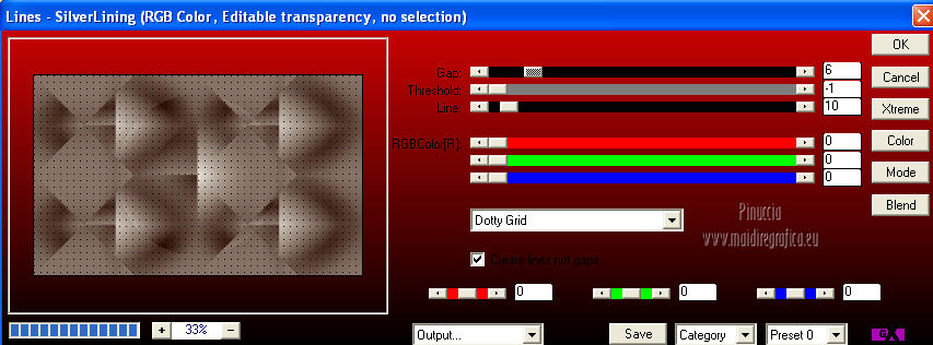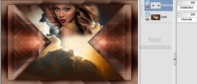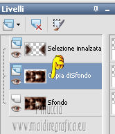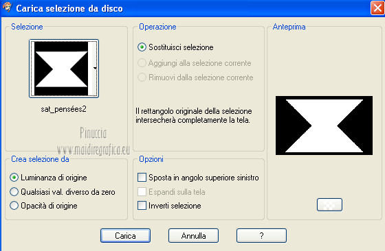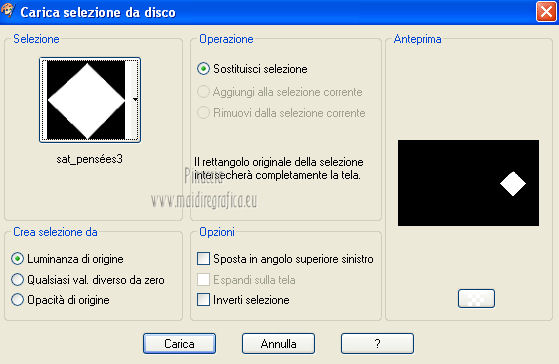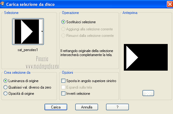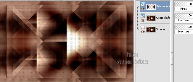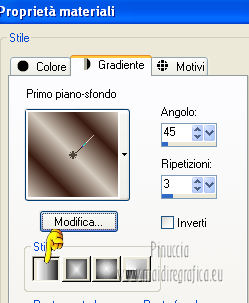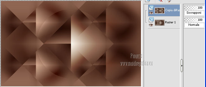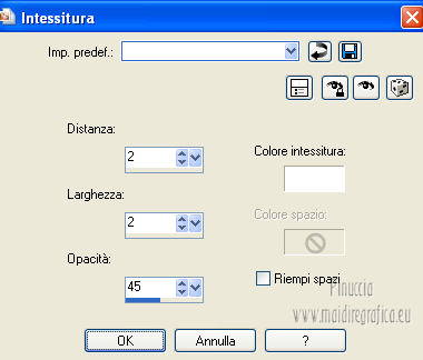 qui puoi trovare qualche risposta ai tuoi dubbi. Se l'argomento che ti interessa non è presente, ti prego di segnalarmelo. Questo tutorial è una creazione di Saturnella e non può essere copiato su altri siti nè essere offerto per il download. Lo stesso vale per la mia traduzione. E' anche proibito togliere il watermark dal materiale; rispettiamo il lavoro dei creatori di tubes, senza i quali non potremmo creare tutorials. Questo tutorial è stato creato con PSP 12, ma può essere eseguito anche con le altre versioni di PSP. Per tradurlo ho usato PSP X. Occorrente: Materiale qui I tubes sono di PSP DEVIL, LB e LuzCristina. Grazie a tutti per il vostro magnifico lavoro. (in questa pagina trovi i links ai loro siti). Filtri in caso di dubbi, ricorda di consultare la mia sezione filtri qui AP01 [Innovations] qui Filters Unlimited 2.0 qui Andrew's Filter 51 - Straight Lines 234 qui &<BKG Kaleidoscope> qui VanDerLee - Unplugged X qui I filtri Andrews per essere usati devono prima essere convertiti. Come fare vedi qui Si usano importandoli in Filters Unlimited (come fare vedi qui) ma possono funzionare anche da soli. I filtri forniti sono stati già convertiti. ![]() non esitare a cambiare modalità di miscelatura e opacità secondo i colori utilizzati. Metti le selezioni nella cartella Selezioni. 1. Imposta il colore di primo piano con #d5cbbf, e il colore di sfondo con #391b10. ![]() Passa il colore di primo piano a Gradiente, stile Lineare. ![]() Apri una nuova immagine trasparente 900 x 550 pixels, e riempila con il gradiente.2. Regola>Sfocatura>Sfocatura radiale. ![]() 3. Effetti>Plugins>Filters Unlimited 2.0 - &<Bkg Kaleidoscope> - @BlueBerryPie ![]() 4. Livelli>Duplica. Effetti>Plugins>Filters Unlimited 2.0 - &<Bkg Kaleidoscope> - Cake Mix. ![]() Cambia la modalità di miscelatura di questo livello in Sovrapponi. ![]() 5. Effetti>Plugins>AP 01 [Innovations] - Lines SilverLining. ![]() 6. Livelli>Unisci>Unisci visibile. 7. Livelli>Duplica. Effetti>Plugins>Filters Unlimited 2.0 - Andrew's Filter 51 - Straight Lines 234. ![]() 8. Immagine>Aggiungi bordatura, 2 pixels, simmetriche, con il colore scuro. 9. Livelli>Duplica. Immagine>Ridimensiona, al 90%, tutti i livelli non selezionato. 10. Selezione>Carica/Salva selezione>Carica selezione da disco. Cerca e carica la selezione sat_pensees1. ![]() Selezione>Innalza selezione a livello. Selezione>Deseleziona. 11. Effetti>Plugins>VanDerLee - Unplugged X - Defocus. ![]() 12. Livelli>Duplica. Immagine>Rilfetti. Livelli>Unisci>Unisci giù. Cambia la modalità di miscelatura di questo livello in Filtra. ![]() 13. Effetti>Effetti di bordo>Aumenta di più. Effetti>Effetti 3D>Sfalsa ombra, con i settaggi standard. ![]() 14. Attiva il livello sottostante (copia di sfondo). ![]() Effetti>Effetti 3D>Sfalsa ombra. ![]() Livelli>Unisci>Unisci visibile. 15. Selezione>Carica/Salva selezione>Carica selezione da disco. Cerca e carica la selezione sat_pensees2. ![]() Livelli>Nuovo livello raster. Riempi con il colore scuro.16. Apri il tube 2481-luzcristina.pspimage e vai a Modifica>Copia. Torna al tuo lavoro e vai a Modifica>Incolla come nuovo livello. Immagine>Ridimensiona, al 130%, tutti i livelli non selezionato. Selezione>Inverti. Premi sulla tastiera il tasto CANC. 17. Di nuovo Selezione>Inverti. Apri il tube 519-beauty-LB TUBES.pspimage e vai a Modifica>Copia. Torna al tuo lavoro e vai a Modifica>Incolla come nuovo livello. Immagine>Ridimensiona, al 60%, tutti i livelli non selezionato. Regola>Messa a fuoco>Metti a fuoco. Posiziona correttamente il tube nell'area selezionata.![]() 18. Livelli>Unisci>Unisci giù - 2 volte, e avrai due livelli. ![]() 19. Effetti>Effetti 3D>Sfalsa ombra. ![]() Selezione>Deseleziona. 20. Livelli>Unisci>Unisci visibile. 21. Selezione>Carica/Salva selezione>Carica selezione da disco. Cerca e carica la selezione sat_pensees3. ![]() Selezione>Innalza selezione a livello. Selezione>Deseleziona. 22. Effetti>Effetti di trama>Intessitura. colore intessitura bianco. ![]() 23. Effetti>Plugins>VanDerLee Unplugged X - Defocus. ![]() 24. Livelli>Duplica. Immagine>Ridimensiona, all'80%, tutti i livelli non selezionato. Livelli>Unisci>Unisci giù. 25. Livelli>Duplica. Immagine>Rifletti. Livelli>Unisci>Unisci giù. Cambia la modalità di miscelatura di questo livello in Indebolisci. ![]() 26. Livelli>Unisci>Unisci visibile. Modifica>Copia. 27. Immagine>Aggiungi bordatura, simmetriche non selezionato, con il colore bianco. ![]() Seleziona questo bordo con la bacchetta magica ![]() Modifica>Incolla nella selezione. 28. Effetti>Plugins>VanDerLee - Unplugged X - Defocus. ![]() Effetti>Effetti di bordo>Aumenta. Selezione>Inverti. Effetti>Effetti 3D>Sfalsa ombra. ![]() Selezione>Deseleziona. 29. Apri il tube homme de A PSP DEVIL e vai a Modifica>Copia. Torna al tuo lavoro e vai a Modifica>Incolla come nuovo livello. Sposta il tube a destra,o dove preferisci. 30. Effetti>Effetti 3D>Sfalsa ombra. ![]() 31. Aggiungi il tuo nome e/o il tuo watermark su un nuovo livello. 32. Immagine>Aggiungi bordatura, 2 pixels, simmetriche, con il colore scuro. Immagine>Aggiungi bordatura, 4 pixels, simmetriche, con il colore chiaro. Immagine>Aggiungi bordatura, 2 pixels, simmetriche, con il colore scuro. 33. Immagine>Ridimensiona, a 900 pixels di larghezza, tutti i livelli selezionato. se il ridimensionamento altera troppo il risultato, applica un ridimensionamento progressivo Regola>Messa a fuoco>Maschera di contrasto. ![]() Per il mio esempio ho saltato questo effetto, perchè peggiorava ulteriormente il risultato già un po' alterato dal ridimensionamento. Salva in formato jpg. Tutorial eseguito con X3. ![]() ![]() Se hai problemi o dubbi, o trovi un link non funzionante, o anche soltanto per dirmi che ti è piaciuto, scrivimi. 9 Agosto 2012 |