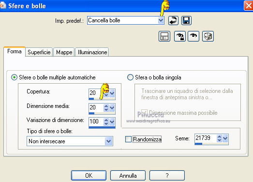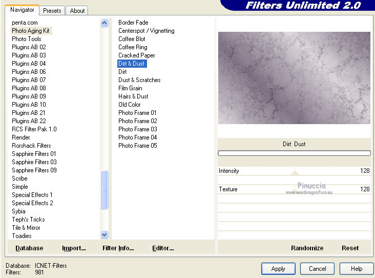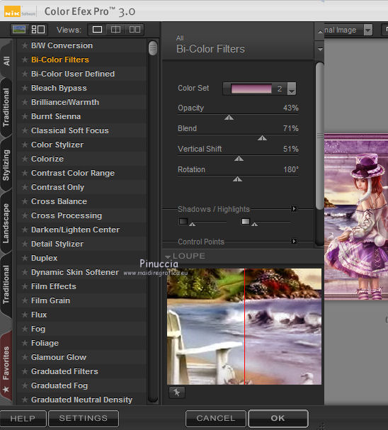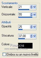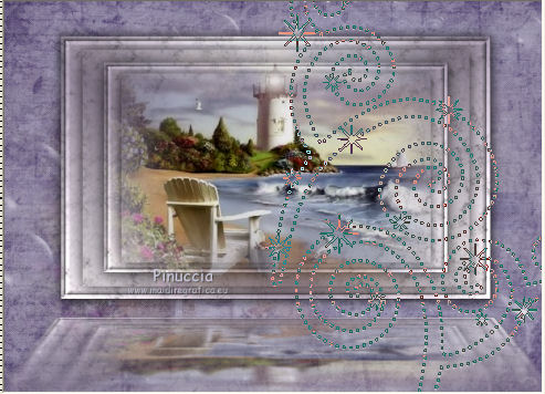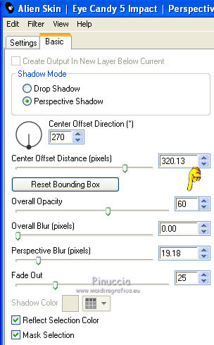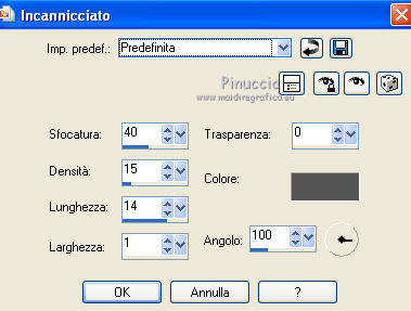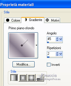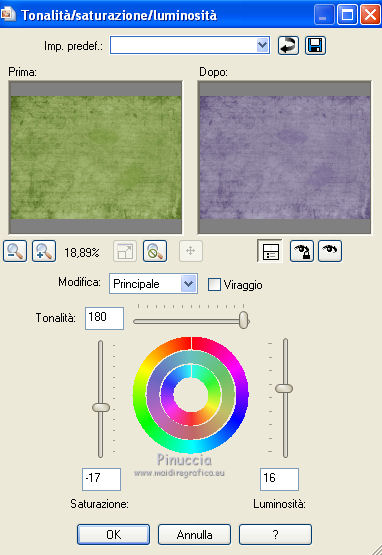 qui puoi trovare qualche risposta ai tuoi dubbi. Se l'argomento che ti interessa non è presente, ti prego di segnalarmelo. Questo tutorial è una creazione di Saturnella e non può essere copiato su altri siti nè essere offerto per il download. Lo stesso vale per la mia traduzione. E' anche proibito togliere il watermark dal materiale; rispettiamo il lavoro dei creatori di tubes, senza i quali non potremmo creare tutorials. Il tutorial è stato creato con PSP12, ma può essere eseguito anche con le altre versioni. Per tradurlo, ho usato PSP X. Occorrente: Materiale qui I tube sono di Irene, Niaga e Alies. Grazie a tutti per il vostro magnifico lavoro. (in questa pagina trovi i links ai loro siti). Filtri in caso di dubbi, ricorda di consultare la mia sezione filtri qui Filters Unlimited 2.0 qui Photo Aging Kit qui Alien Skin Eye Candy 5 Impact qui Nik Software - Color Efex Pro qui ![]() non esitare a cambiare modalità di miscelatura e opacità secondo i colori utilizzati. 1. Imposta il colore di primo piano con #e3dde1, e il colore di sfondo con #84798b. ![]() Passa il colore di primo piano a Gradiente, stile Lineare. ![]() 2. Apri una nuova immagine trasparente 900 x 550 pixels, e riempila con il gradiente.3. Effetti>Plugins>Filters Unlimited 2.0 - Photo Aging Kit - Dirt & Dust. ![]() 4. Livelli>Duplica. Immagine>Ridimensiona, al 90%, tutti i livelli non selezionato. 6. Effetti>Effetti 3D>Sfalsa ombra. ![]() 7. Attiva il livello inferiore. Effetti>Effetti 3D>Smusso a incasso. ![]() 8. Livelli>Unisci>Unisci visibile. 9. Livelli>Duplica. Immagine>Ridimensiona, all'80%, tutti i livelli non selezionato. 10. Effetti>Effetti 3D>Sfalsa ombra, con i settaggi precedenti. 11. Apri il tube del paesaggio di Irene e vai a Modifica>Copia. Torna al tuo lavoro e vai a Modifica>Incolla come nuovo livello. 12. Livelli>Unisci>Unisci visibile. Minimizza questo lavoro e lascialo in attesa. 13. Apri lo sfondo "treed-away-pp1.jpg". Colorizzalo secondo i tuoi colori. Regola>Tonalità e saturazione>Tonalità/Saturazione>Luminosità. Gioca sul settaggio della saturazione per trovare la tonalità adatta ai tuoi colori. Per il mio esempio. ![]() 14. Livelli>Nuovo livello raster. Selezione>Seleziona tutto. Modifica>Incolla nella selezione (il tube del paesaggio di Irene è ancora in memoria). Selezione>Deseleziona. Cambia la modalità di miscelatura di questo livello in Luce diffusa. 15. Effetti>Effetti artistici>Sfere e bolle. Seleziona il preset "cancella le bolle" e cambia il settaggio Cambio medio con 20. ![]() 16. Attiva l'immagine che hai lasciato in attesa al punto 12 e vai a Modifica>Copia. Torna allo sfondo e vai a Modifica>Incolla come nuovo livello. 17. Immagine>Ridimensiona, all'80%, tutti i livelli non selezionato. Sposta l'immagine un po' più in alto.18. Effetti>Effetti 3D>Sfalsa ombra. ![]() Ripeti l'Effetto Sfalsa ombra, cambiando verticale e orizzontale con -5. 19. Effetti>Plugins>Alien Skin Eye Candy 5 Impact - Perspective Shadow. Seleziona il preset Reflect in Front-Sharp, e cambia Overall Opacità con 60. non preoccuparti degli altri settaggi che vedi nella mia schermata. Il preset imposta automaticamente questi settaggi in base alla posizione e alla dimensione dell'immagine a cui viene applicata l'ombra, e per questo potrebbero essere diversi dai miei. ![]() ![]() 20. Apri il tube di Alies e vai a Modifica>Copia. Torna al tuo lavoro e vai a Modifica>Incolla come nuovo livello. Immagine>Ridimensiona, all'80%, tutti i livelli non selezionato. 21. Effetti>Effetti 3D>Sfalsa ombra. ![]() Cambia la modalità di miscelatura di questo livello in Luminanza (esistente). 22. Attiva il livello inferiore. Livelli>Nuovo livello raster. 23. Apri il pennello Celestial_Forms_Brushes_PS_by_Coby17.cs. File>Esporta>Pennello personalizzato - assegna un nome al pennello e ok. Attiva lo strumento Pennello ![]() cerca e seleziona il pennello che hai appena esportato, e applicalo a destra, cliccando con il tasto sinistro del mouse per usare il colore chiaro. ![]() se il tuo PSP non supporta pennelli superiori a 500 pixels, prima di esportarlo dovrai ridimensionarlo a 500 pixels di altezza. Dopo averlo applicato: Immagine>Ridimensiona, al 150%, tutti i livelli non selezionato, e - dopo aver premuto il tasto D, posiziona il pennello pressappoco come nella schermata precedente. Cambia la modalità di miscelatura di questo livello in Filtra. 24. Livelli>Nuovo livello raster. Apri il pennello Floral-Deco_Brushes_12. File>Esporta>Pennello personalizzato - assegna un nome al pennello e ok. Attiva lo strumento Pennello ![]() cerca e seleziona il pennello che hai appena esportato, e applicalo a sinistra, cliccando con il tasto sinistro del mouse per usare il colore chiaro. Cambia la modalità di miscelatura di questo livello in Indebolisci, e abbassa l'opacità al 60%. 25. Immagine>Aggiungi bordatura, 2 pixels, simmetriche, con il colore scuro. Immagine>Aggiungi bordatura, 4 pixels, simmetriche, con il colore chiaro. Immagine>Aggiungi bordatura, 25 pixels, simmetriche, con il colore scuro. Seleziona il bordo da 25 pixels con la bacchetta magica ![]() 26. Effetti>Effetti di trama>Incannicciato, con i settaggi standard. ![]() 27. Selezione>Inverti. Effetti>Effetti 3D>Sfalsa ombra. ![]() Selezione>Deseleziona. 28. Immagine>Aggiungi bordatura, 2 pixels, simmetriche, con il colore chiaro. 29. Effetti>Effetti 3D>Smusso a incasso. ![]() 30. Apri il tube del personaggio di Niaga e vai a Modifica>Copia. Torna al tuo lavoro e vai a Modifica>Incolla come nuovo livello. Immagine>Rifletti. Sposta il tube a destra.31. Effetti>Effetti 3D>Sfalsa ombra, con il colore nero. ![]() 32. Firma il tuo lavoro. Livelli>Unisci>Unisci tutto. Immagine>Ridimensiona, a 900 pixels di larghezza, tutti i livelli selezionato. Regola>Messa a fuoco>Metti a fuoco. 33. Effetti>Plugins>Nik Software - Color Efex Pro. Bi-Colors Filters e scegli un Coloset adatto ai tuoi colori. Per l'esempio Pink/Violet 2 con i seguenti settaggi. ![]() 34. Salva in formato jpg. ![