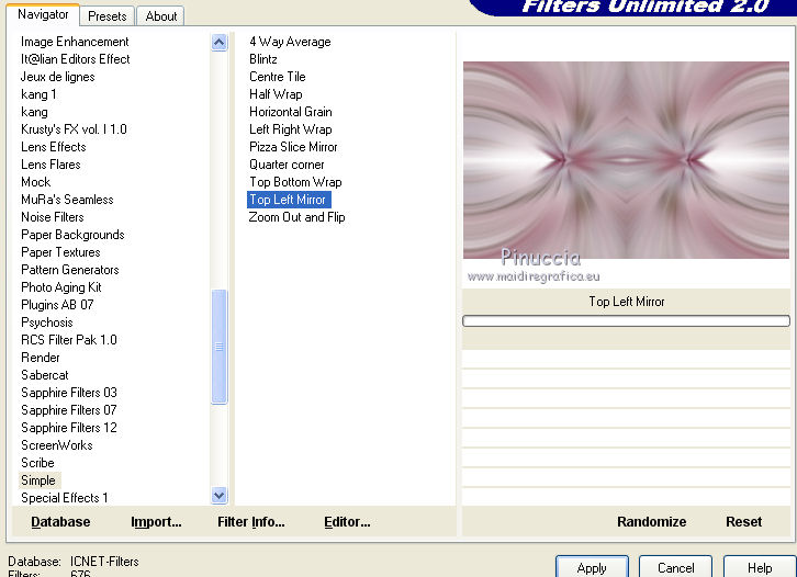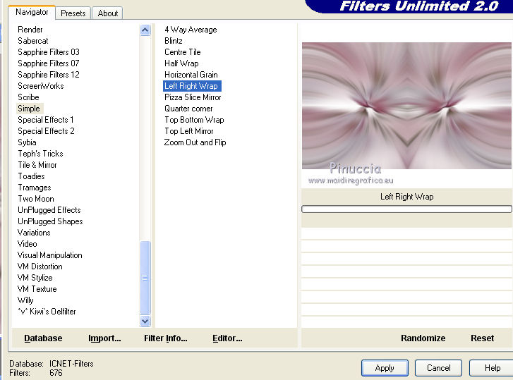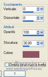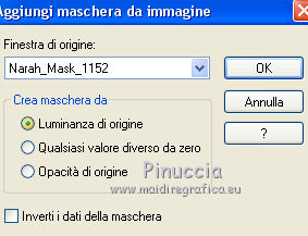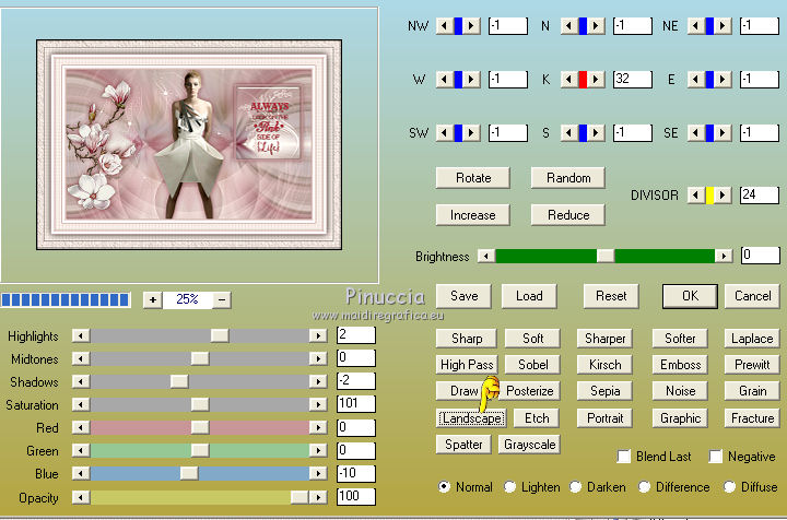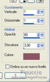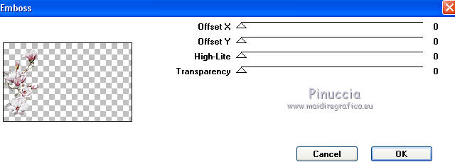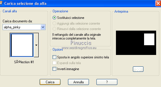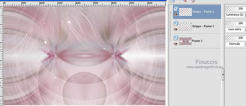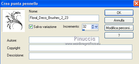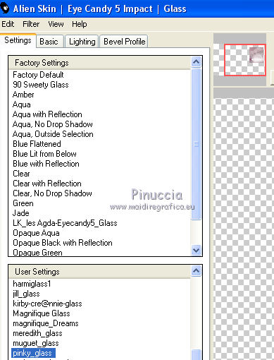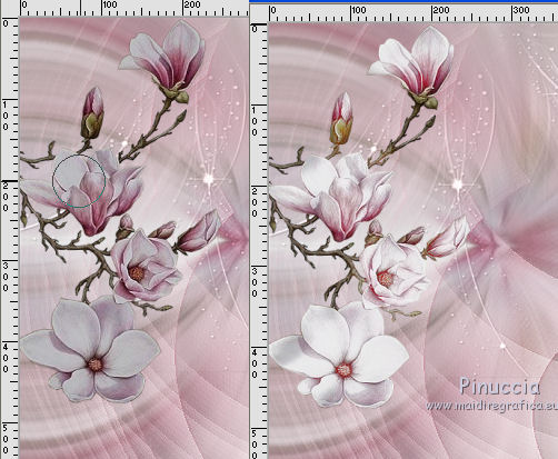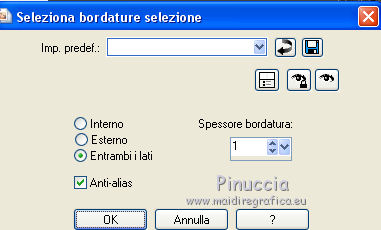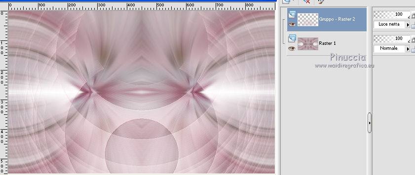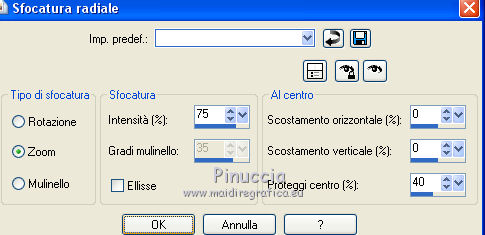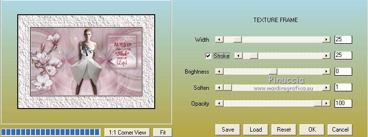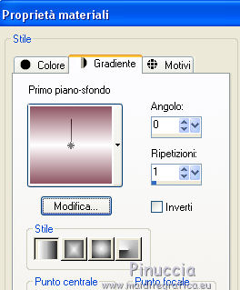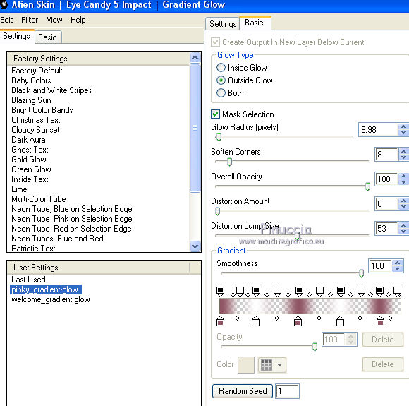 qui puoi trovare qualche risposta ai tuoi dubbi. Se l'argomento che ti interessa non è presente, ti prego di segnalarmelo. Questo tutorial è una creazione di Saturnella e non può essere copiato su altri siti nè essere offerto per il download. Lo stesso vale per la mia traduzione. E' anche proibito togliere il watermark dal materiale; rispettiamo il lavoro dei creatori di tubes, senza i quali non potremmo creare tutorials. Per tradurre questo tutorial, creato con PSP16, ho usato CorelX, ma può essere eseguito anche con le altre versioni di PSP. Dalla versione X4, il comando Immagine>Rifletti è stato sostituito con Immagine>Capovolgi in orizzontale, e il comando Immagine>Capovolgi con Immagine>Capovolgi in verticale. Nelle versioni X5 e X6, le funzioni sono state migliorate rendendo disponibile il menu Oggetti. Nel nuovo X7 sono tornati i comandi Immagine>Rifletti e Immagine>Capovolgi, ma con nuove funzioni. Vedi la scheda sull'argomento qui Occorrente: Materiale qui Grazie: per i tubes Yoka e per le maschere Narah. (in questa pagina trovi i links ai loro siti). Filtri in caso di dubbi, ricorda di consultare la mia sezione filtri qui Filters Unlimited 2.0 qui Scribe - Doughnutz qui Alien Skin Eye Candy 5 Impact - Glass, Gradient Glow qui Graphics Plus - Emboss qui Simple - Top Left Mirror qui Simple - Left Right Wrap (Bonus) qui AAA Frame - Texture Frame qui Facoltativo AAA Filters Custom qui I filtri Scribe, Simple e Graphics Plus si possono usare da soli o importati in Filters Unlimited (come fare vedi qui) Se un filtro fornito appare con questa icona ![]() non esitare a cambiare modalità di miscelatura e opacità secondo i colori utilizzati. Nelle ultime versioni di PSP non c'è il gradiente di primo piano/sfondo (Corel_06_029) Puoi usare i gradienti delle versioni precedenti. Trovi qui i gradienti Corel X. Metti i presets Cliccando sul file una o due volte (a seconda delle tue impostazioni), automaticamente il preset si installerà nella cartella corretta. perchè uno o due clic vedi qui Se preferisci, puoi importare direttamente il preset nel corso del tutorial Come fare vedi la scheda del filtro Eye Candy qui Apri le maschere in PSP e minimizzale con il resto del materiale. 1. Imposta il colore di primo piano con #8f5564, e il colore di sfondo con il colore bianco #ffffff. ![]() Passa il colore di primo piano a Gradiente di primo piano/sfondo, stile Lineare. ![]() Apri alpha_pinky. Finestra>Duplica, o sulla tastiera maiuscola+D, per fare una copia. ![]() Chiudi l'originale. La copia, che sarà la base del tuo lavoro, non è vuota, ma contiene una selezione salvata sul canale alfa. Riempi l'immagine trasparente con il gradiente.2. Selezione>Seleziona tutto. Apri il tube dei fiori di Yoka e vai a Modifica>Copia. Torna al tuo lavoro e vai a Modifica>Incolla nella selezione. Selezione>Deseleziona. 3. Effetti>Effetti di immagine>Motivo unico, con i settaggi standard. ![]() 4. Regola>Sfocatura>sfocatura radiale. ![]() 5. Effetti>Plugins>Filters Unlimited 2.0 - Scribe - Doughnutz, con i settaggi standard. ![]() 6. Effetti>Plugins>Filters Unlimited 2.0 - Simple - Left Right Wrap. ![]() 7. Effetti>Plugins>Filters Unlimited 2.0 - Simple - Top Left Mirror. ![]() 8. Livelli>Nuovo livello raster. Riempi con il colore bianco di sfondo.Livelli>Nuovo livello maschera>Da immagine. Apri il menu sotto la finestra di origine e vedrai la lista dei files aperti. Seleziona la maschera Narah_Mask_1152. ![]() Effetti>Effetti di bordo>Aumenta. Livelli>Unisci>Unisci gruppo. Cambia la modalità di miscelatura di questo livello in Luce netta, o altro. 9. Effetti>Effetti 3D>Sfalsa ombra, colore scuro di primo piano. ![]() ![]() 10. Livelli>Nuovo livello raster. Riempi con il colore bianco di sfondo.Livelli>Nuovo livello maschera>Da immagine. Apri il menu sotto la finestra di origine e vedrai la lista dei files aperti. Seleziona la maschera Narah_Mask_1132. ![]() Regola>Messa a fuoco>Accentua messa a fuoco. Livelli>Unisci>Unisci gruppo. 11. Effetti>Effetti di immagine>Scostamento. ![]() Cambia la modalità di miscelatura di questo livello in Luminanza (esistente), o altro. Effetti>Effetti 3D>Sfalsa ombra, con i settaggi precedenti. ![]() 12. Modifica>Incolla come nuovo livello (il tube dei fiori di Yoka è sempre in memoria). Immagine>Ridimensiona, 2 volte al 75%, tutti i livelli non selezionato. Immagine>Rifletti. Sposta il tube a sinistra.13. Attiva lo strumento Pennello Schiarisci/Scurisci ![]() con i seguento settaggi ![]() Applica il pennello, passando il mouse sui fiori per schiarirli un po' ![]() 14. Effetti>Plugins>Graphics Plus - Emboss, con i settaggi standard. ![]() 15. Effetti>Effetti 3D>Sfalsa ombra, colore scuro di primo piano. ![]() 16. Apri il tube della donna di Yoka e vai a Modifica>Copia. Torna al tuo lavoro e vai a Modifica>Incolla come nuovo livello. Immagine>Ridimensiona, al 70%, tutti i livelli non selezionato. Regola>Messa a fuoco>Metti a fuoco. 17. Effetti>Effetti 3D>Sfalsa ombra, con i settaggi precedenti. 18. Attiva il livello di sfondo. Selezione>Carica/Salva selezione>Carica selezione da canale alfa. La selezione sélection 1 è subito disponibile. Devi soltanto cliccare Carica. ![]() Selezione>Innalza selezione a livello. Livelli>Disponi>Porta in alto. Selezione>Modifica>Seleziona bordature selezione. ![]() Riporta il colore di primo piano a Colore, e riempi la selezione con il colore scuro di primo piano.Selezione>Deseleziona. 19. Apri Floral_Deco_Brushes_2_23. File>Esporta>Pennello personalizzato, assegna un nome al pennello e ok. ![]() 20. Livelli>Nuovo livello raster. Attiva lo strumento Pennello ![]() cerca e seleziona il pennello appena esportato, dimensione 270 ![]() Applica il pennello nel quadro, cliccando con il tasto destro del mouse, per usare il colore bianco di sfondo. 21. Effetti>Effetti 3D>Sfalsa ombra, colore scuro di primo piano. ![]() Livelli>Unisci>Unisci giù. 22. Effetti>Plugins>Alien Skin Eye Candy 5 Impact - Glass. Seleziona il preset pinky_glass e ok. !