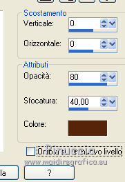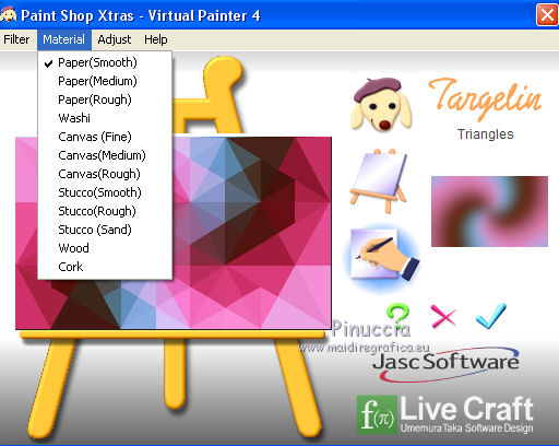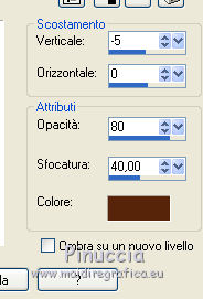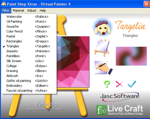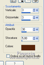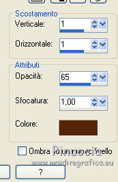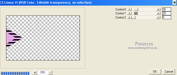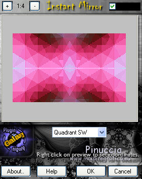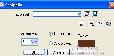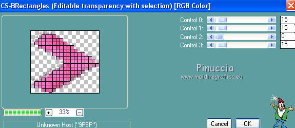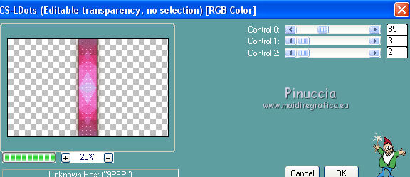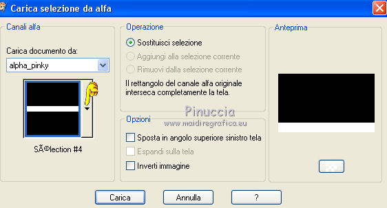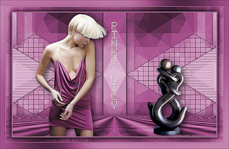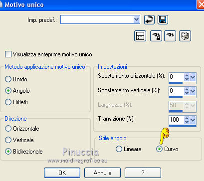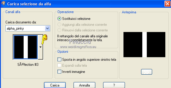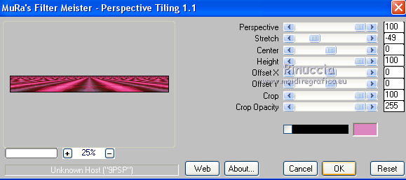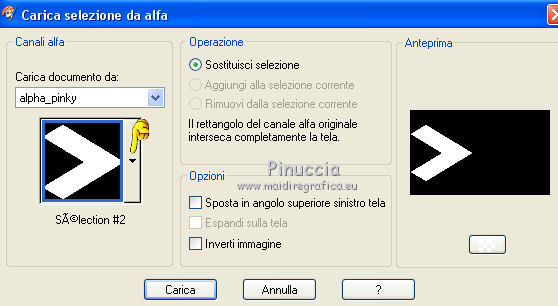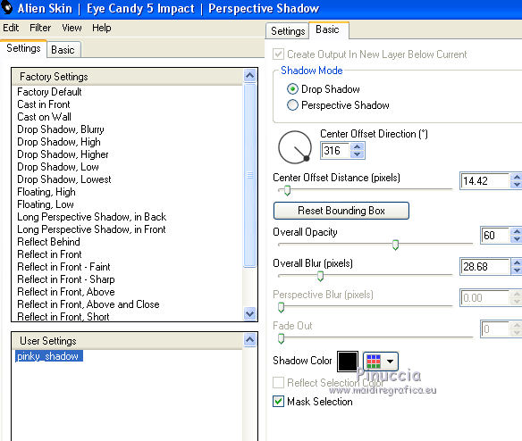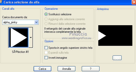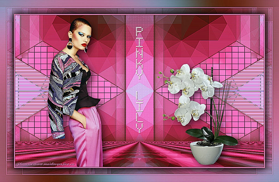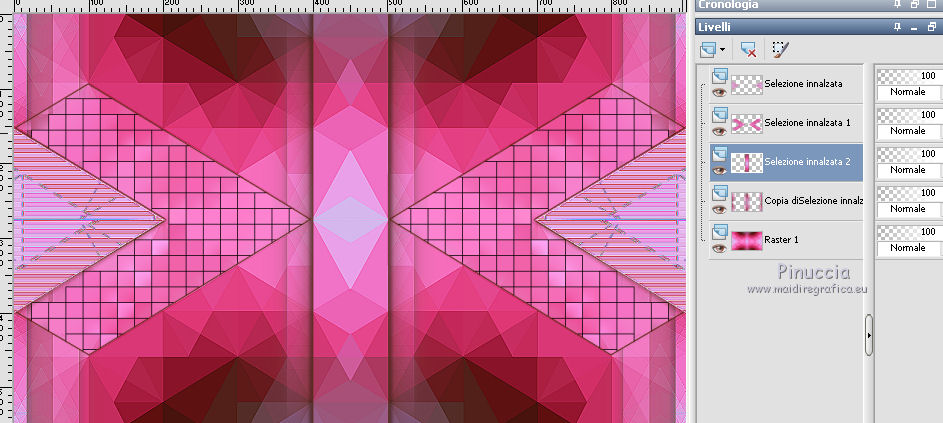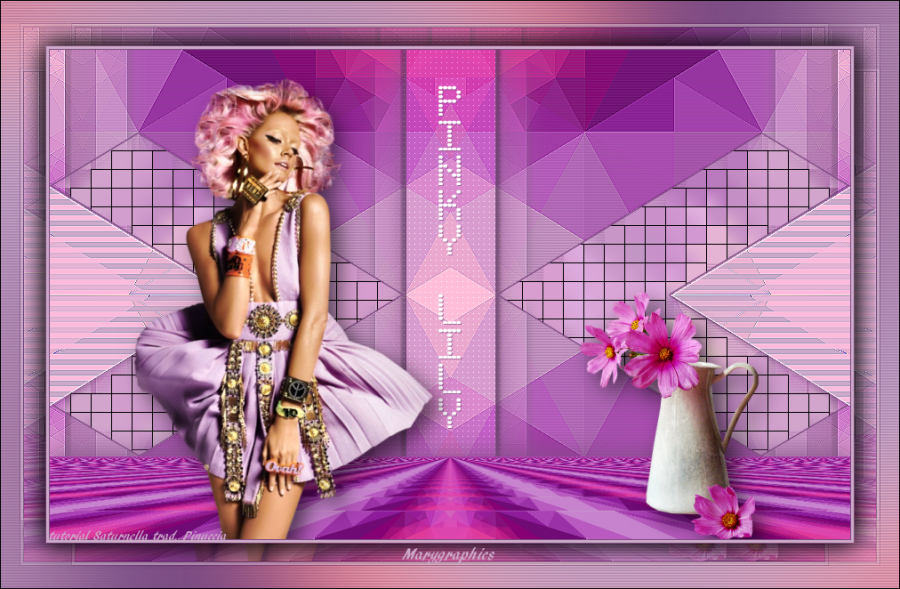qui puoi trovare qualche risposta ai tuoi dubbi. Se l'argomento che ti interessa non è presente, ti prego di segnalarmelo. Questo tutorial è una creazione di Saturnella e non può essere copiato su altri siti nè essere offerto per il download. Lo stesso vale per la mia traduzione. E' anche proibito togliere il watermark dal materiale; rispettiamo il lavoro dei creatori di tubes, senza i quali non potremmo creare tutorials. Per tradurre questo tutorial, creato con PSP19, ho usato CorelX, ma può essere eseguito anche con le altre versioni di PSP. Dalla versione X4, il comando Immagine>Rifletti è stato sostituito con Immagine>Capovolgi in orizzontale, e il comando Immagine>Capovolgi con Immagine>Capovolgi in verticale. Nelle versioni X5 e X6, le funzioni sono state migliorate rendendo disponibile il menu Oggetti. Nel nuovo X7 sono tornati i comandi Immagine>Rifletti e Immagine>Capovolgi, ma con nuove funzioni. Vedi la scheda sull'argomento qui Occorrente: Materiale qui Per i tube grazie Lily. Il resto del materiale è di Saturnella. (in questa pagina trovi i links ai loro siti). Filtri in caso di dubbi, ricorda di consultare la mia sezione filtri qui Filters Unlimited 2.0 qui Mehdi - Wavy Lab 1.1 qui Virtual Painter 4 qui Plugin Galaxy - Instant Mirror qui Carolaine and Sensibility qui Toadies - What are you qui Alien Skin Eye Candy 5 Impact - Glass qui Mura's Meister - Perspective Tiling qui I filtri Toadies si possono usare da soli o importati in Filters Unlimited (come fare vedi qui) Se un filtro fornito appare con questa icona ![]() non esitare a cambiare modalità di miscelatura e opacità secondo i colori utilizzati. Metti il preset Cliccando sul file una o due volte (a seconda delle tue impostazioni), automaticamente il preset si installerà nella cartella corretta. perchè uno o due clic vedi qui Colori utilizzati ![]() 1. Imposta il colore di primo piano con il colore scuro #58250c, e il colore di sfondo con il colore chiaro #dd87c0. ![]() 2. Apri alpha_pinkylily. Finestra>Duplica o sulla tastiera maiuscola+D per fare una copia. ![]() Chiudi l'originale. La copia, che sarà la base del tuo lavoro, non è vuota, ma contiene le selezioni salvate sul canale alfa. Effetti>Plugins>Mehdi - Wavy Lab 1.1. Questo filtro lavora con i colori della paletta: il primo è il colore di sfondo il secondo quello di primo piano; mantieni il terzo colore creato dal filtro e cambia il quarto colore con #73a7c9. ![]() 3. Regola>Sfocatura>Sfocatura gaussiana - raggio 50. ![]() 4. Effetti>Plugins>Virtual Painter 4. Filter: Triangles - Material: Paper (Smooth) ![]() Risultato ![]() Effetti>Effetti di bordo>Aumenta. 5. Effetti>Plugins>Plugin Galaxy - Instant Mirror. ![]() 6. Selezione>Carica/Salva selezione>Carica selezione da canale alfa. la selezione sélection1 è subito disponibile. Devi soltanto cliccare Carica. ![]() Selezione>Innalza selezione a livello. Selezione>Deseleziona. 7. Effetti>Plugins>Carolaine and Sensibility - CS-Linear-H ![]() Effetti>Effetti di bordo>Aumenta. 8. Effetti>Effetti 3D>Sfalsa ombra, colore scuro di primo piano. ![]() 9. Livelli>Duplica. Immagine>Rifletti. Livelli>Unisci>Unisci giù. 10. Attiva il livello di sfondo. Selezione>Carica/Salva selezione>Carica selezione da canale alfa. Apri il menu delle selezioni e carica sélection#2. ![]() Selezione>Innalza selezione a livello. Effetti>Plugins>Carolaine and Sensibility - CS-BRectangles. ![]() 11. Selezione>Modifica>Seleziona bordature selezione. ![]() Modalità di corrispondenza dello strumento Riempimento su Nessuno ![]() Riempi la selezione con il colore scuro.Selezione>Deseleziona. 12. Livelli>Duplica. Immagine>Rifletti. Livelli>Unisci>Unisci giù. 13. Attiva il livello di sfondo. Selezione>Carica/Salva selezione>Carica selezione da canale alfa. Apri il menu delle selezioni e carica sélection#3. ![]() Selezione>Innalza selezione a livello. 14. Effetti>Effetti 3D>Scalpello, colore scuro. ![]() Selezione>Deseleziona. 15. Effetti>Effetti 3D>Sfalsa ombra, colore scuro di primo piano. ![]() 16. Livelli>Duplica. Effetti>Plugins>Toadies - What are you. ![]() Effetti>Effetti di bordo>Aumenta. 17. Effetti>Effetti di immagine>Motivo unico. ![]() Livelli>Disponi>Sposta giù. 18. Attiva il livello soprastante. ![]() Effetti>Plugins>Carolaine and Sensibility - CS-LDots. ![]() 19. Attiva il livello di sfondo. Selezione>Carica/Salva selezione>Carica selezione da canale alfa. Apri il menu delle selezioni e carica sélection#4. ![]() Selezione>Innalza selezione a livello. Effetti>Plugins>Mura's Meister - Perspective Tiling. ![]() Livelli>Disponi>Porta in alto. Selezione>Deseleziona. 20. Effetti>Effetti 3D>Sfalsa ombra, colore scuro di primo piano. ![]() 21. Attiva il livello di sfondo. Effetti>Effetti di trama>Veneziana, colore scuro. ![]() 22. Attiva il livello superiore. Apri il tube texte e vai a Modifica>Copia. Torna al tuo lavoro e vai a Modifica>Incolla come nuovo livello. Spostalo al centro, come nel mio esempio.23. Effetti>Effetti 3D>Sfalsa ombra, colore scuro di primo piano. ![]() 24. Apri il tube della donna di Lily e vai a Modifica>Copia. Torna al tuo lavoro e vai a Modifica>Incolla come nuovo livello. Cancella la firma. Immagine>Ridimensiona, 1 volta al 70% e una volta all'85%, tutti i livelli non selezionato. Regola>Messa a fuoco>Metti a fuoco. Sposta il tube a sinistra.25. Effetti>Plugins>Alien Skin eye Candy 5 Impact - Perspective Shadow. Seleziona il preset pinky_shadow e ok. Questi i settaggi, in caso di problemi con il preset. ![]() 26. Apri il tube dei fiori di Lily e vai a Modifica>Copia. Torna al tuo lavoro e vai a Modifica>Incolla come nuovo livello. Cancella la firma. Immagine>Ridimensiona, al 70%, tutti i livelli non selezionato. Immagine>Rifletti. Regola>Messa a fuoco>Metti a fuoco. Sposta il tube in basso a destra.27. Effetti>Plugins>Alien Skin Eye Candy 5 Impact - Perspective Shadow, con i settaggi precedenti. 28. Immagine>Aggiungi bordatura, 1 pixel, simmetriche, colore scuro. Immagine>Aggiungi bordatura, 3